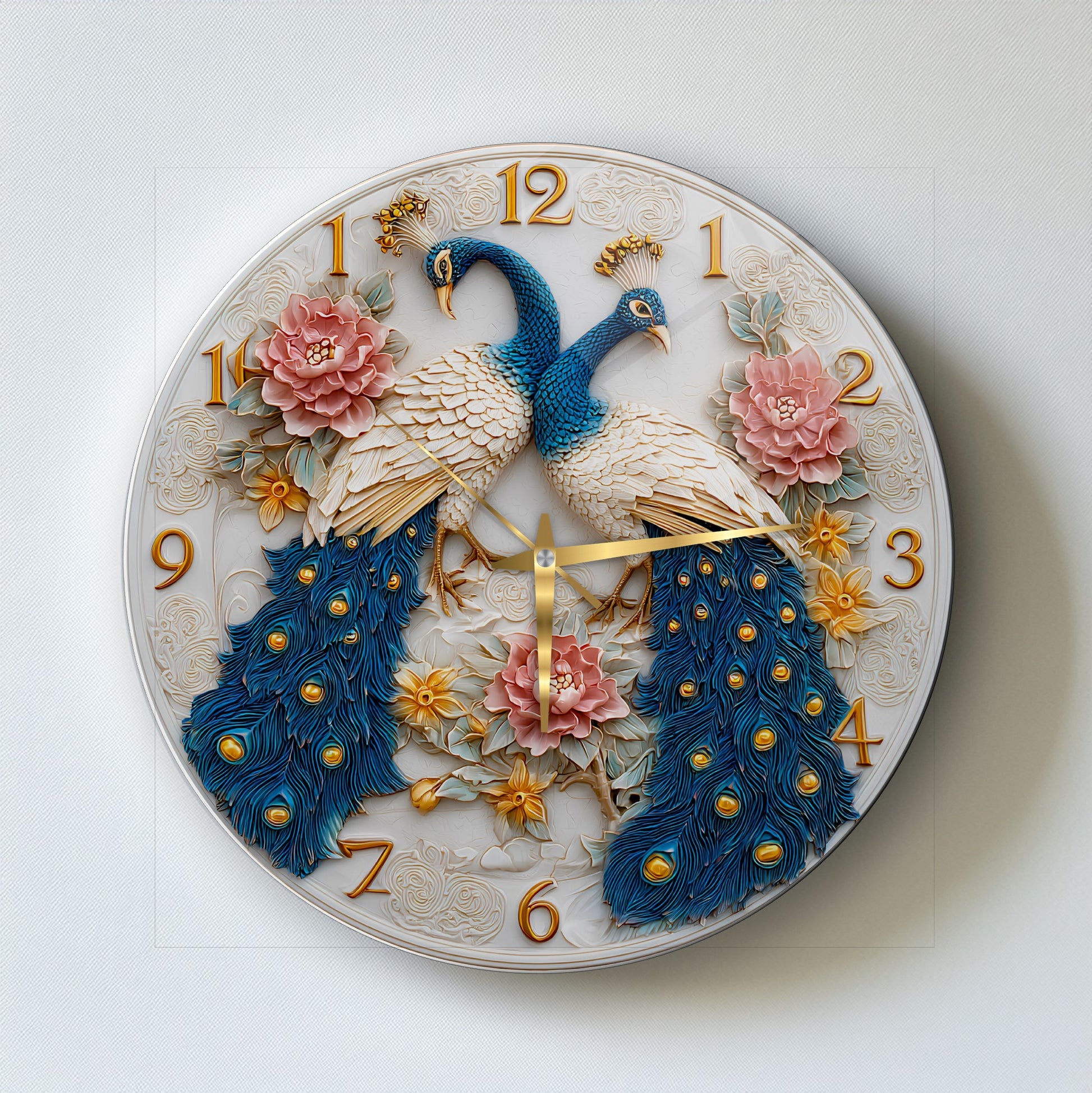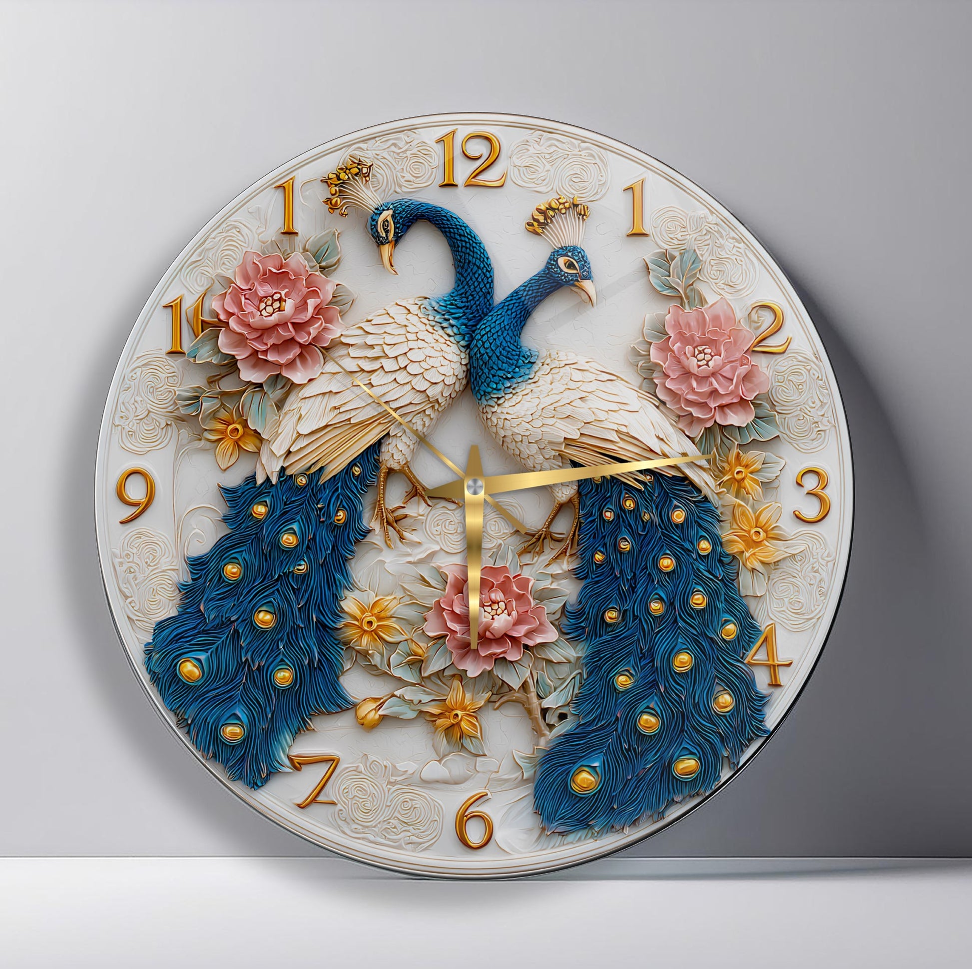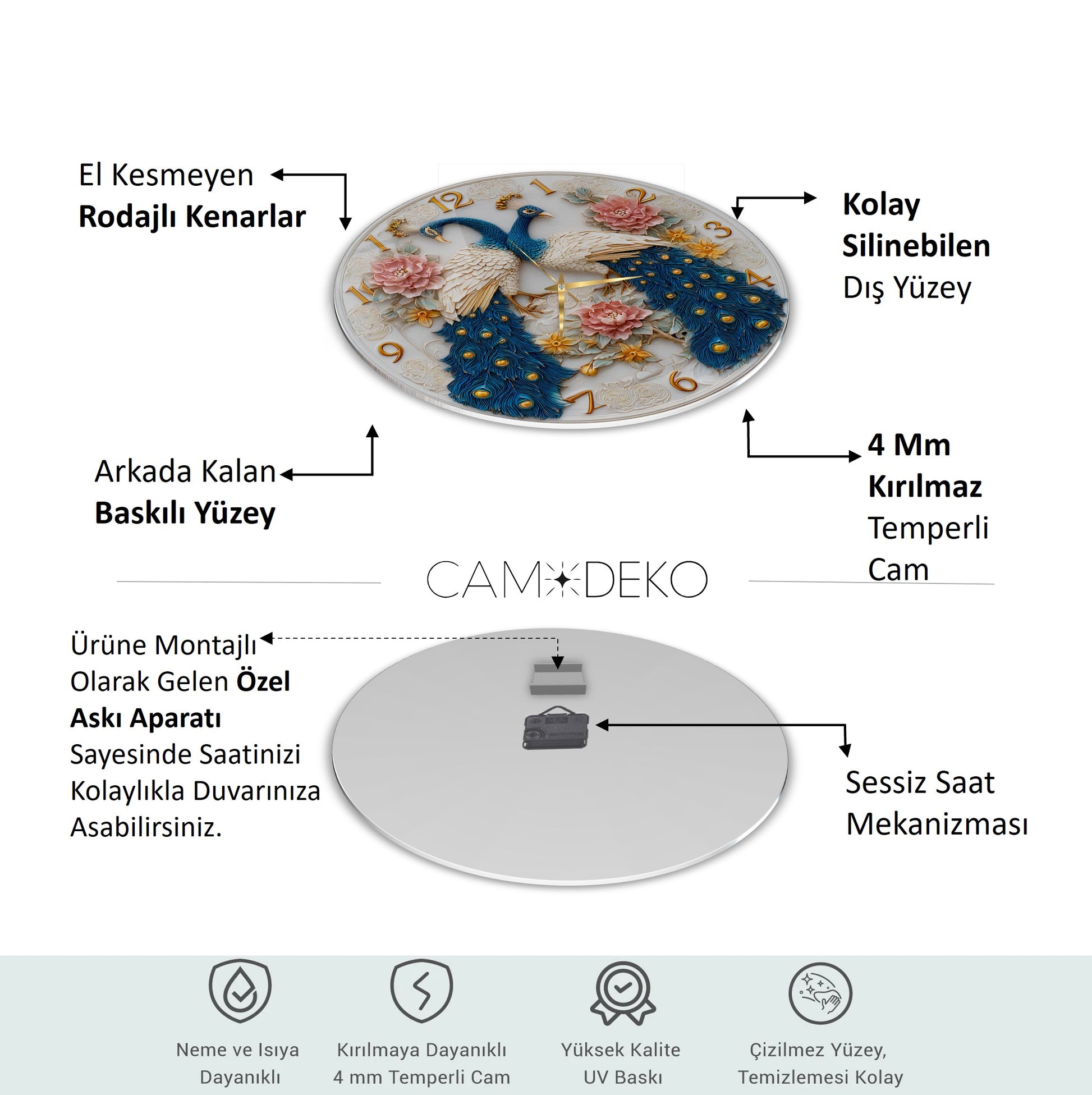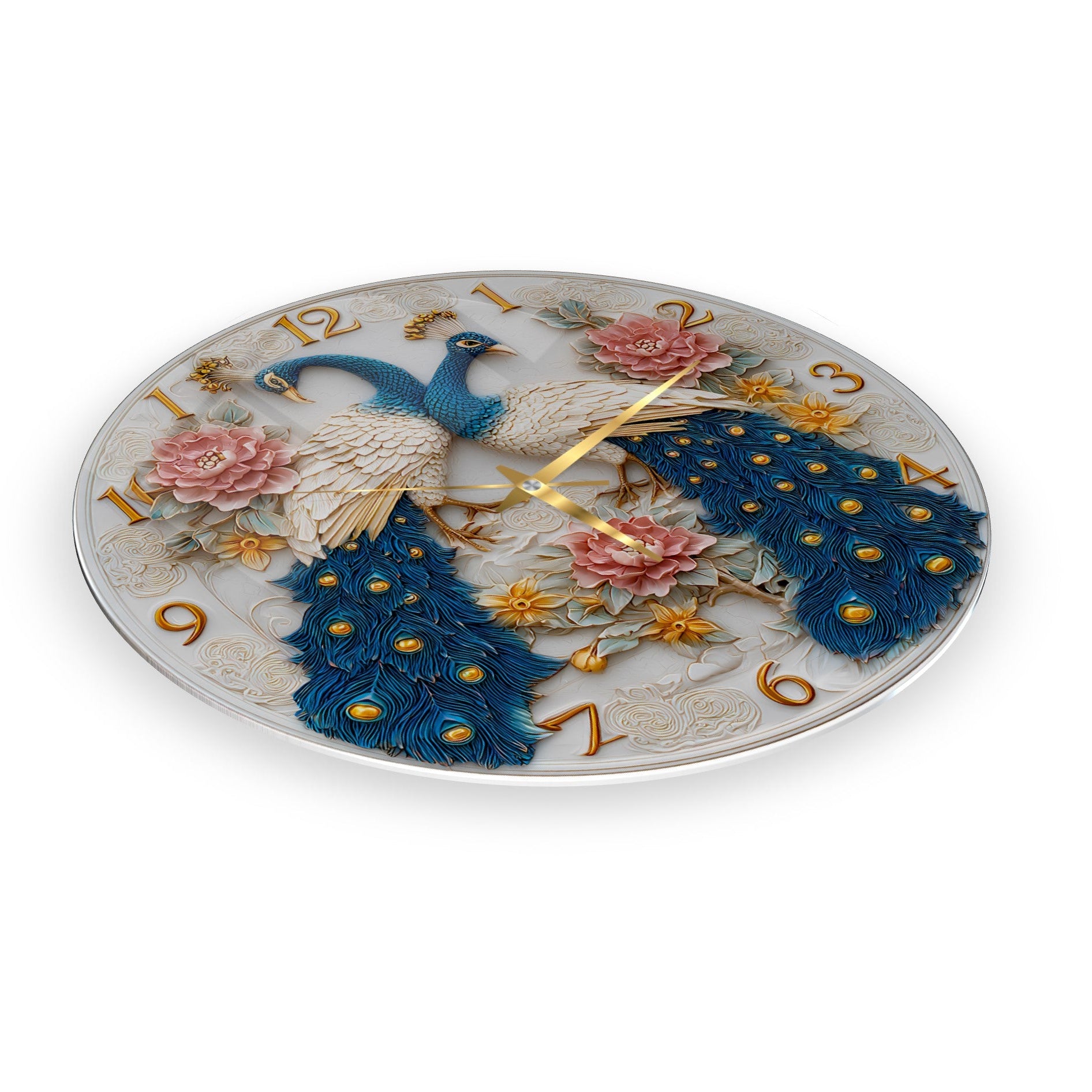 Çiçekli Tavus Kuşu Cam Duvar Saati