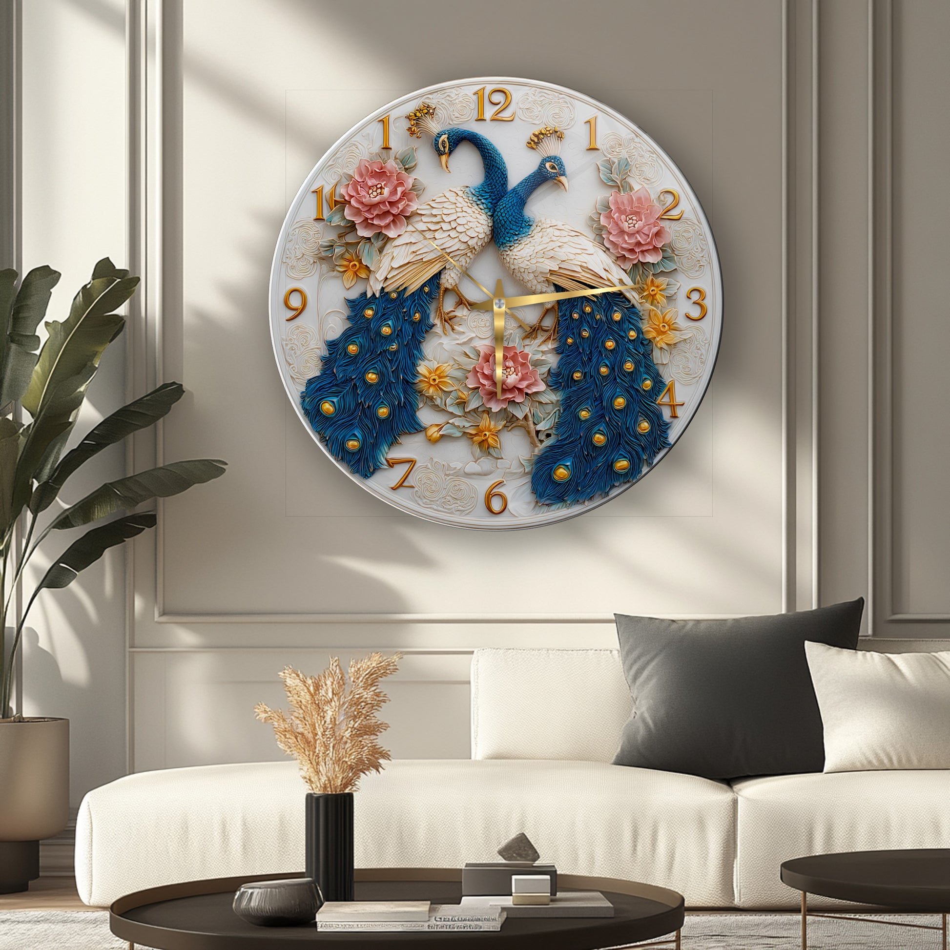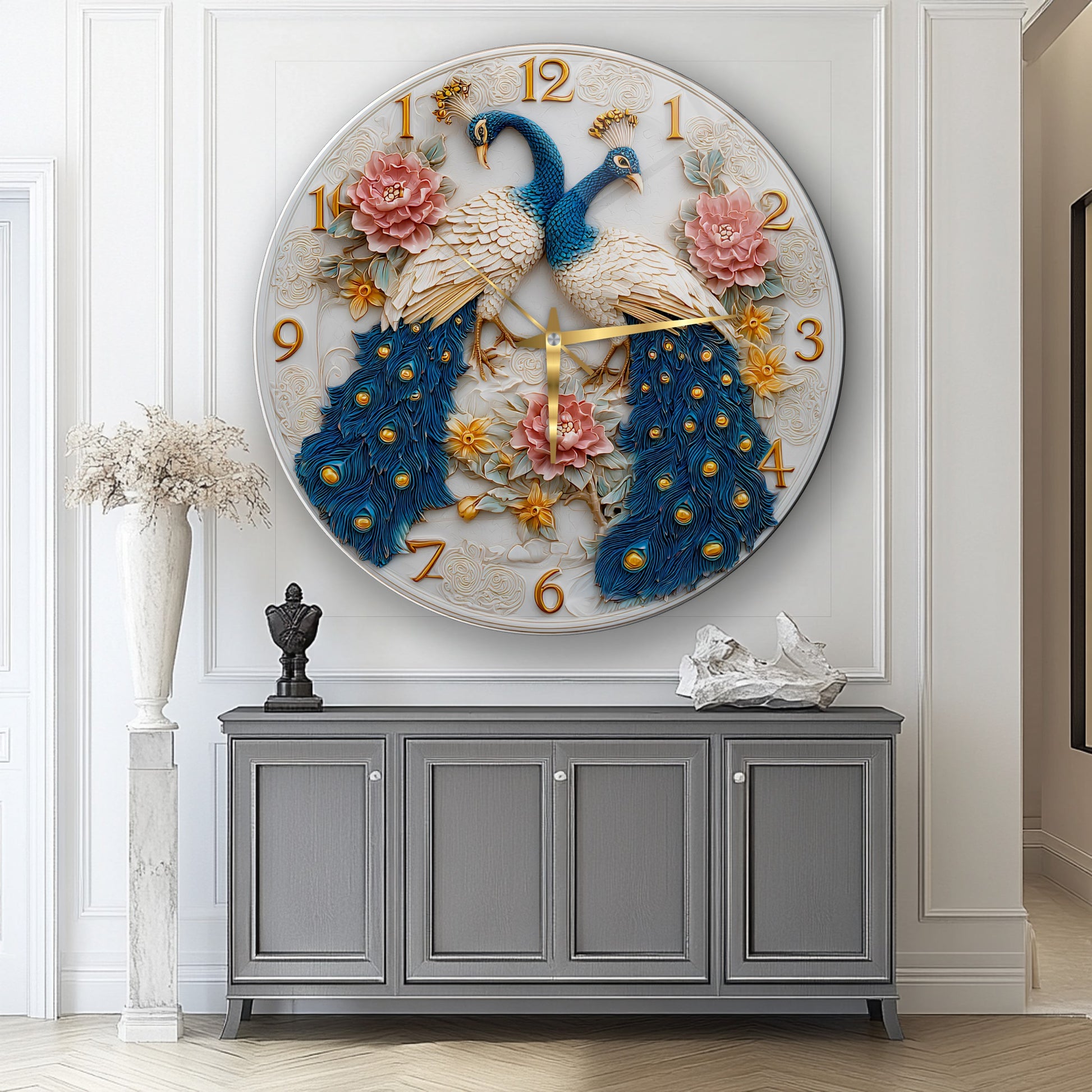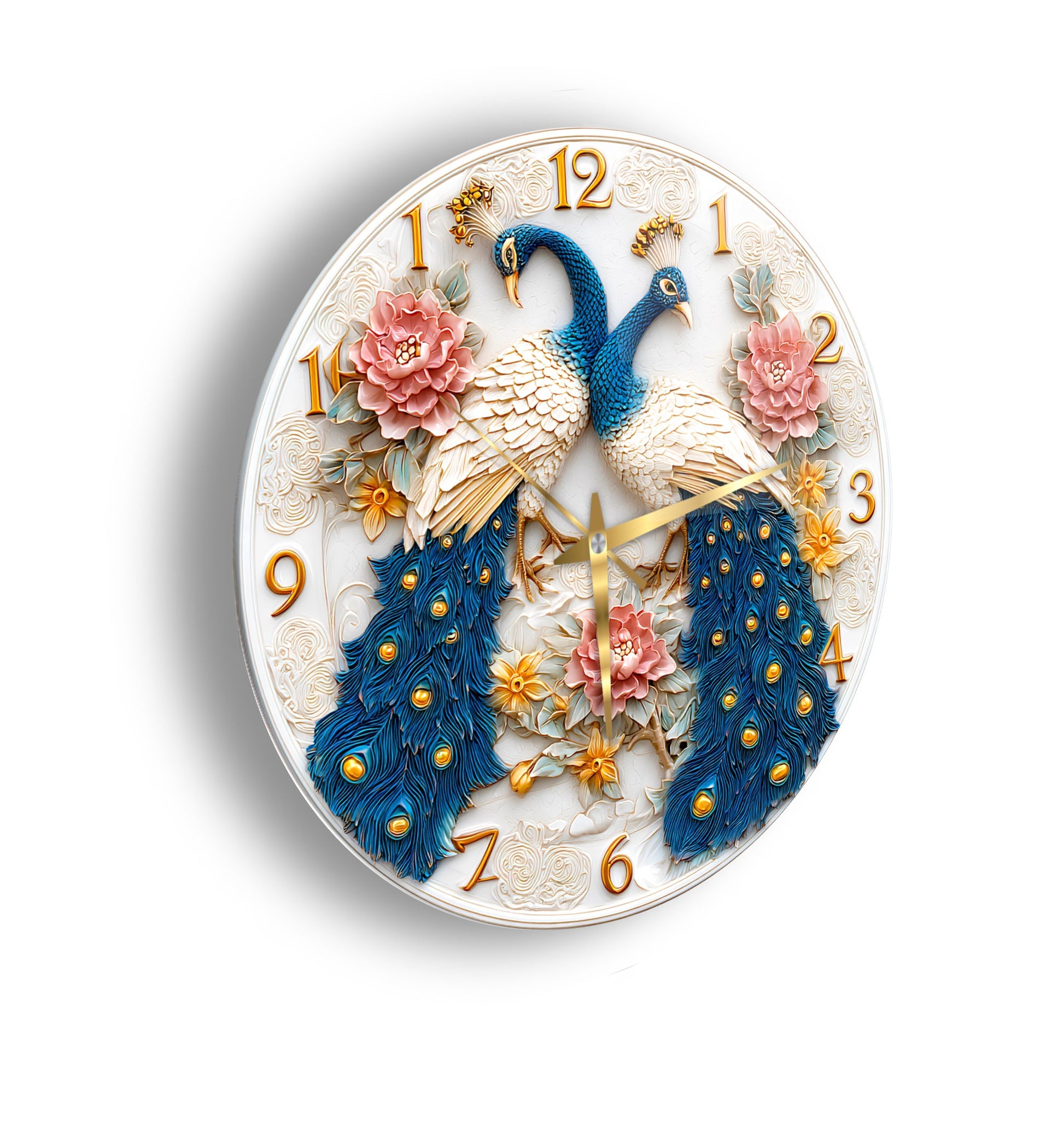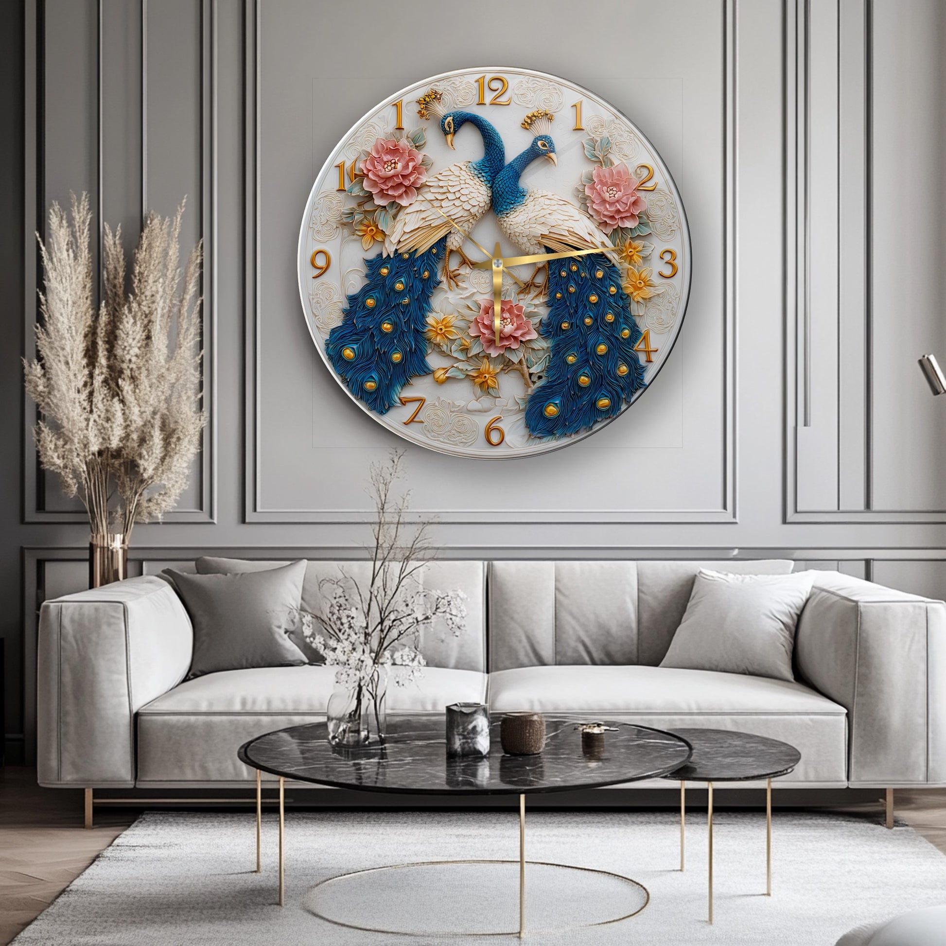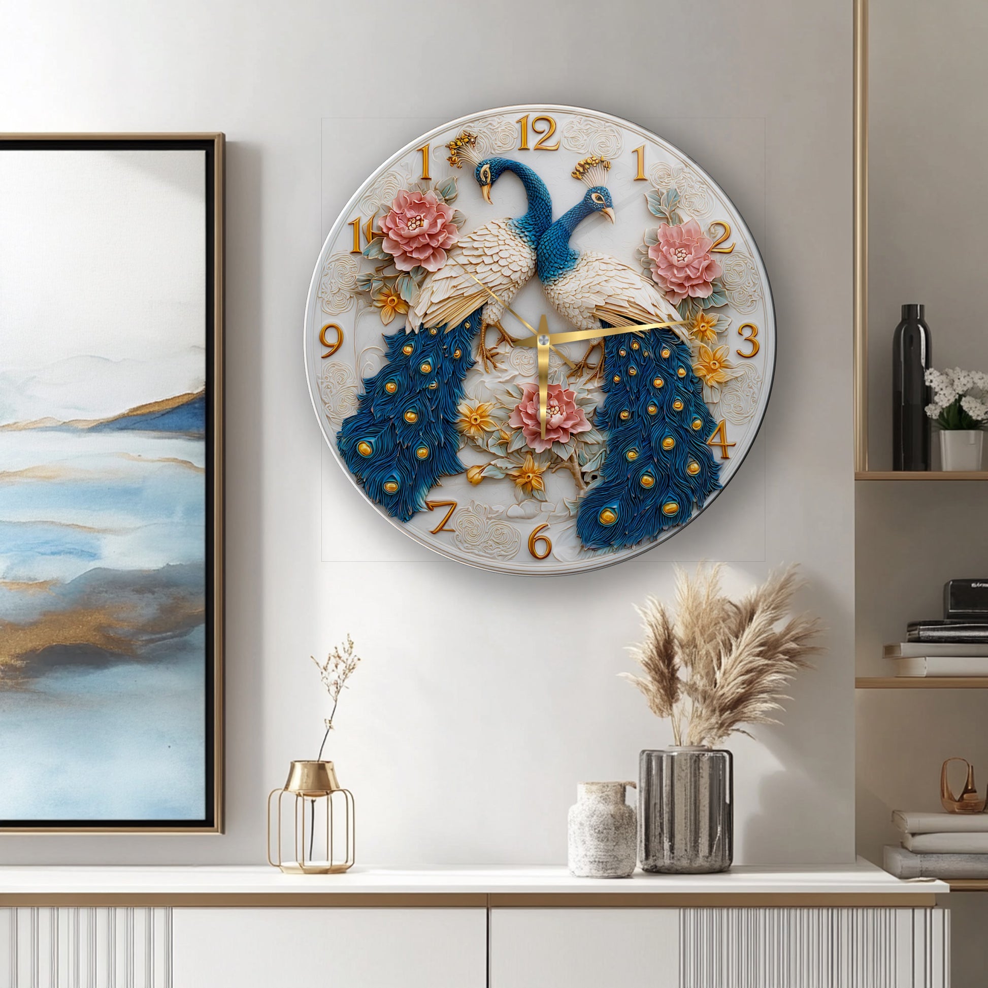 Çiçekli Tavus Kuşu Cam Duvar Saati