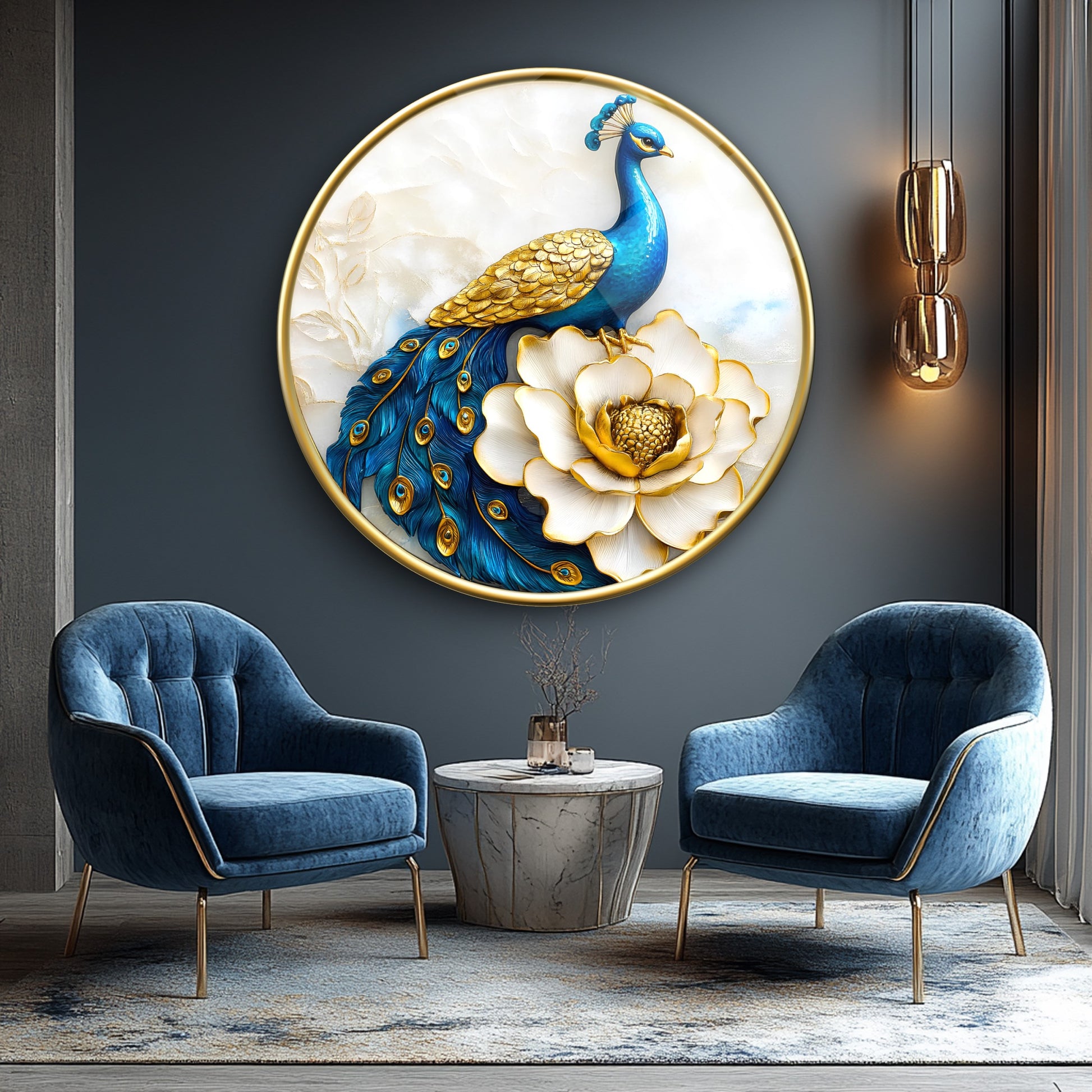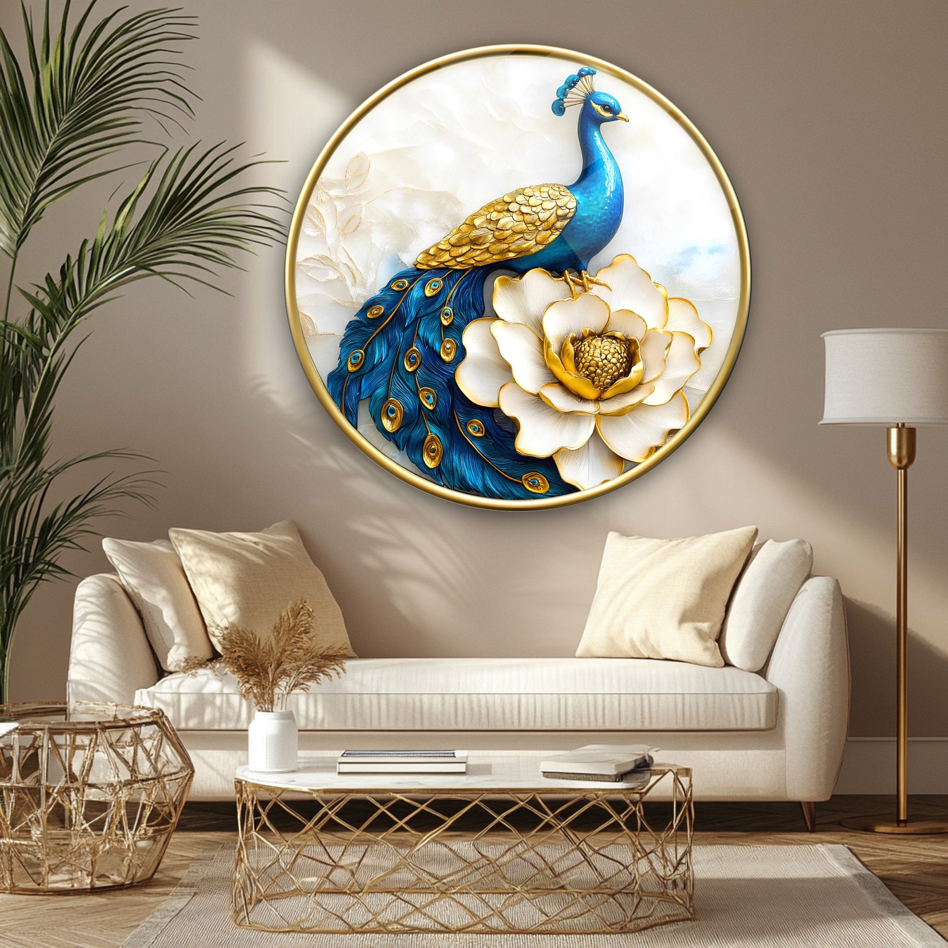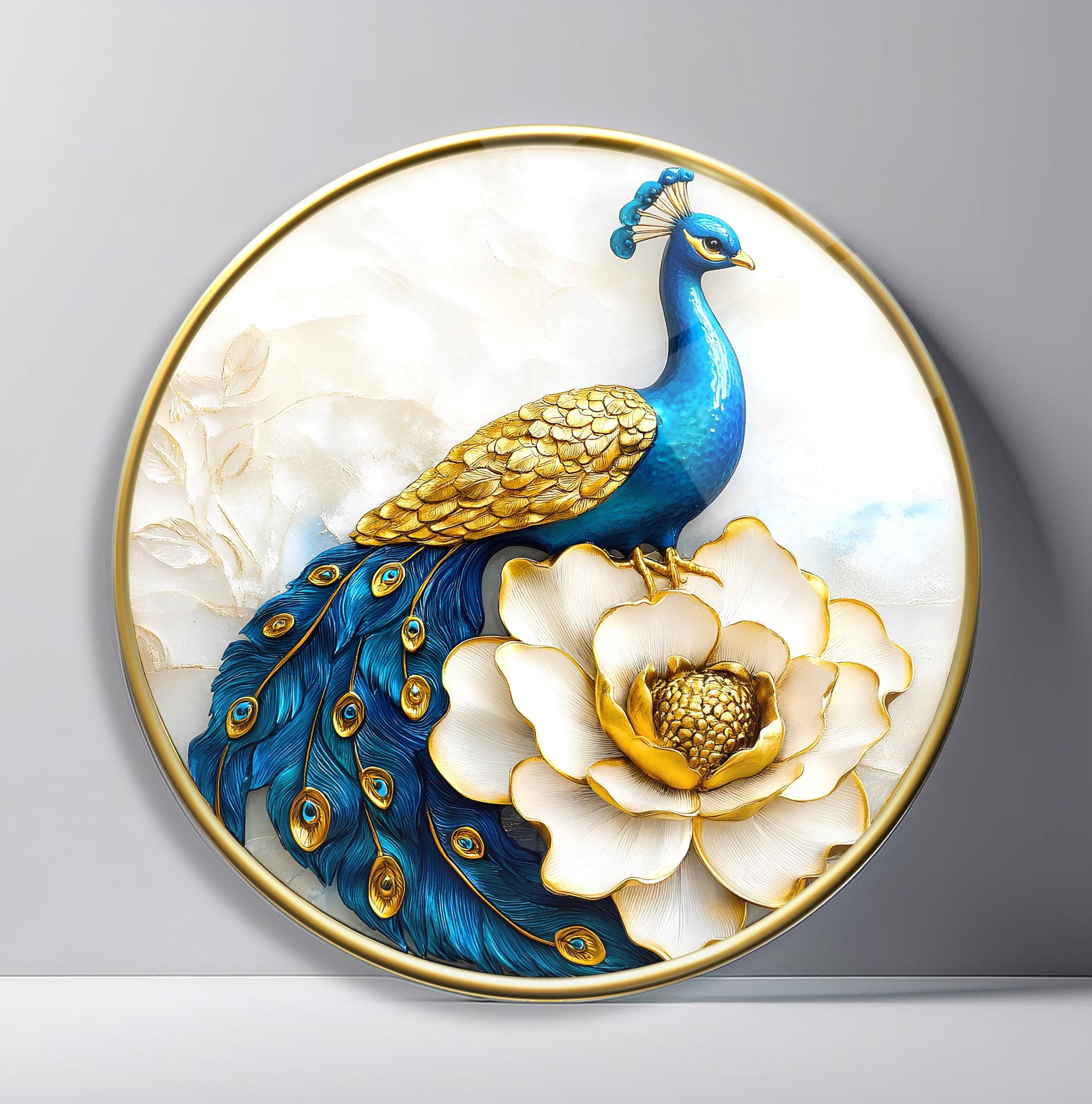 Mavi Tavus Kuşu Yuvarlak Cam Tablo