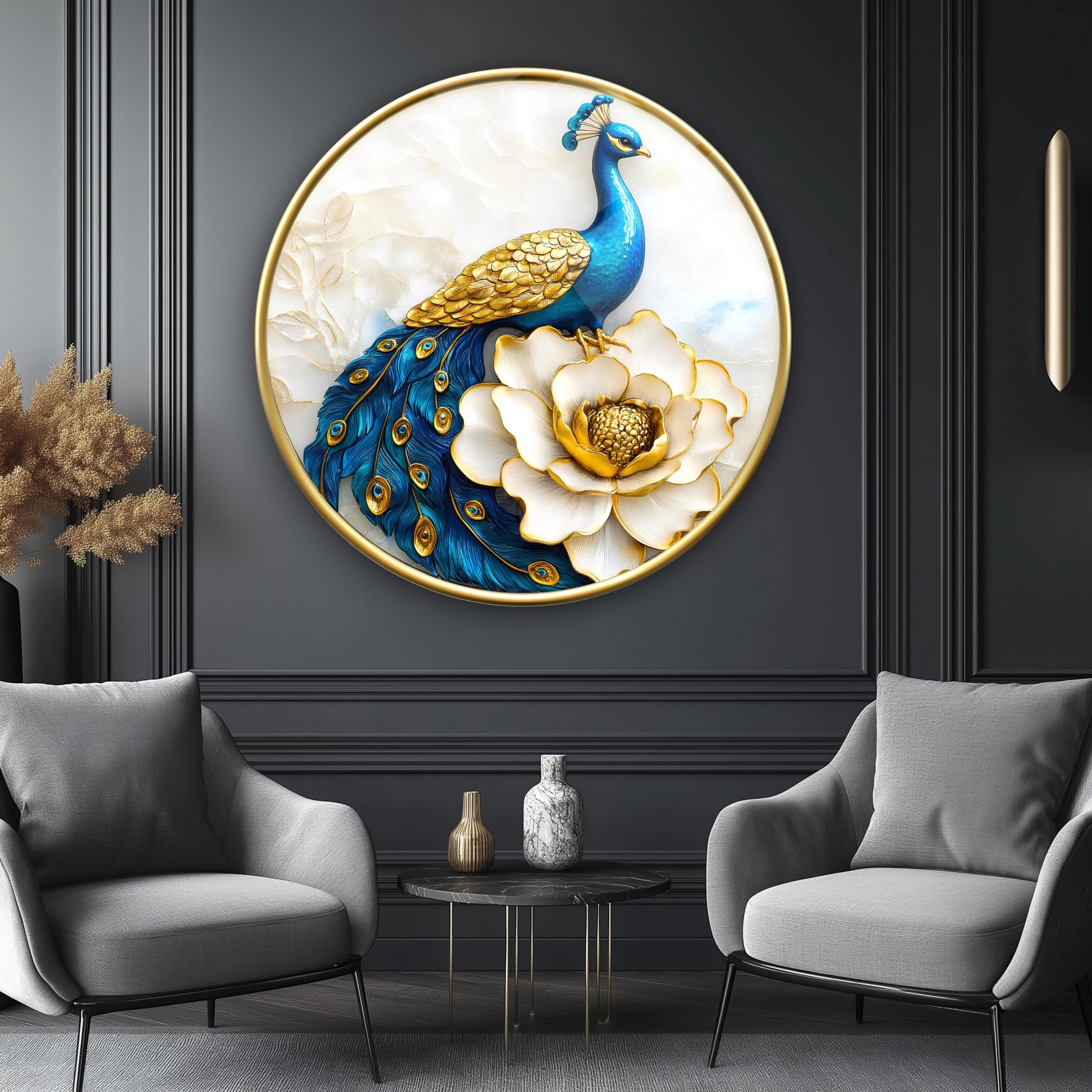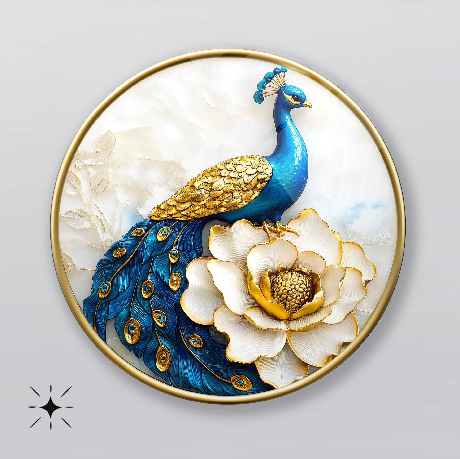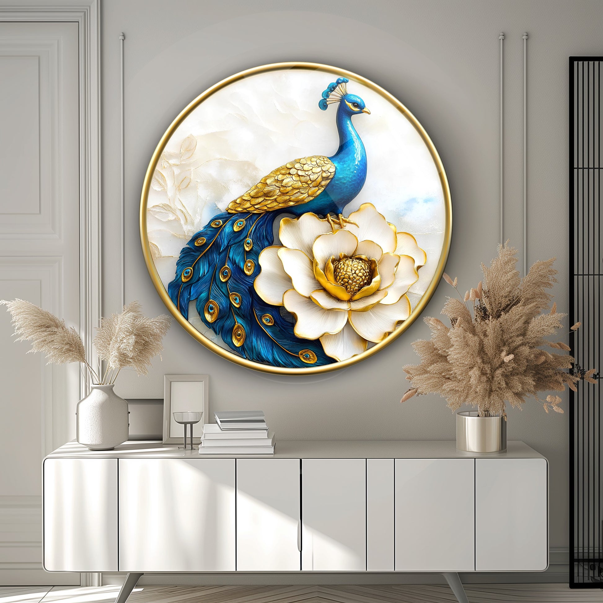 Mavi Tavus Kuşu Yuvarlak Cam Tablo