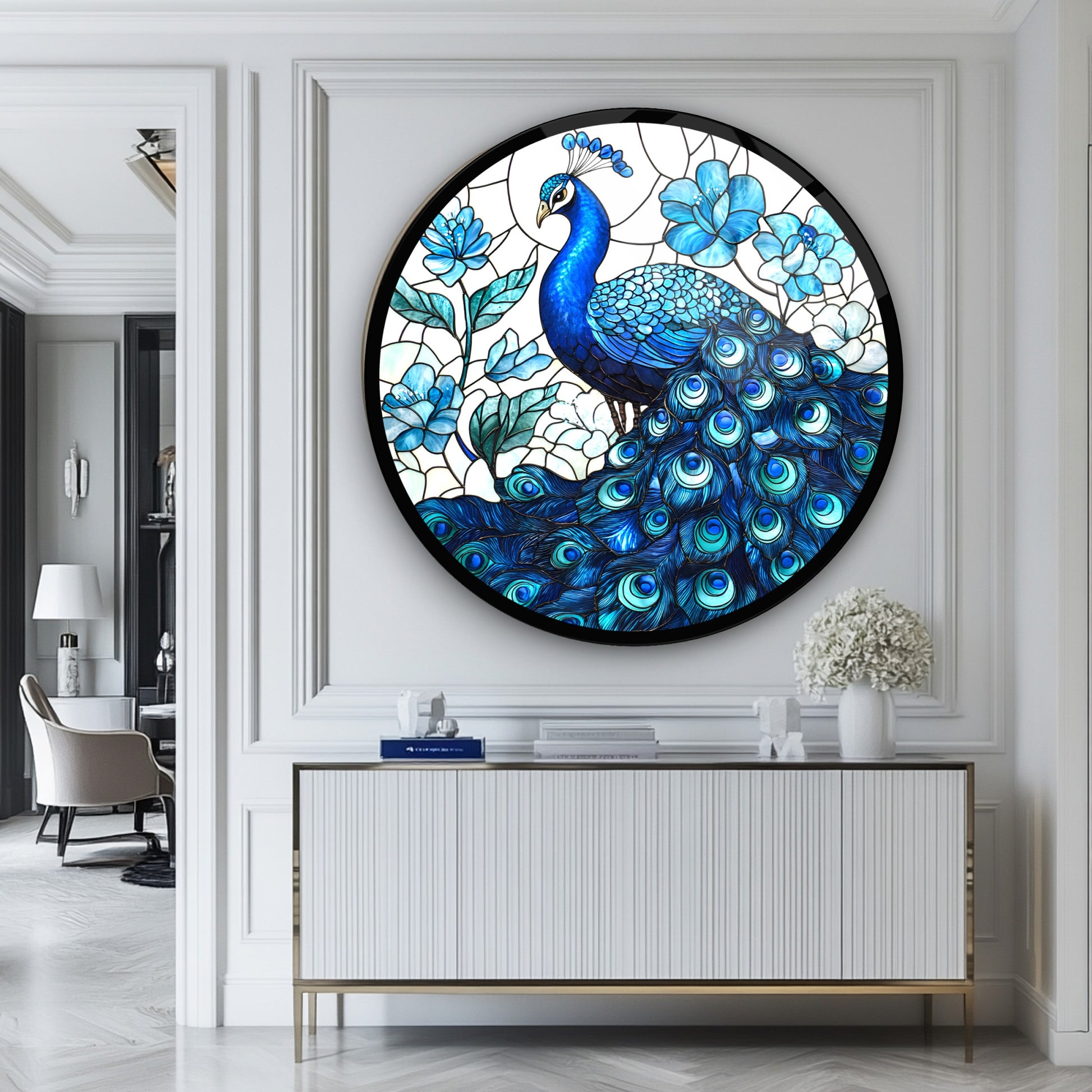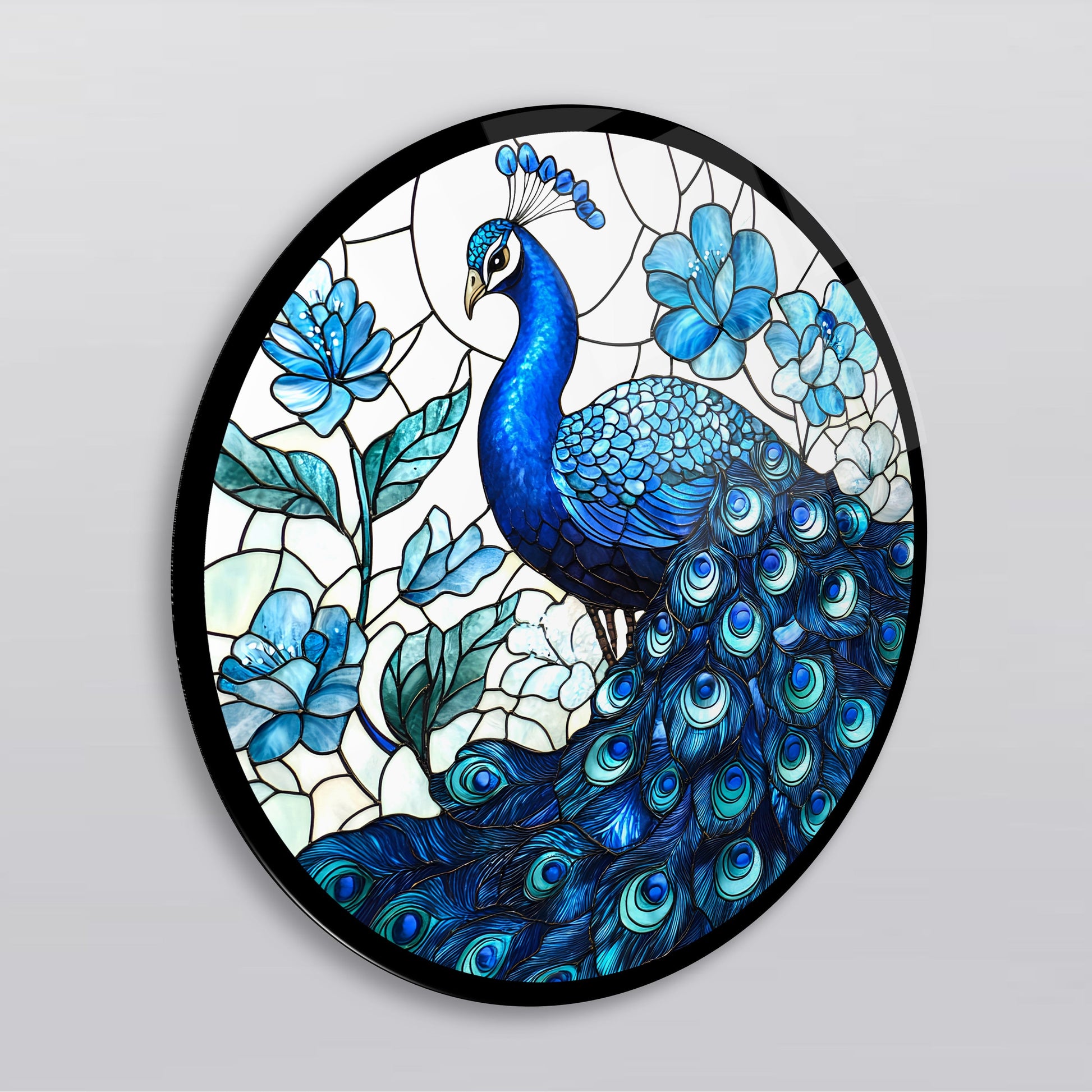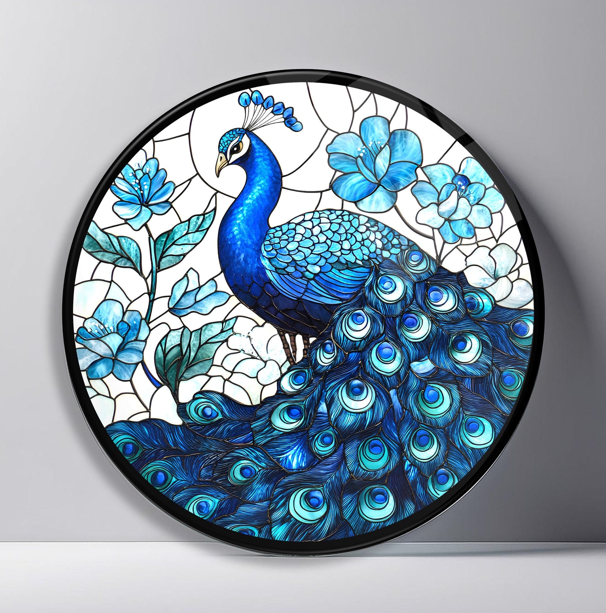 Çiçekli Mavi Tavus Kuşu Yuvarlak Cam Tablo