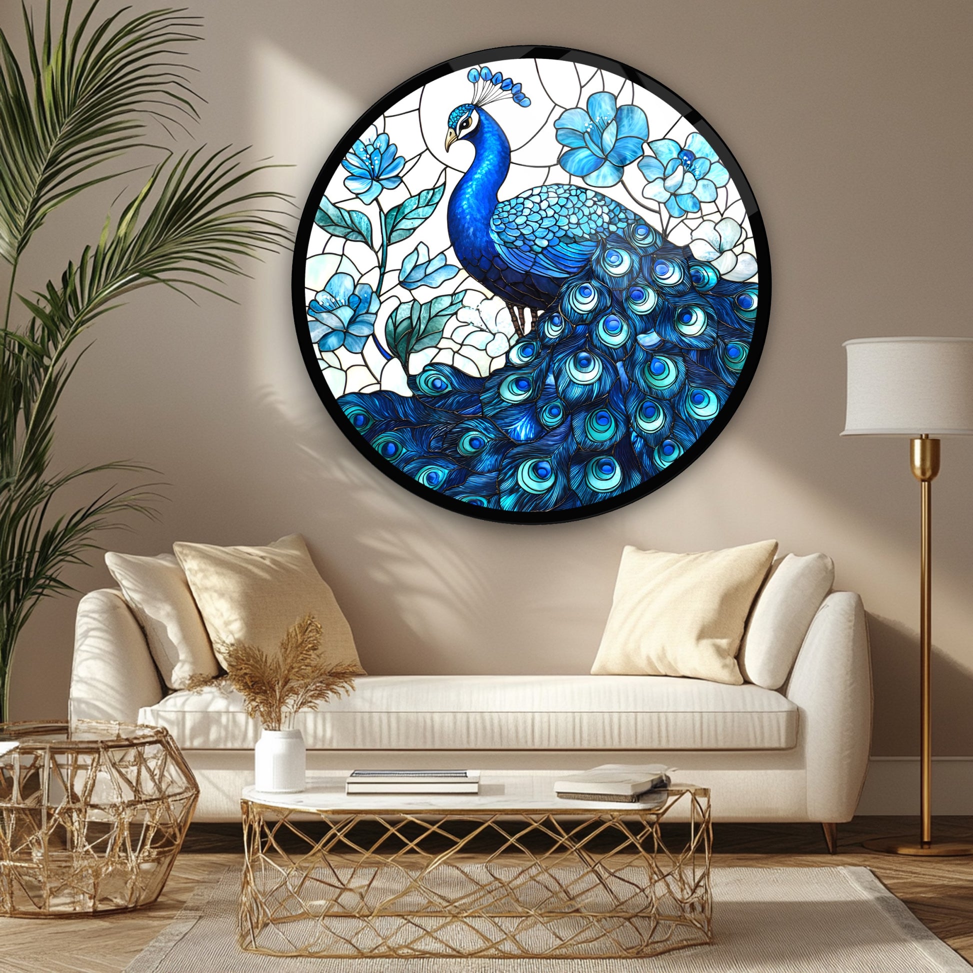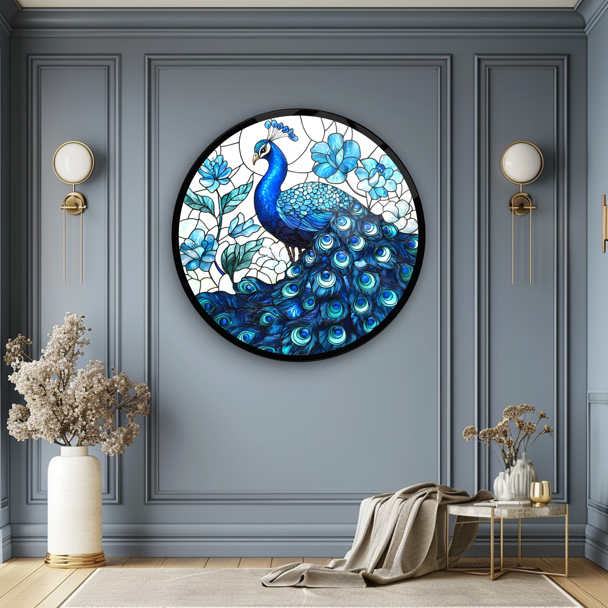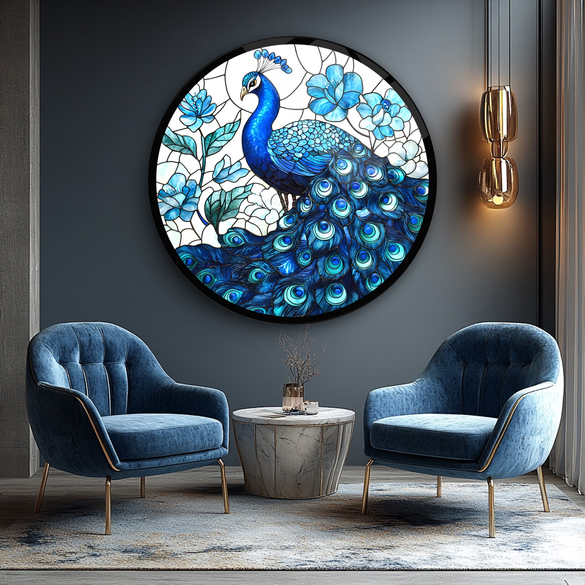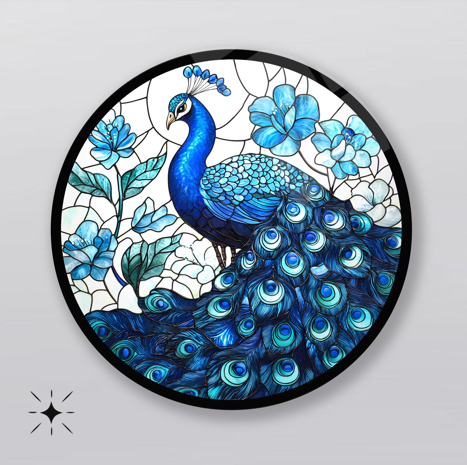 Çiçekli Mavi Tavus Kuşu Yuvarlak Cam Tablo