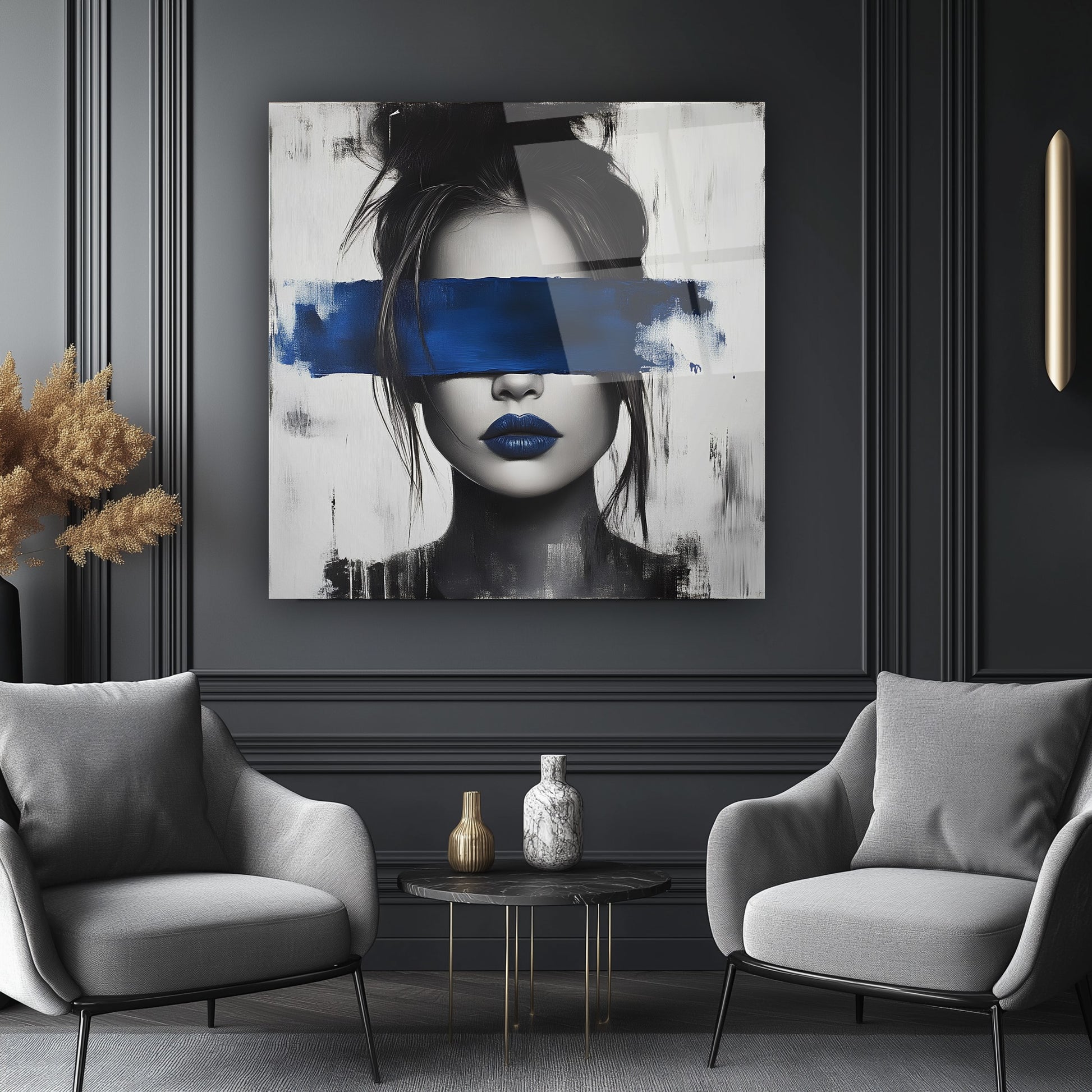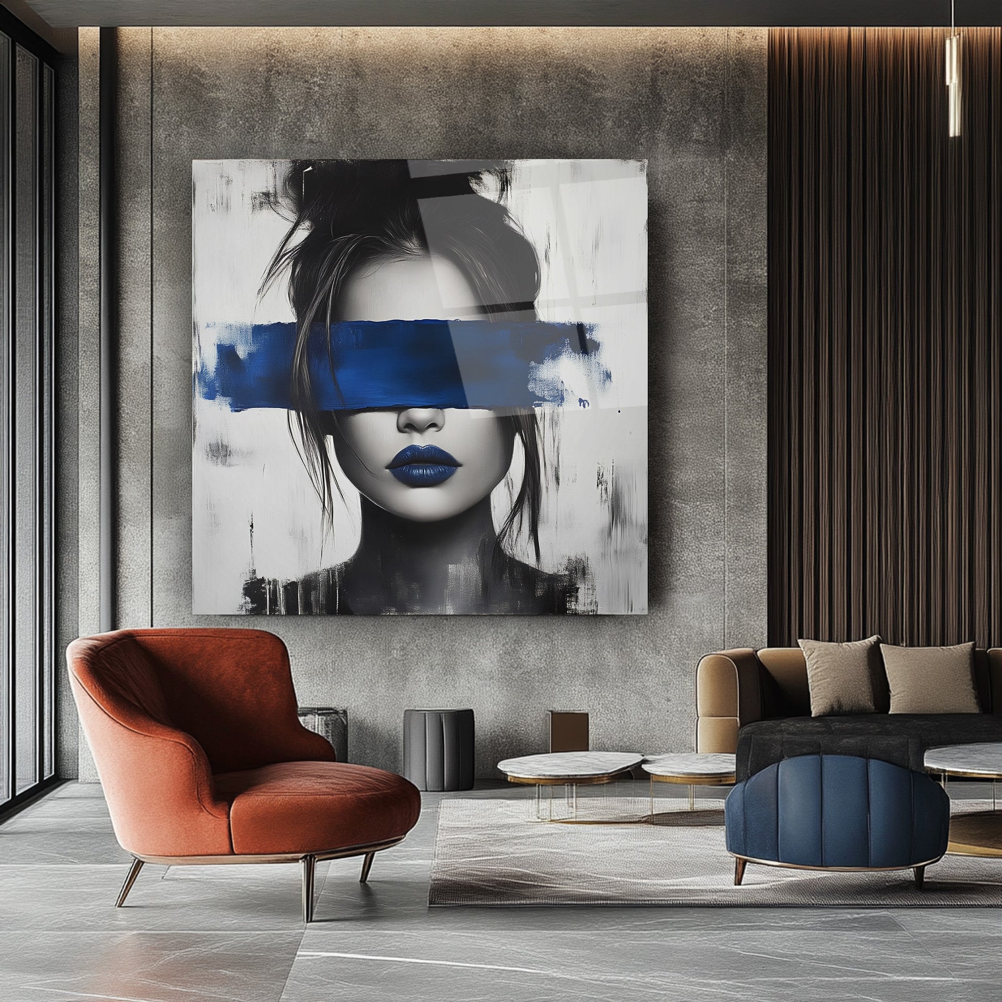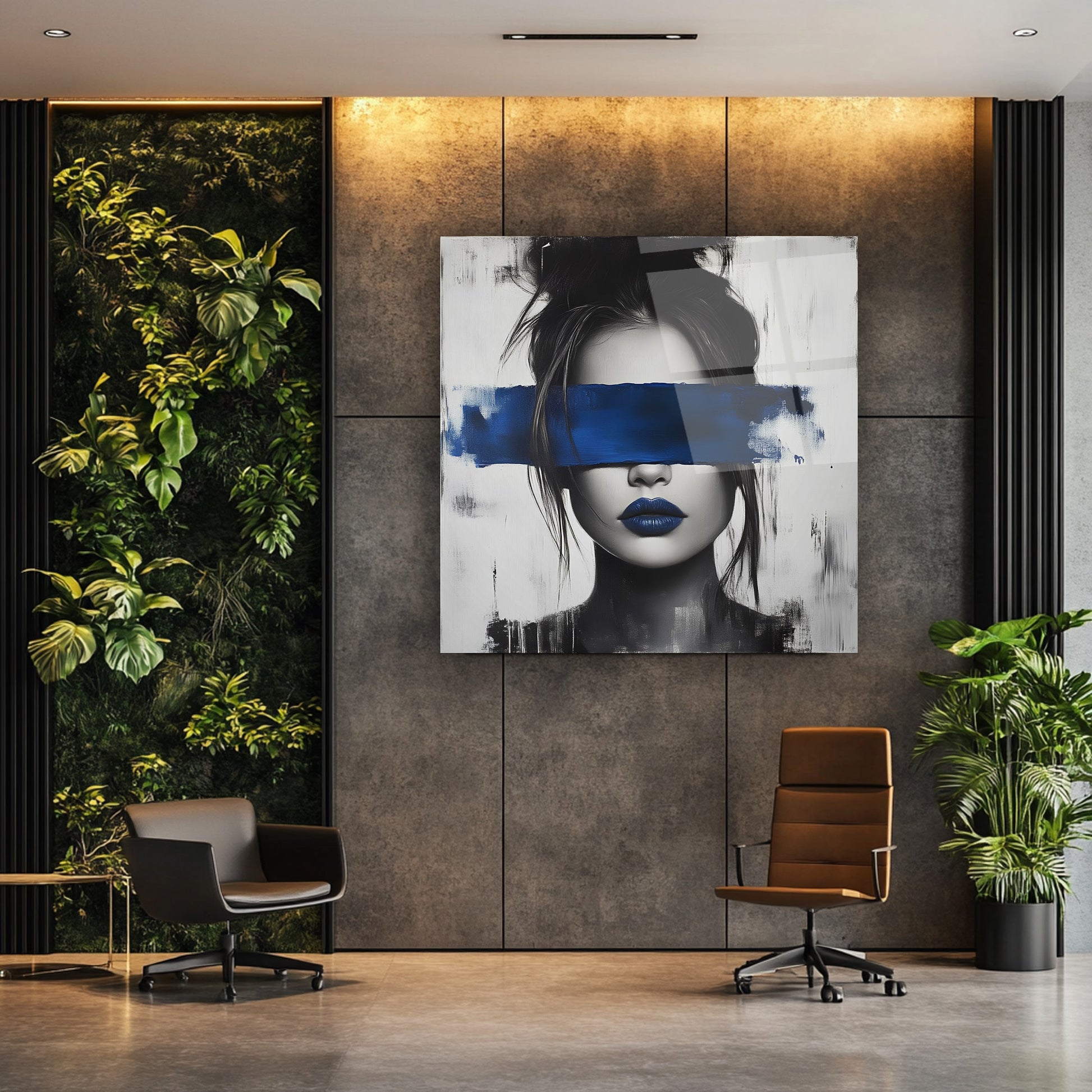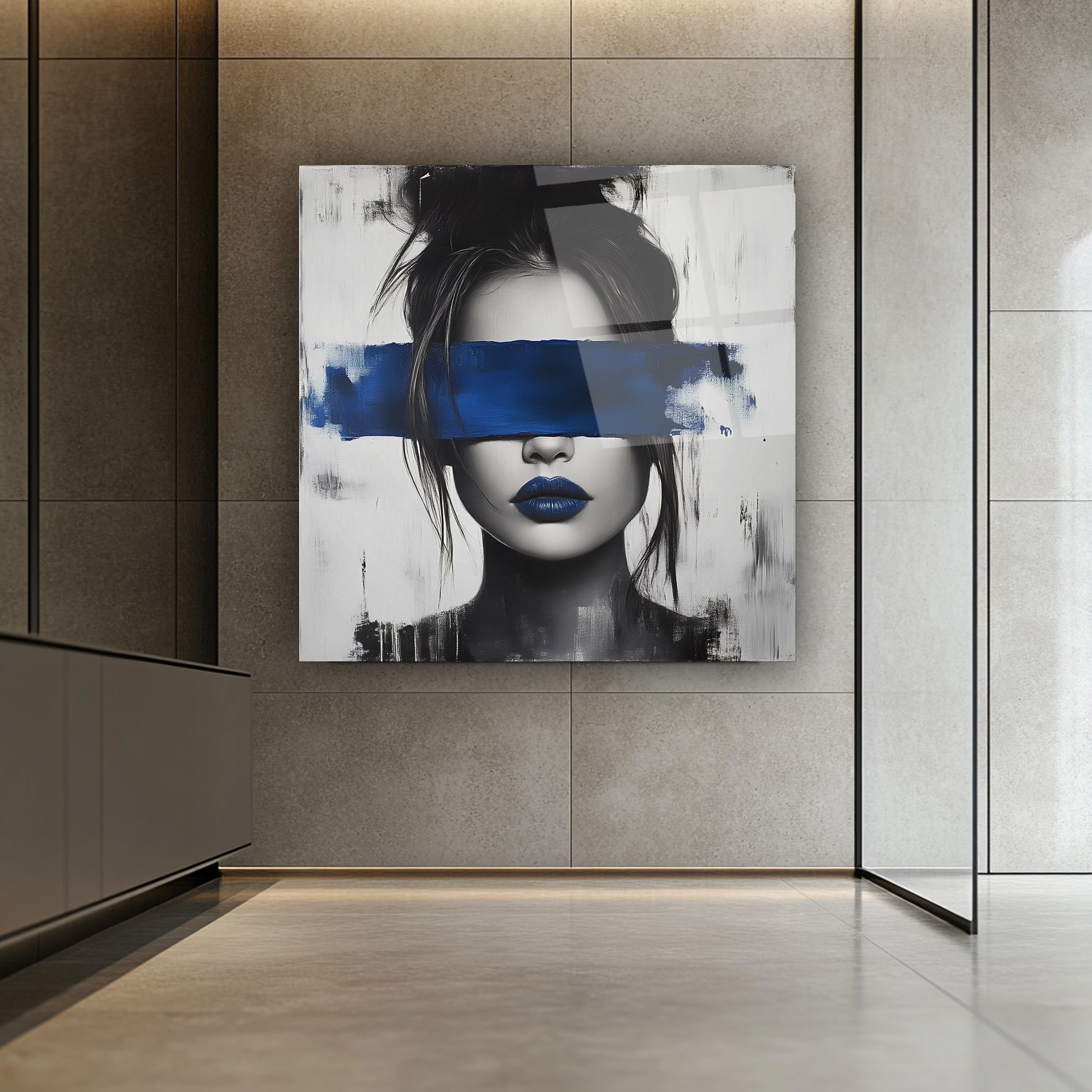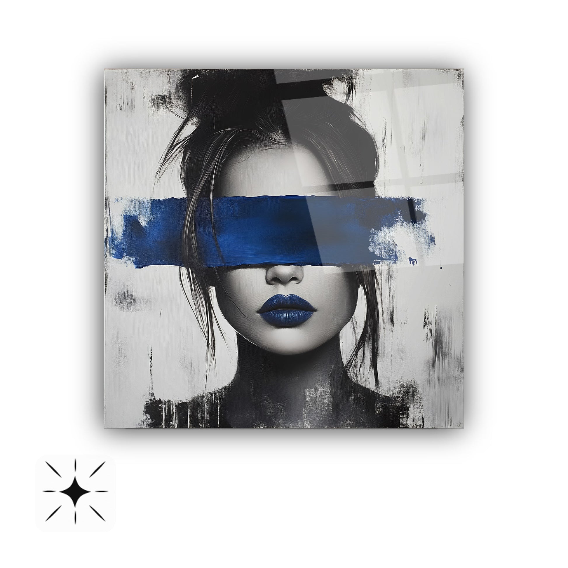 Mavi dudak ve göz bantlı kadın çizimi, modern ve sanatsal bir dokunuş sunar. Siyah arka plan üzerinde dikkat çeken bu gerçek cam tablo, güzellik merkezleri ve kuaförler için şık ve etkileyici bir dekorasyon seçeneğidir. Kırılmaz cam tablo yapısıyla dayanıklı ve estetik bir tercih sunar.