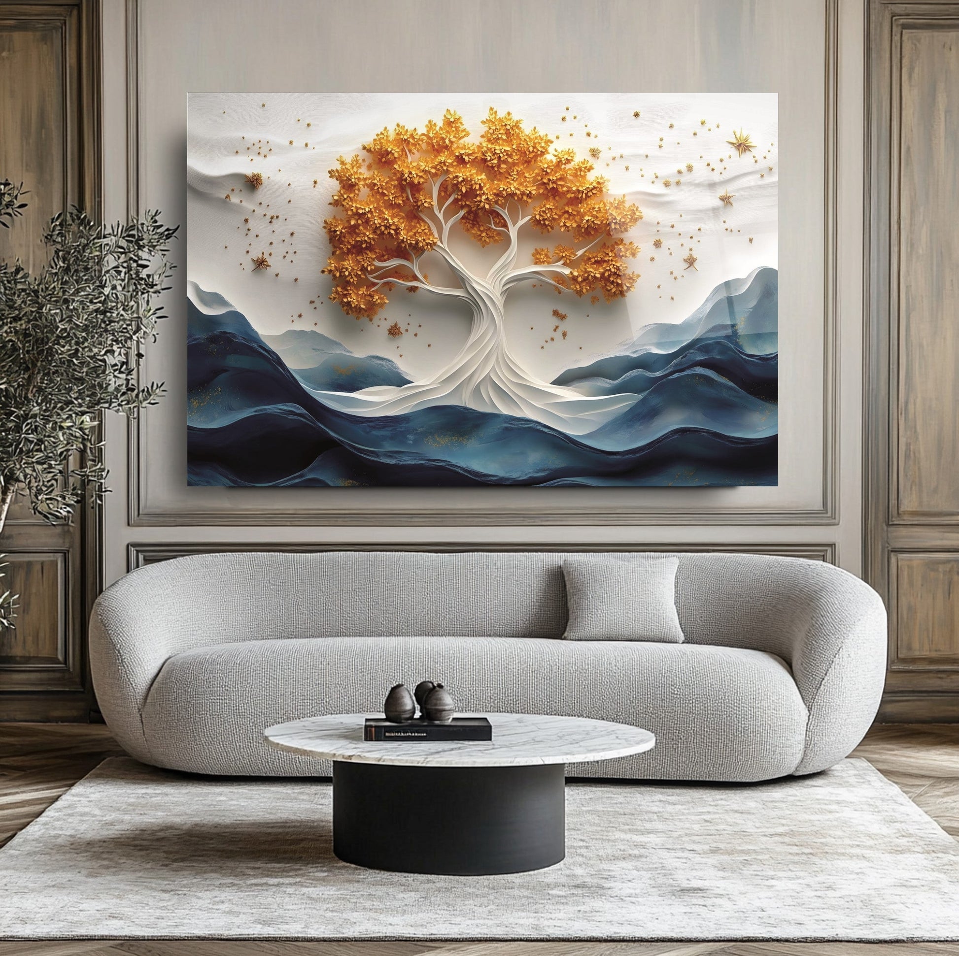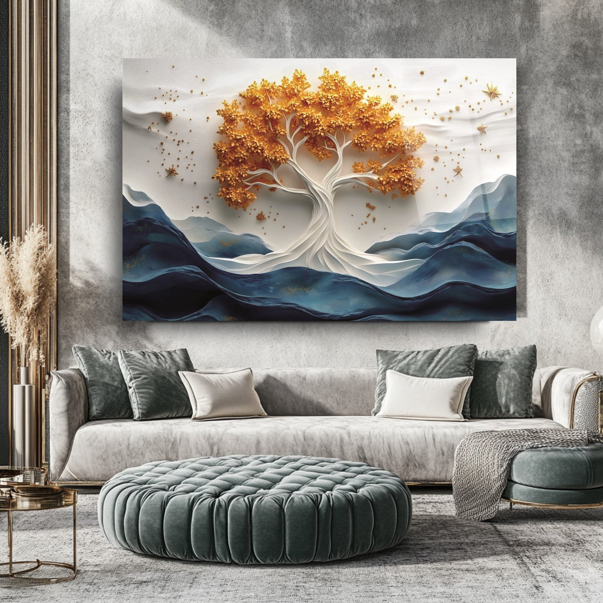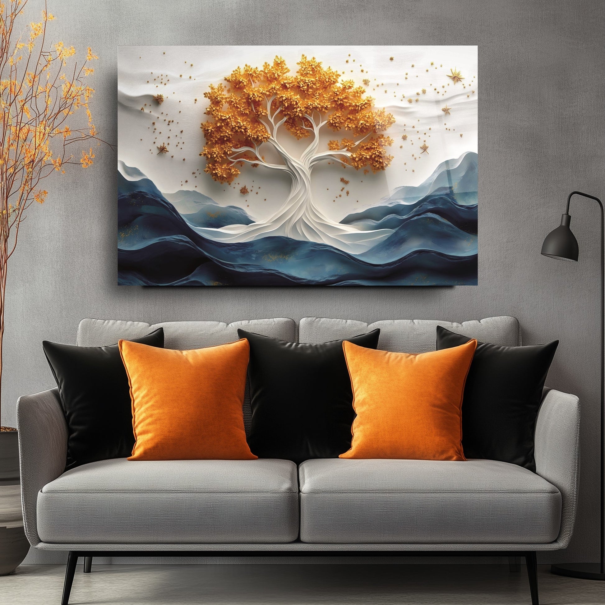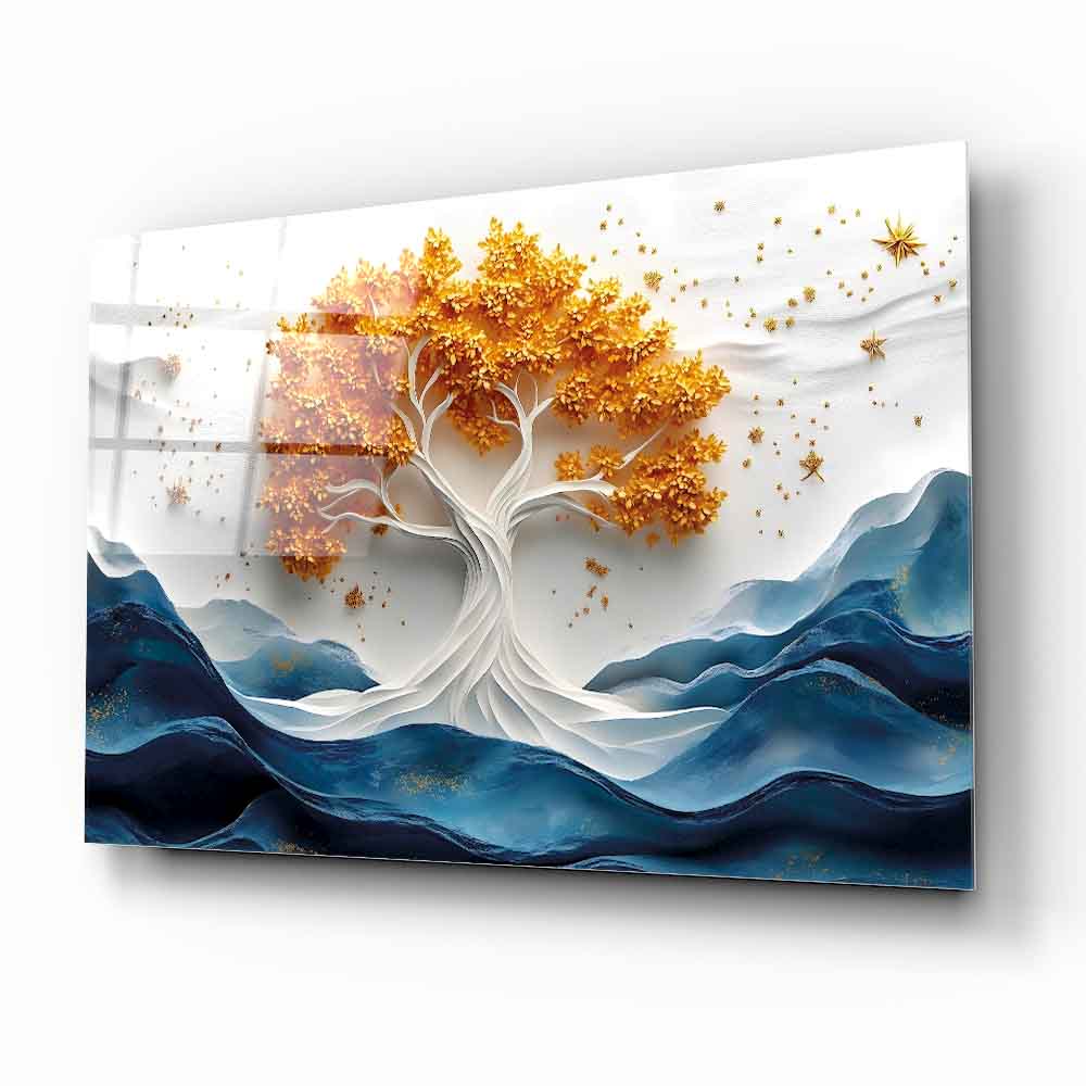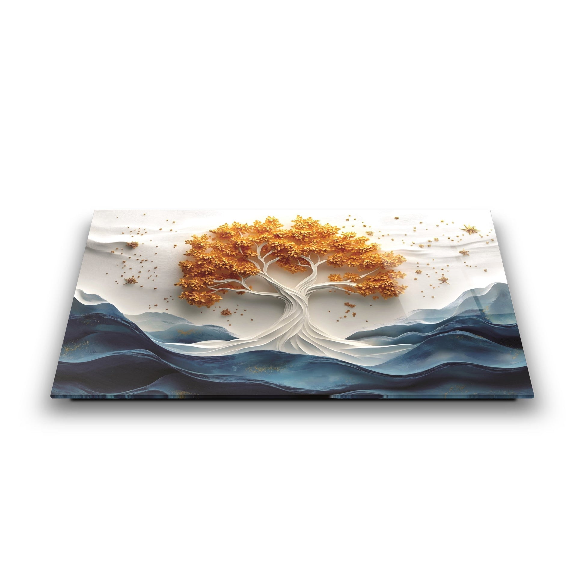 Mekanlarınıza Dinamik Bir Yaşam ve Renk Katın: Dalgalar Mavi Turuncu Hayat Ağacı Cam Tablo