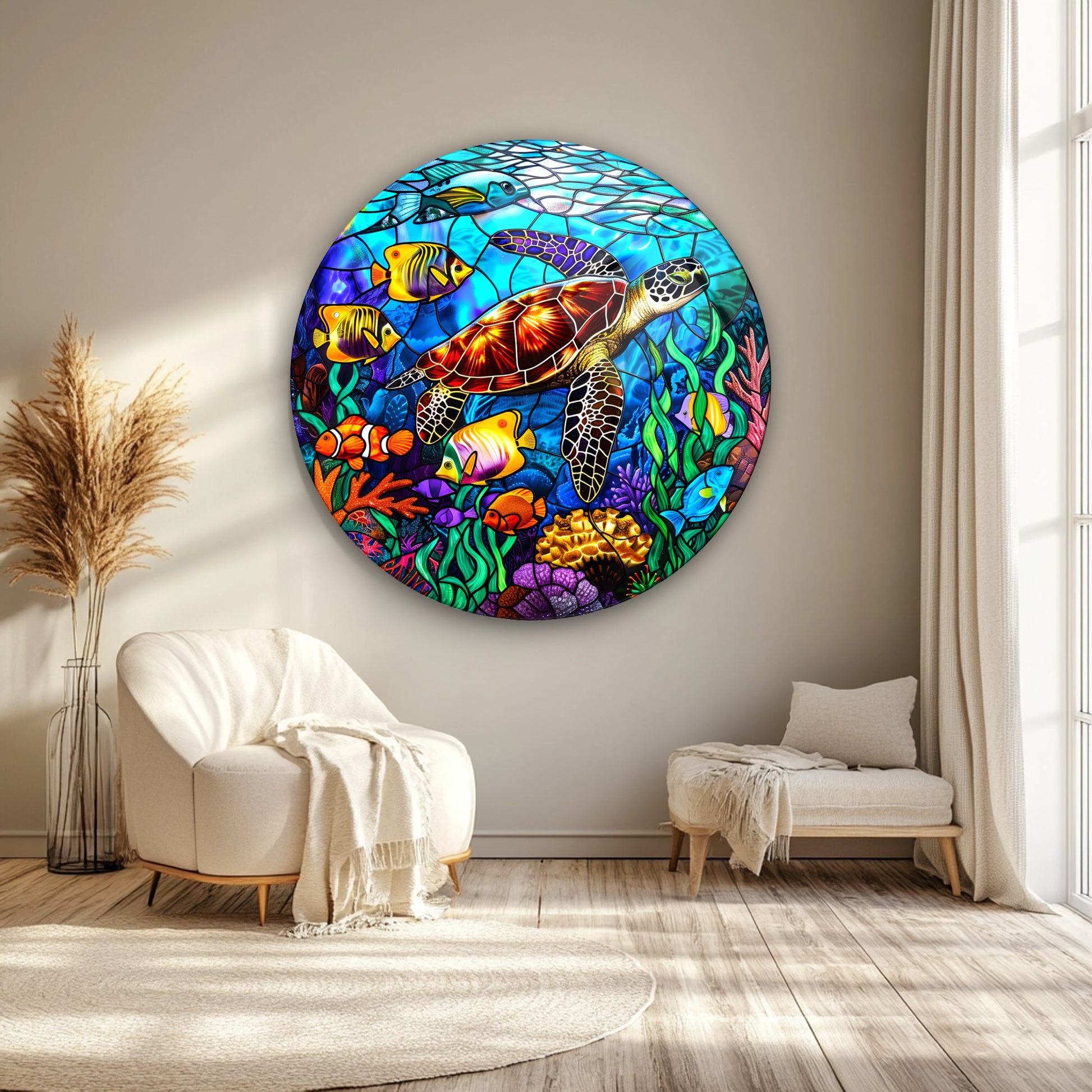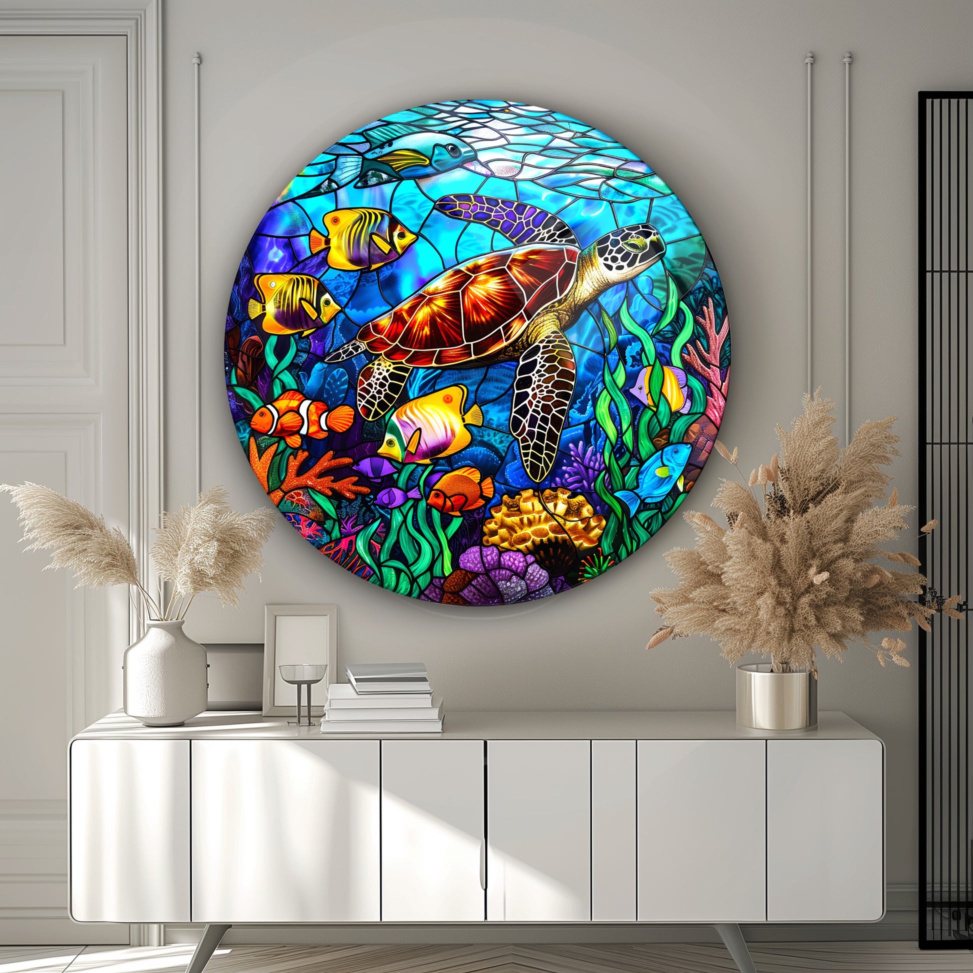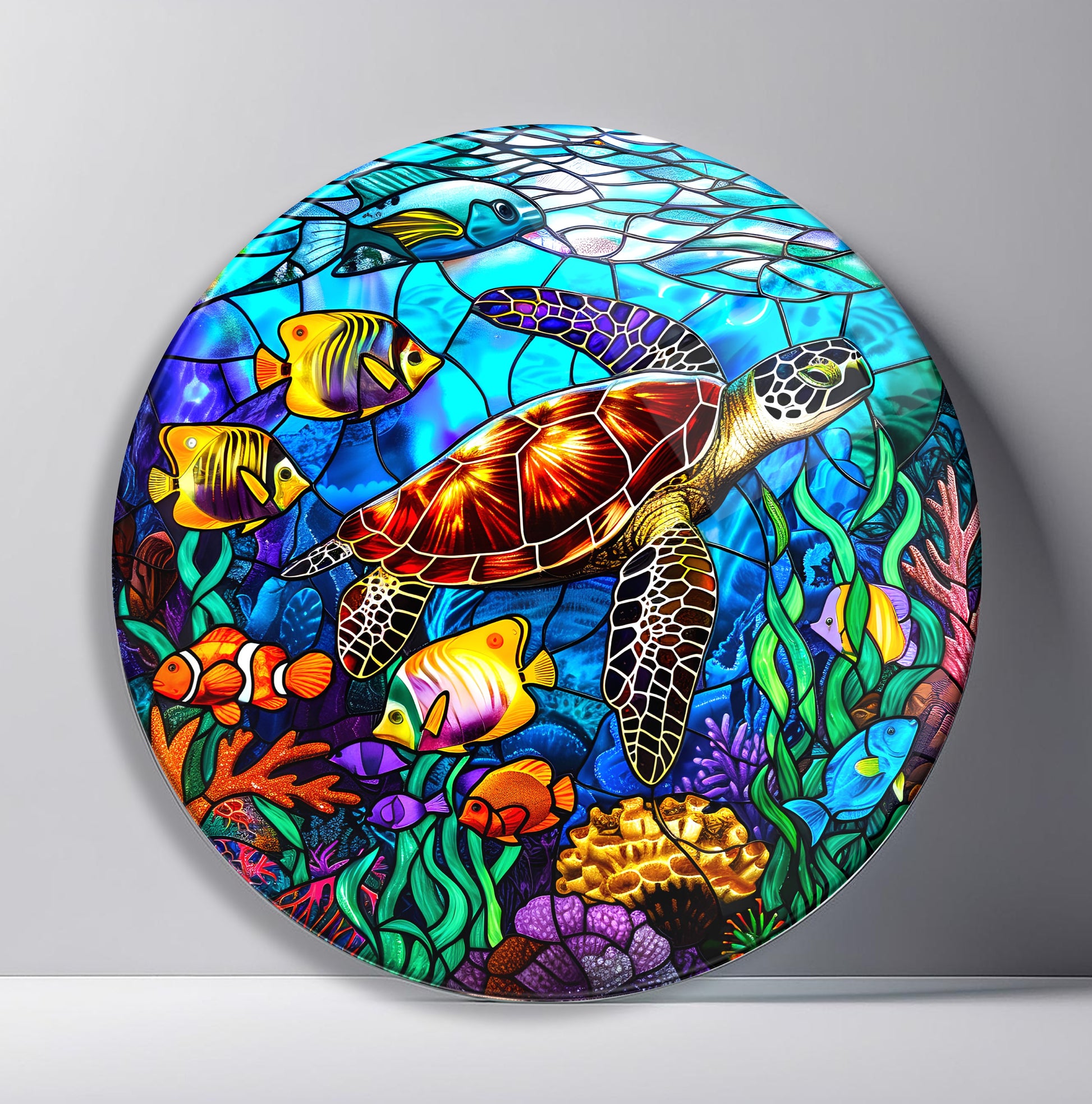 Deniz Kaplumbağası ve Balıklar Yuvarlak Cam Tablo