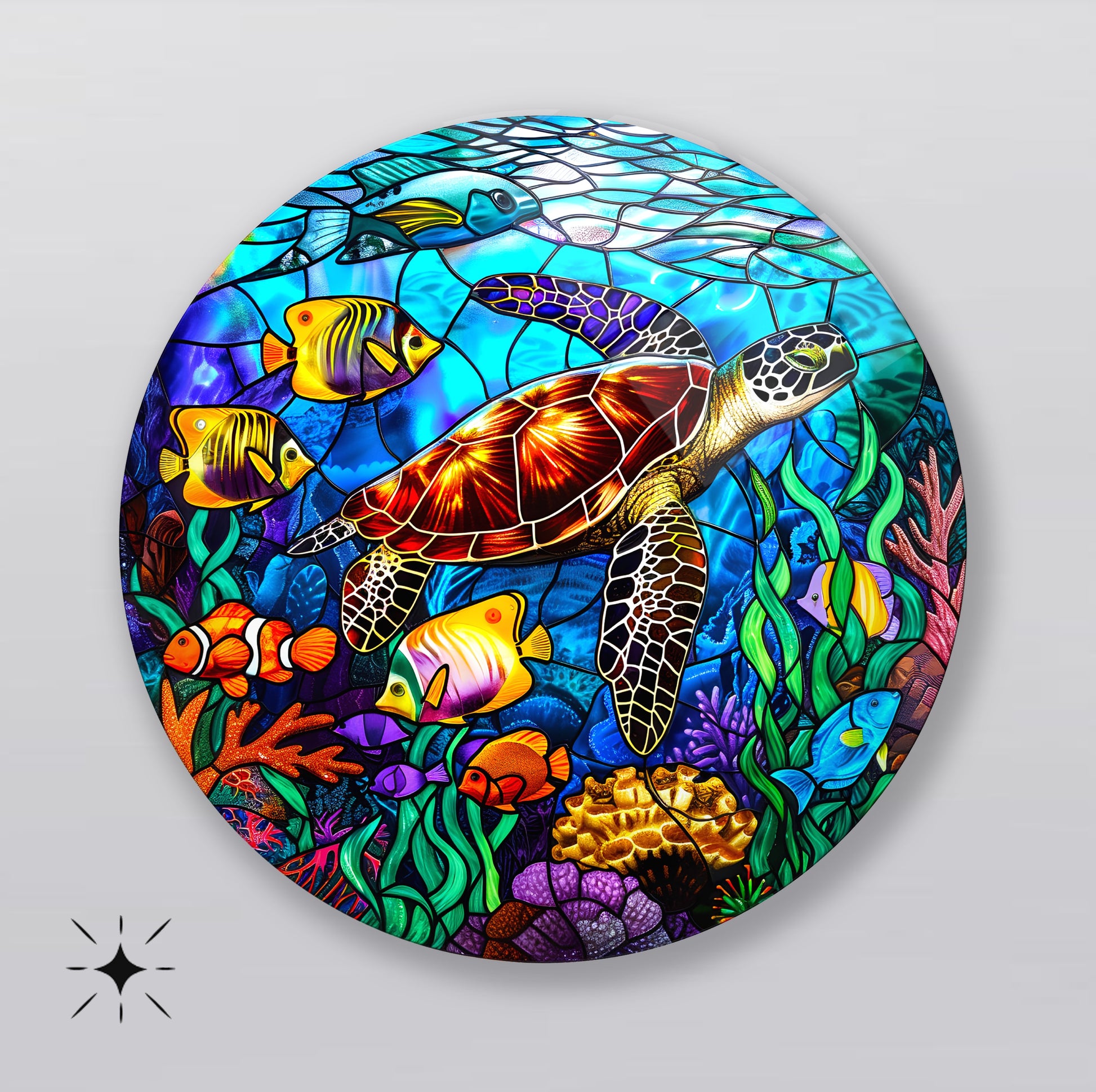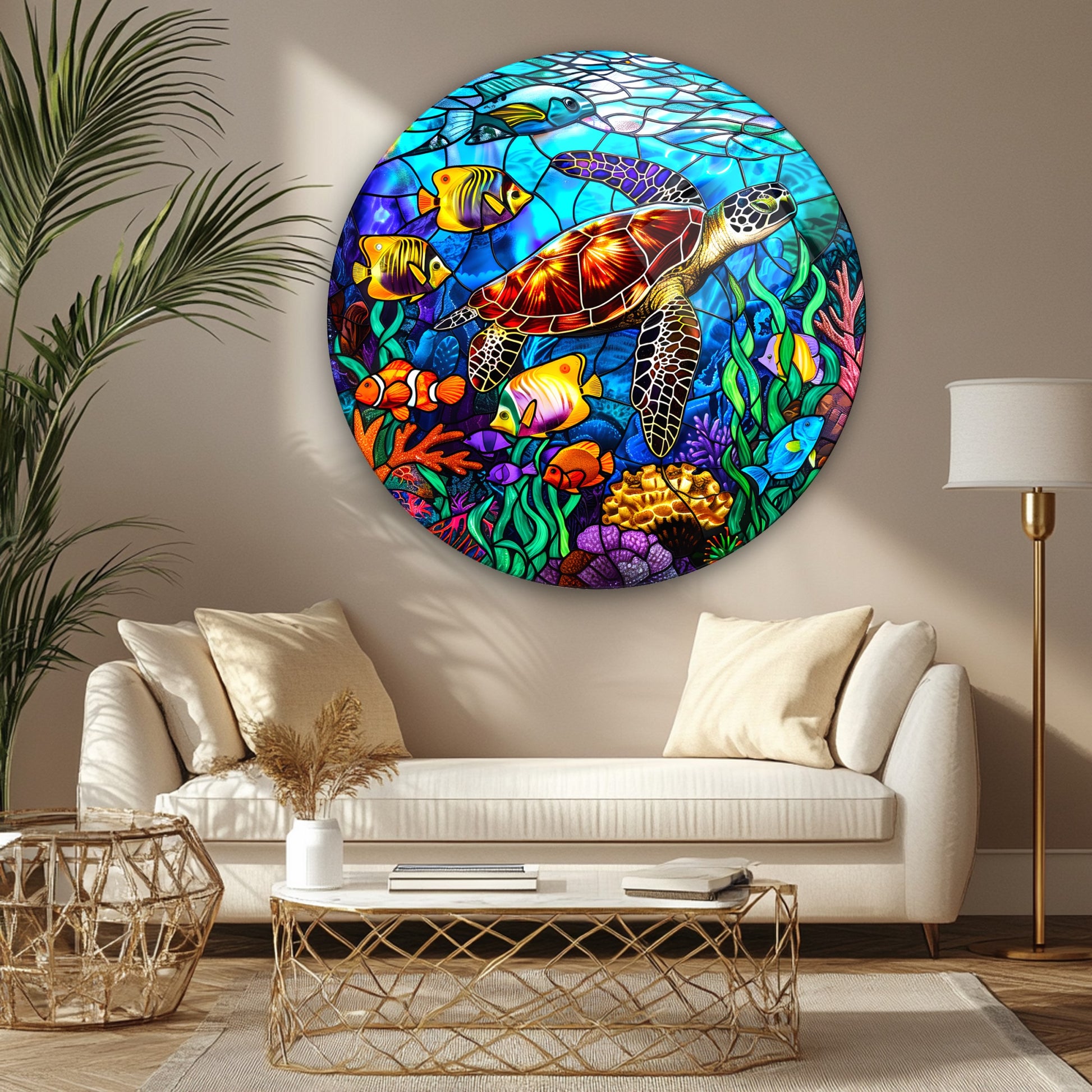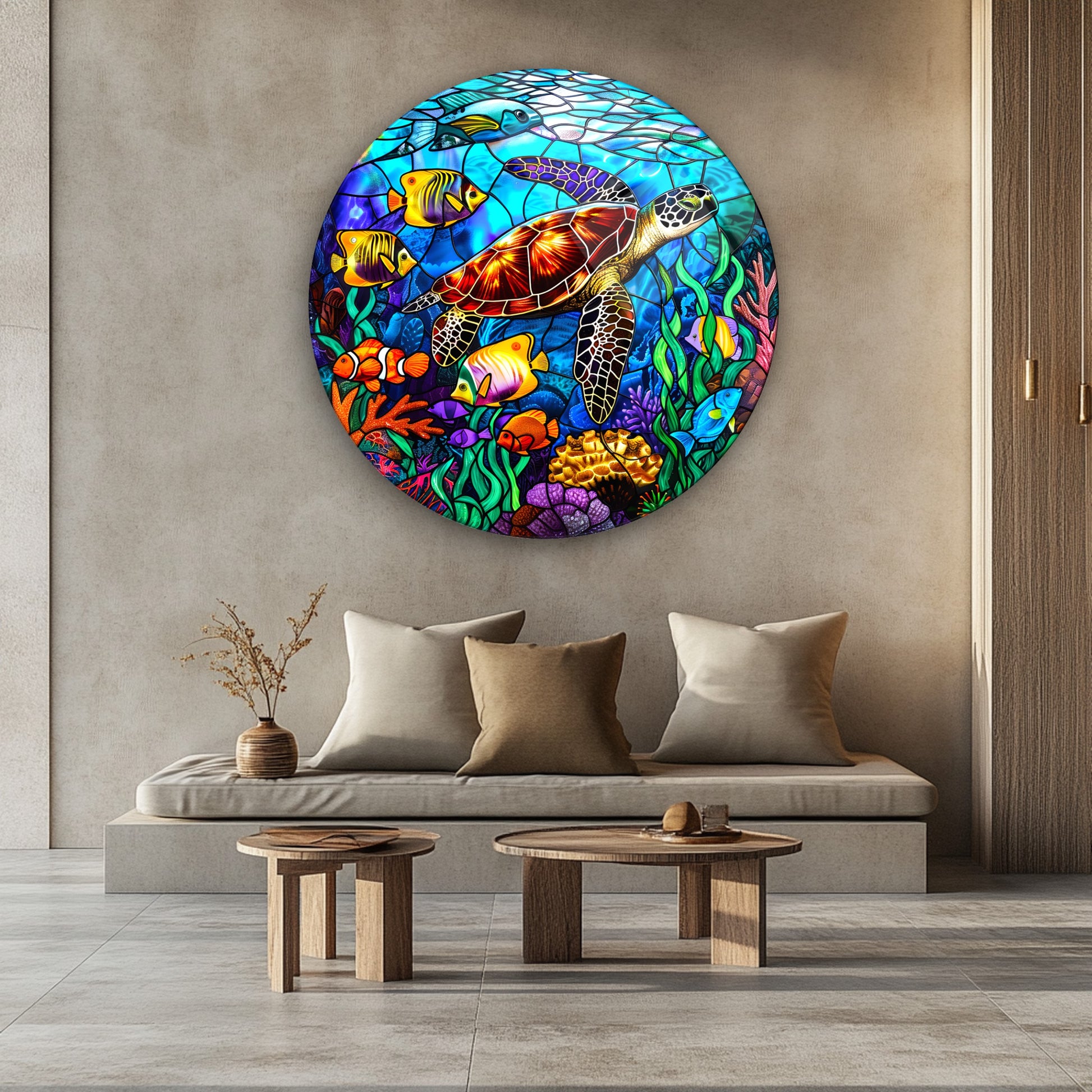 Deniz Kaplumbağası ve Balıklar Yuvarlak Cam Tablo