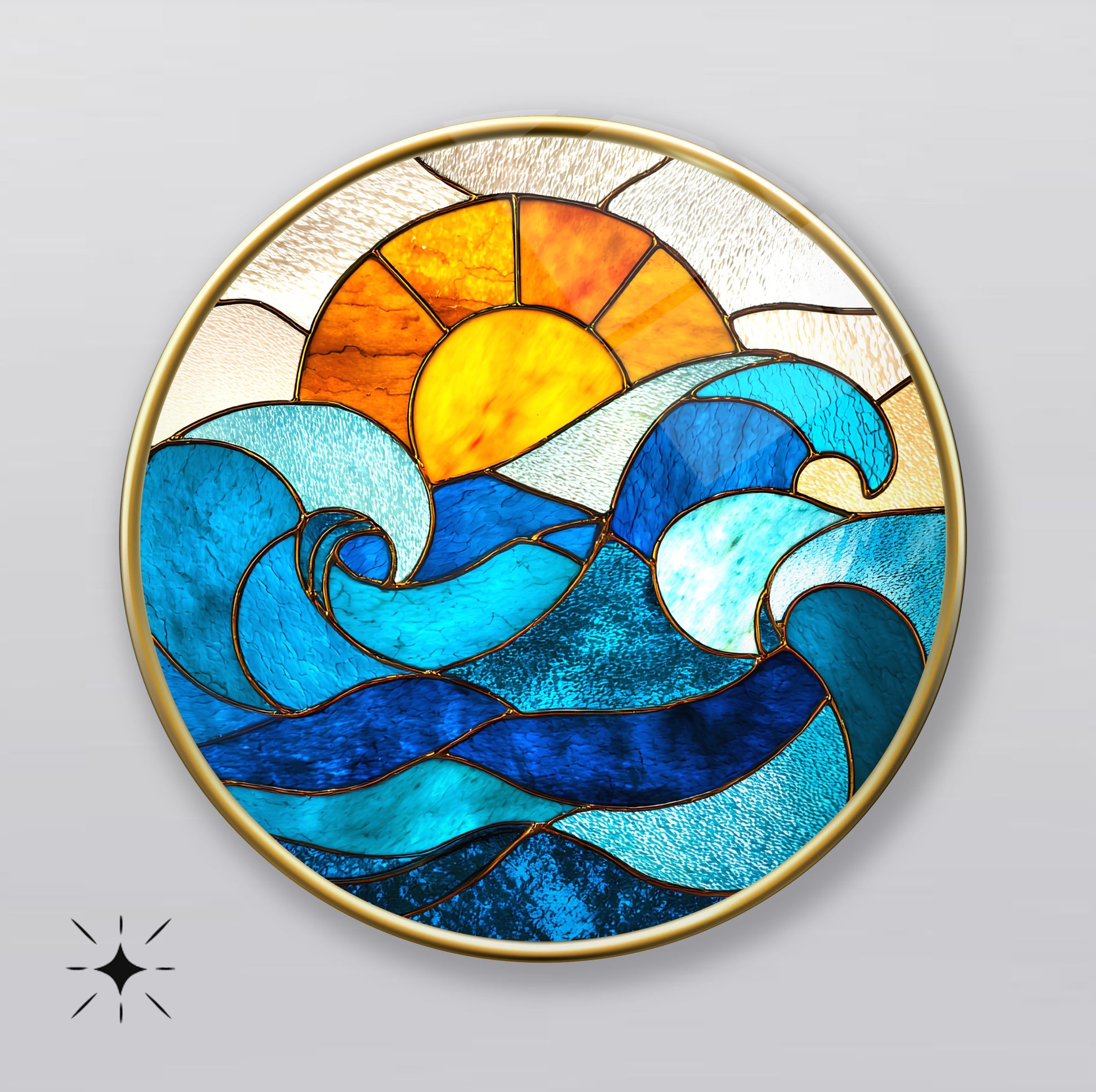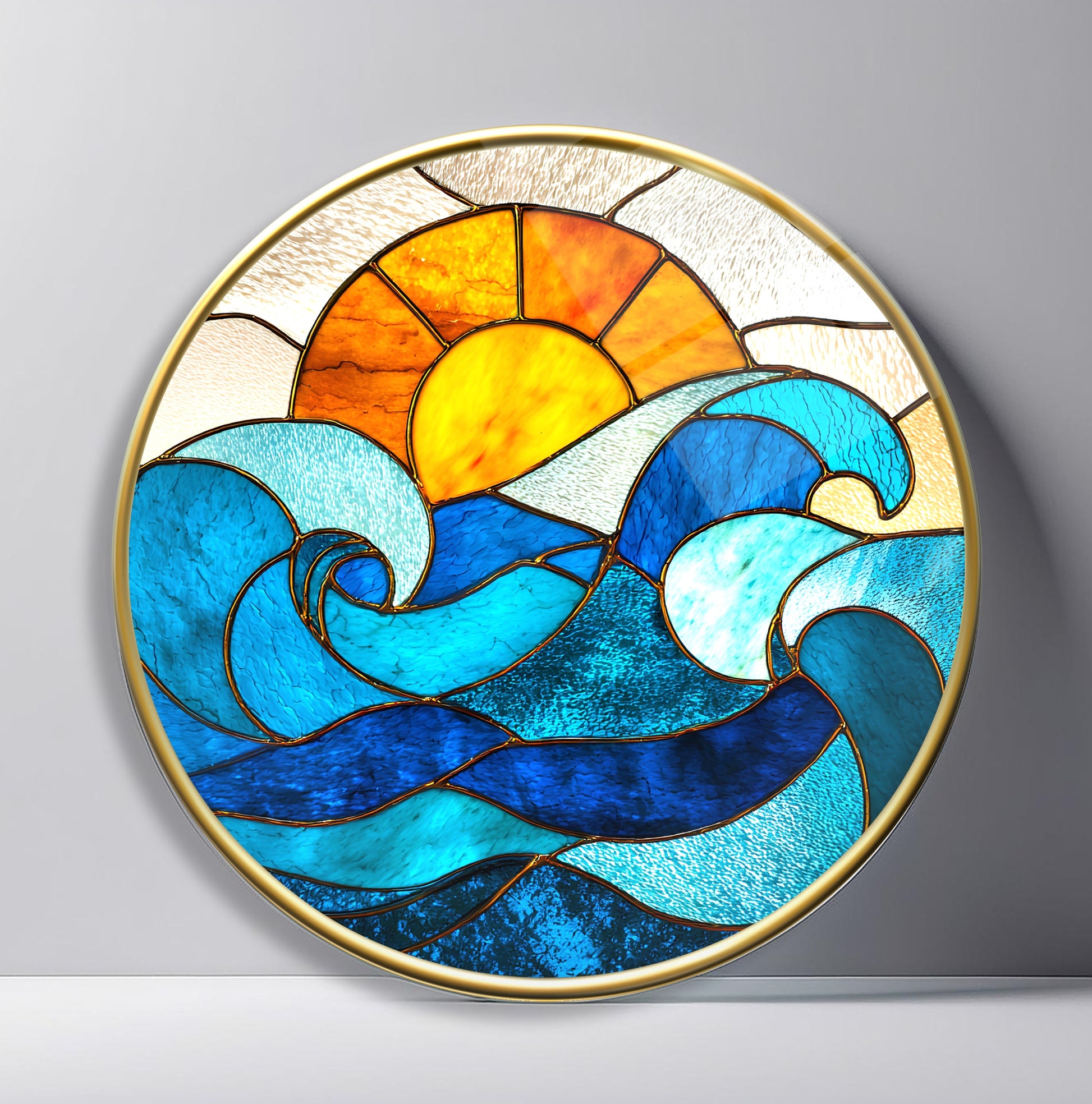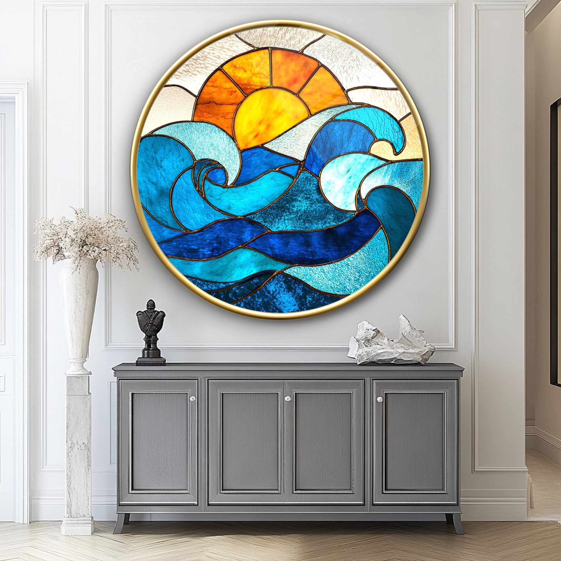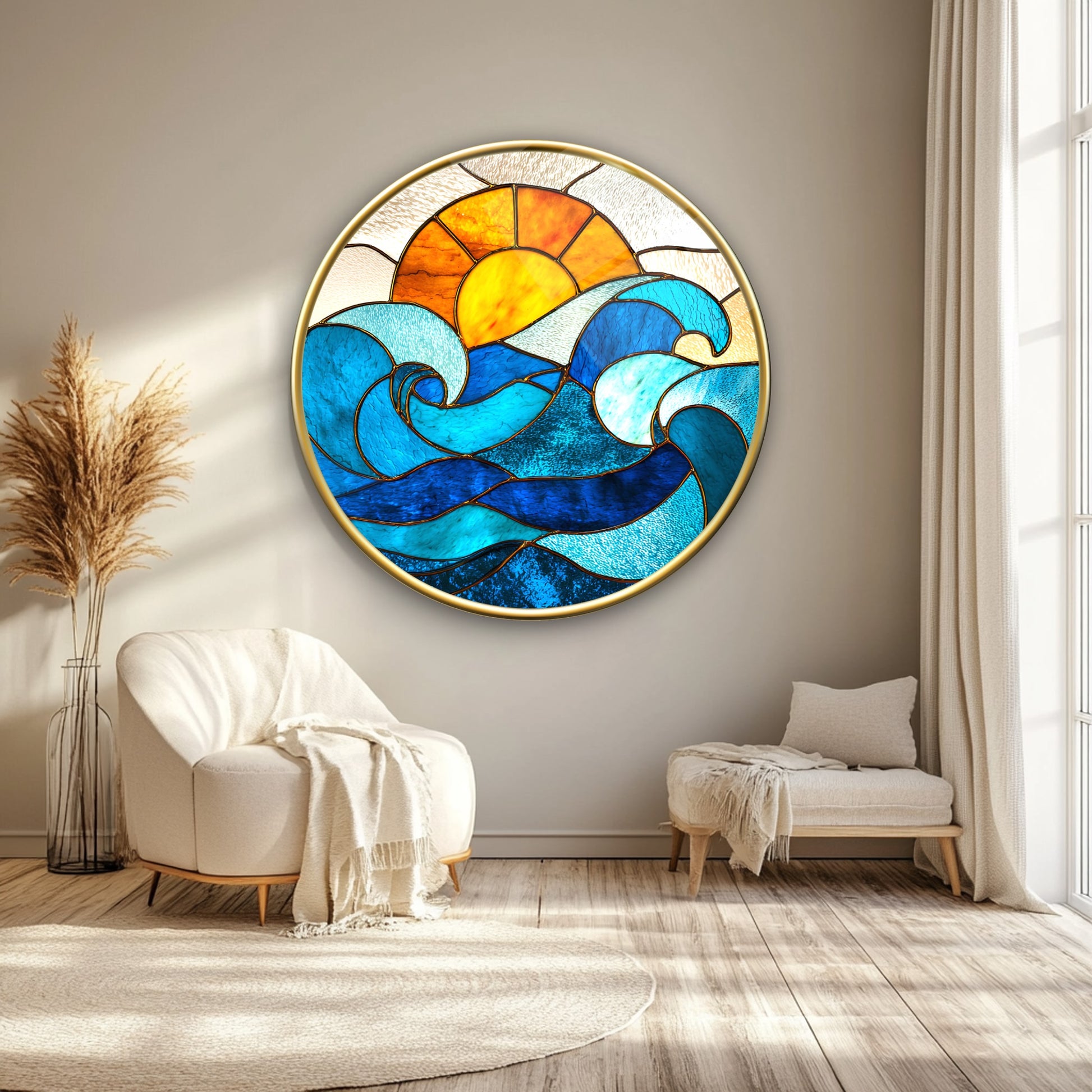 Vitray Desen Güneş ve Deniz Yuvarlak Cam Tablo