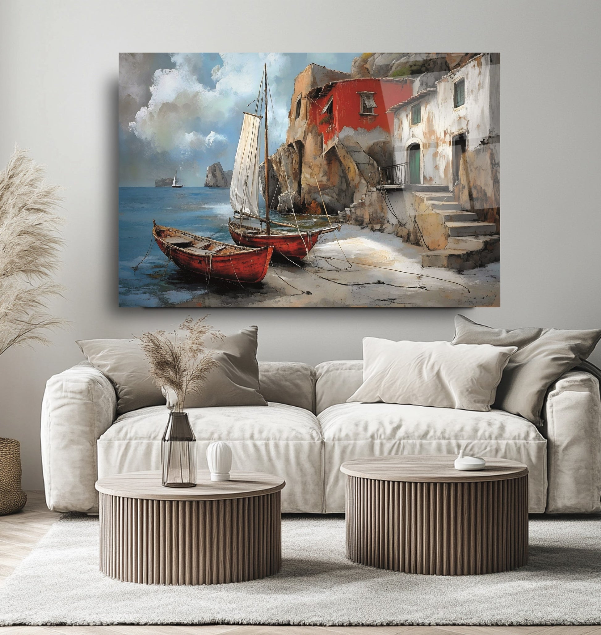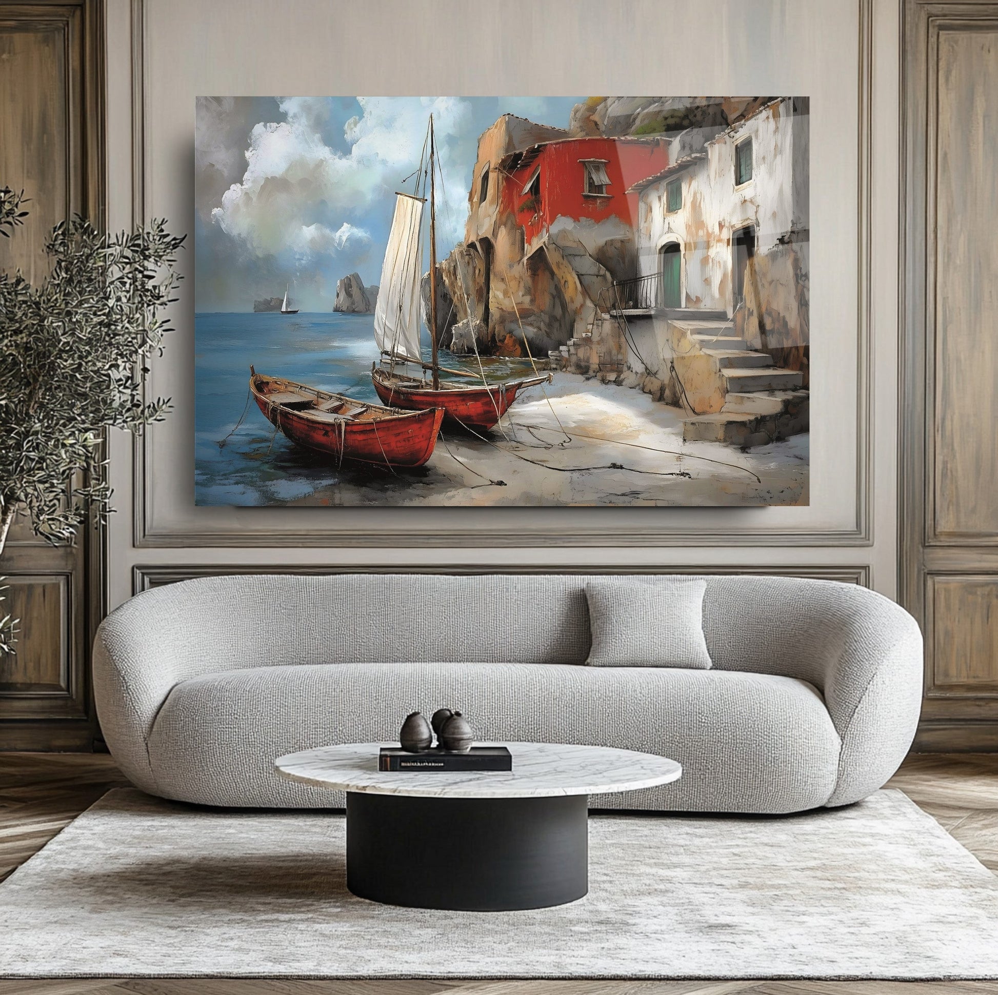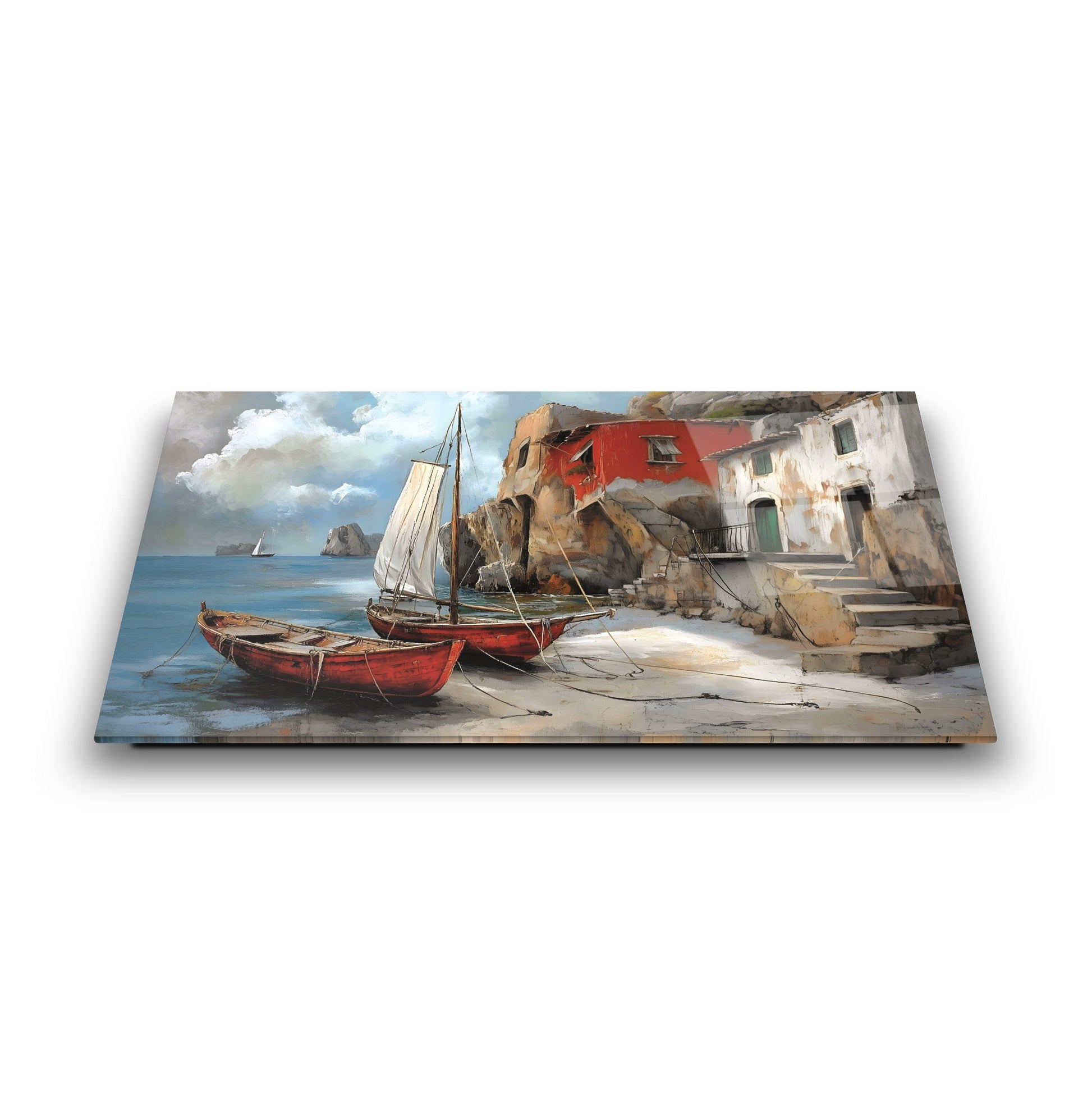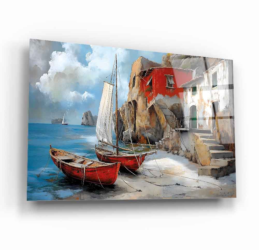 Mekanlarınıza Sahil Kasabası Huzurunu Taşıyın: Deniz Sahil Kasabası Sandal Cam Tablo