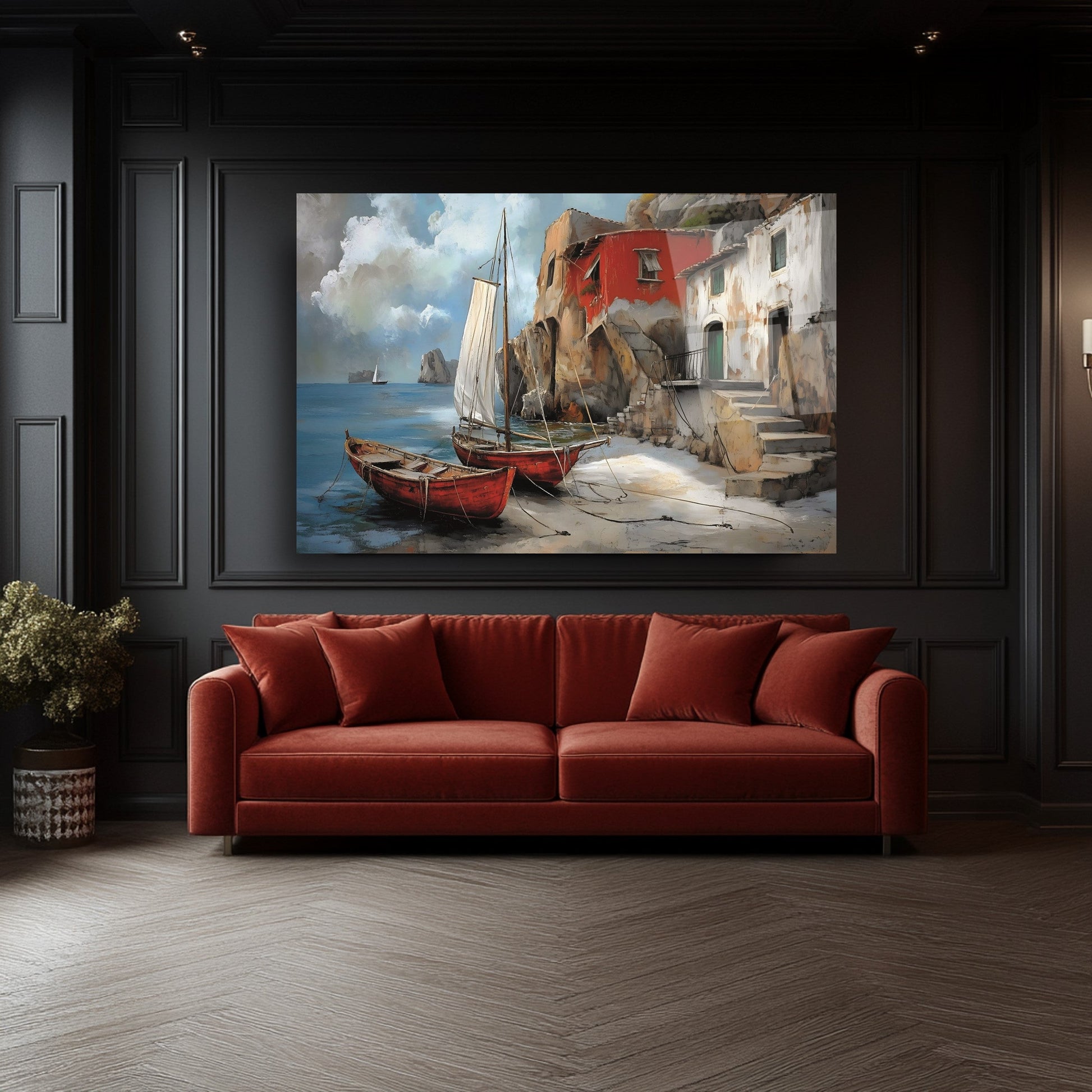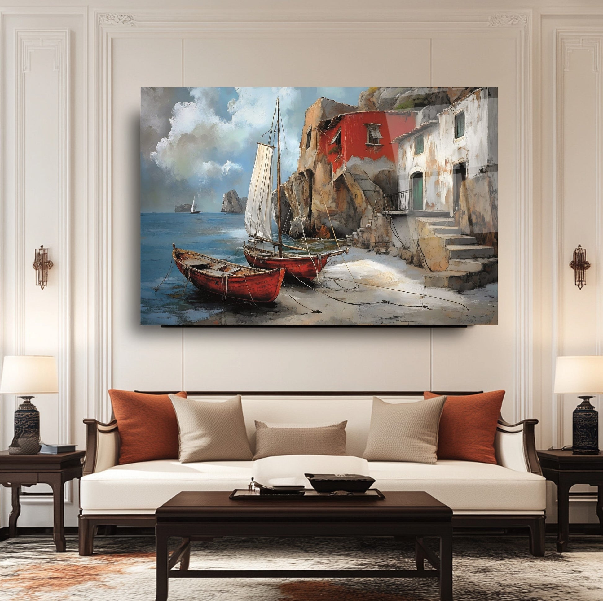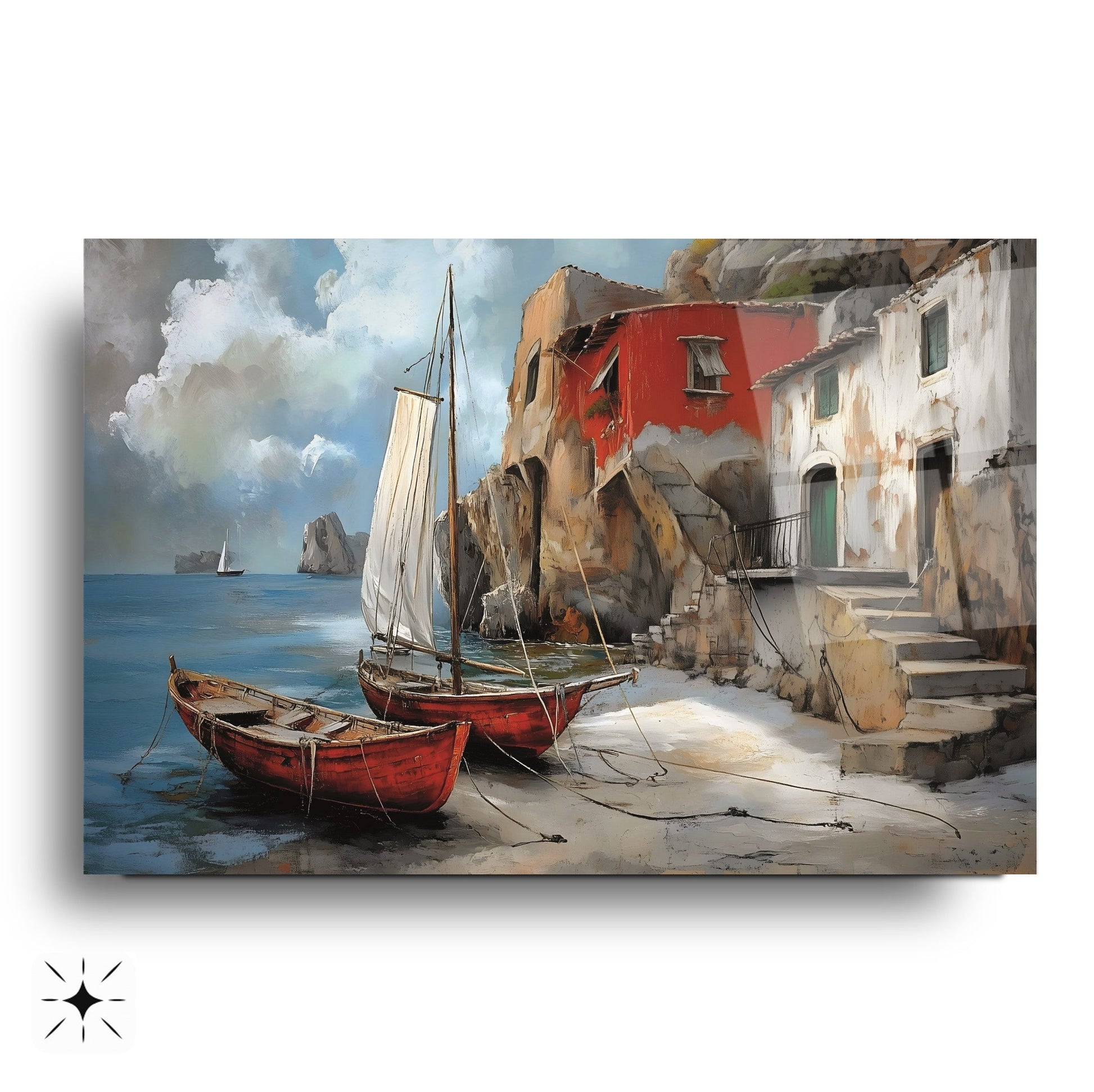Mekanlarınıza Sahil Kasabası Huzurunu Taşıyın: Deniz Sahil Kasabası Sandal Cam Tablo
