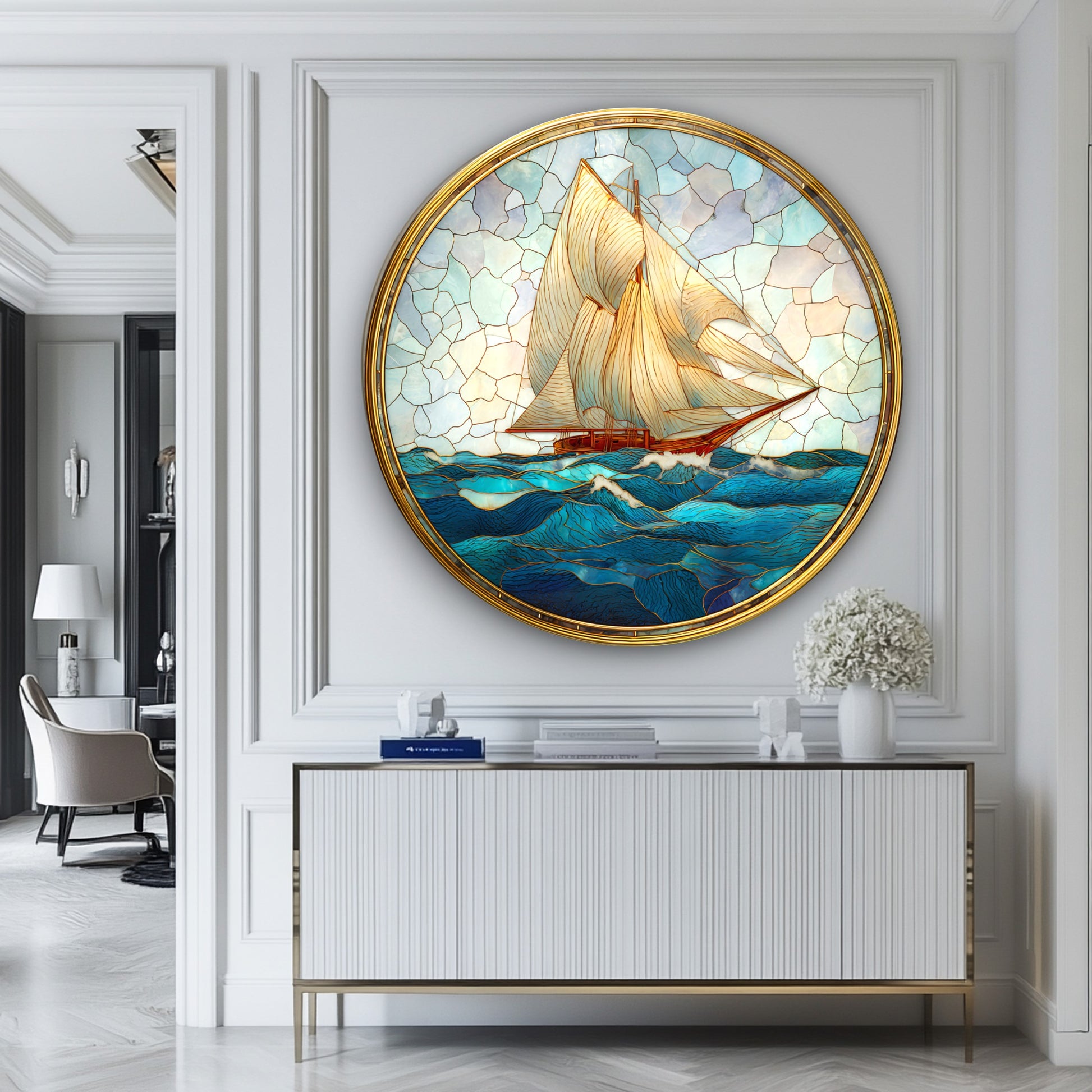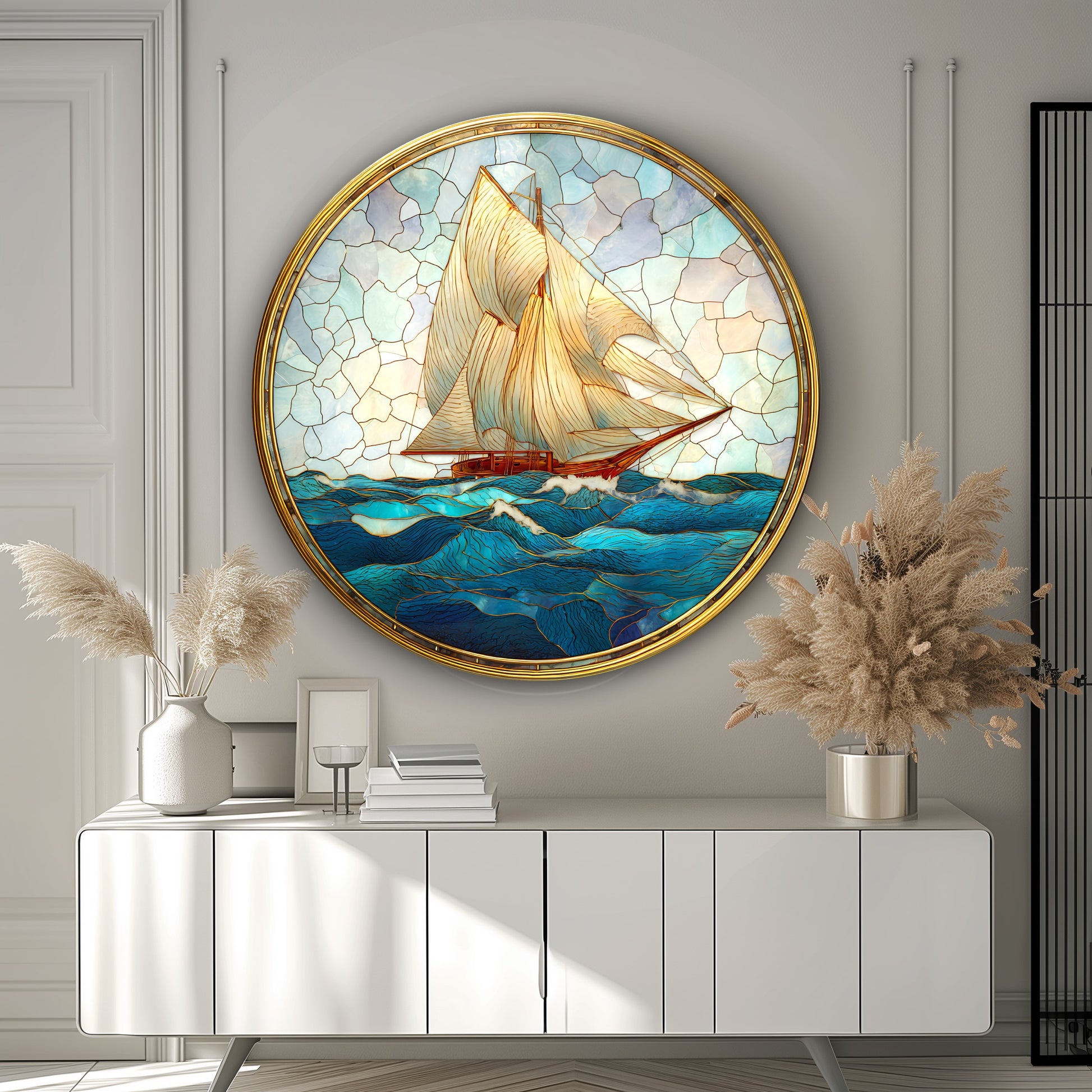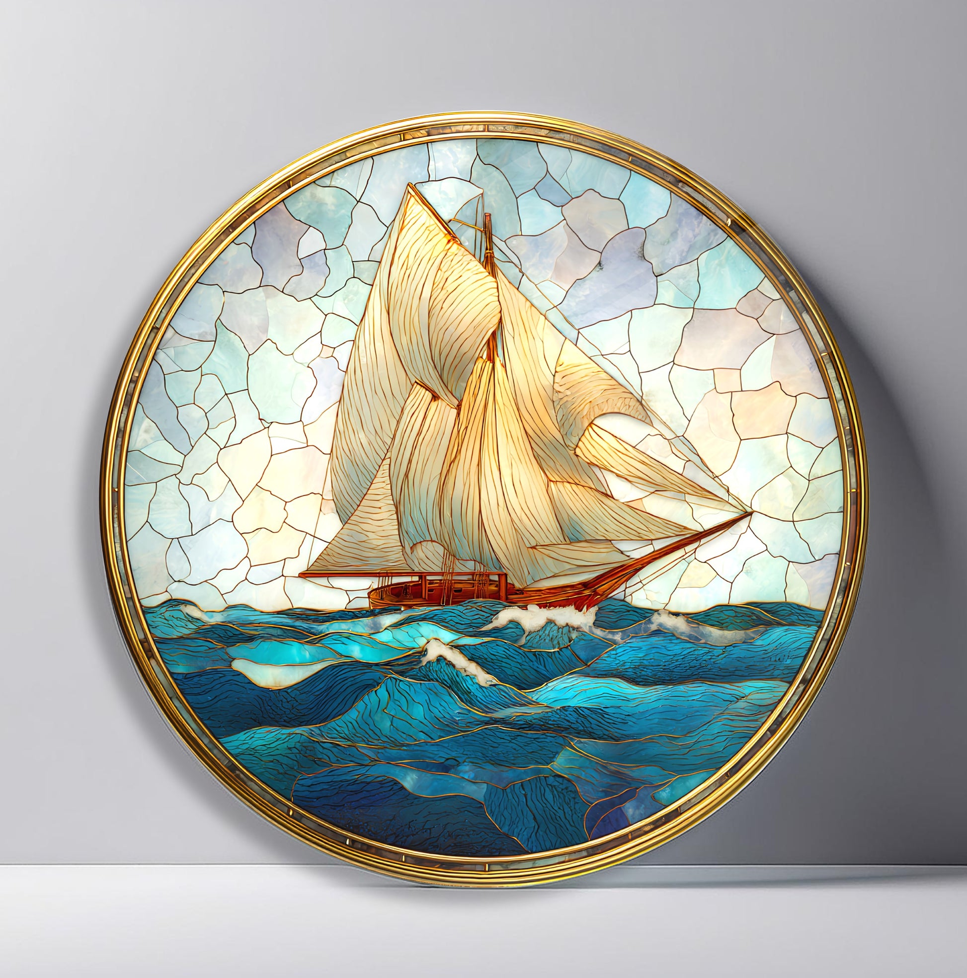 Vitray Desen Yelkenli Gemiler Yuvarlak Cam Tablo