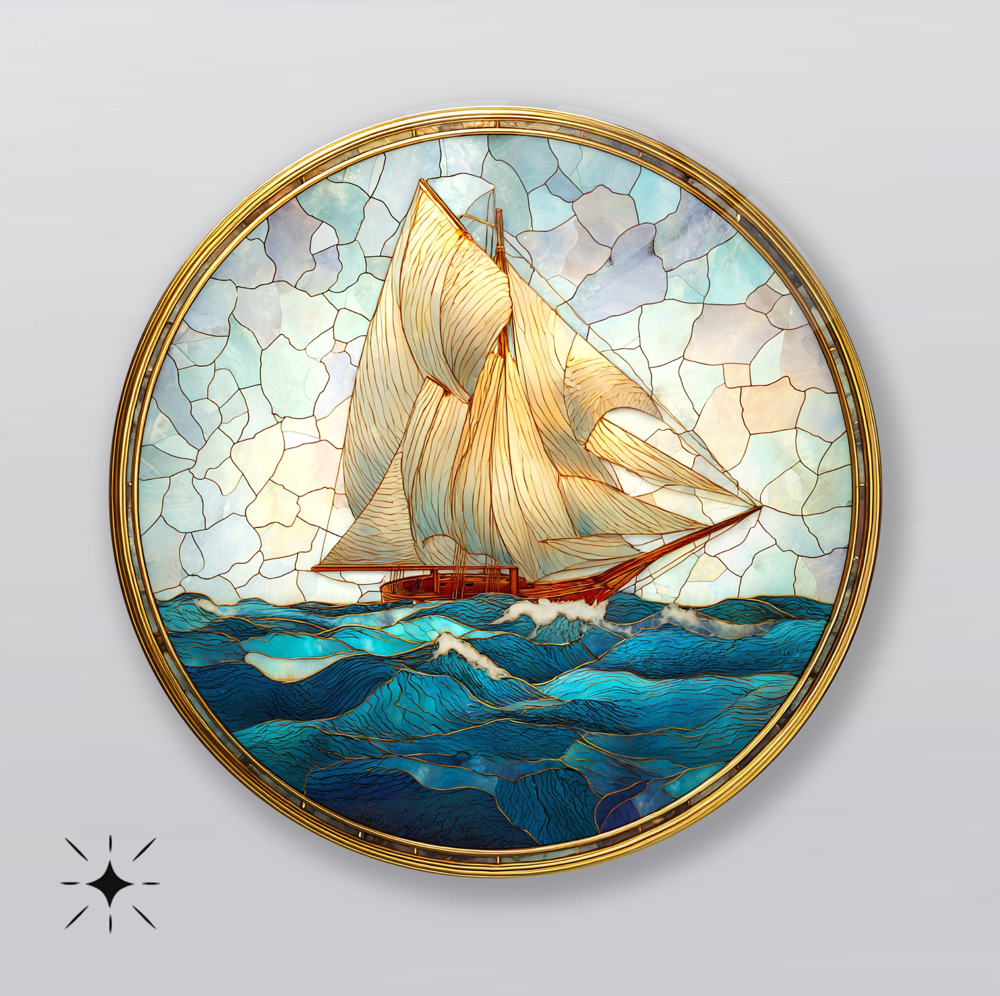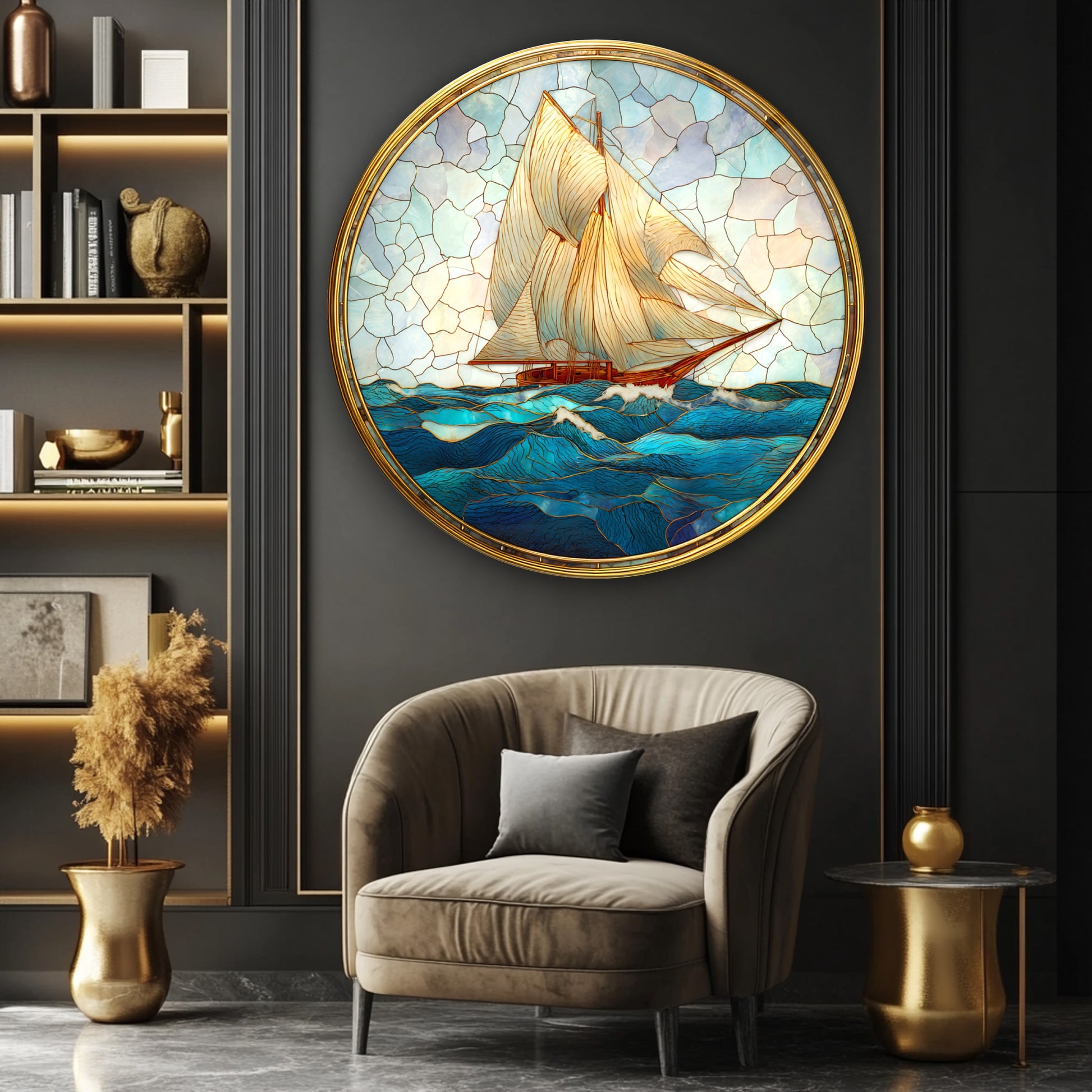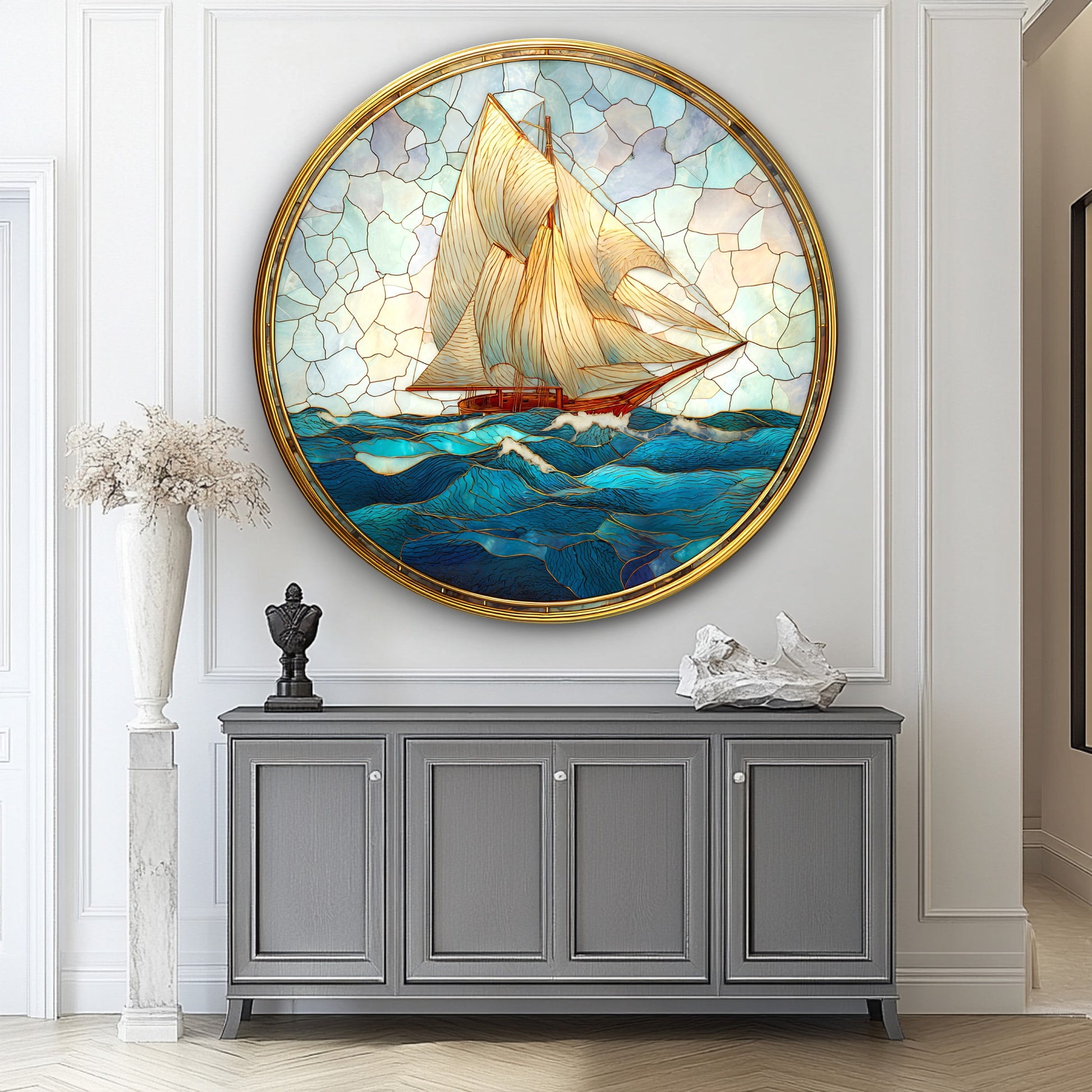 Vitray Desen Yelkenli Gemiler Yuvarlak Cam Tablo