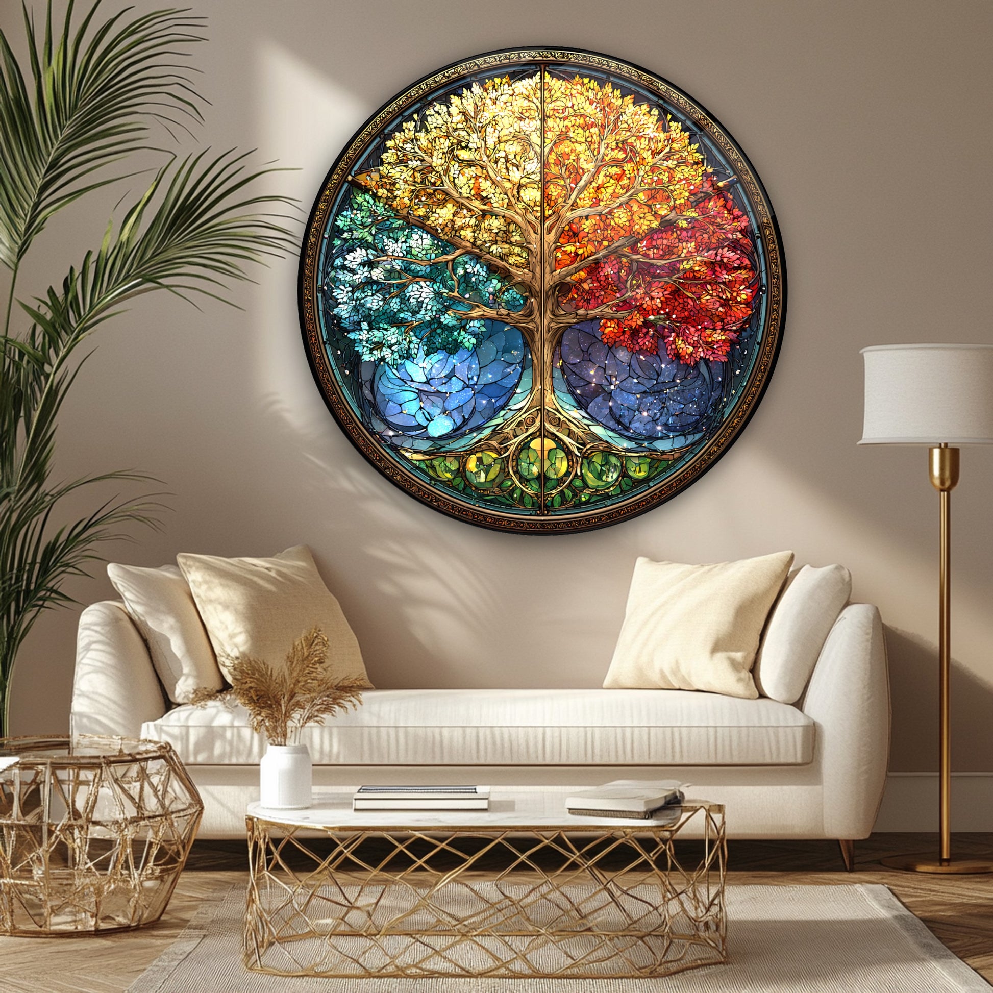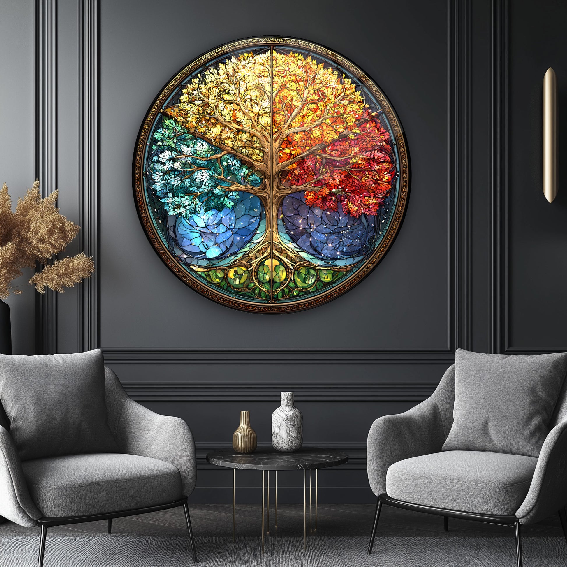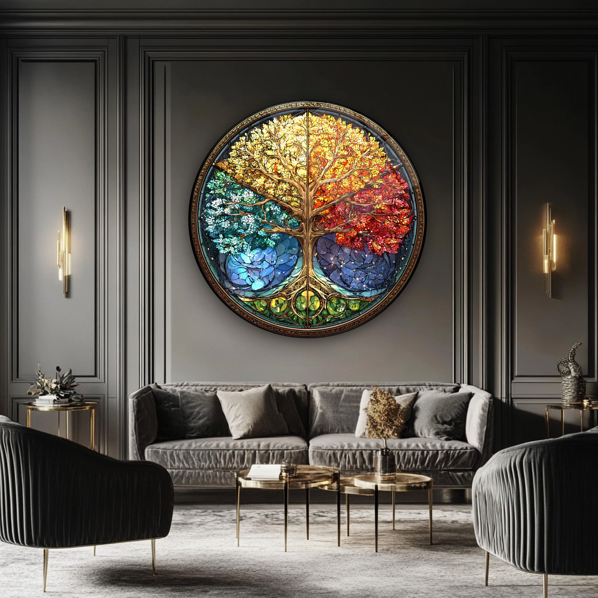 Dört Mevsim Hayat Ağacı Yuvarlak Cam Tablo
