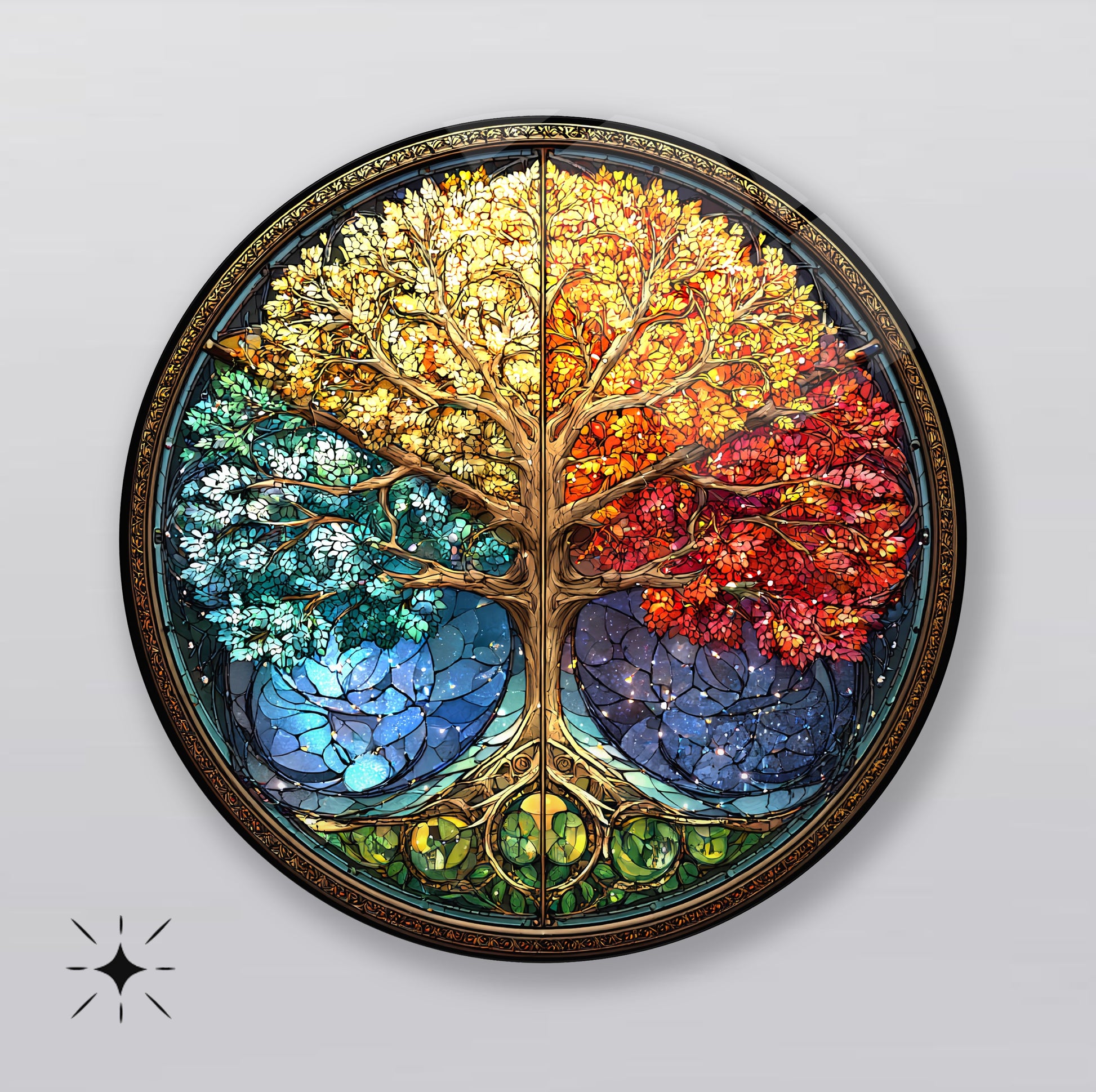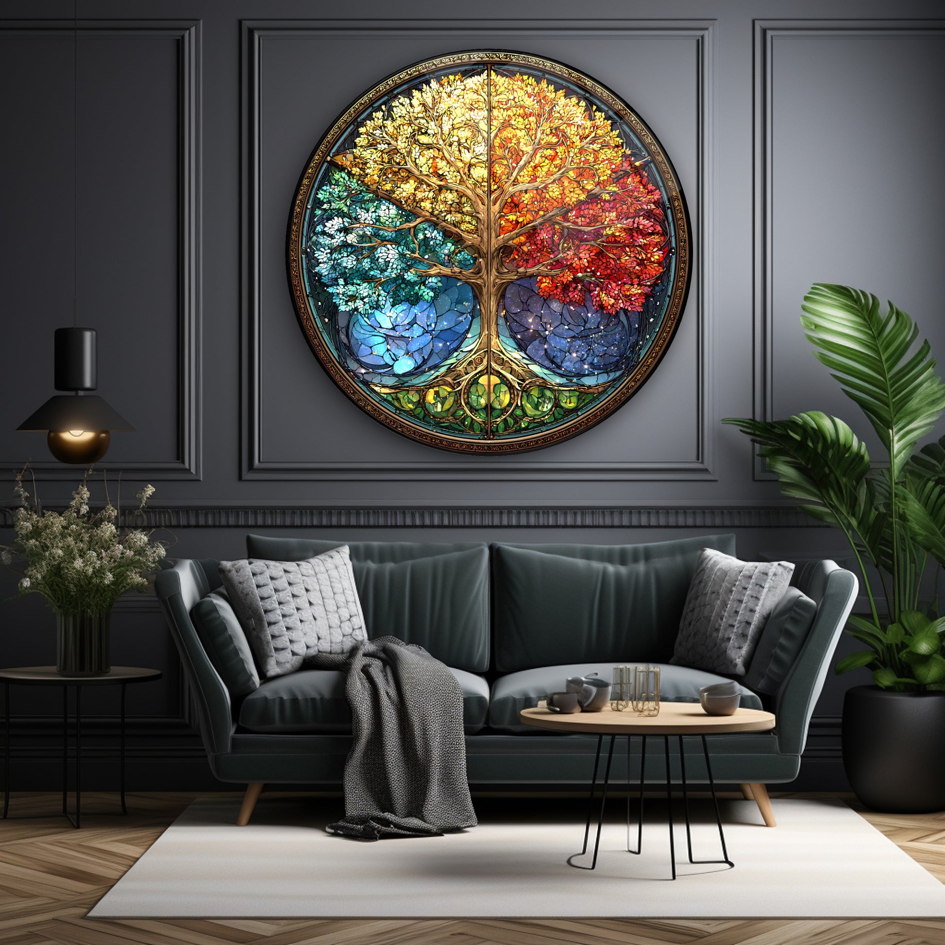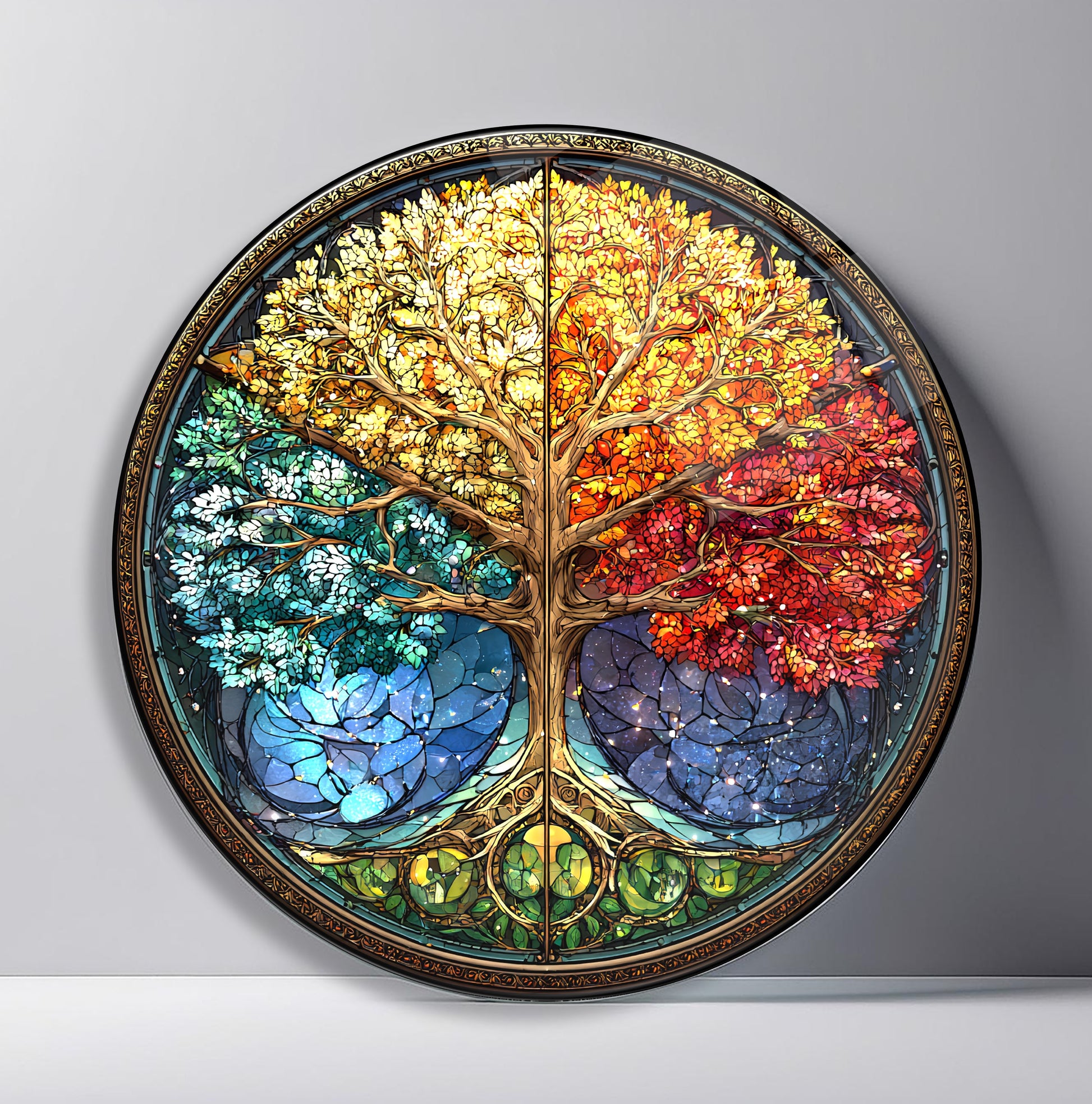 Dört Mevsim Hayat Ağacı Yuvarlak Cam Tablo