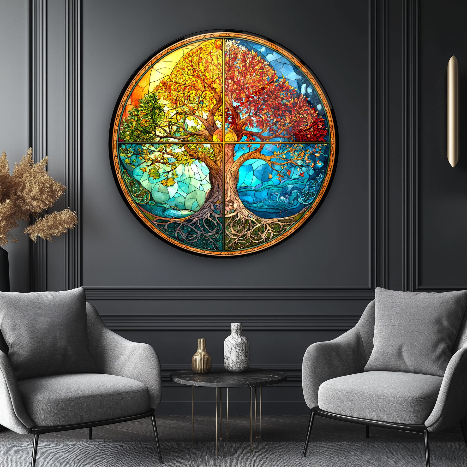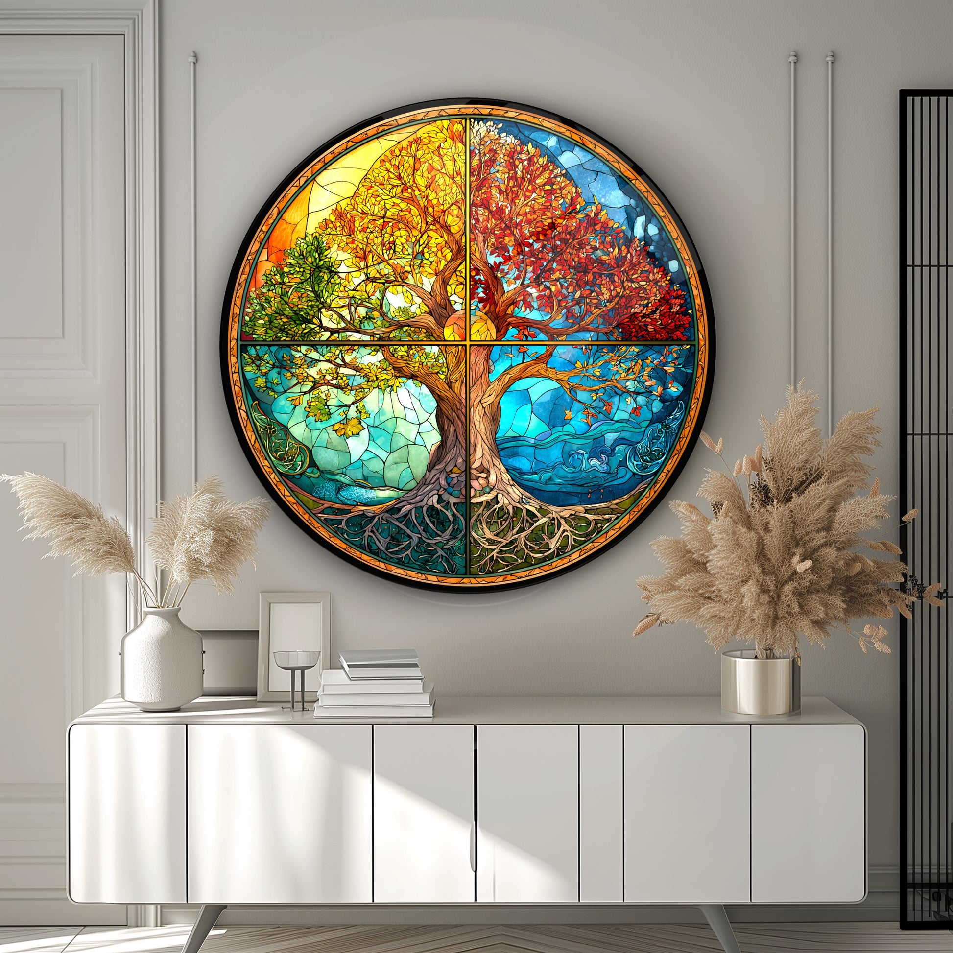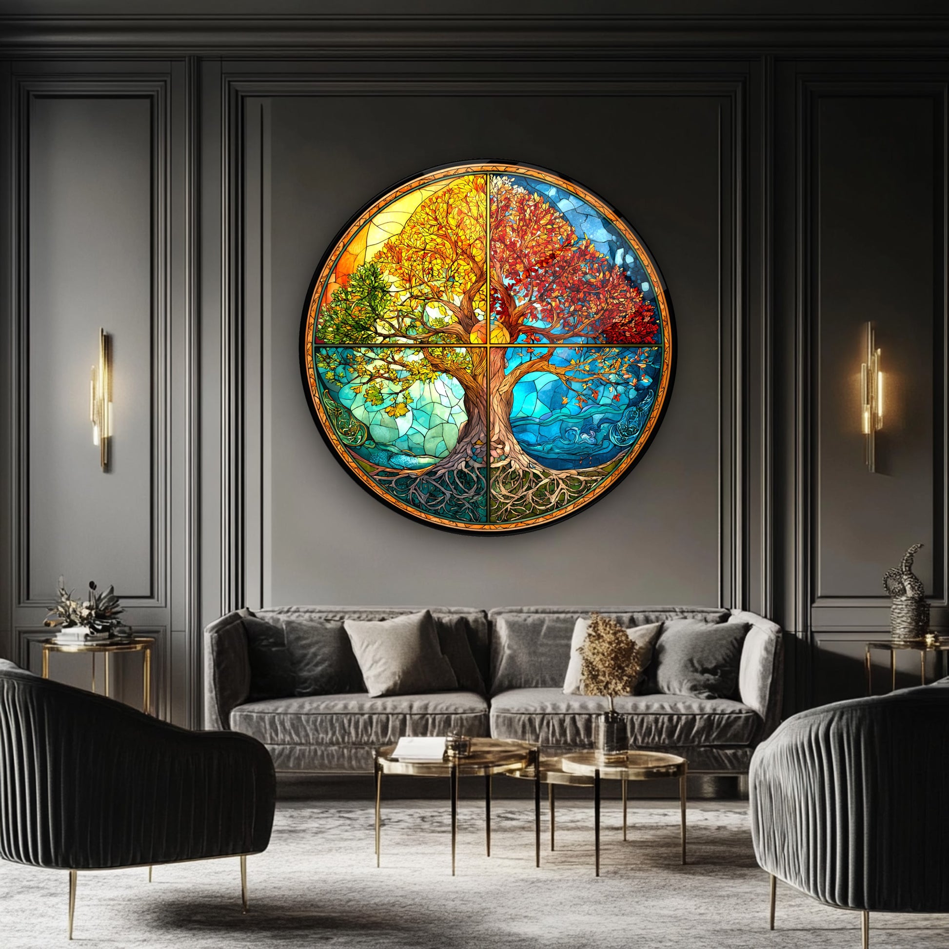 Dört Mevsim Hayat Ağacı Yuvarlak Cam Tablo