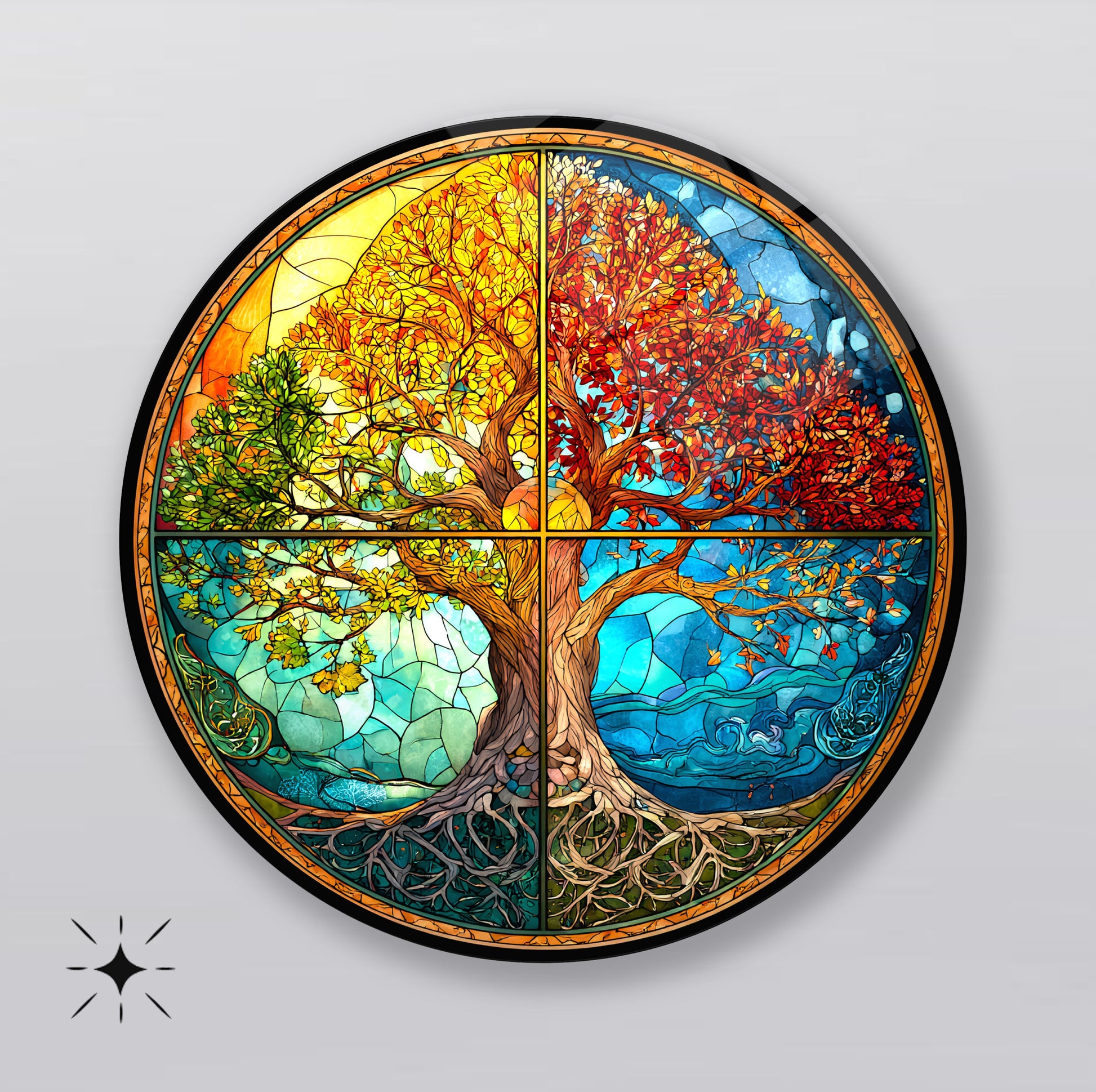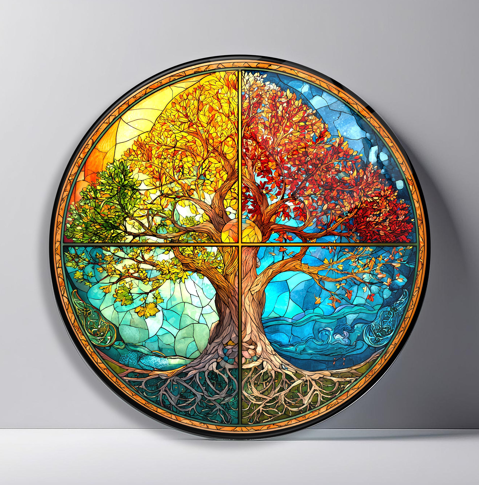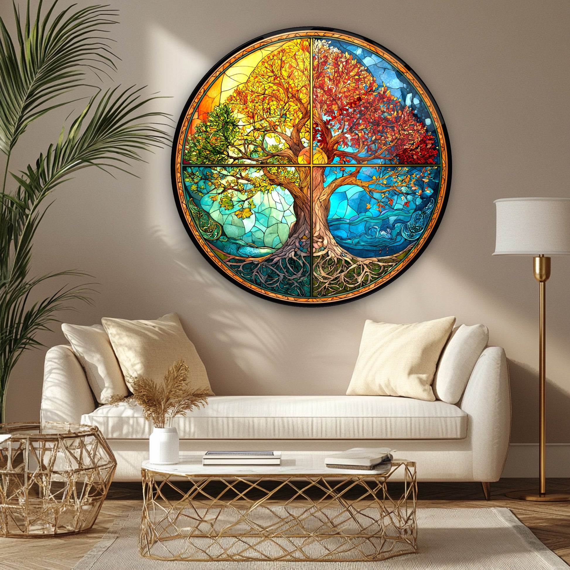 Dört Mevsim Hayat Ağacı Yuvarlak Cam Tablo