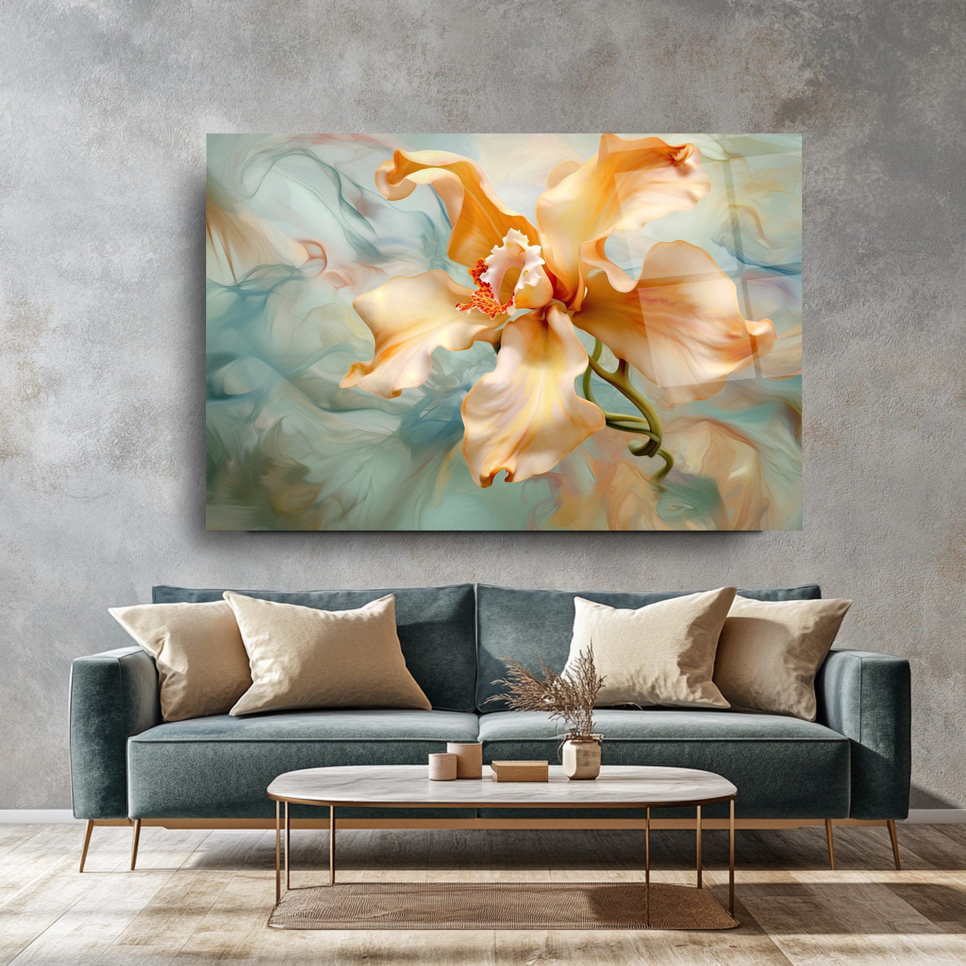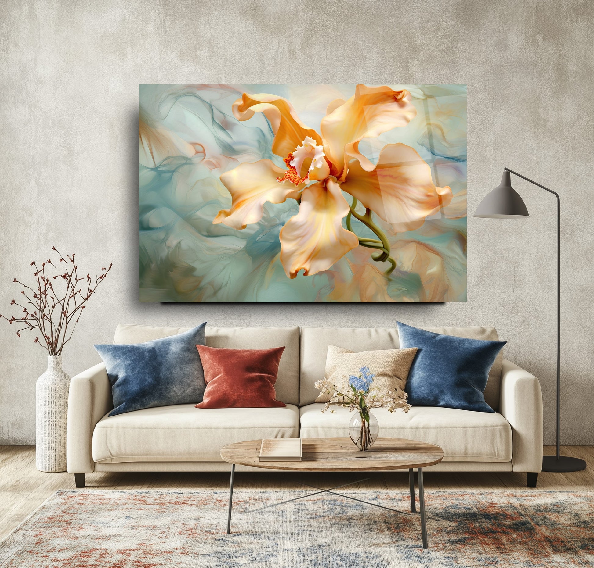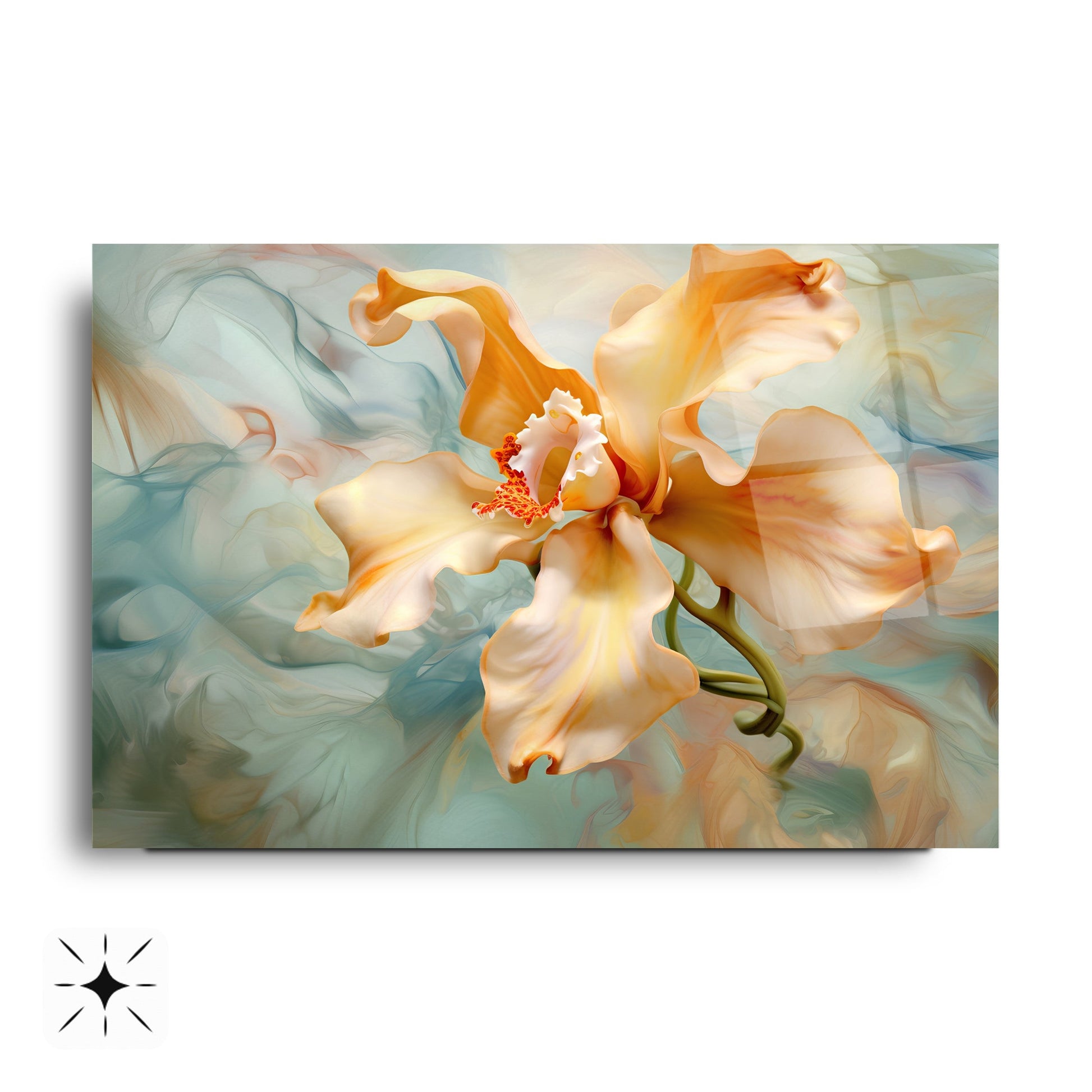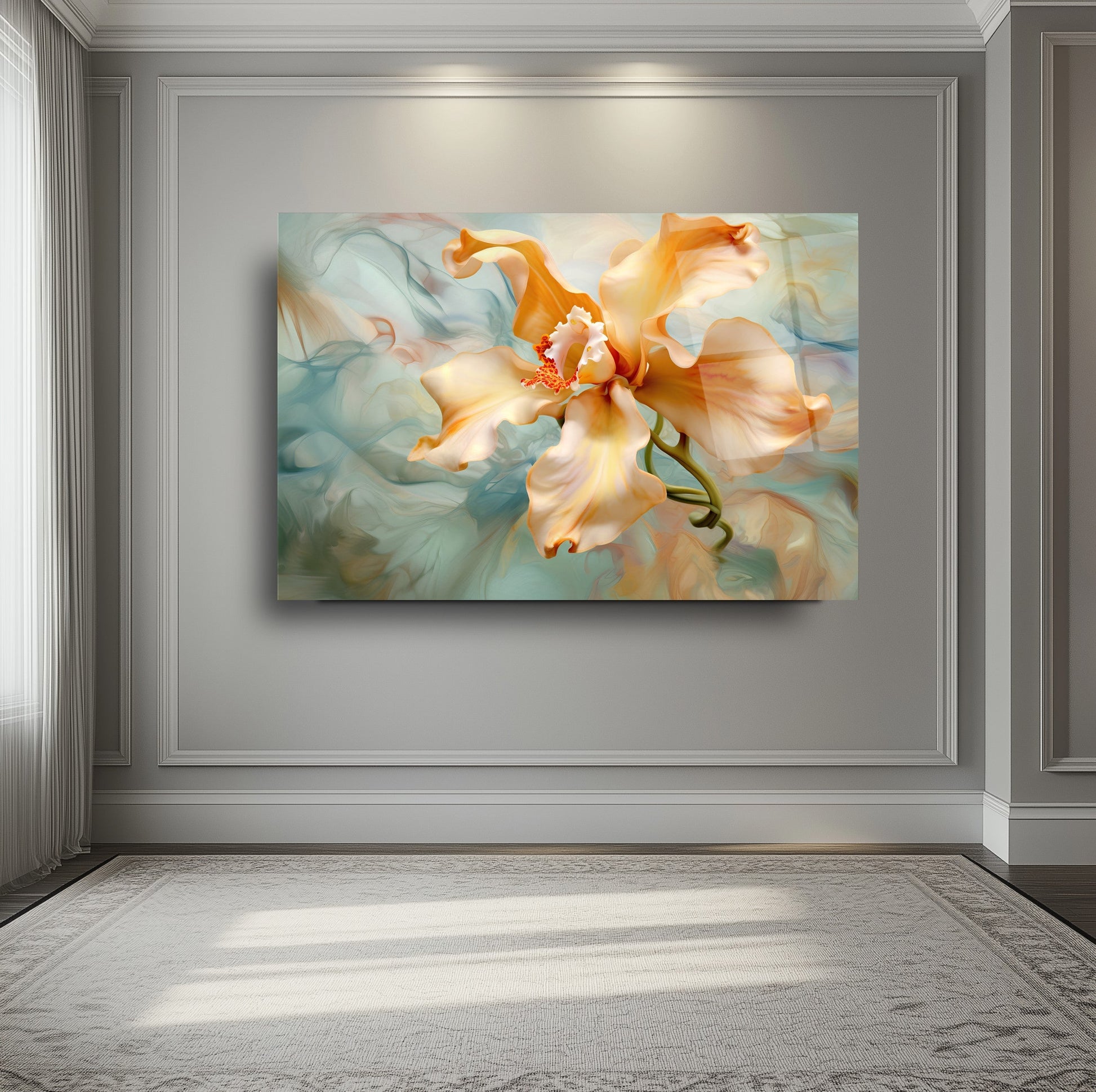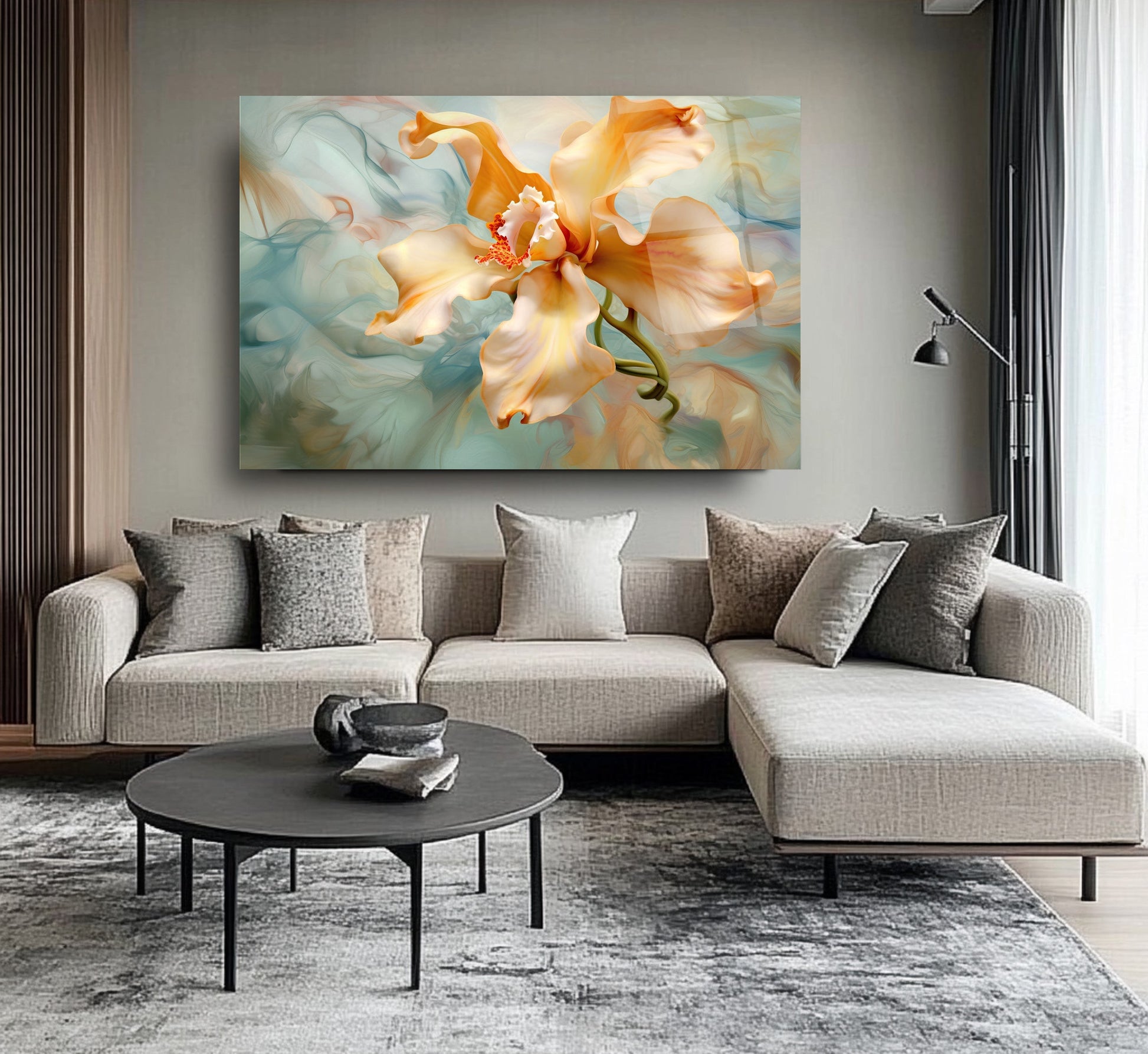 Modern turuncu detaylarla hareketlenen beyaz çiçek figürü, duman efektiyle birleşerek bu gerçek cam tabloya derinlik ve zarafet katar. Kırılmaz cam tablo yapısıyla dayanıklı ve estetik bir dekorasyon seçeneğidir. Canlı ve şık tasarım arayanlar için modern mekanlarda dikkat çeken bir cam tablo tercihidir.