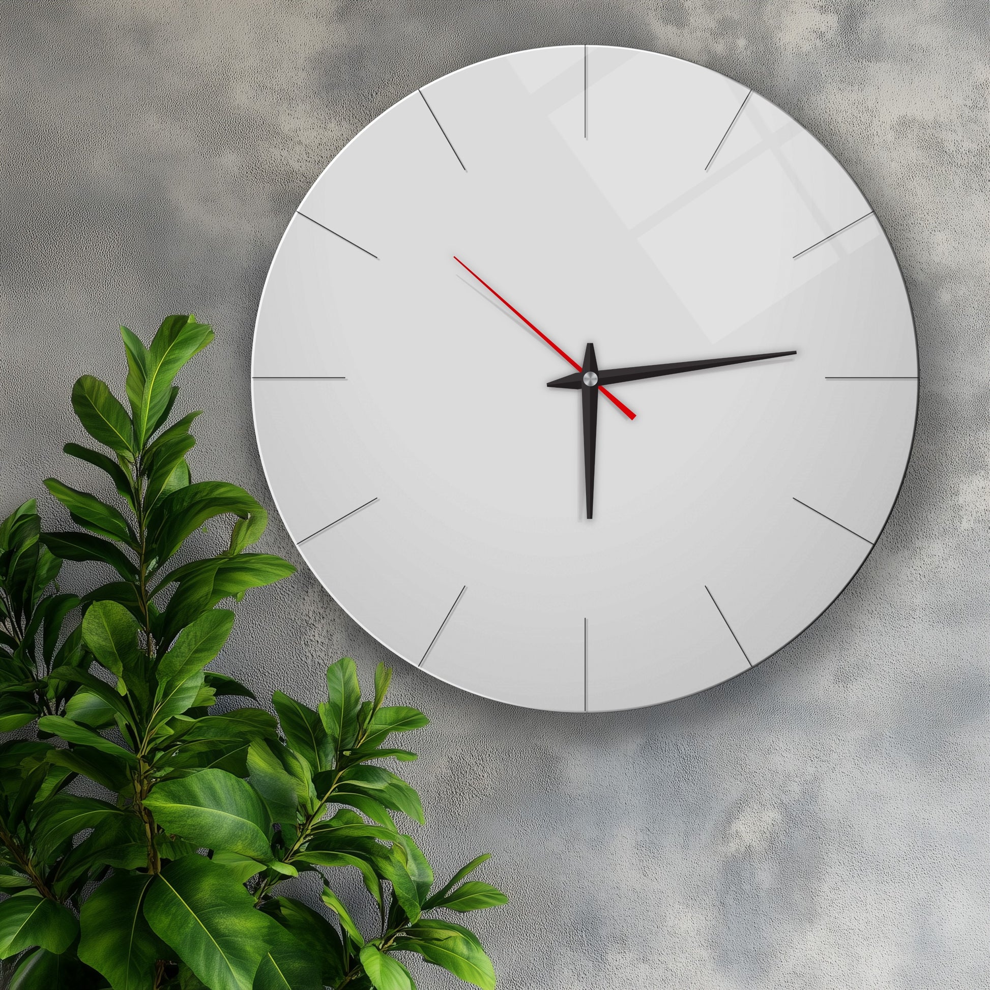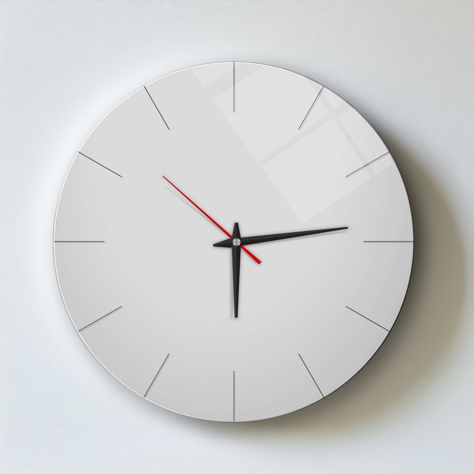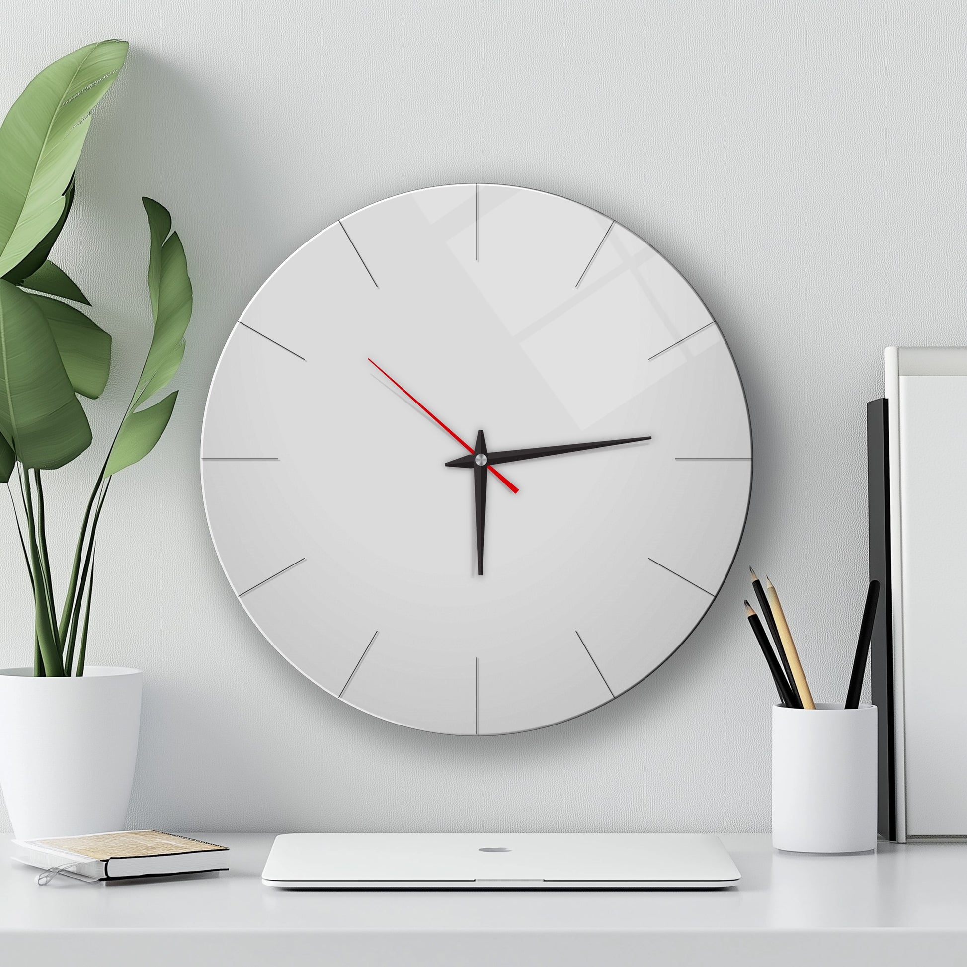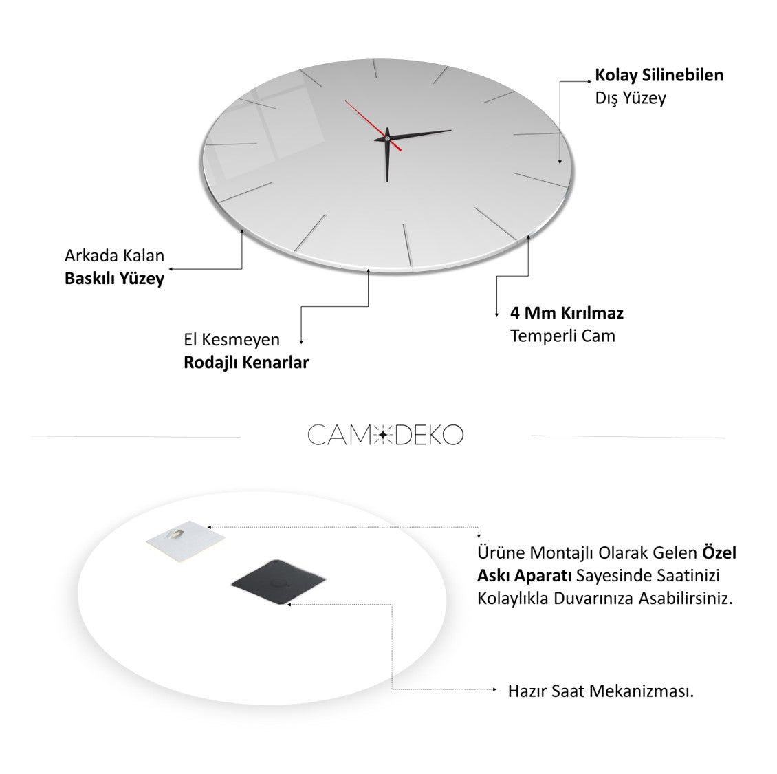 Saatlerimizde 4 mm kalınlığında ultra clear temperli cam kullanılır. Rodajlanmış (el kesmeyen) kenarları, hem güvenli hem de estetik bir görünüm sunar. Zamansız tasarımıyla ev ve ofis dekorasyonuna şıklık katar.