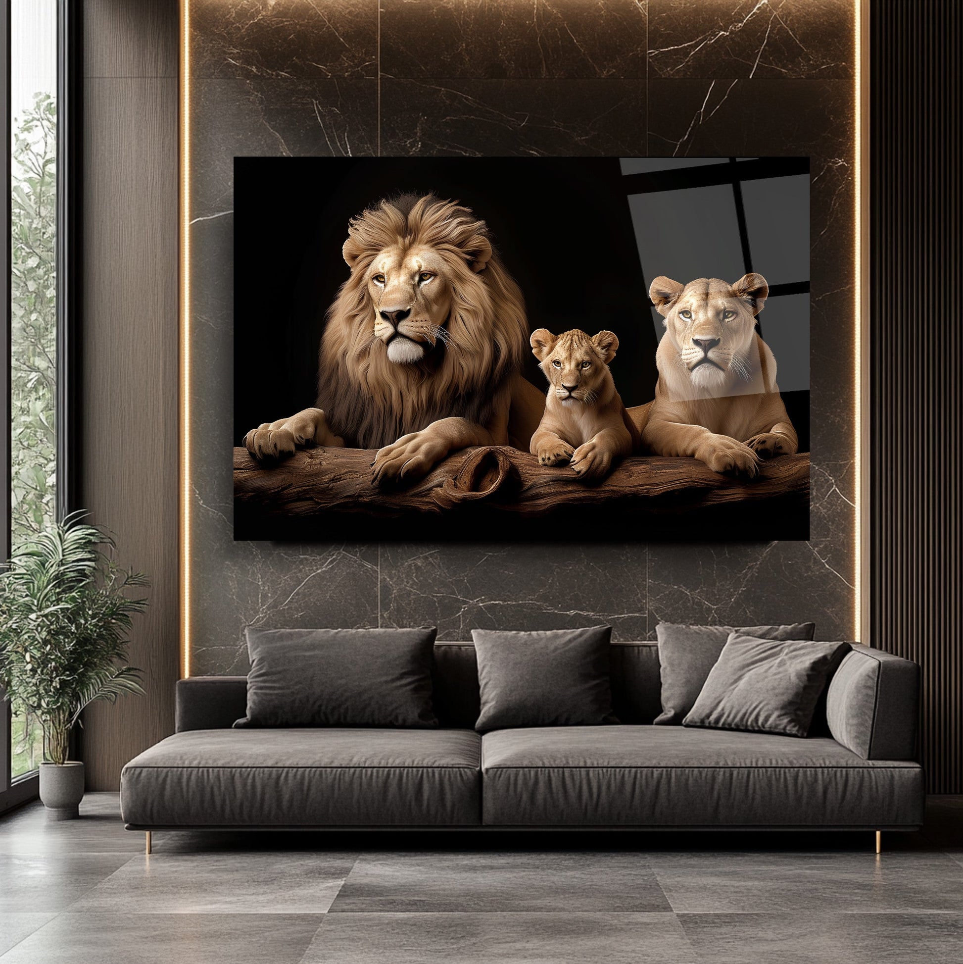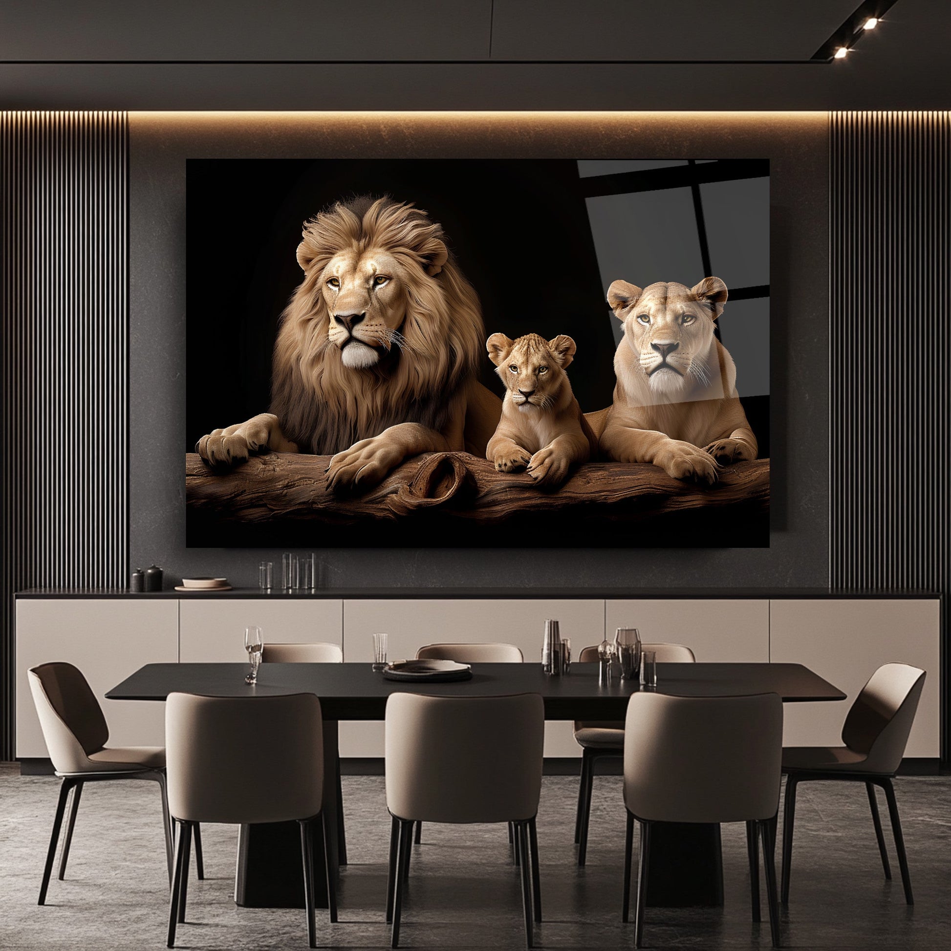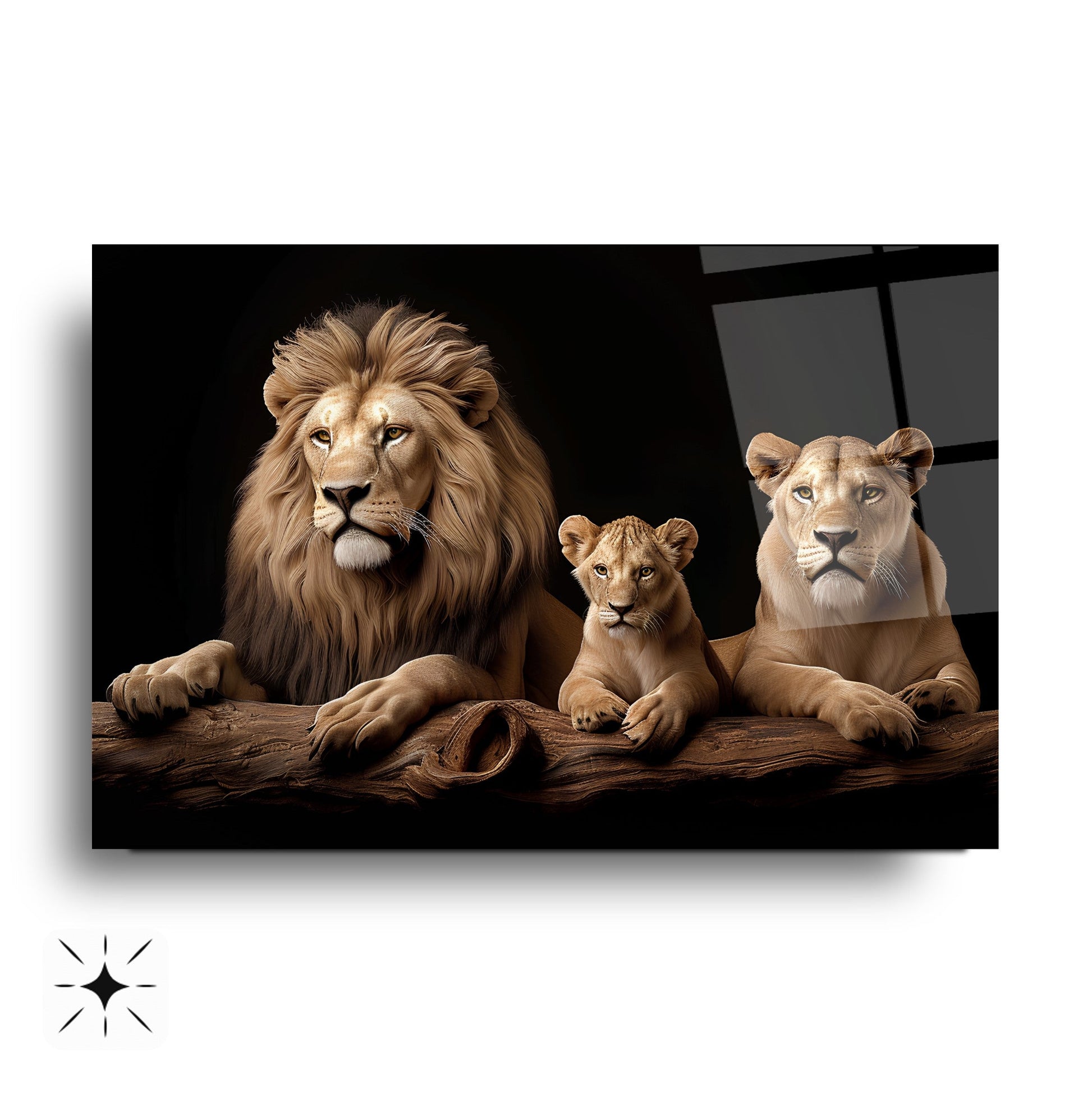 Aslan ailesinin güçlü ve koruyucu duruşunu siyah zemin üzerinde buluşturan bu modern cam tablo, hem görkem hem de aile birliğini sembolize eder. Sıcak bej-altın tonlarla öne çıkan aslan figürleri, mekanlara zarafet ve derinlik katar. 4 mm temperli cam yüzey üzerindeki UV baskı; canlı, solmayan renkler ve parlak detaylar sunar. Çerçevesiz minimalist tasarımı sayesinde salon, yatak odası veya ofis gibi mekanlarda çarpıcı ve estetik bir odak noktası yaratır. Vahşi doğa ve aslan temalı dekor arayanlar için mükemmel bir seçimdir.