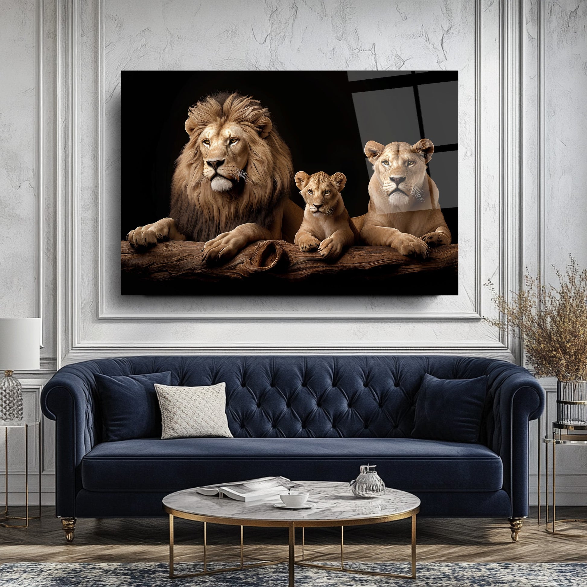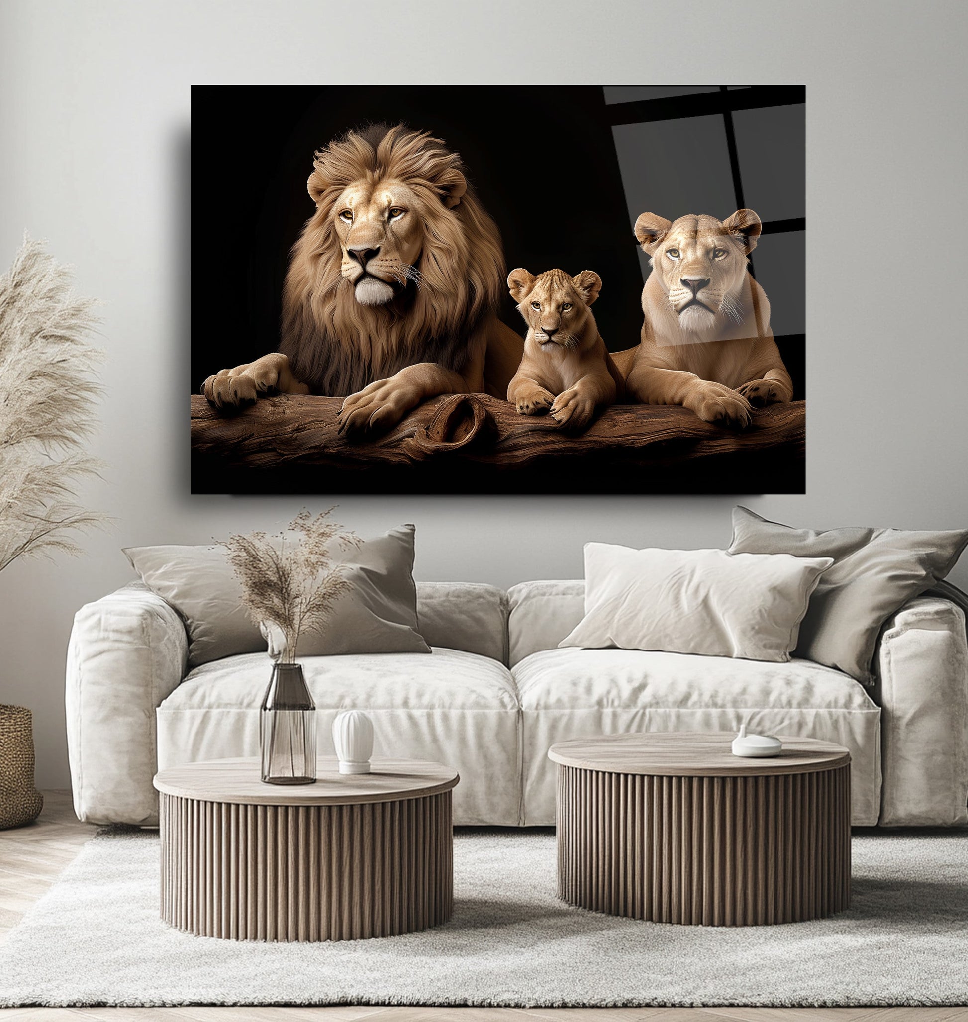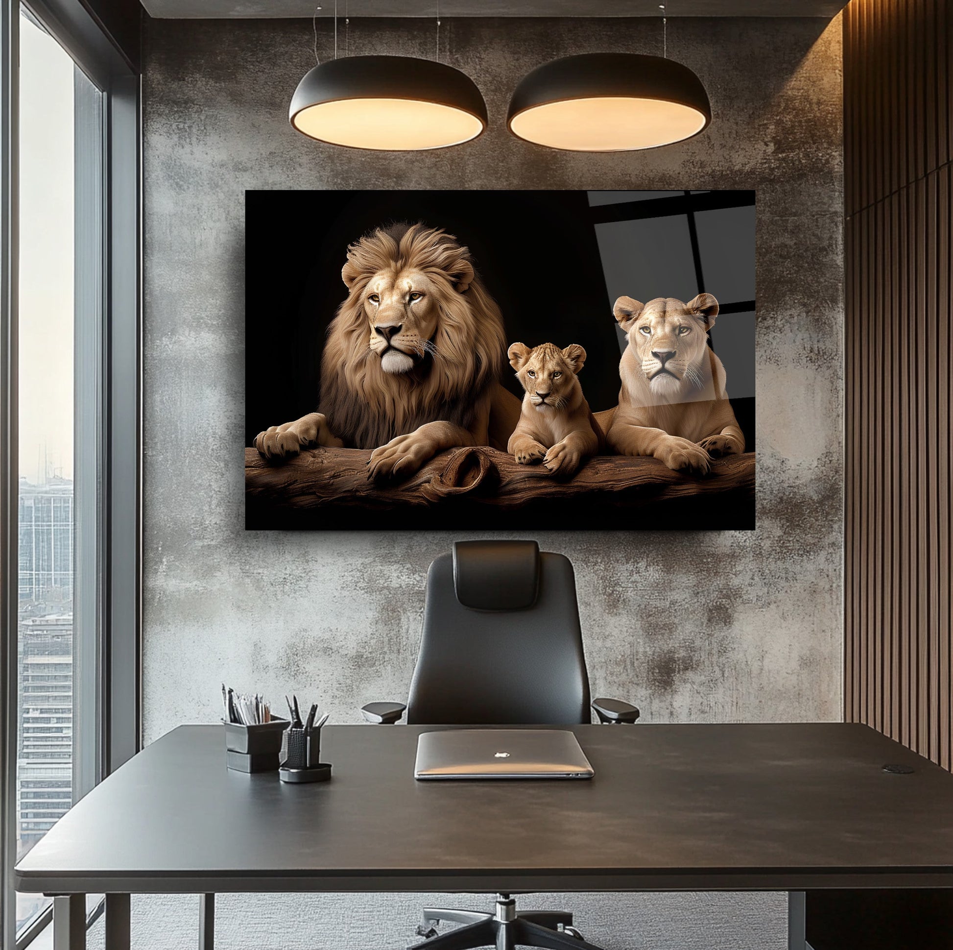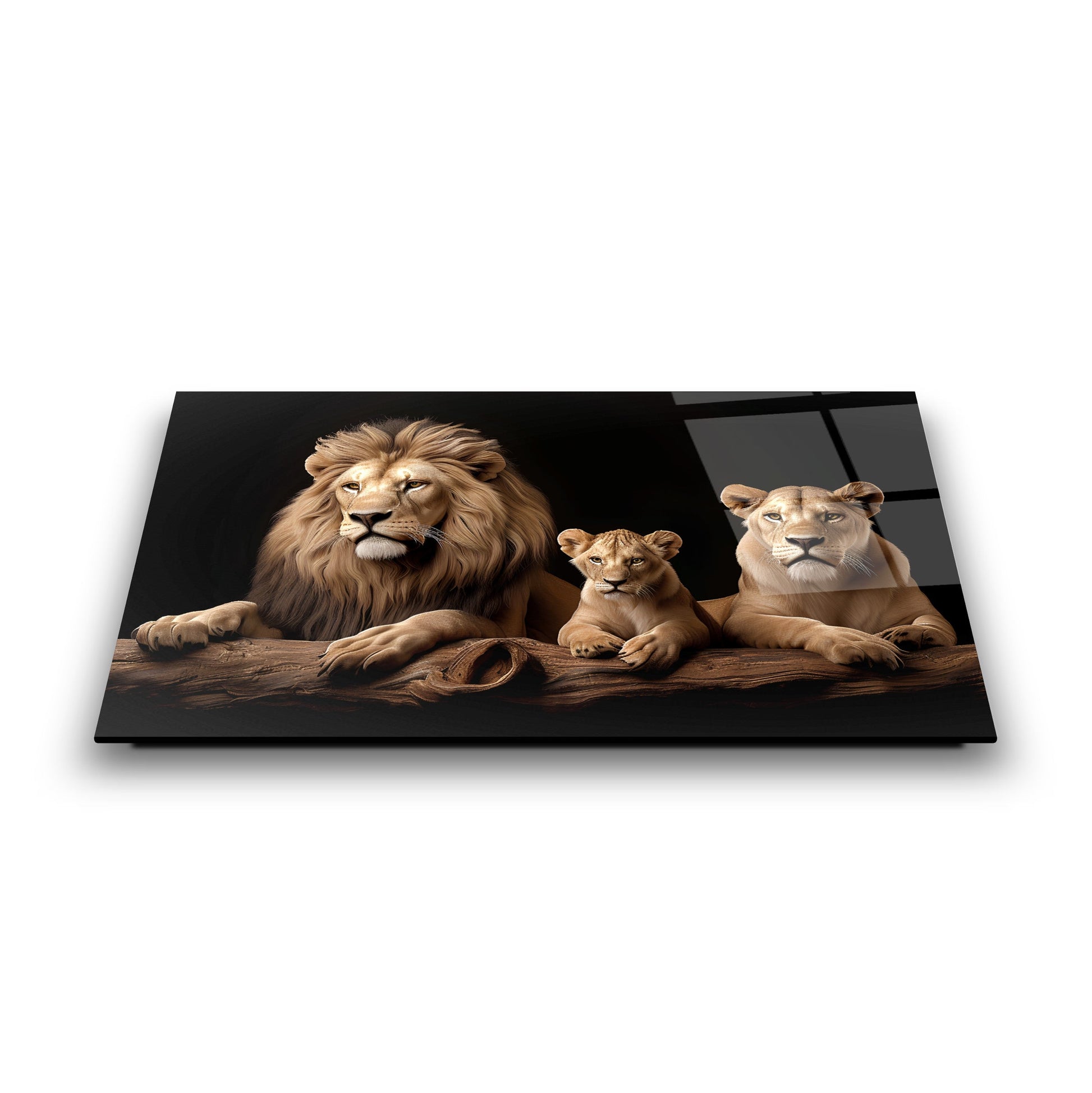 Aslan ailesinin güçlü ve koruyucu duruşunu siyah zemin üzerinde buluşturan bu modern cam tablo, hem görkem hem de aile birliğini sembolize eder. Sıcak bej-altın tonlarla öne çıkan aslan figürleri, mekanlara zarafet ve derinlik katar. 4 mm temperli cam yüzey üzerindeki UV baskı; canlı, solmayan renkler ve parlak detaylar sunar. Çerçevesiz minimalist tasarımı sayesinde salon, yatak odası veya ofis gibi mekanlarda çarpıcı ve estetik bir odak noktası yaratır. Vahşi doğa ve aslan temalı dekor arayanlar için mükemmel bir seçimdir.