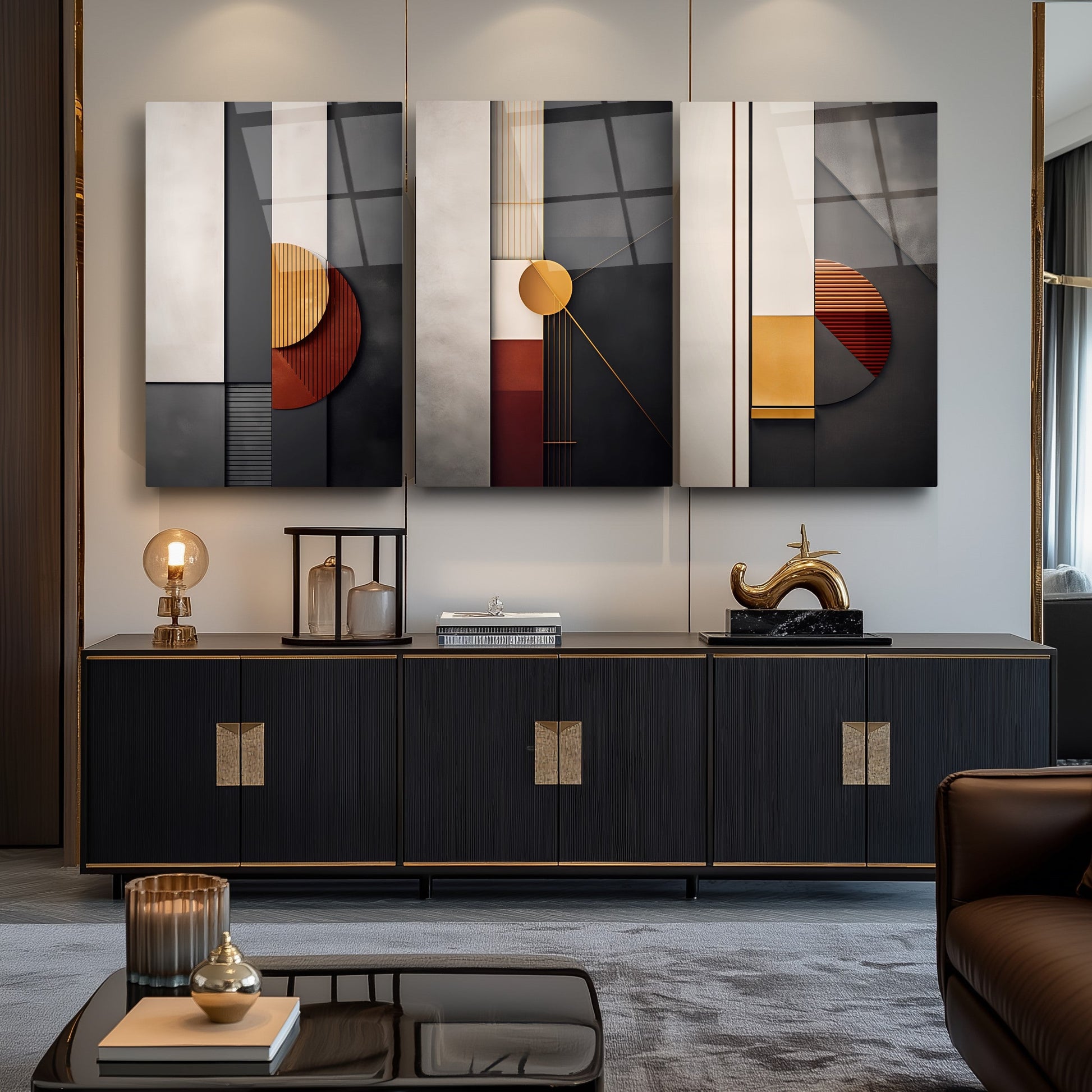 Siyah, turuncu, kahve ve bej tonlarının dengeli uyumuyla oluşan geometrik desenler, bu büyük boy kırılmaz cam tablo setine modern bir mimari hava kazandırır. Soyut çizgiler ve minimalist dokunuşlar sayesinde salon dekorasyonu için güçlü ve şık bir etki sunar. Temperli cam yüzeyi ile dayanıklılığı artırılmıştır. Mimari ve soyut estetiği sevenler için ideal bir üçlü set dekoratif seçenektir.