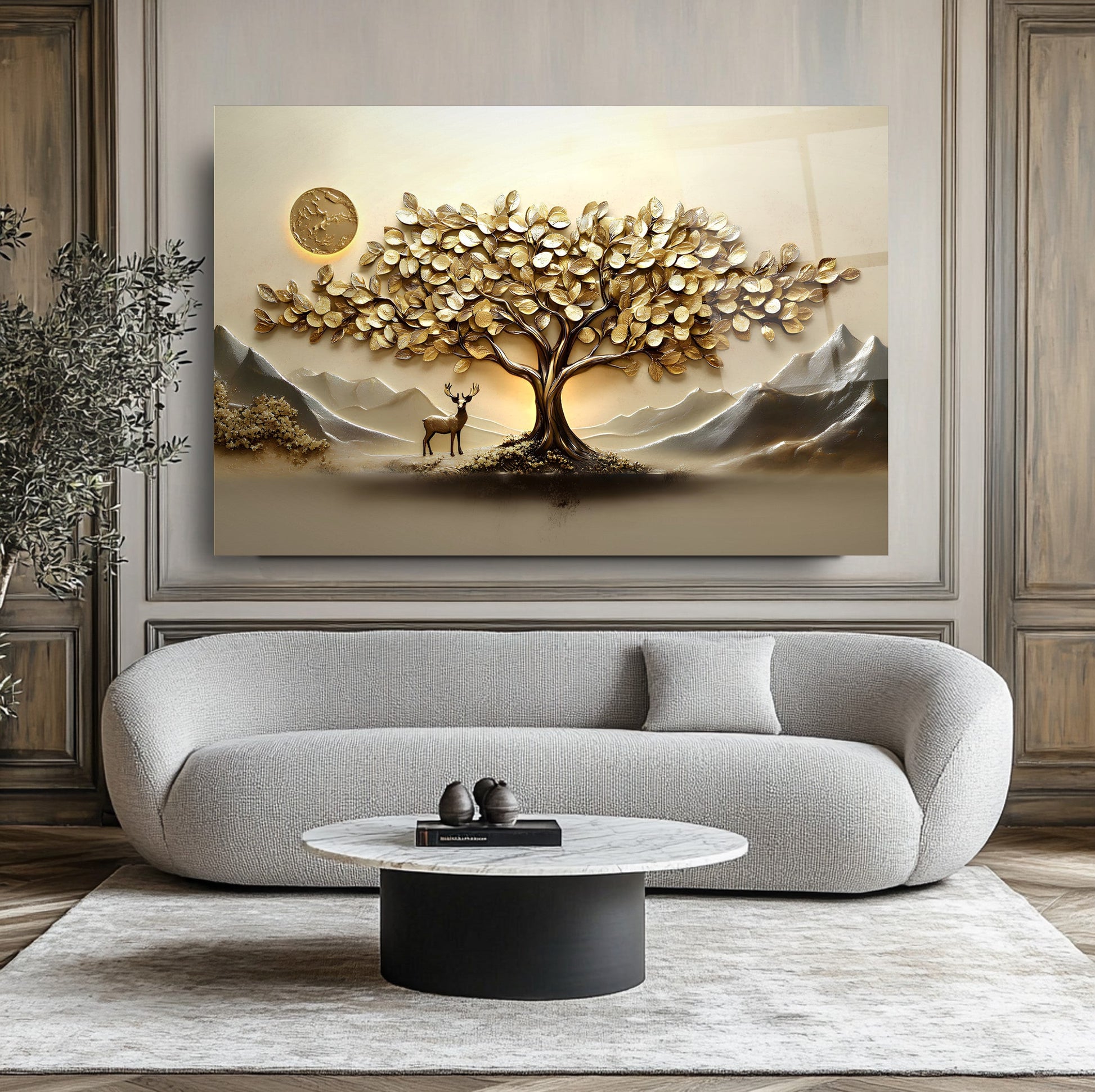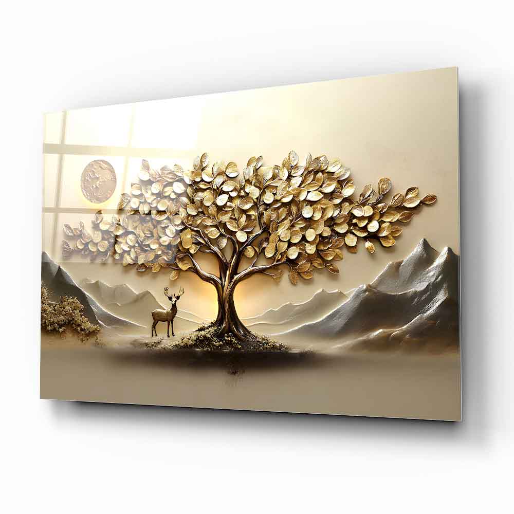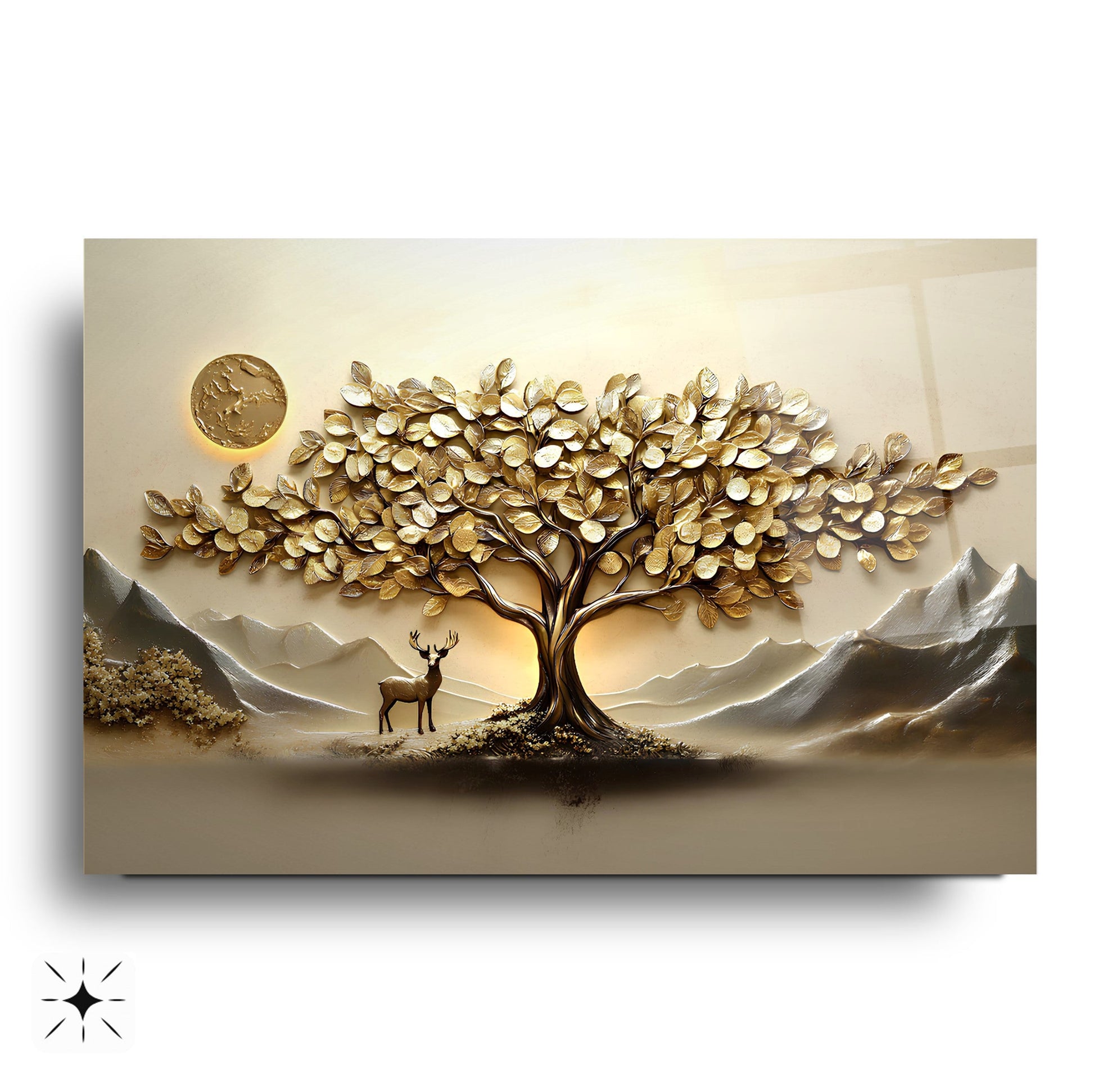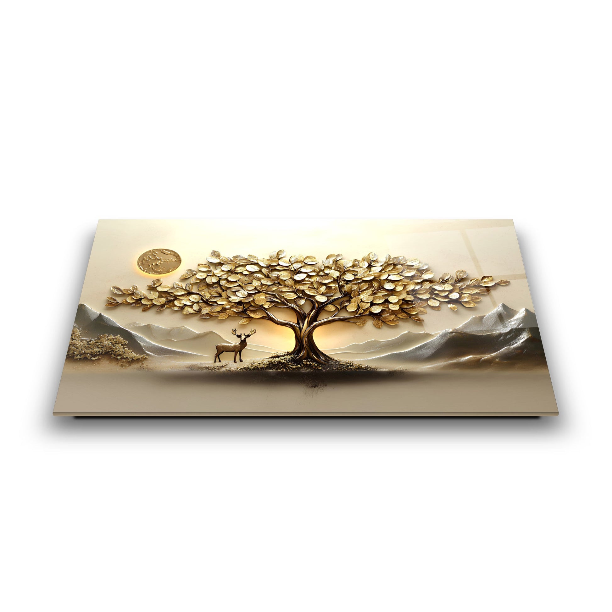 Mekanlarınıza Altın Işıltılı Doğa Zarafeti: Geyikli Gold Hayat Ağacı Cam Tablo