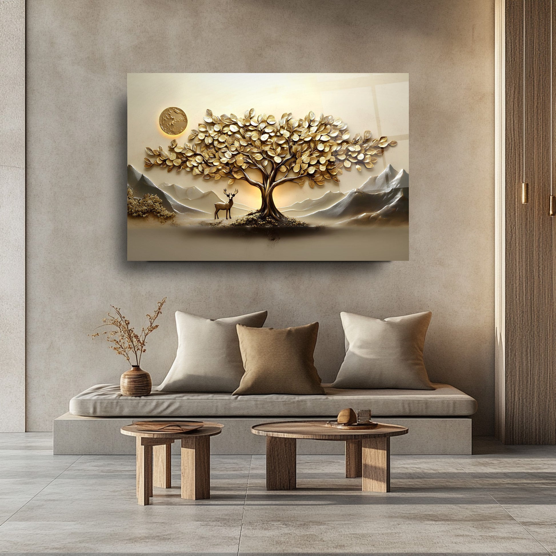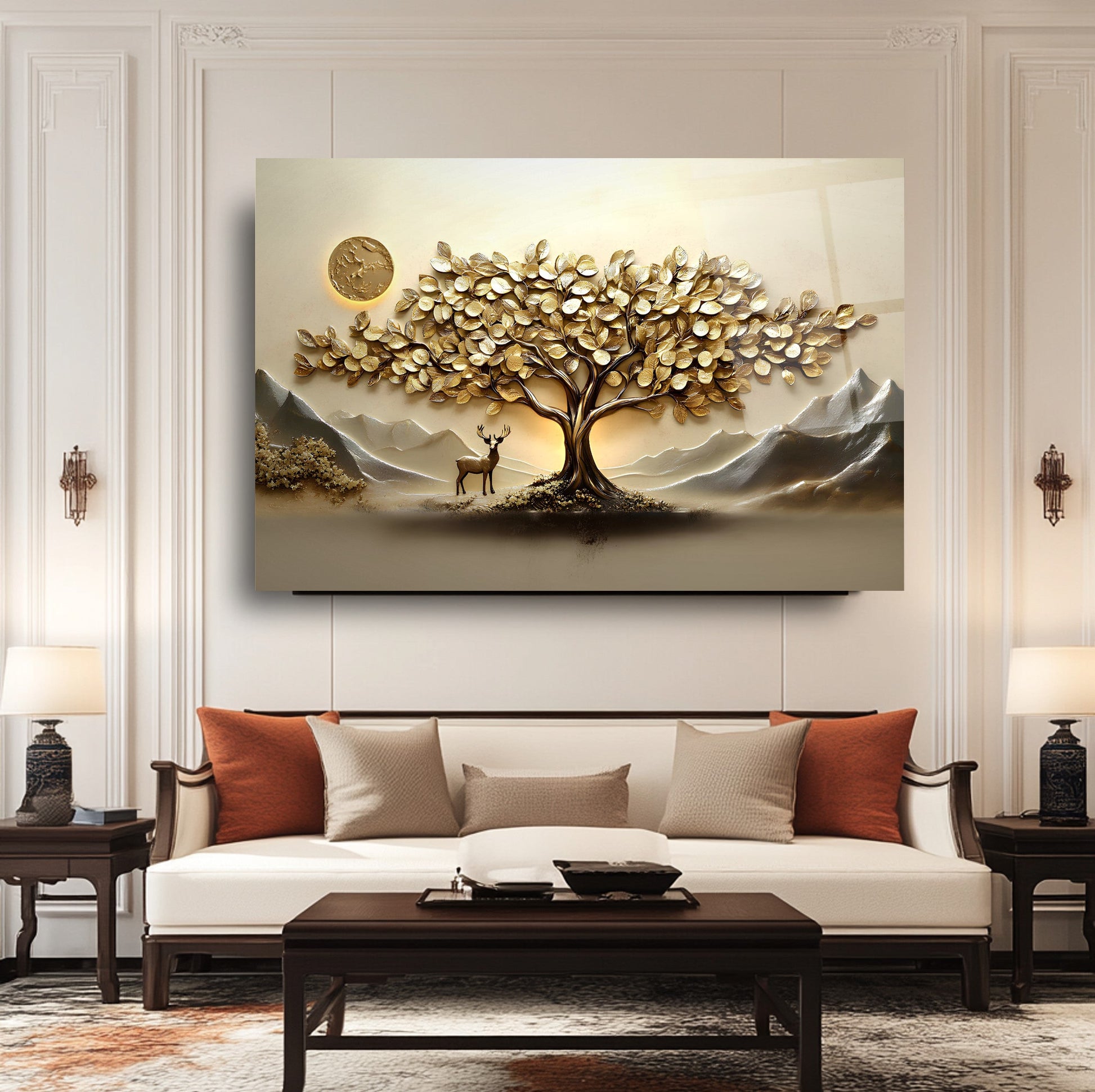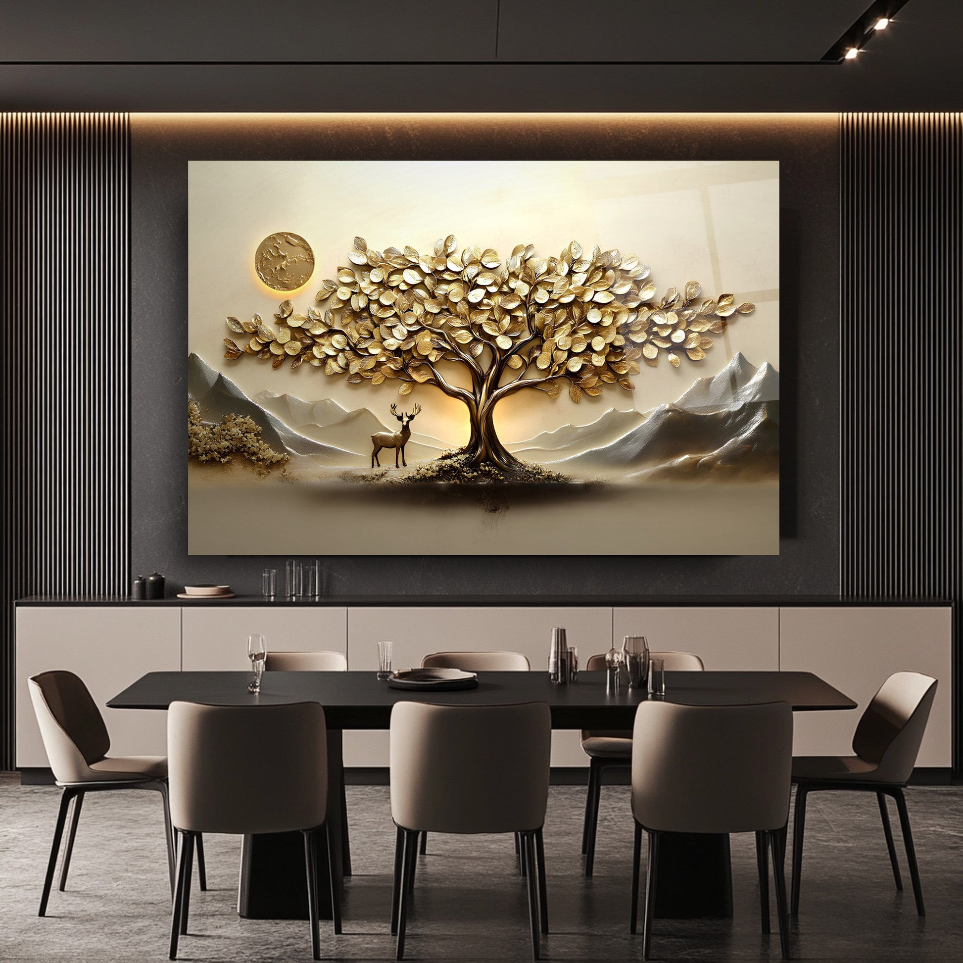 Mekanlarınıza Altın Işıltılı Doğa Zarafeti: Geyikli Gold Hayat Ağacı Cam Tablo
