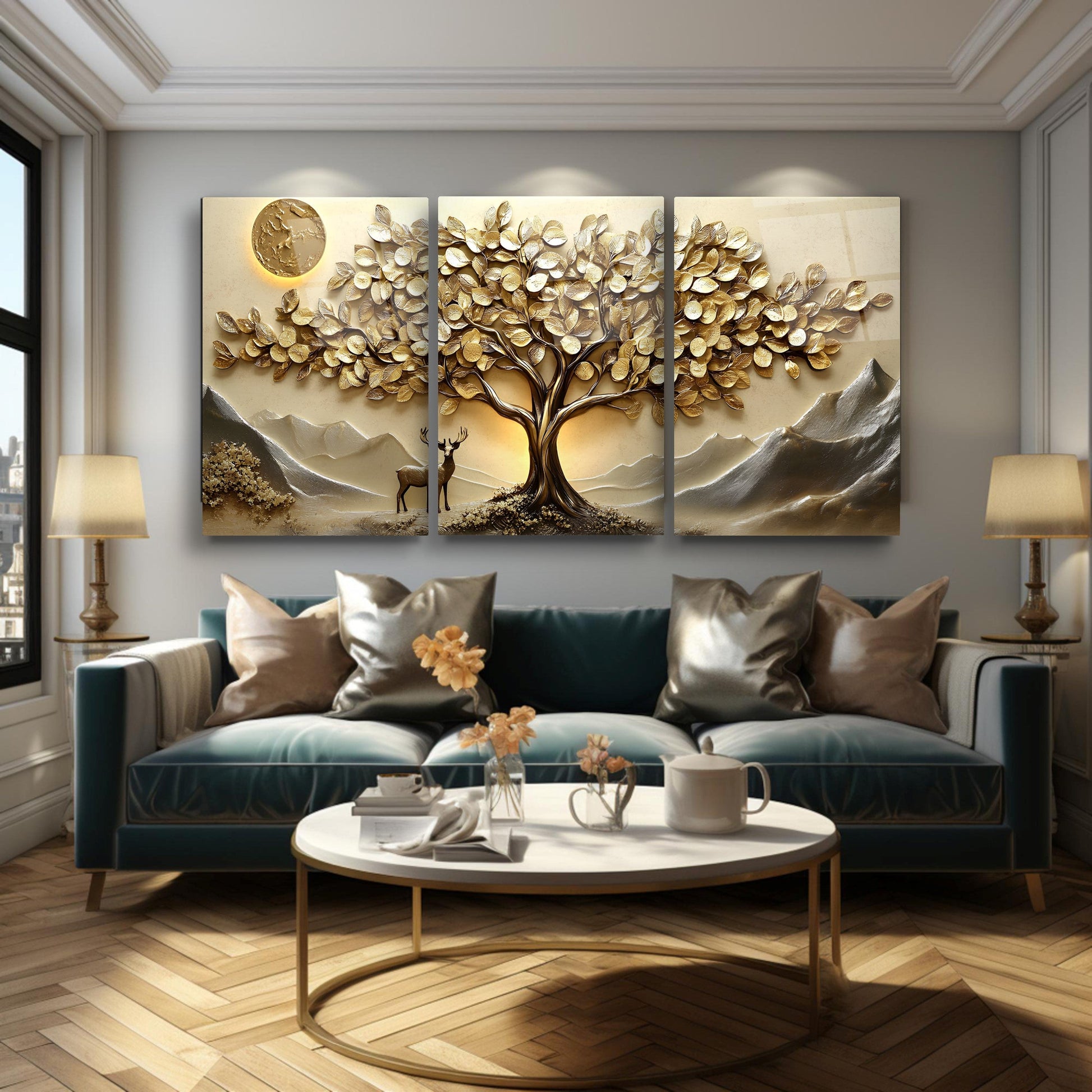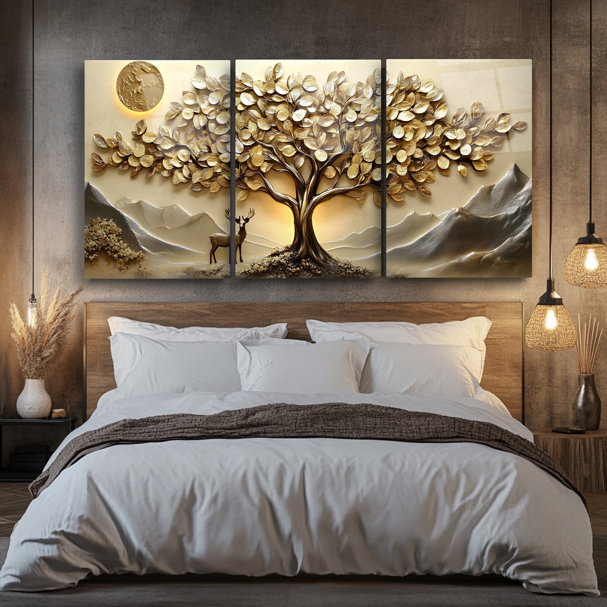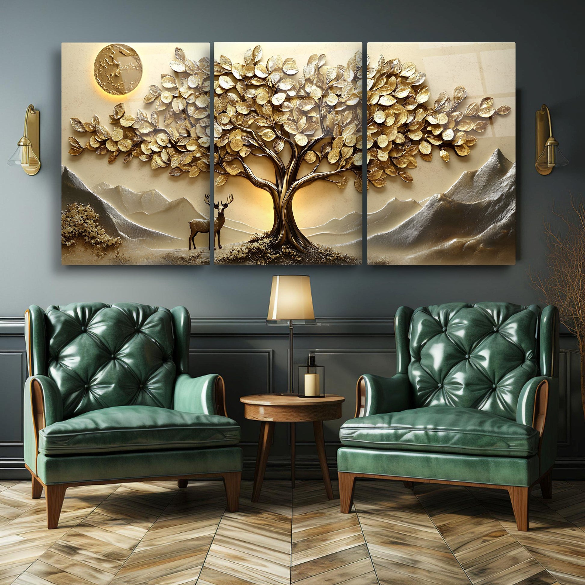 Doğanın zarif dokunuşlarını evinize taşıyan bu üçlü cam tablo seti, kabartmalı geyik ve yapraklı hayat ağacı tasarımıyla fark yaratıyor. Modern ve sanatsal çizgilerle işlenen tablolar, kırılmaz cam ve UV baskı teknolojisiyle uzun ömürlü kullanım sağlar. Oturma odası, salon veya ofis gibi alanlarda doğanın huzurunu ve estetiğini yansıtmak için ideal. Hem dekorasyonunuza şıklık katar hem de mekanınıza sıcaklık getirir. Kaliteli cam baskı sayesinde canlı renkler uzun süre korunur.
