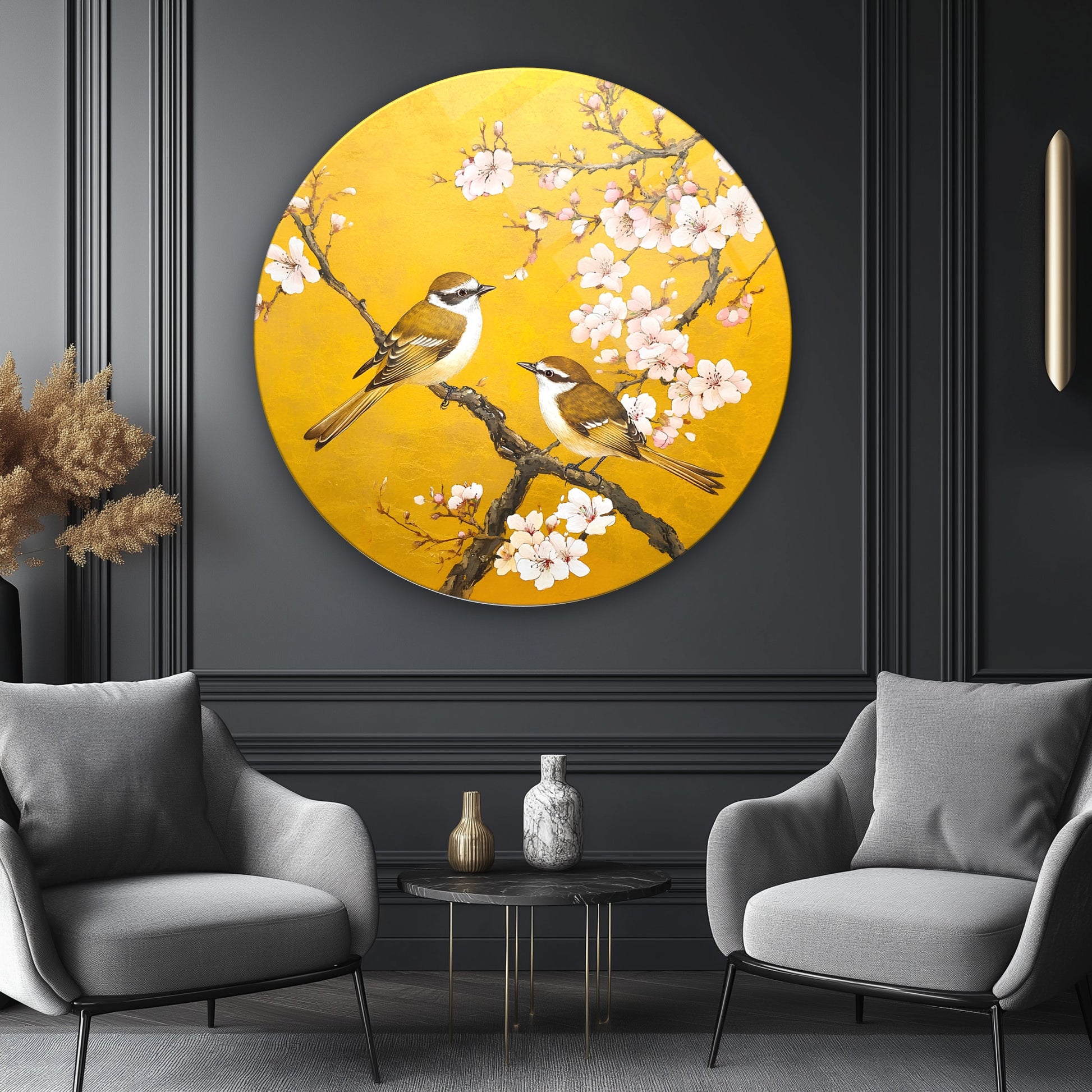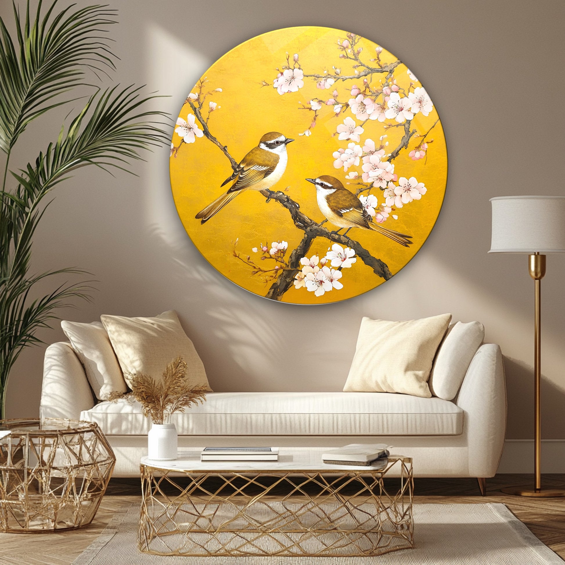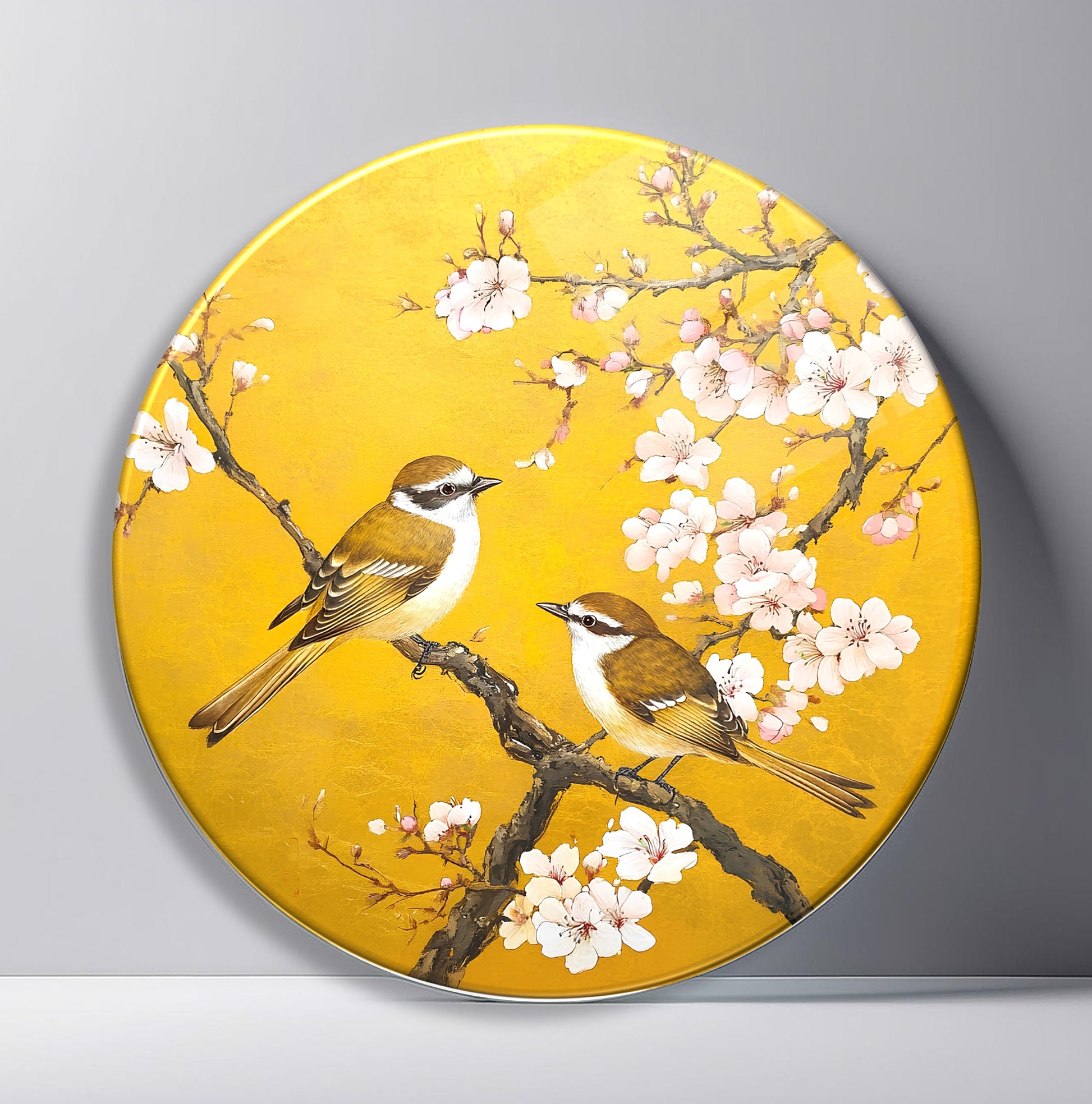 Çiçekler ve Serçe Kuşları Yuvarlak Cam Tablo