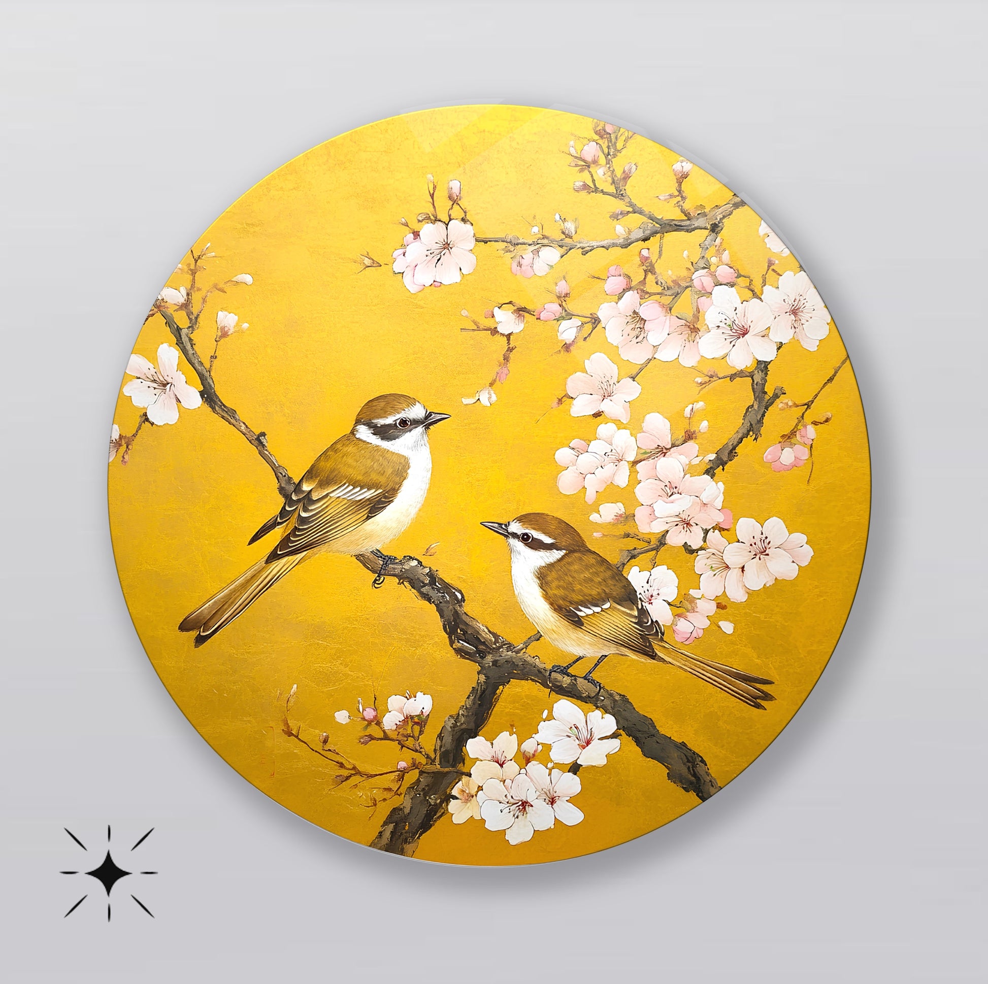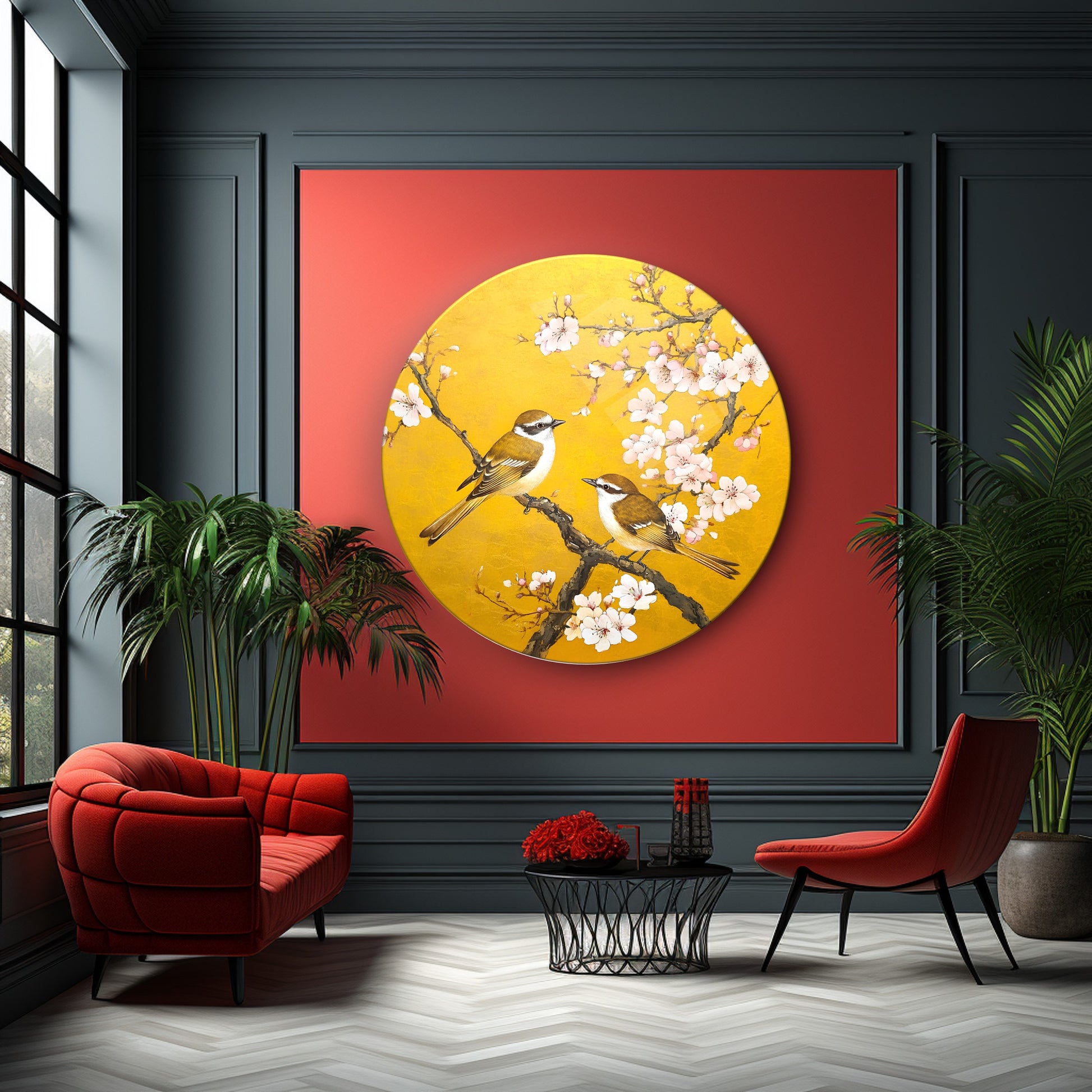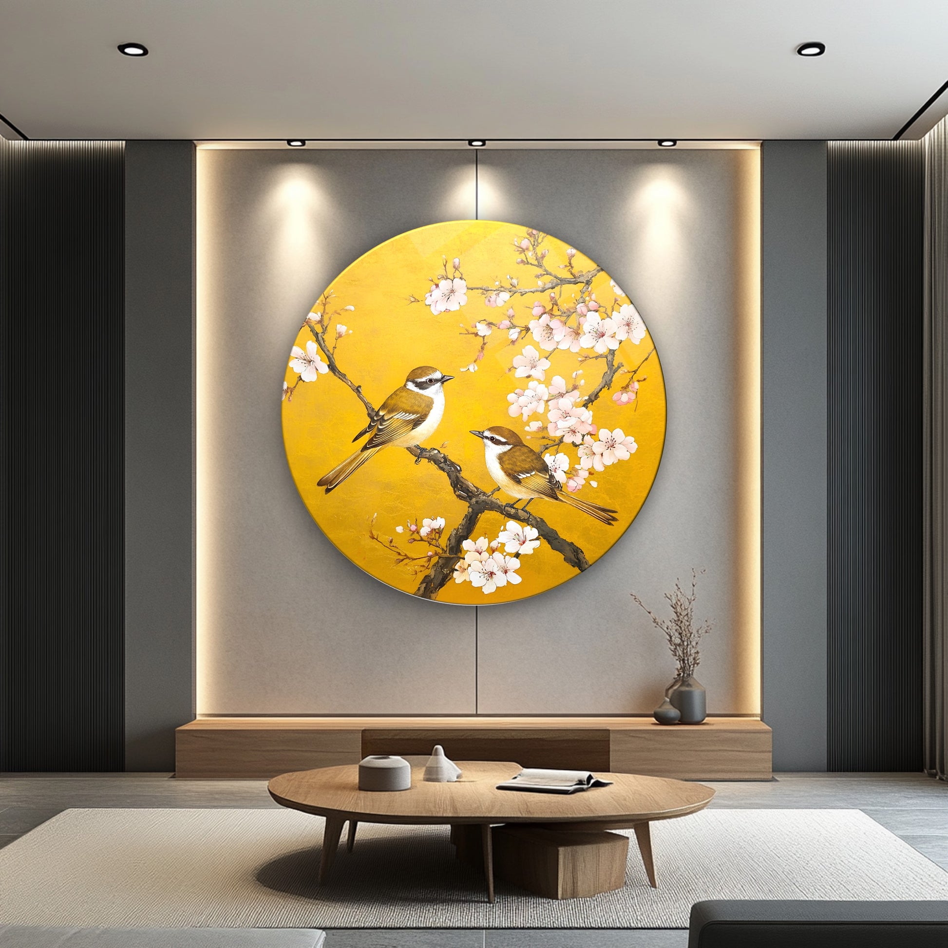 Çiçekler ve Serçe Kuşları Yuvarlak Cam Tablo