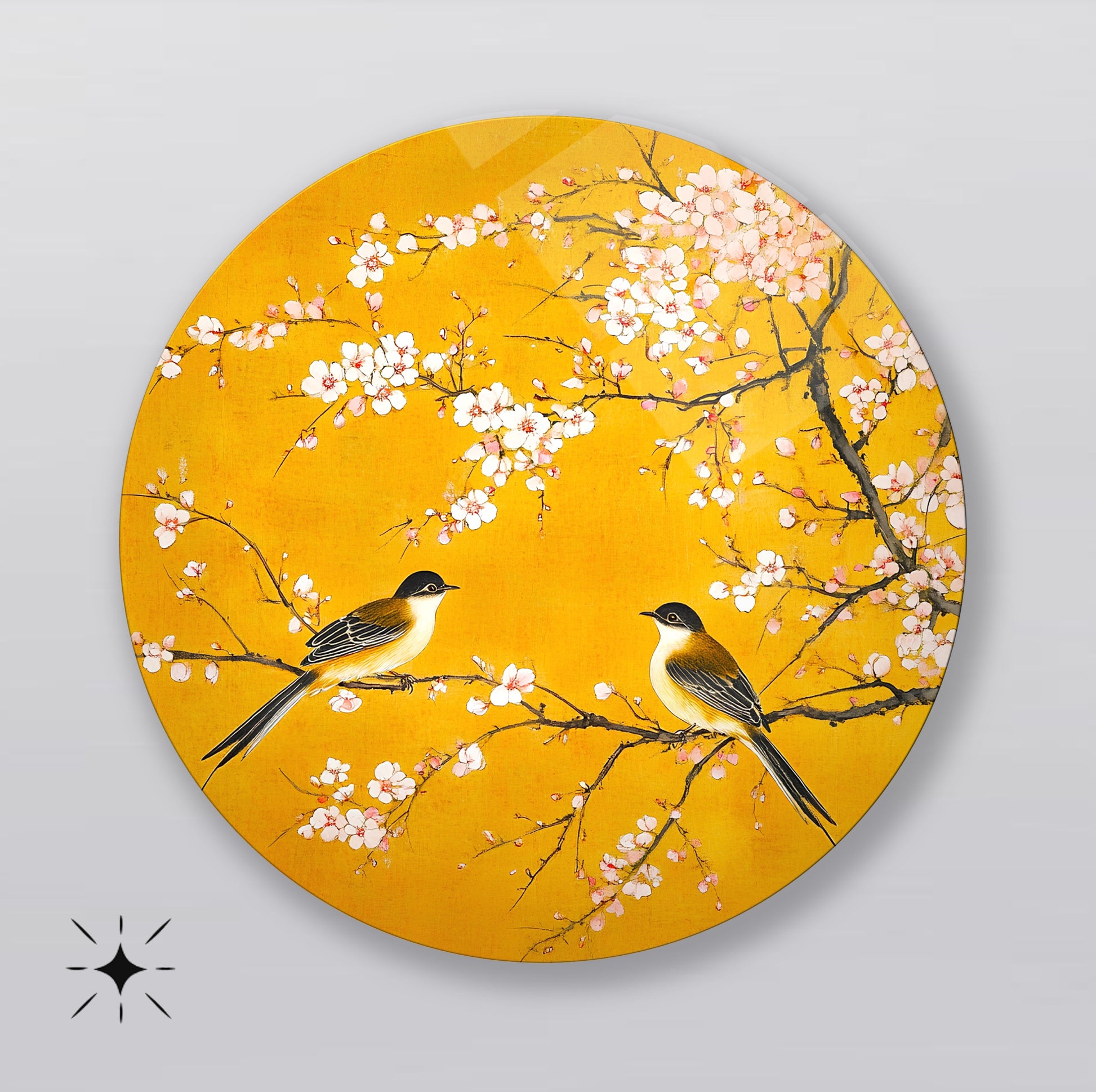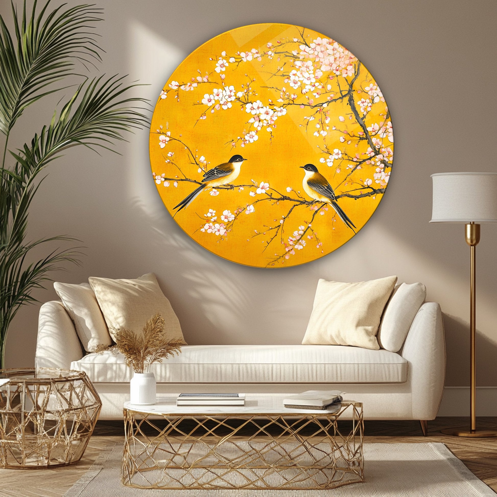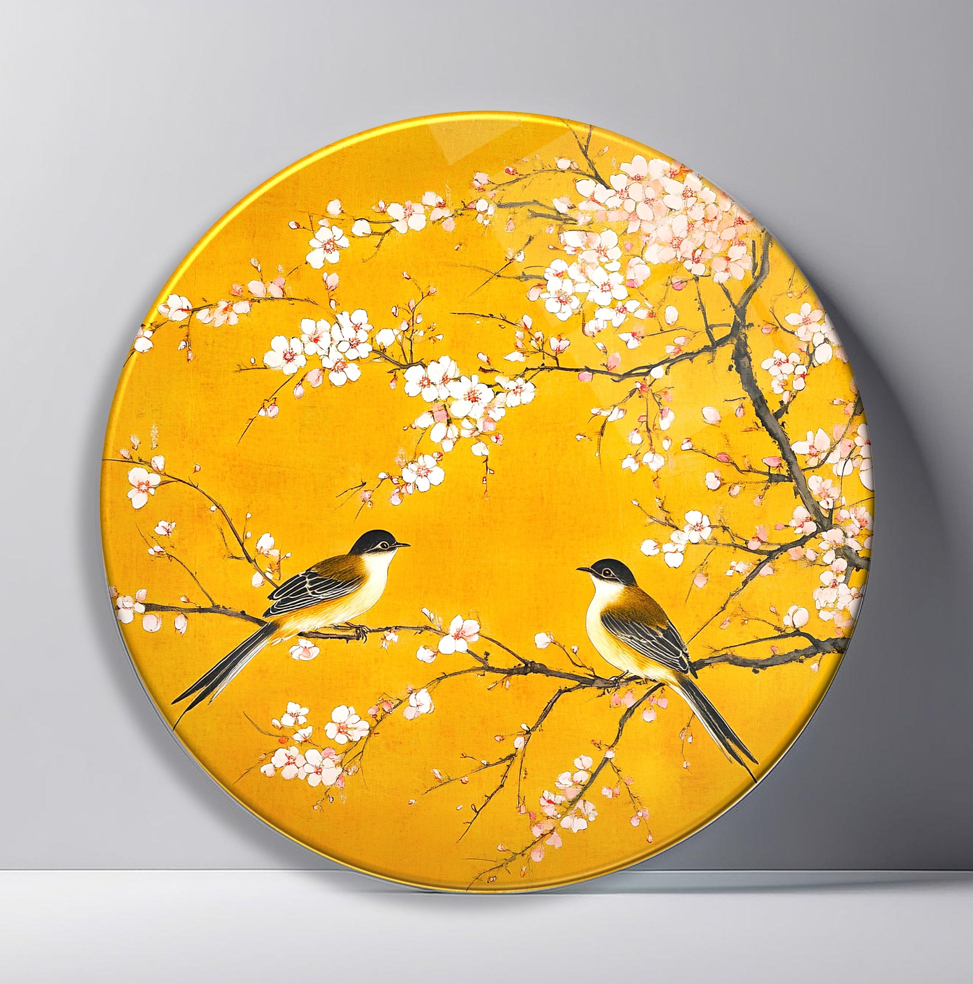 Çiçekler ve Serçe Kuşları Yuvarlak Cam Tablo