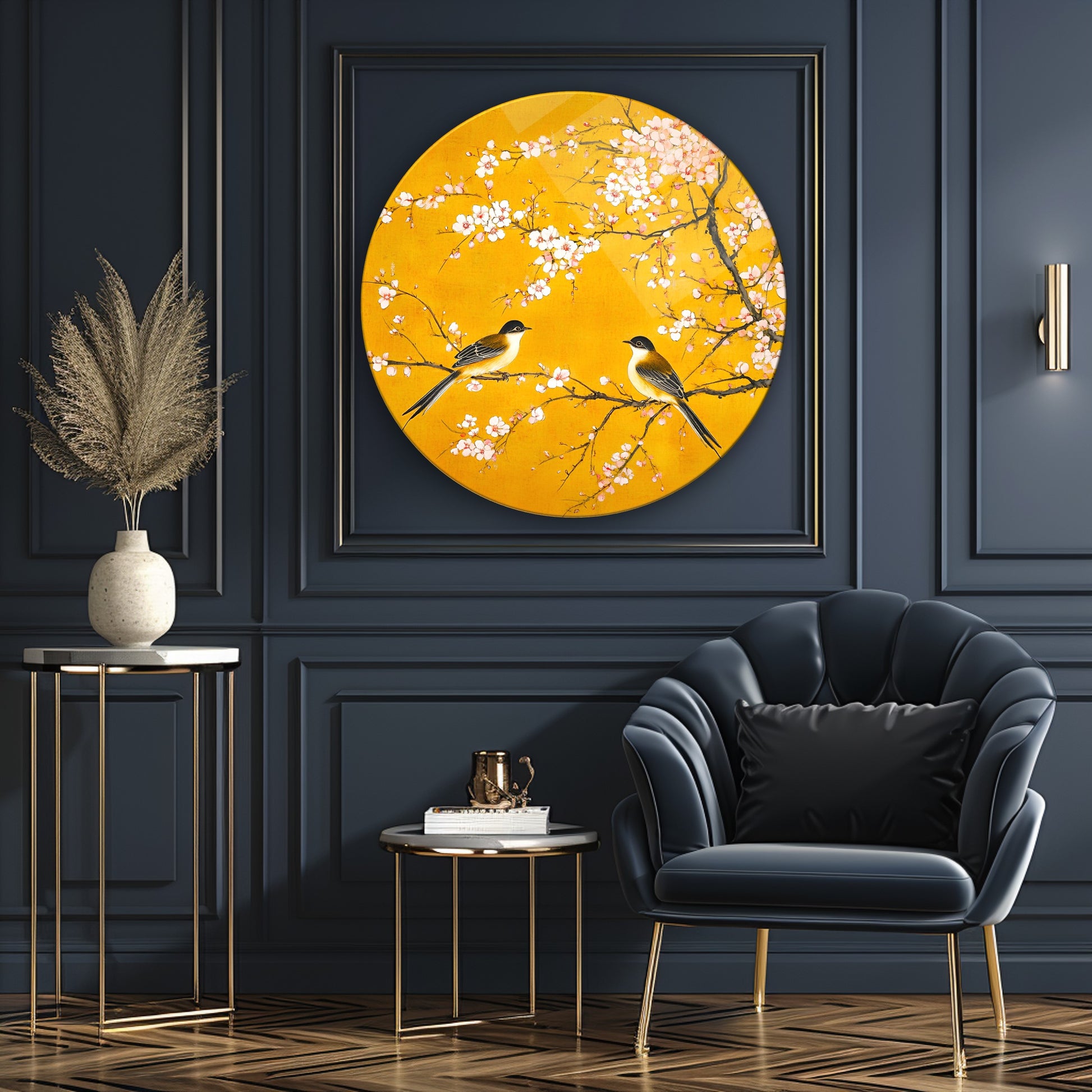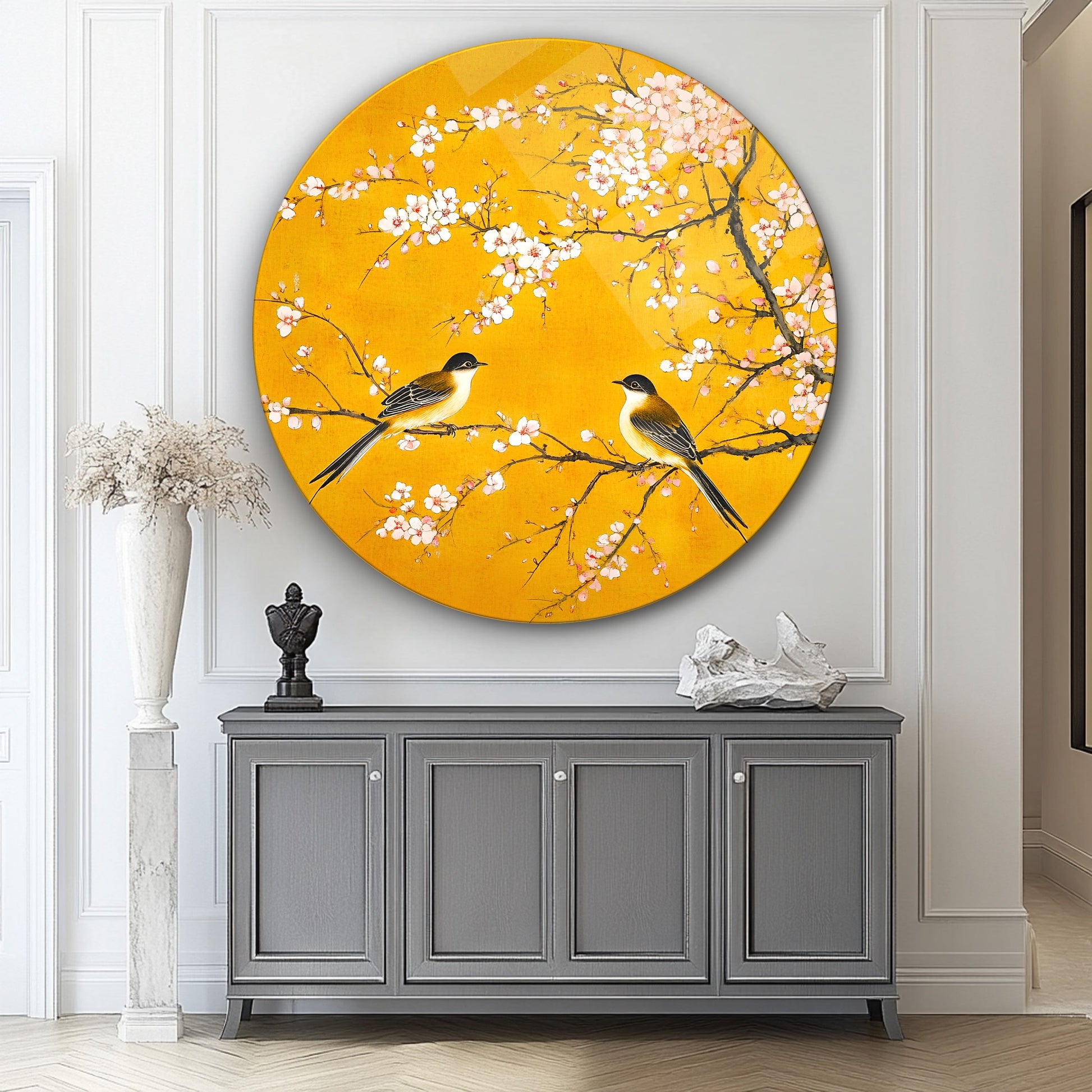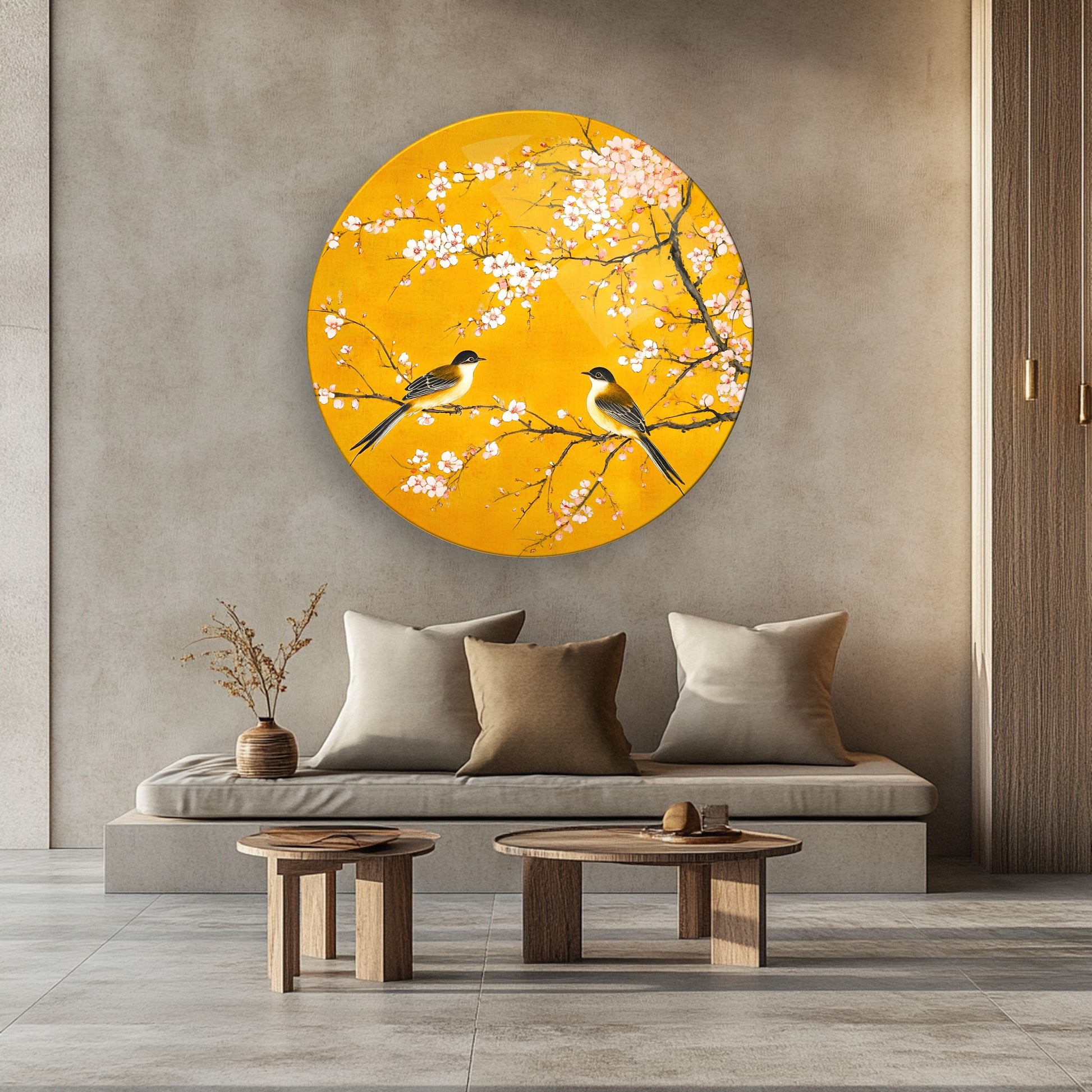 Çiçekler ve Serçe Kuşları Yuvarlak Cam Tablo