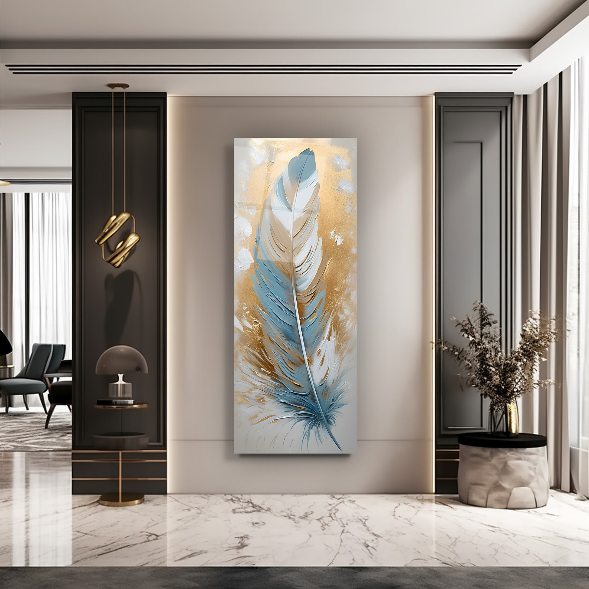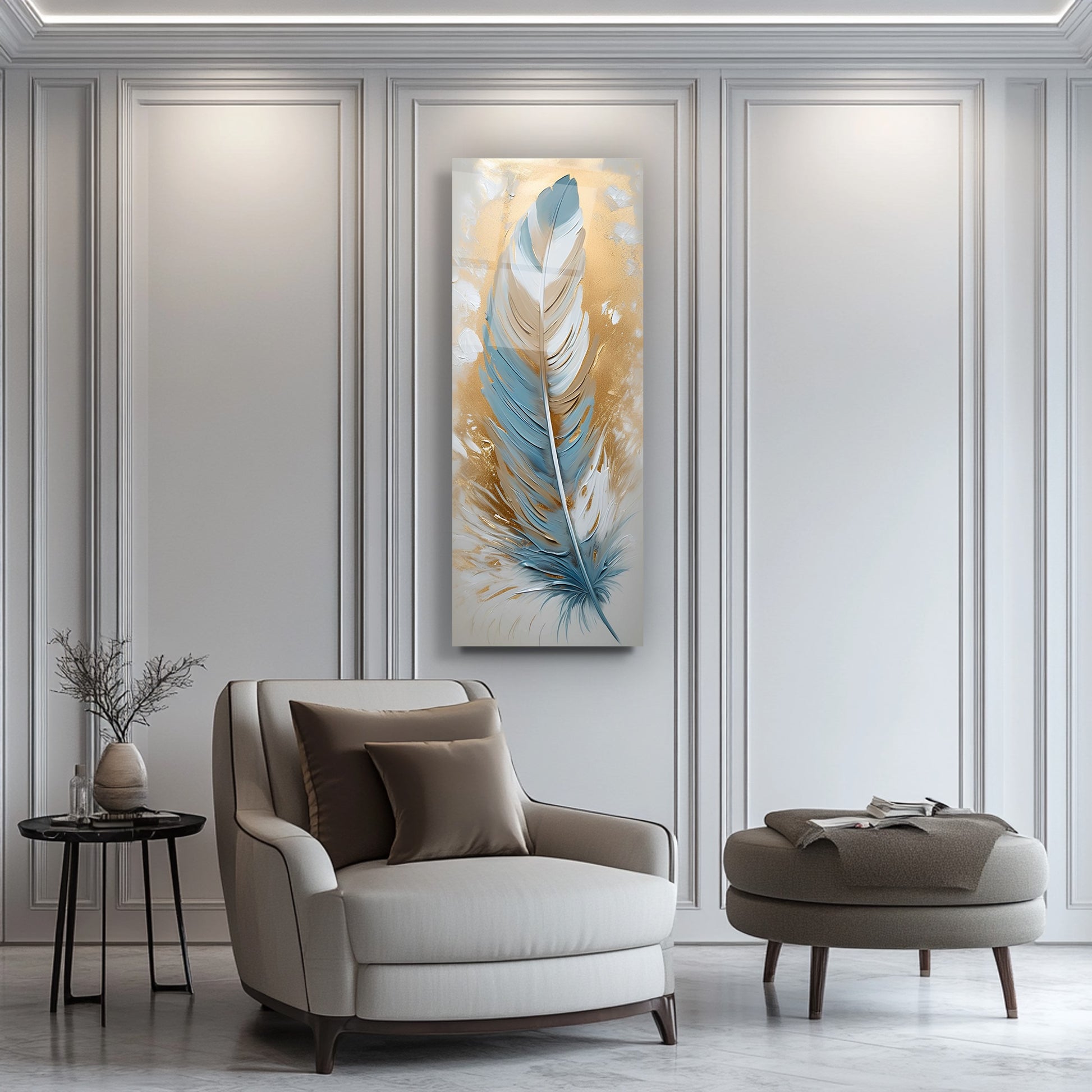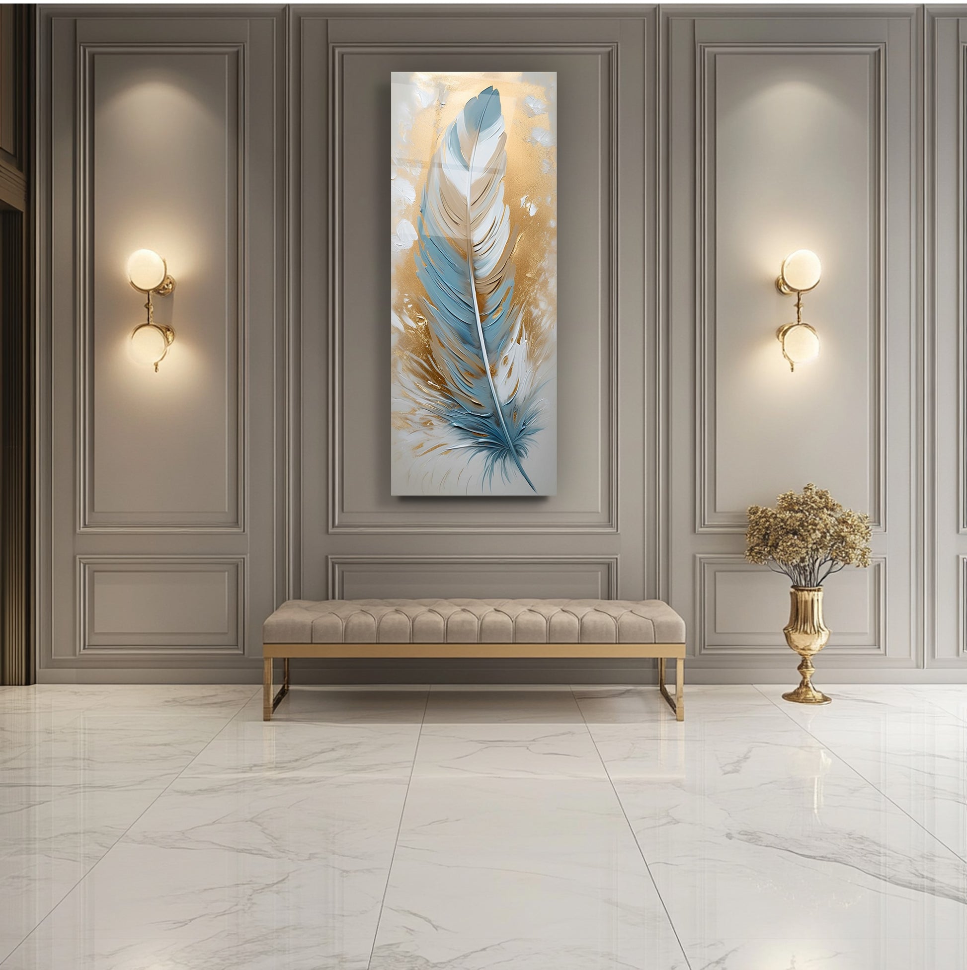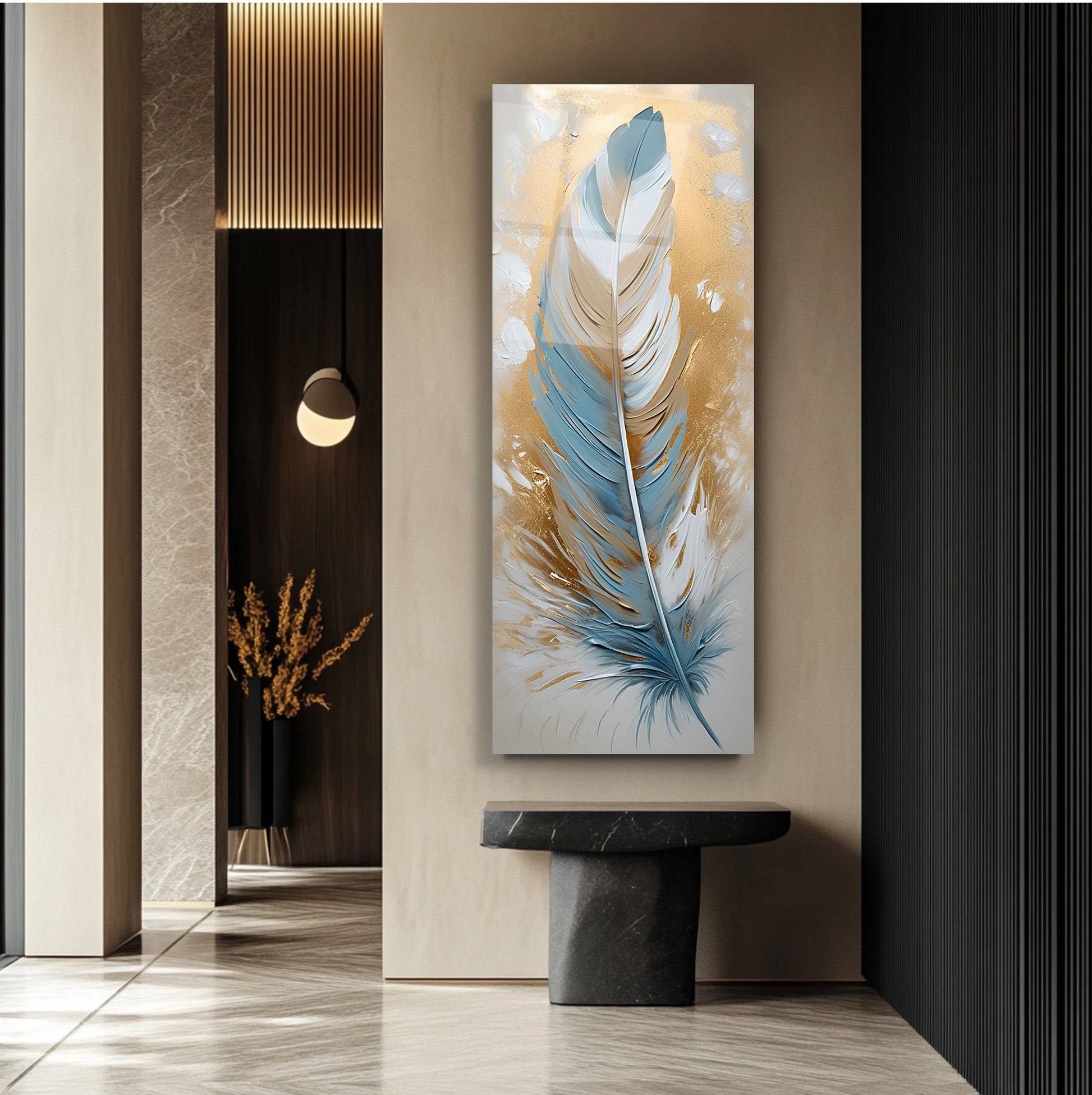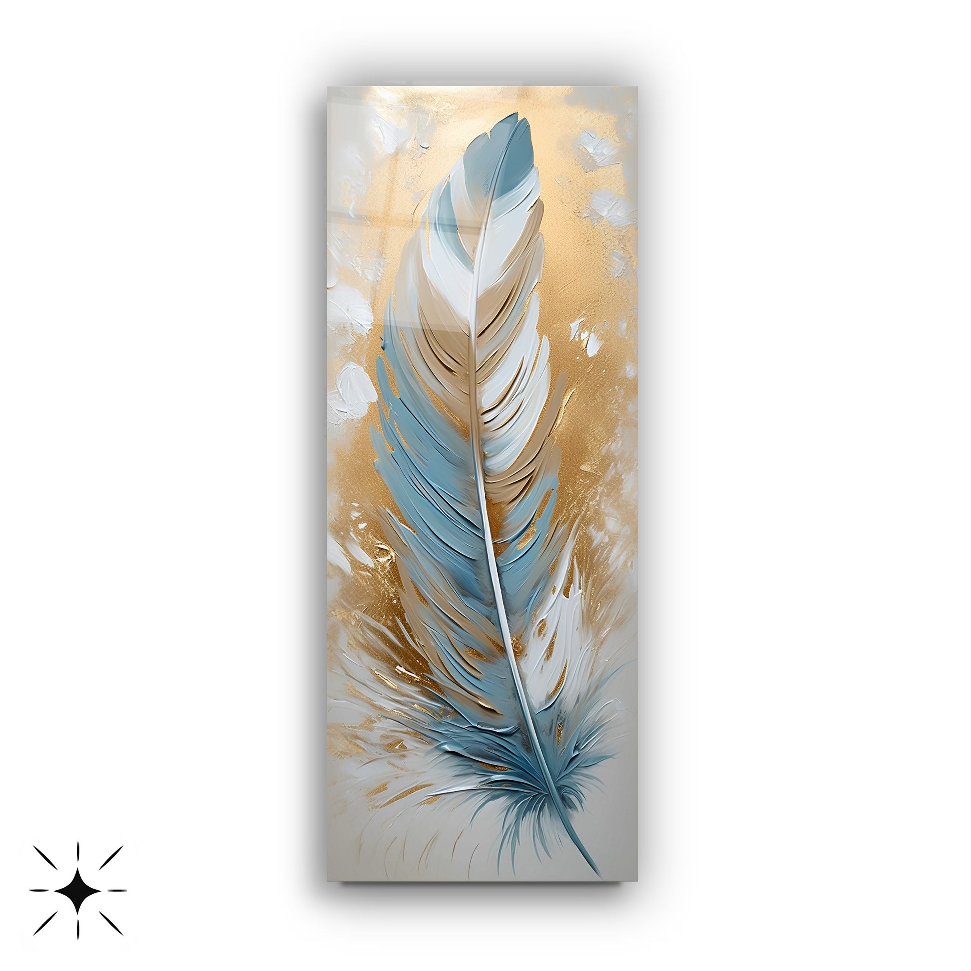 Gold arka plan üzerinde zarif mavi ve beyaz tüy desenleriyle tasarlanan bu panoramik gerçek cam tablo, lüks ve hafifliği bir arada sunar. Kırılmaz cam yapısıyla dayanıklı ve uzun ömürlüdür. Geniş yatay formu, mekanlarda dengeli ve şık bir görünüm sağlar. Modern dekorasyona sofistike bir dokunuş katmak isteyenler için ideal bir tercihtir.