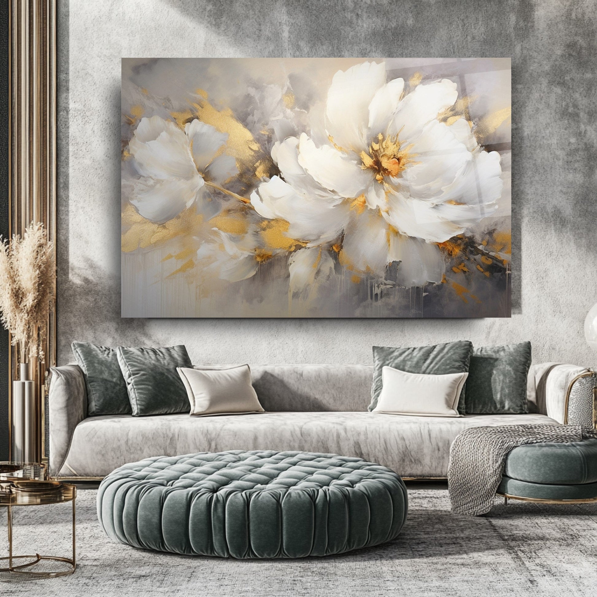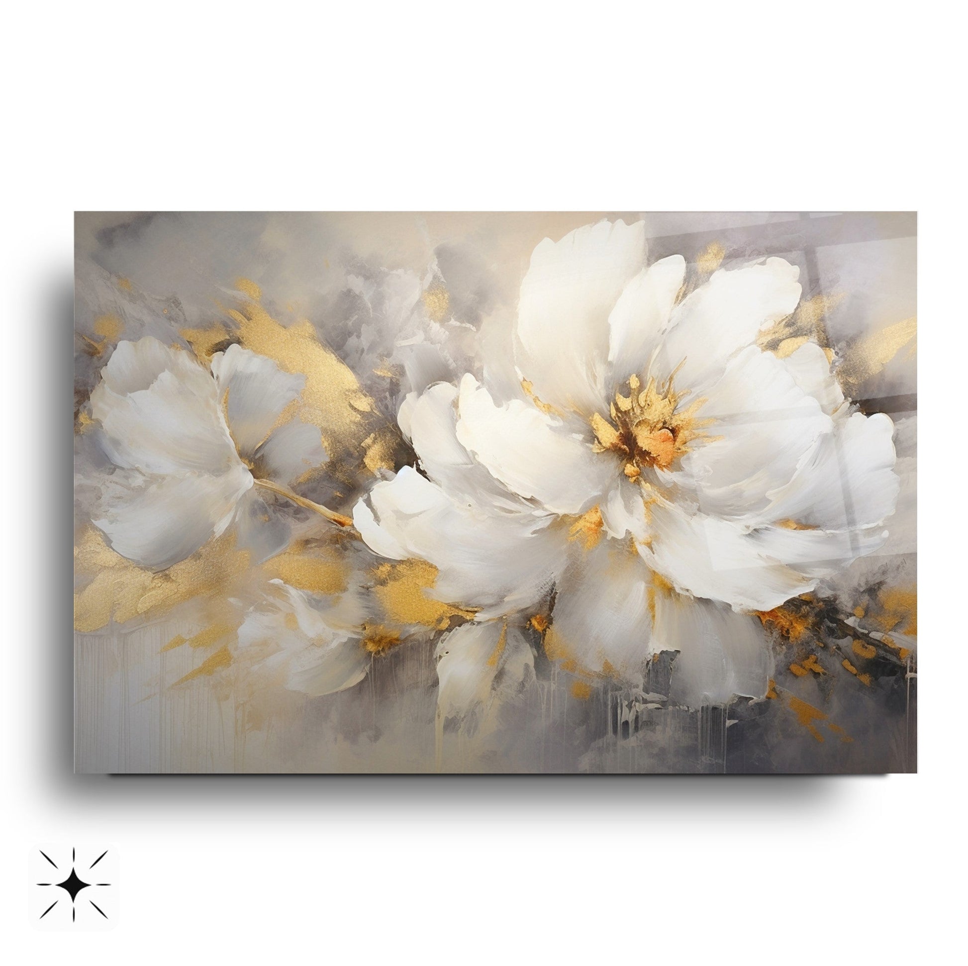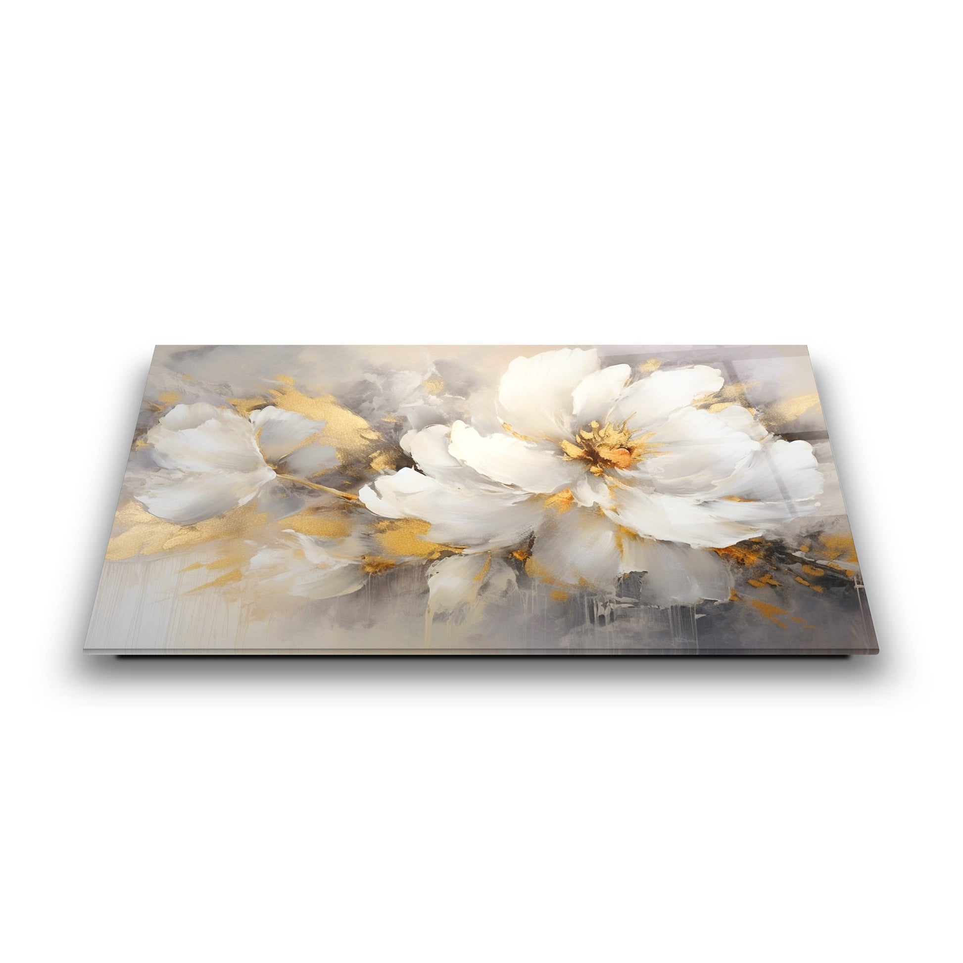 Mekanlarınıza Altın Işıltılı ve Saf Bir Bahar Esintisi: Gold Beyaz Çiçekler Cam Tablo