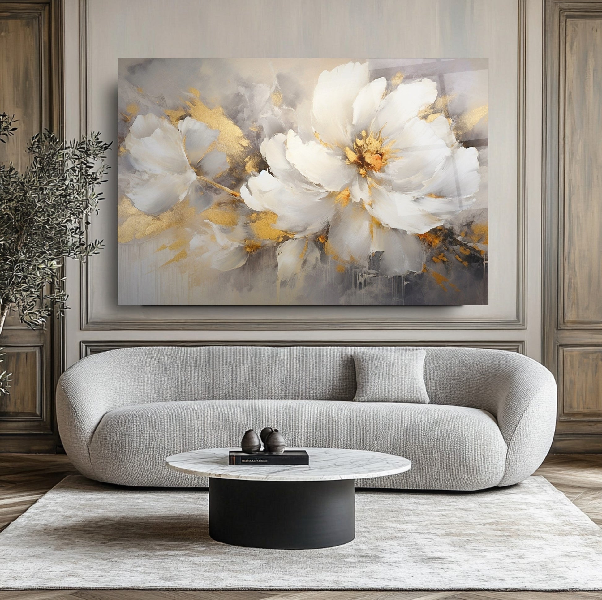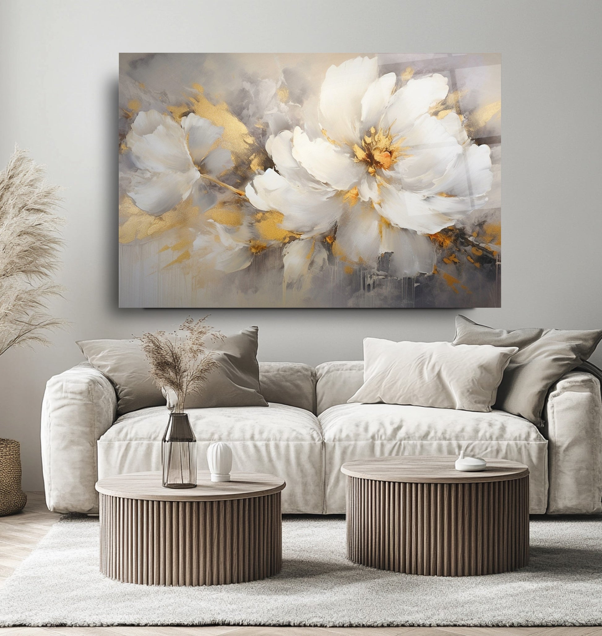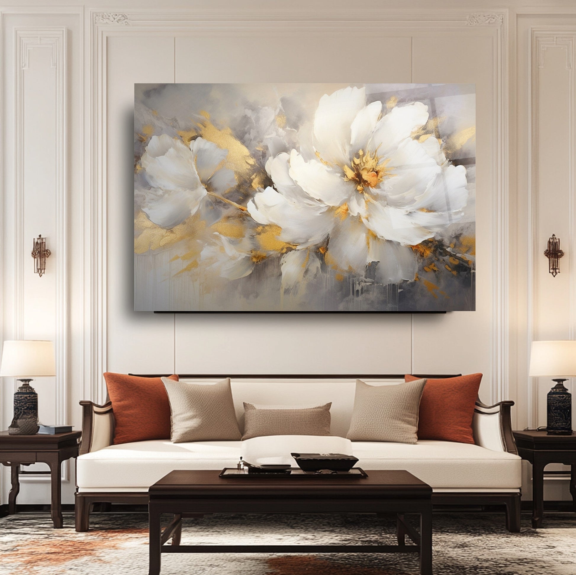 Mekanlarınıza Altın Işıltılı ve Saf Bir Bahar Esintisi: Gold Beyaz Çiçekler Cam Tablo
