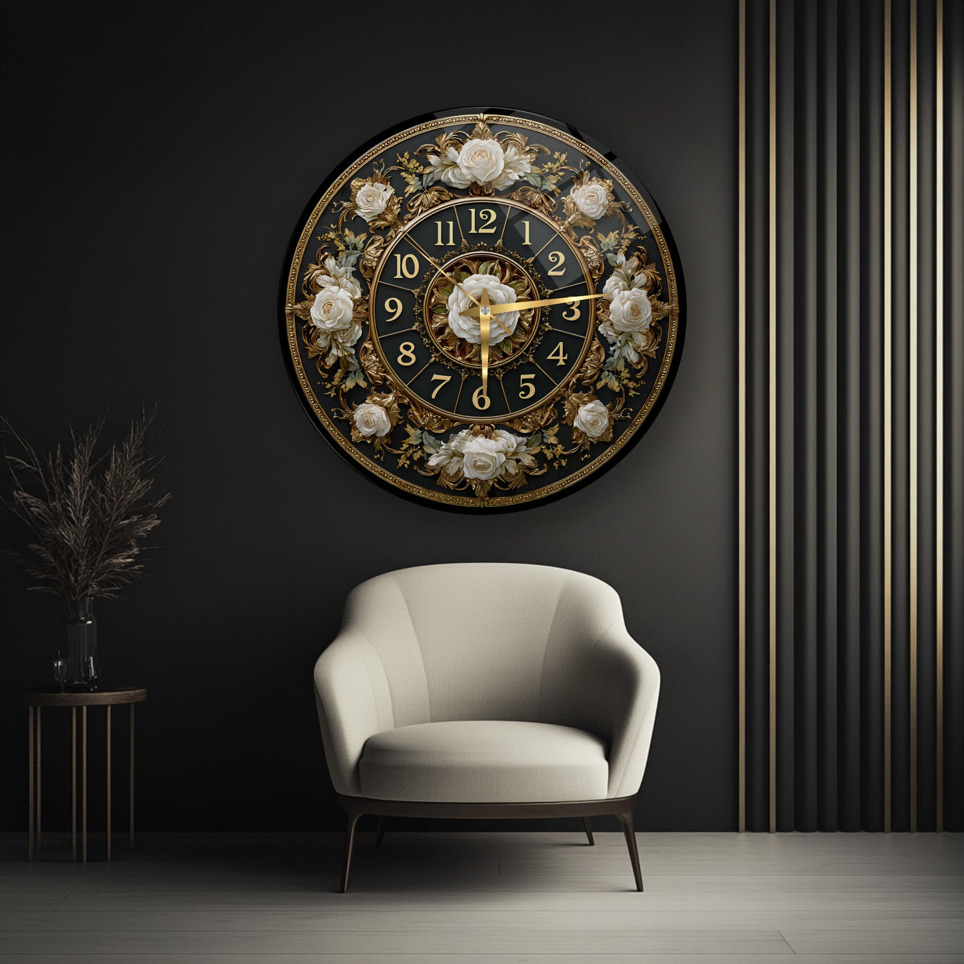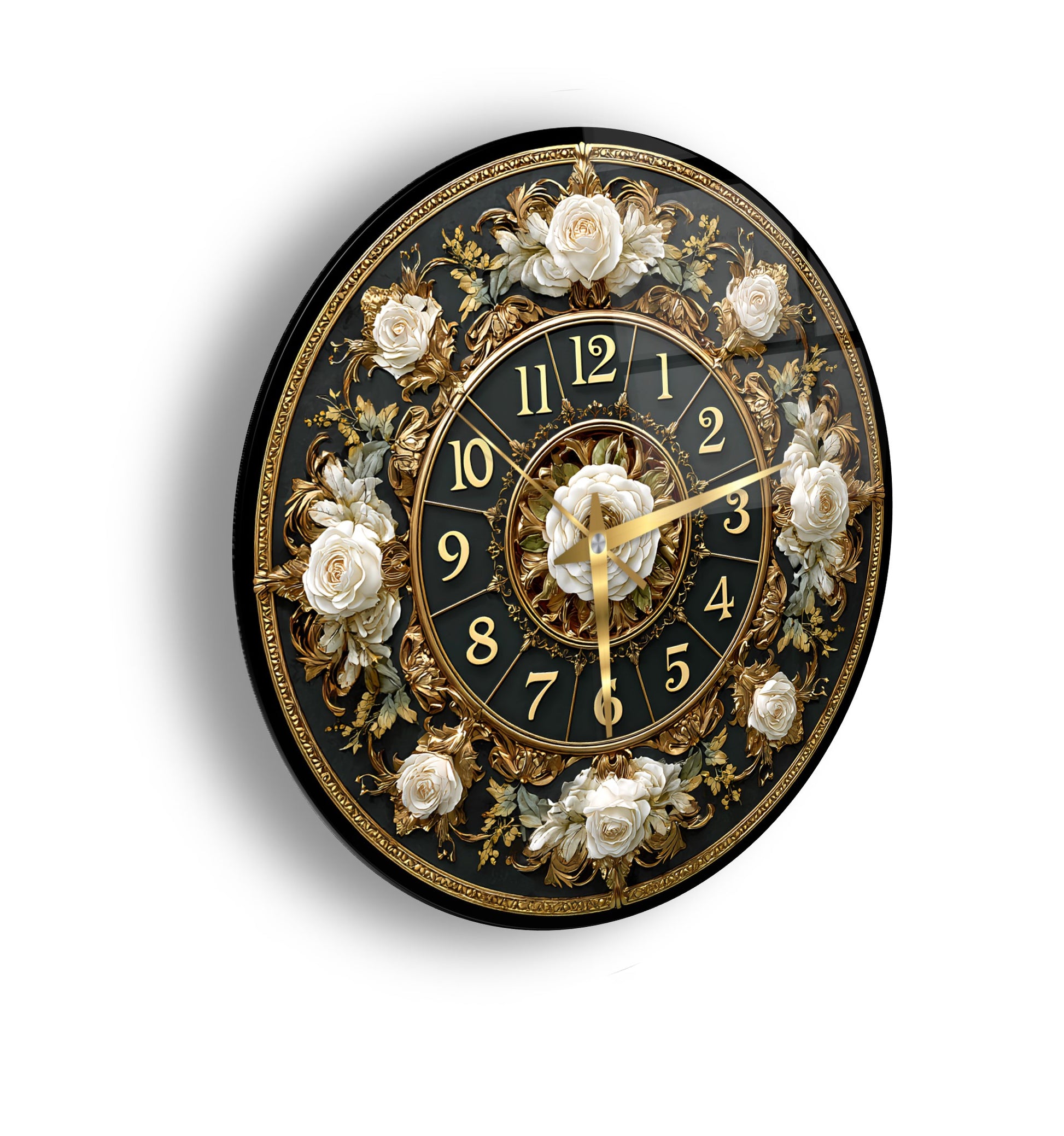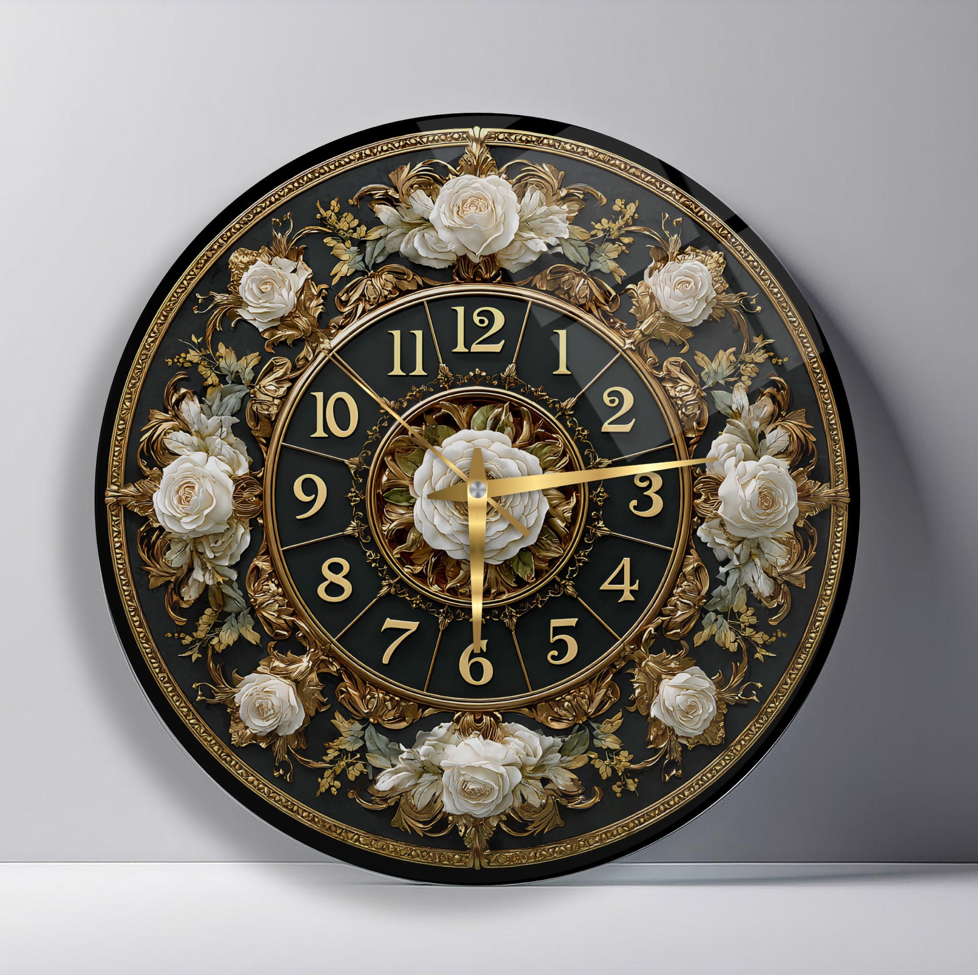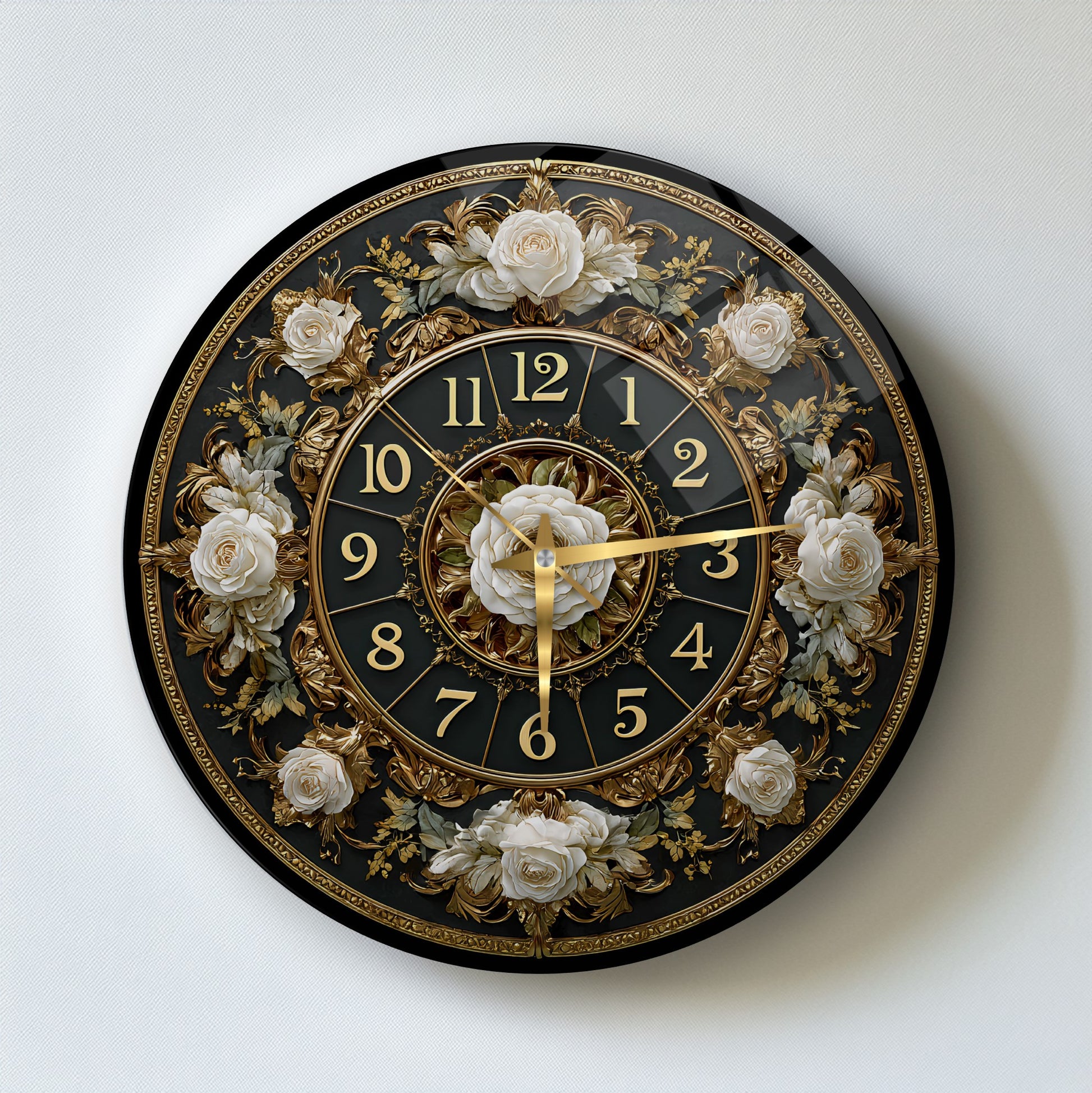 Gold Detay Çiçekli Cam Duvar Saati