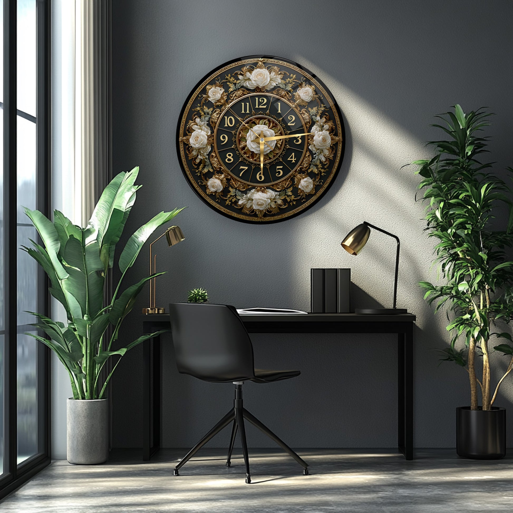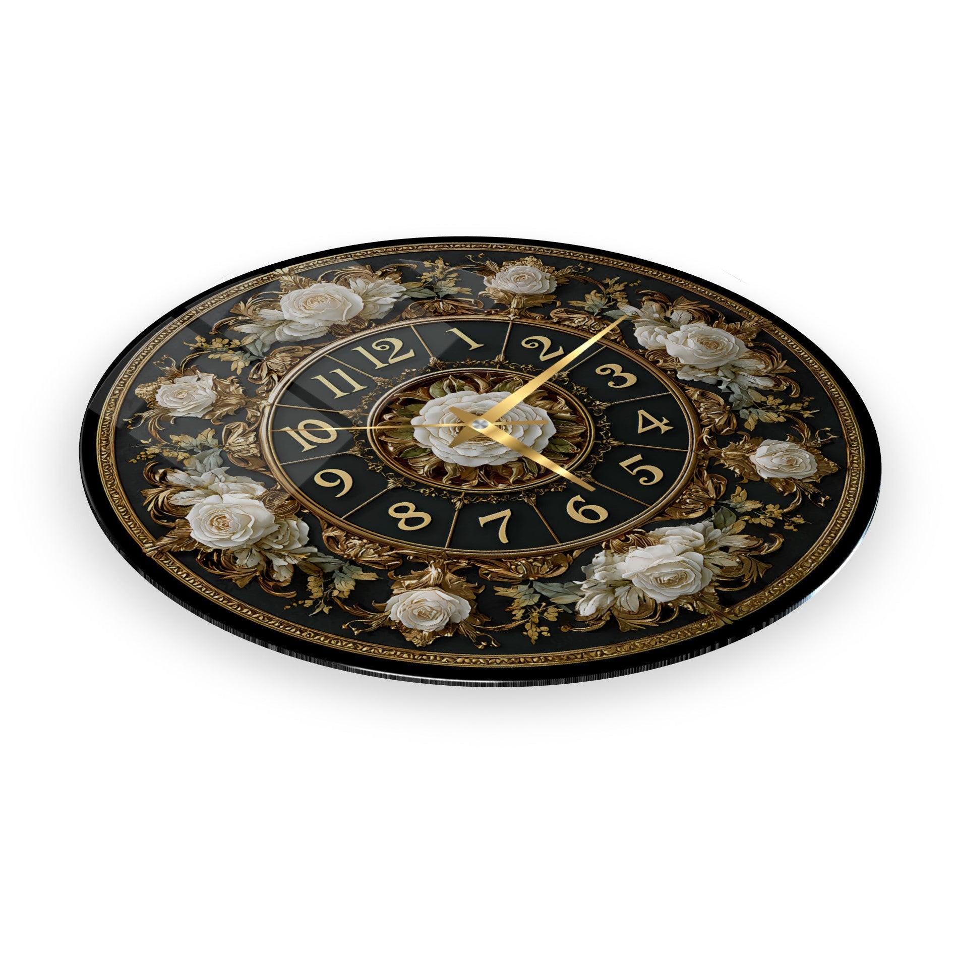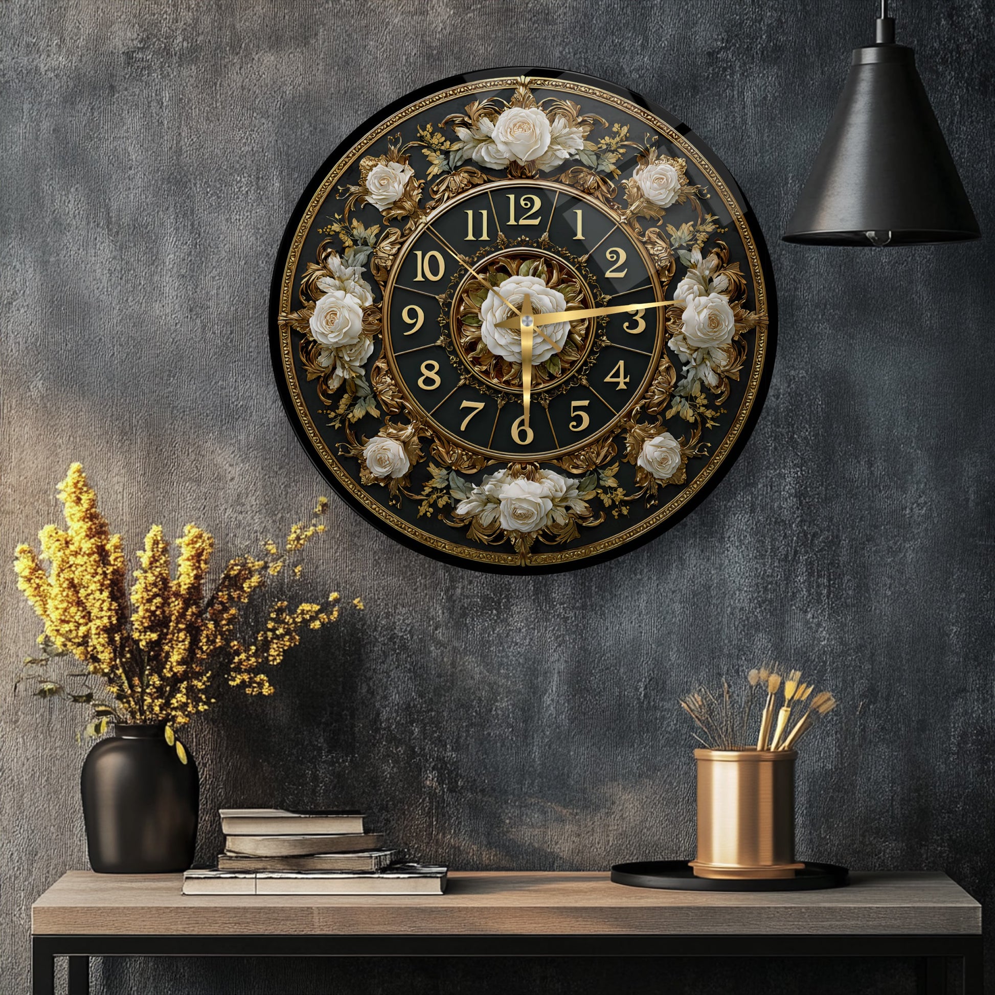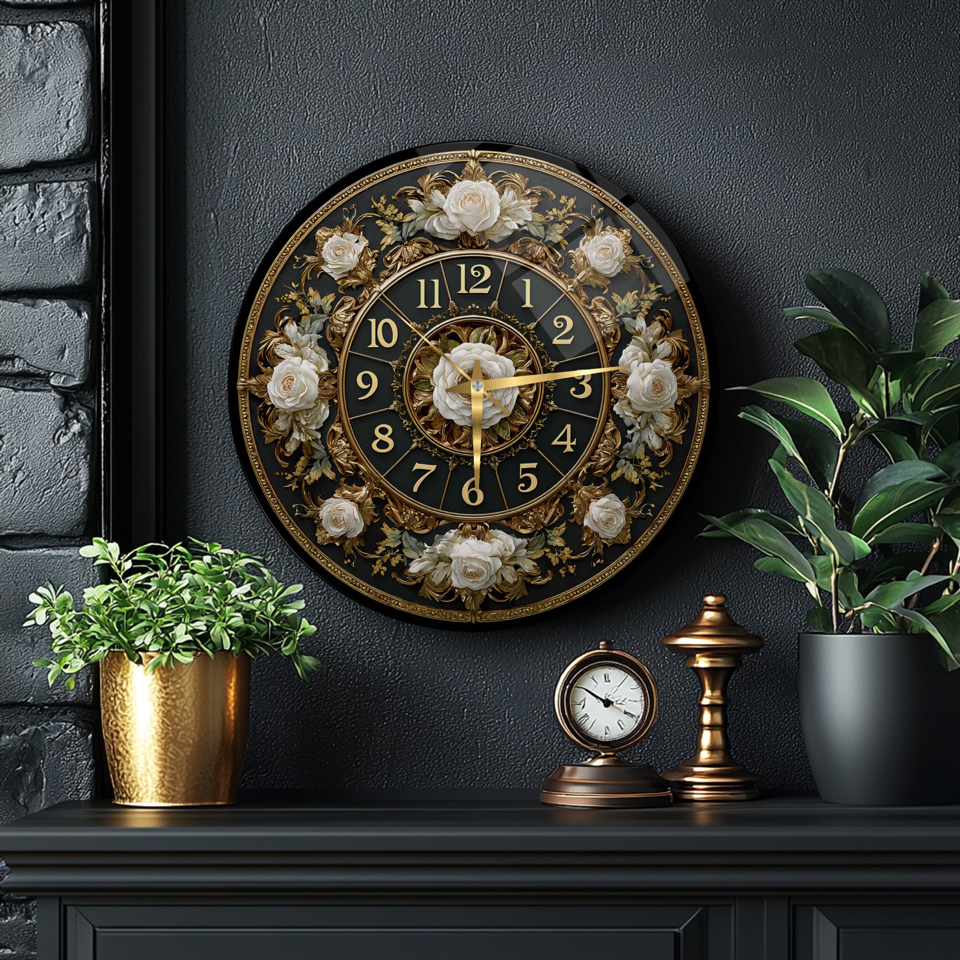Gold Detay Çiçekli Cam Duvar Saati