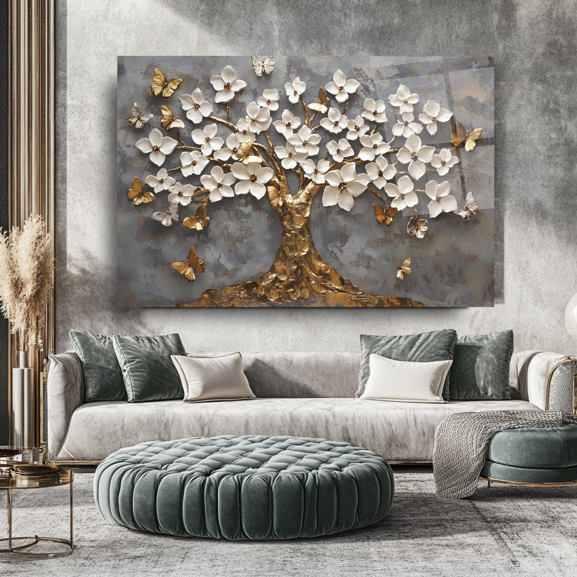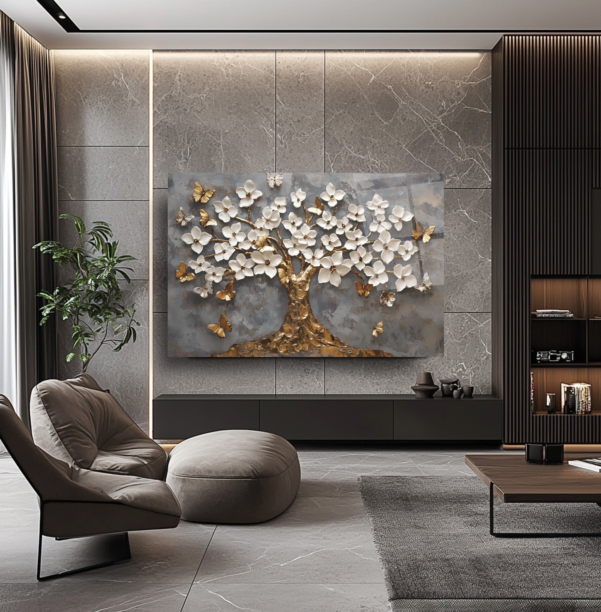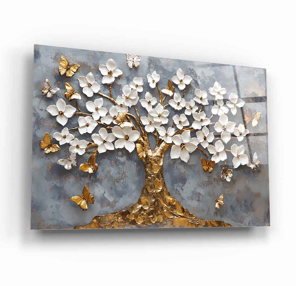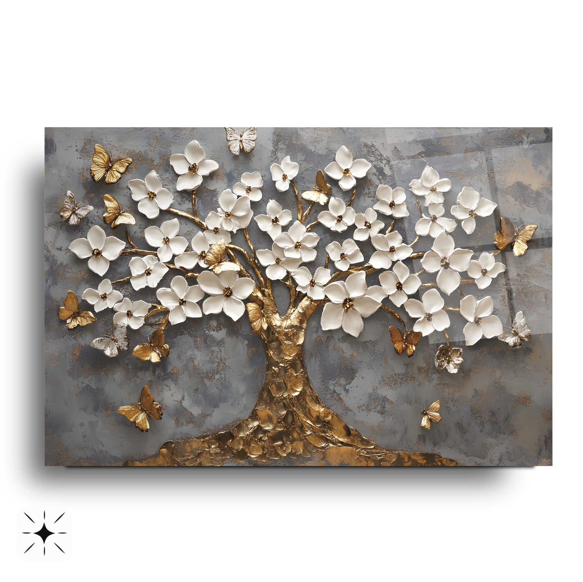 Mekanlarınıza Altın Işıltılı ve Saf Bir Yaşam: Gold Beyaz Çiçekli Hayat Ağacı Cam Tablo