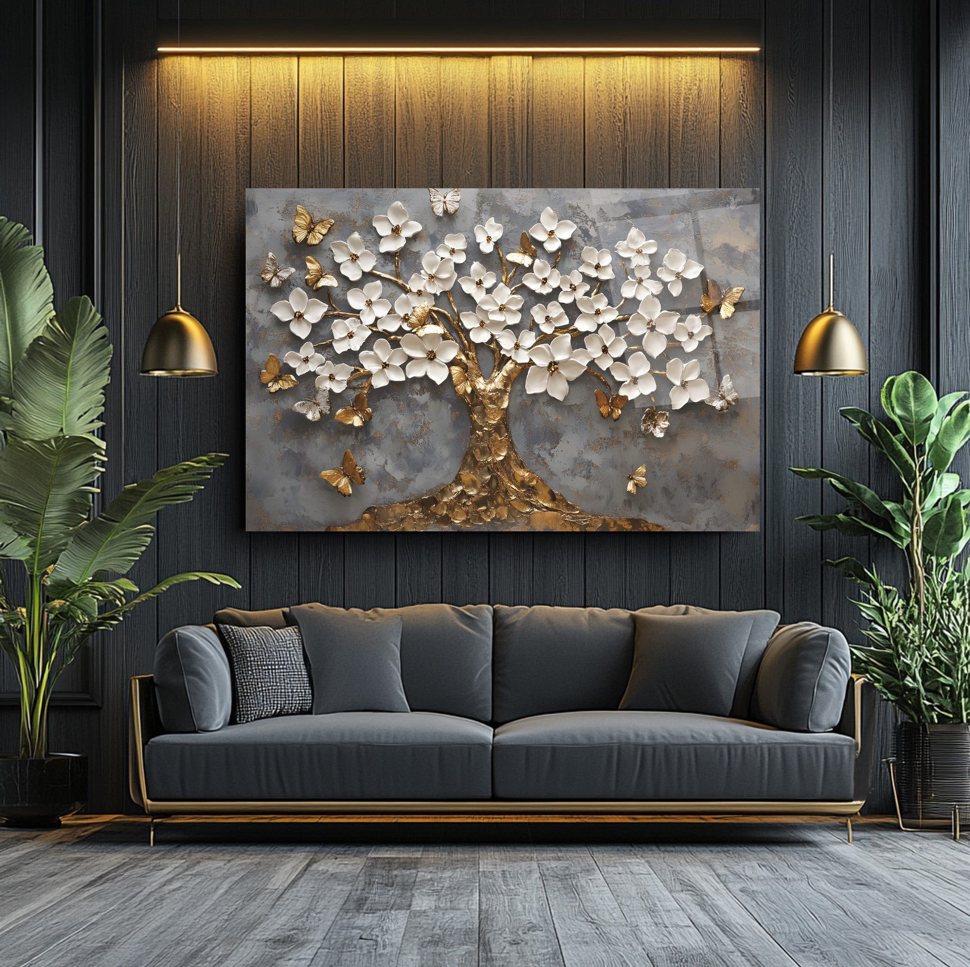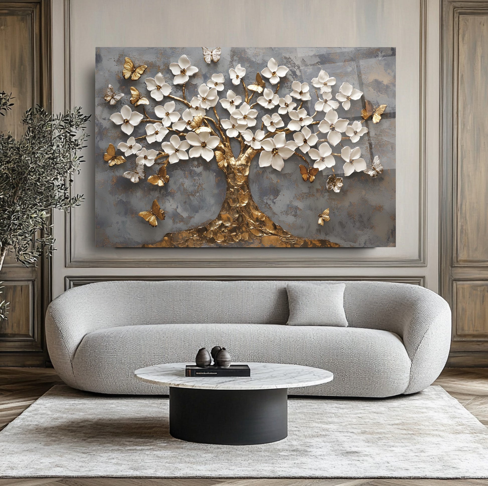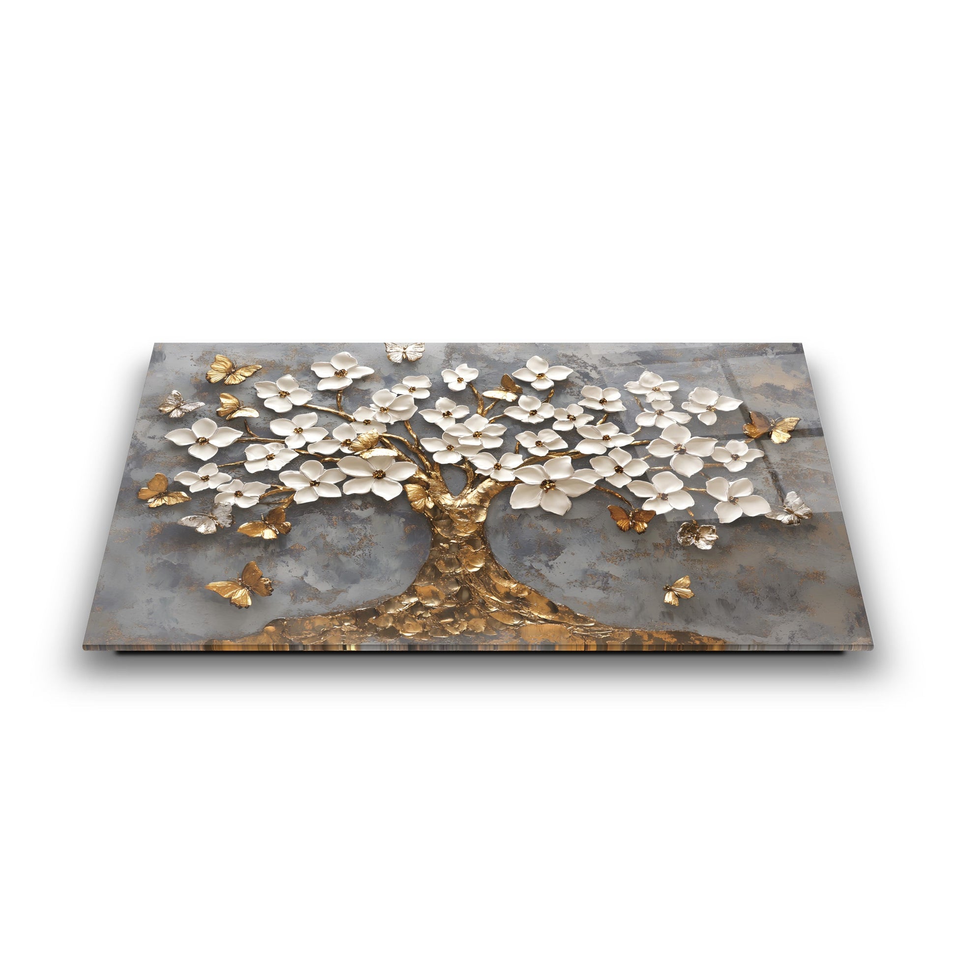 Mekanlarınıza Altın Işıltılı ve Saf Bir Yaşam: Gold Beyaz Çiçekli Hayat Ağacı Cam Tablo
