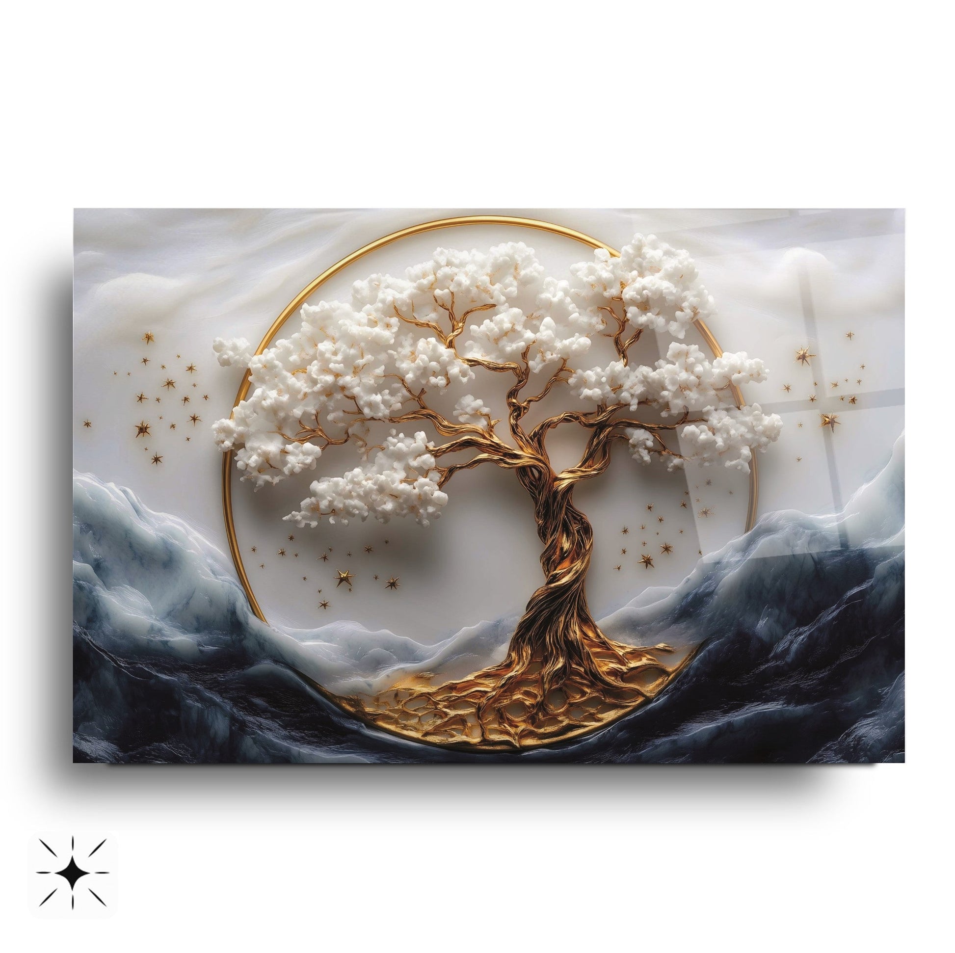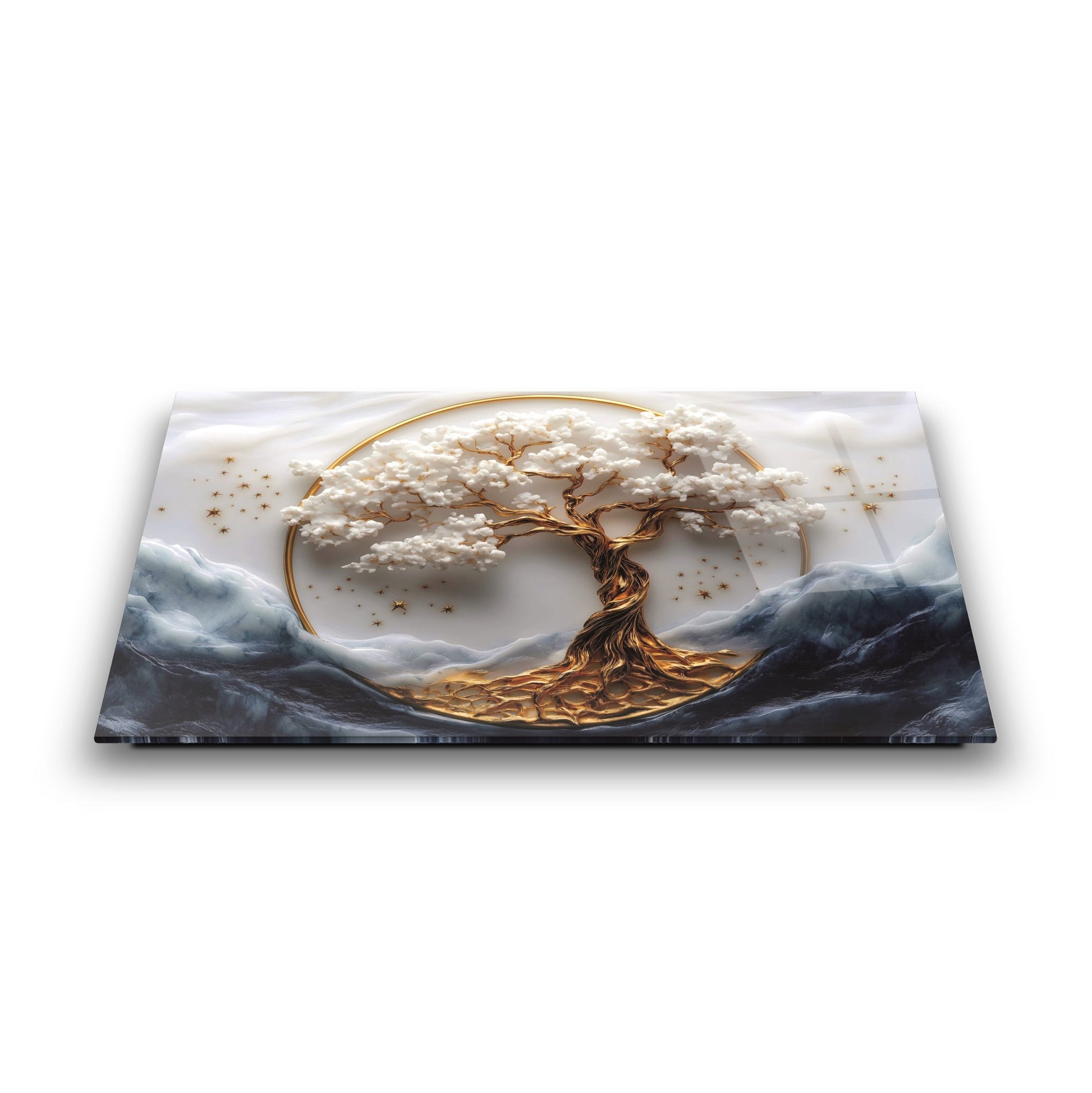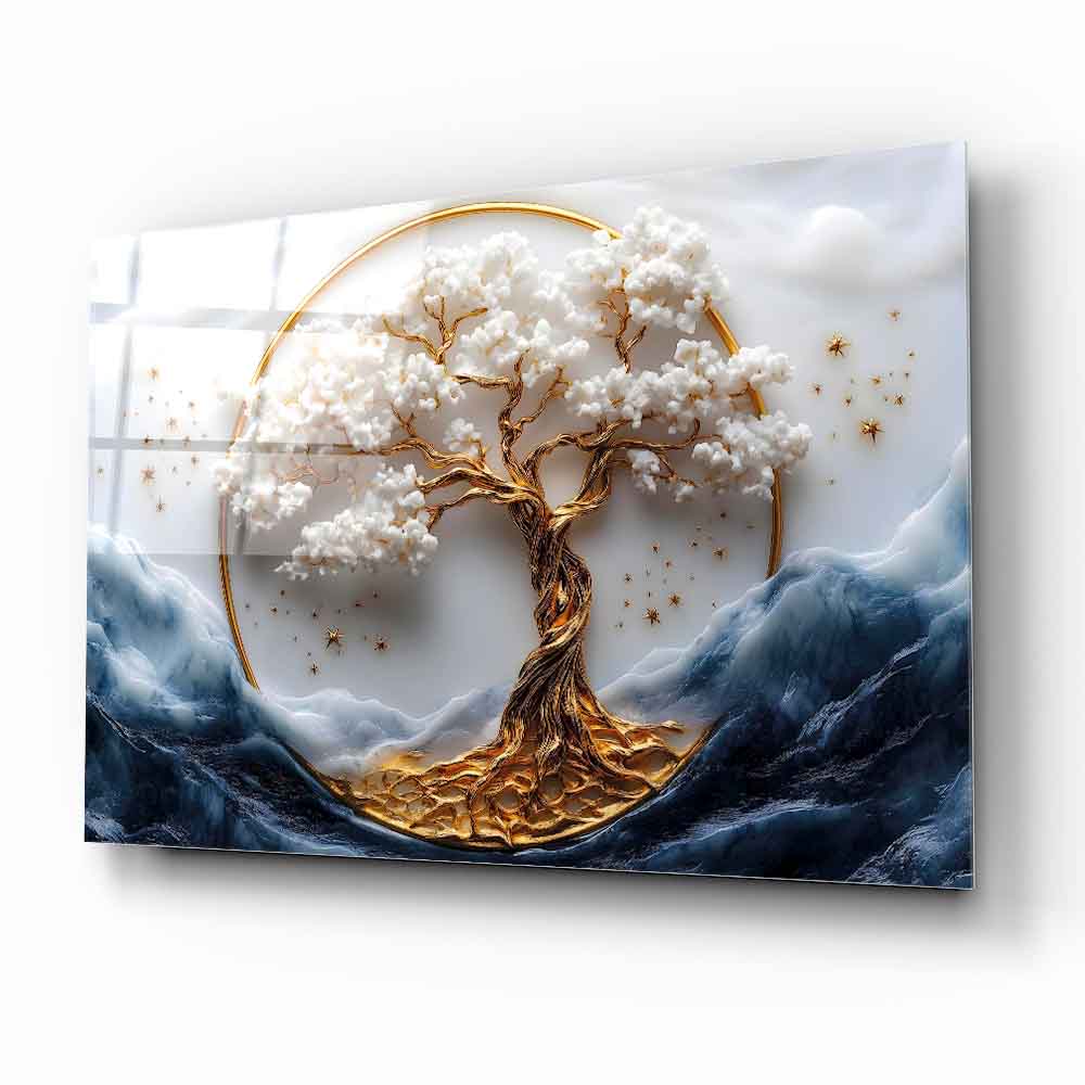 Mekanlarınıza Beyaz Saflık ve Altın Zarafetiyle Hayat Katın: Gold Beyaz Detay Hayat Ağacı Cam Tablo