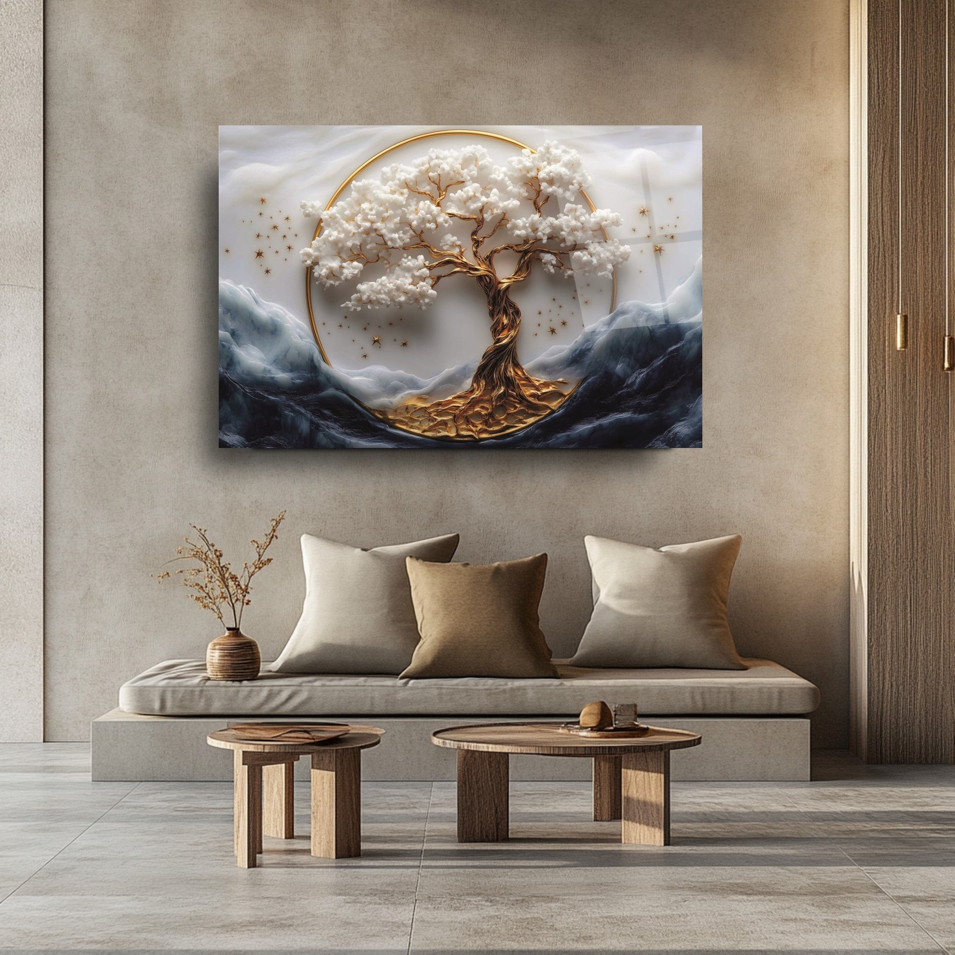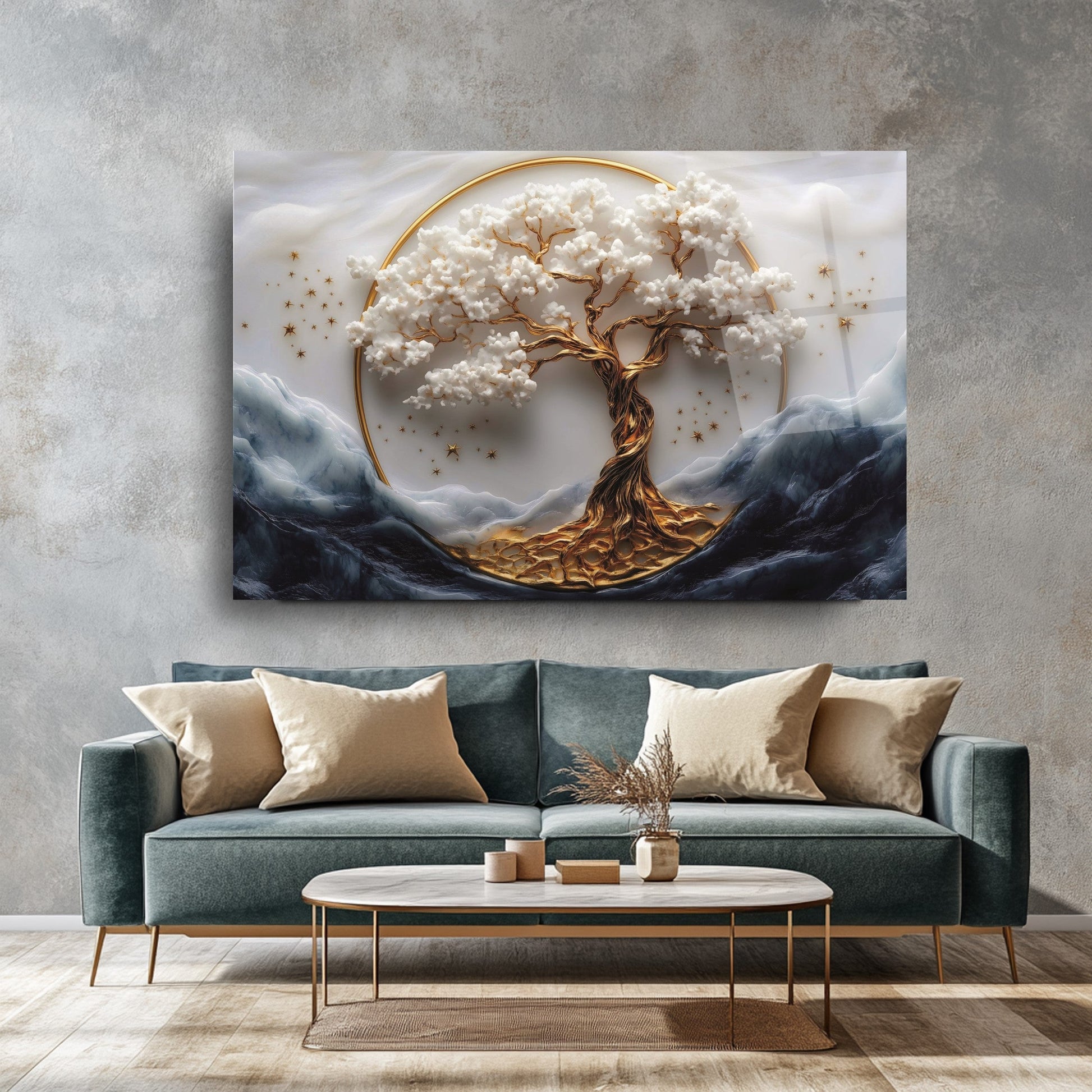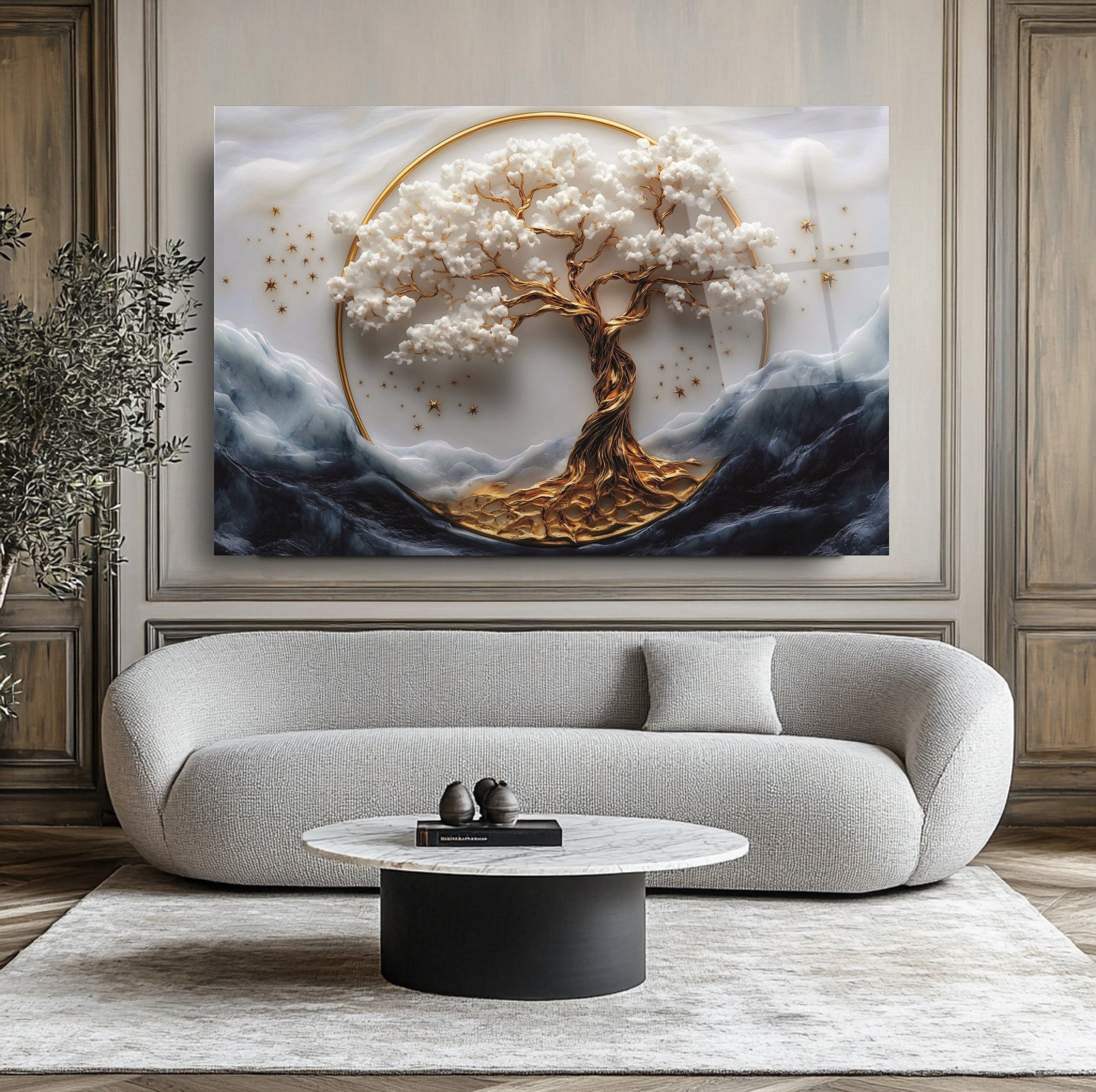Mekanlarınıza Beyaz Saflık ve Altın Zarafetiyle Hayat Katın: Gold Beyaz Detay Hayat Ağacı Cam Tablo