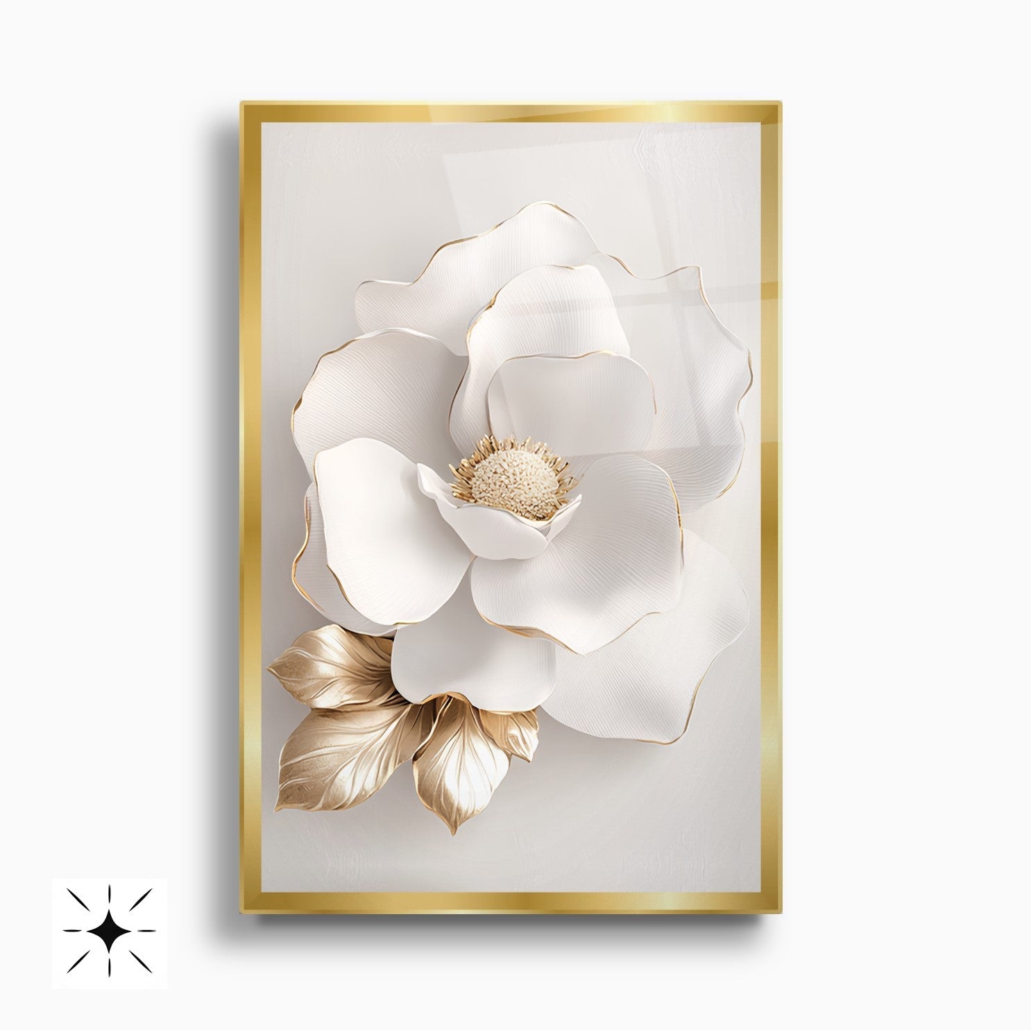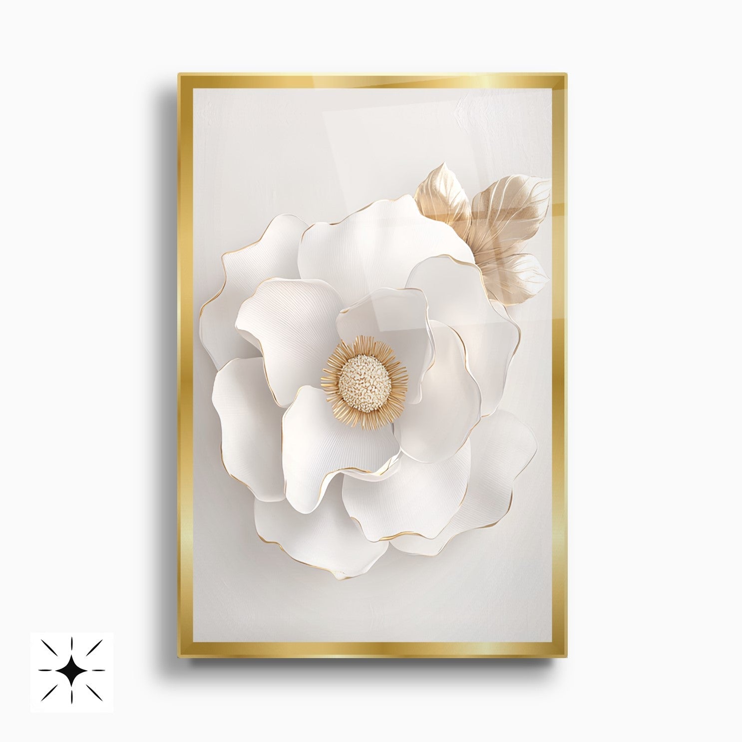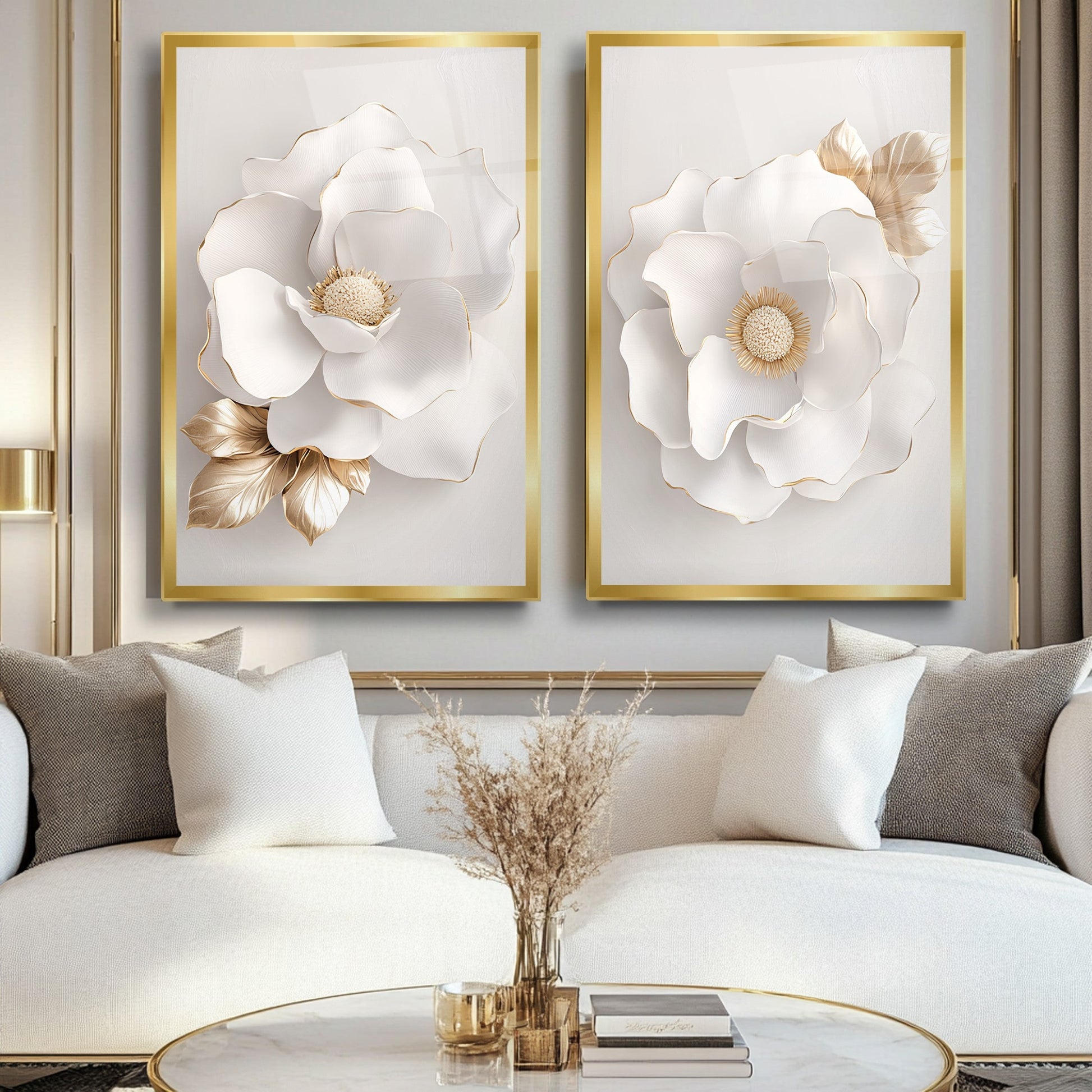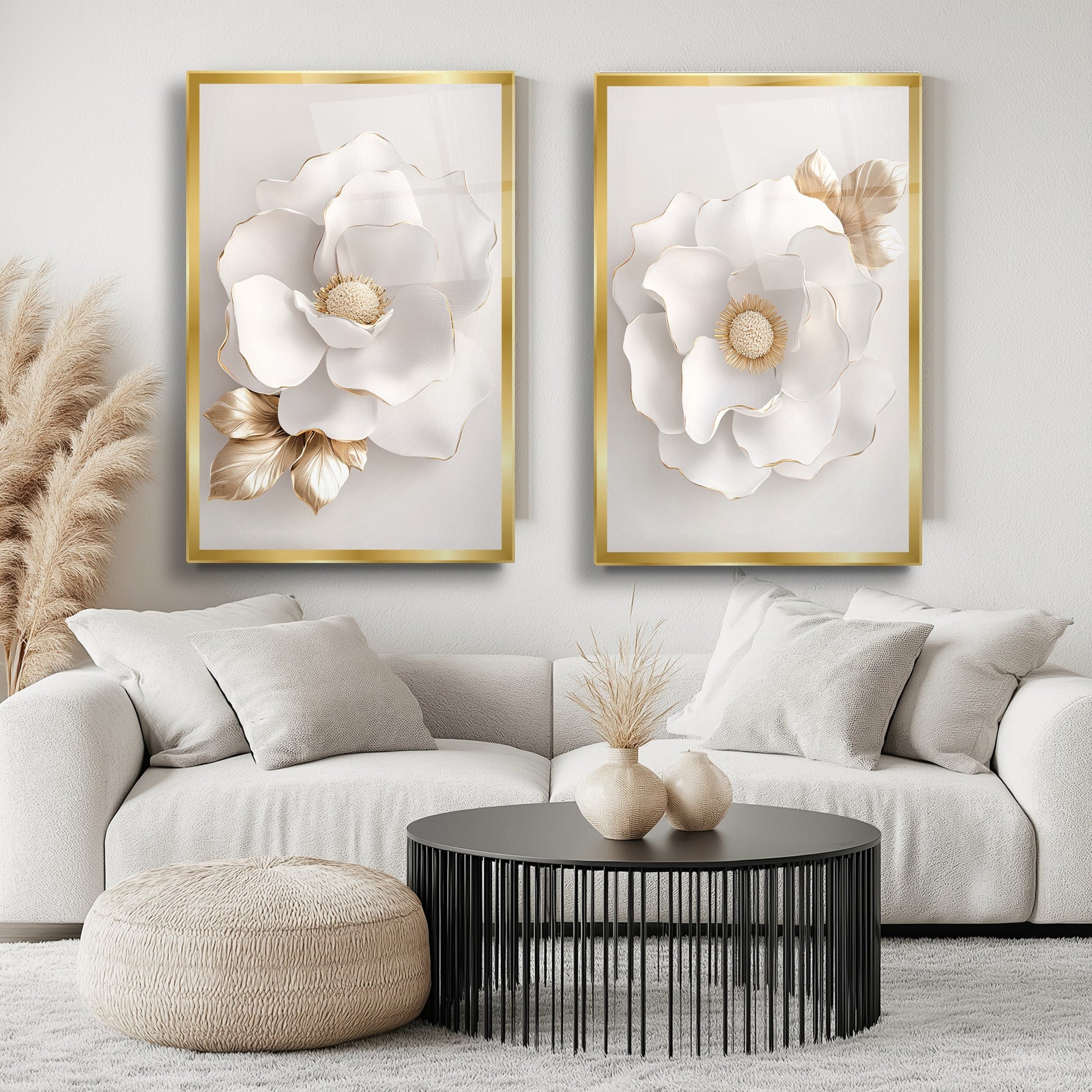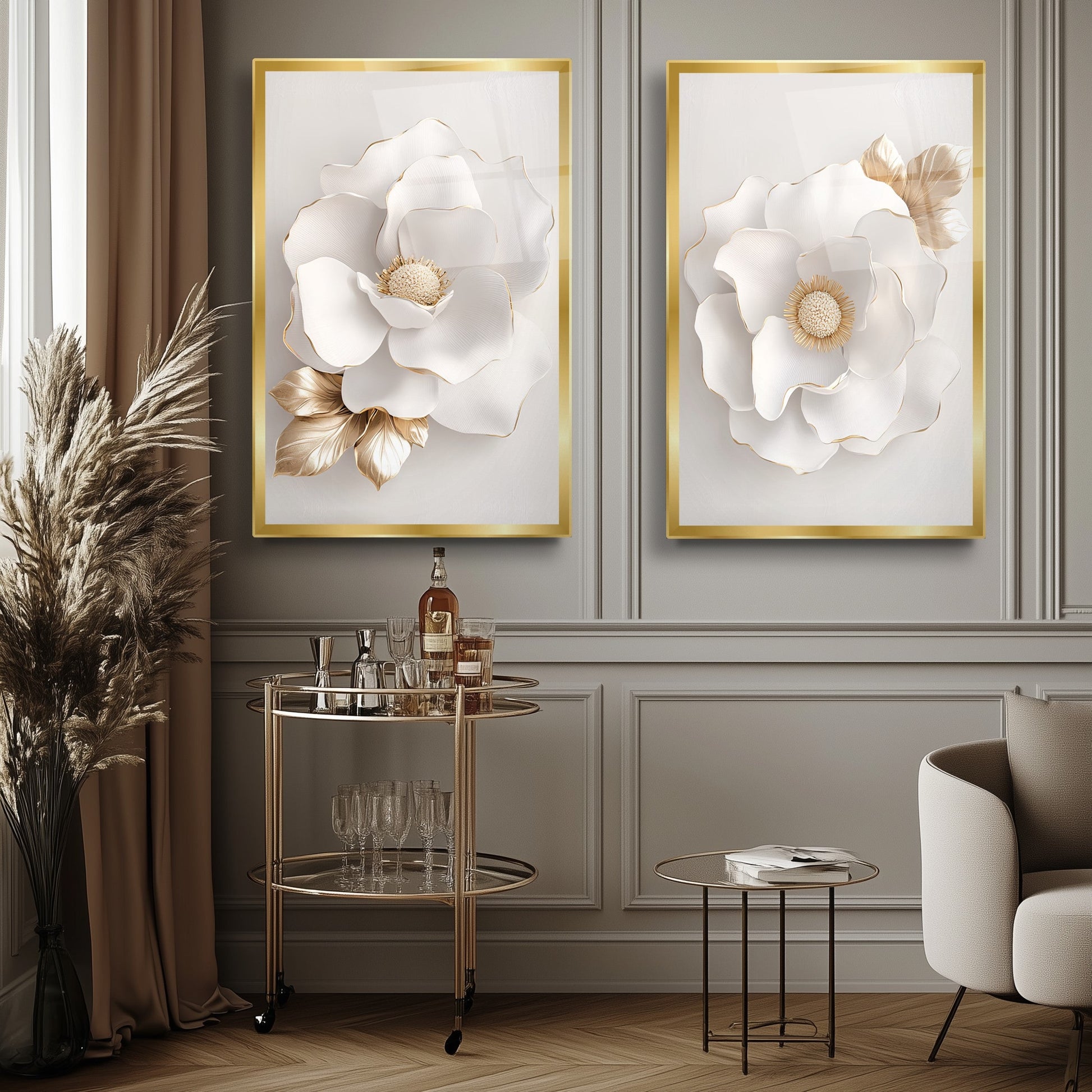 Gold Beyaz Çiçek İkili Set Cam Tablo