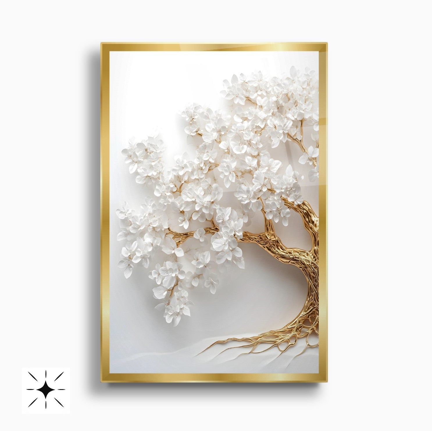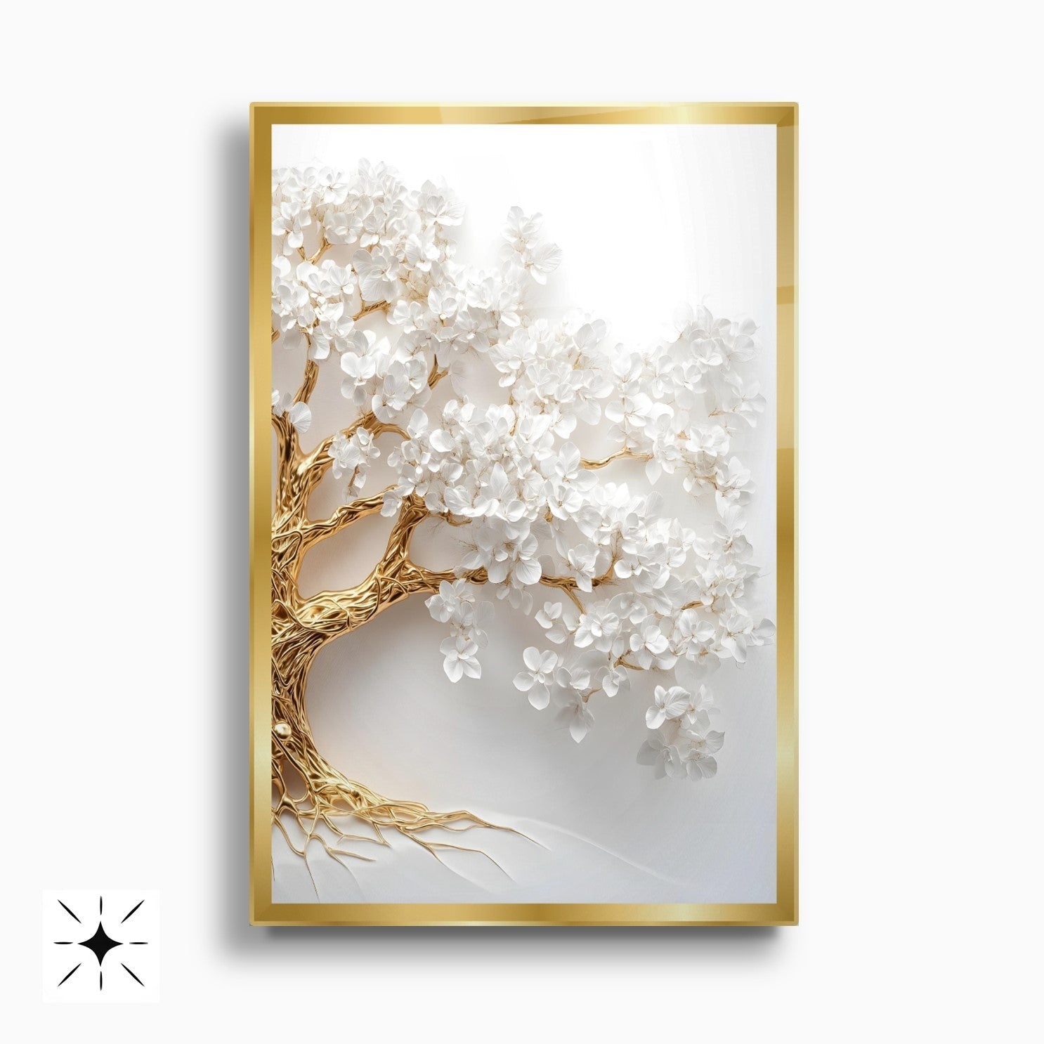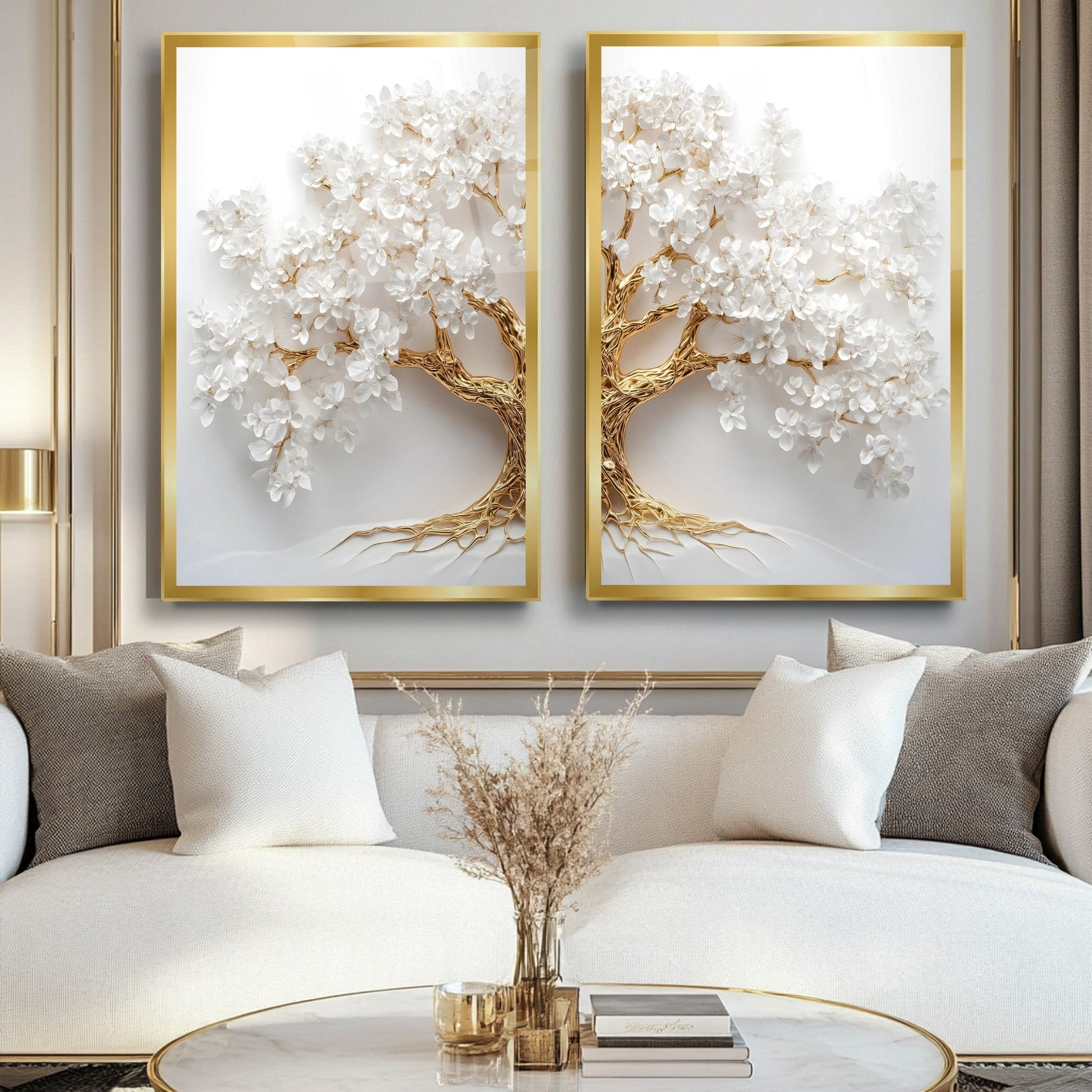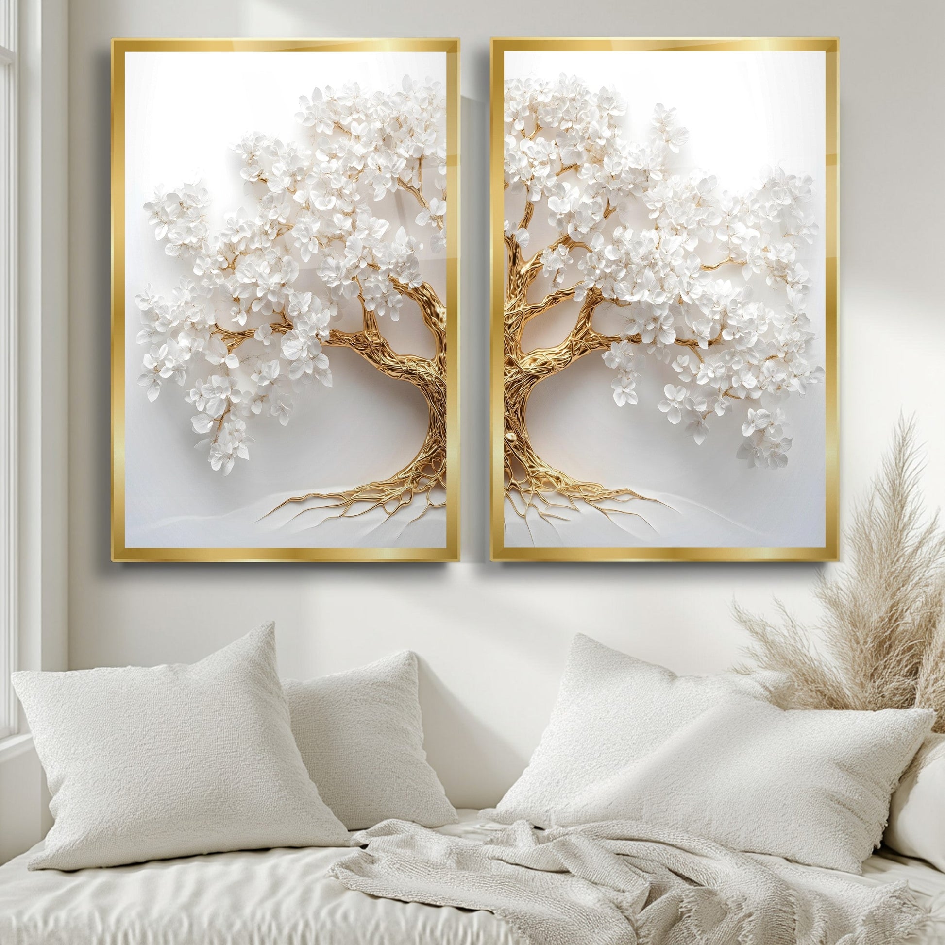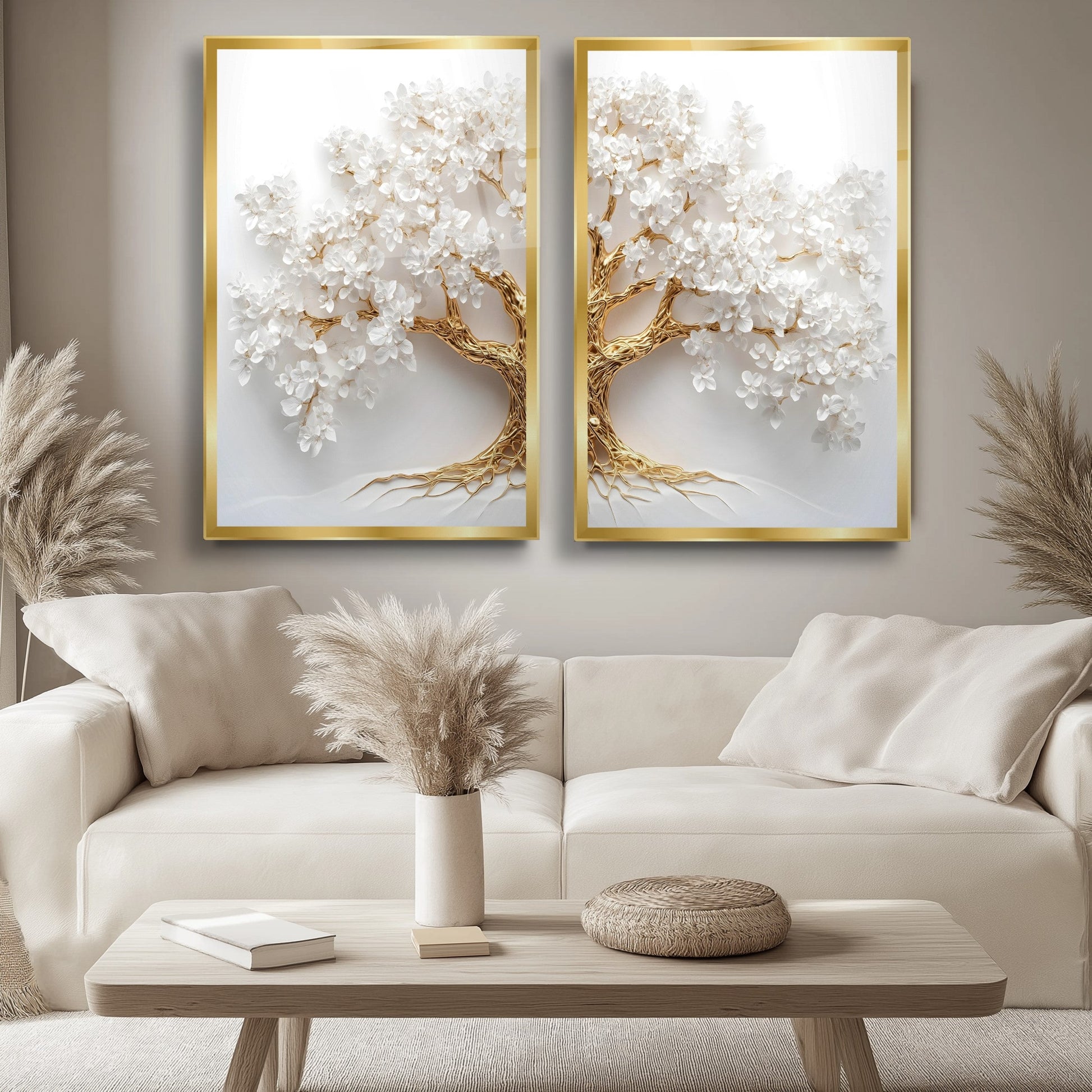 Gold Beyaz Hayat Ağacı İkili Set Cam Tablo