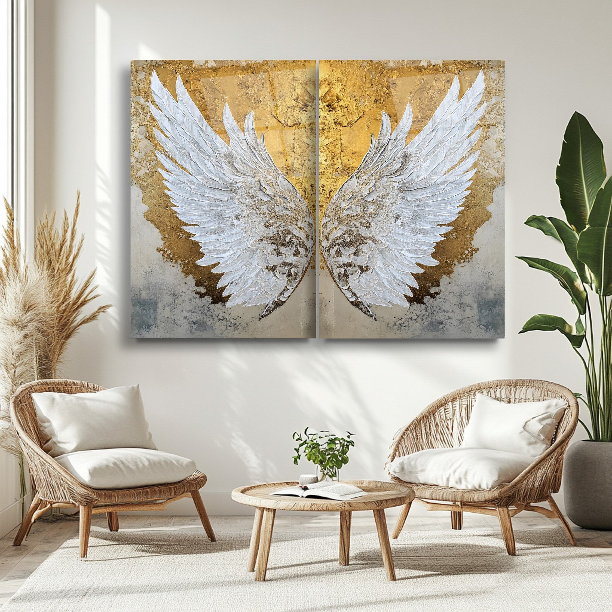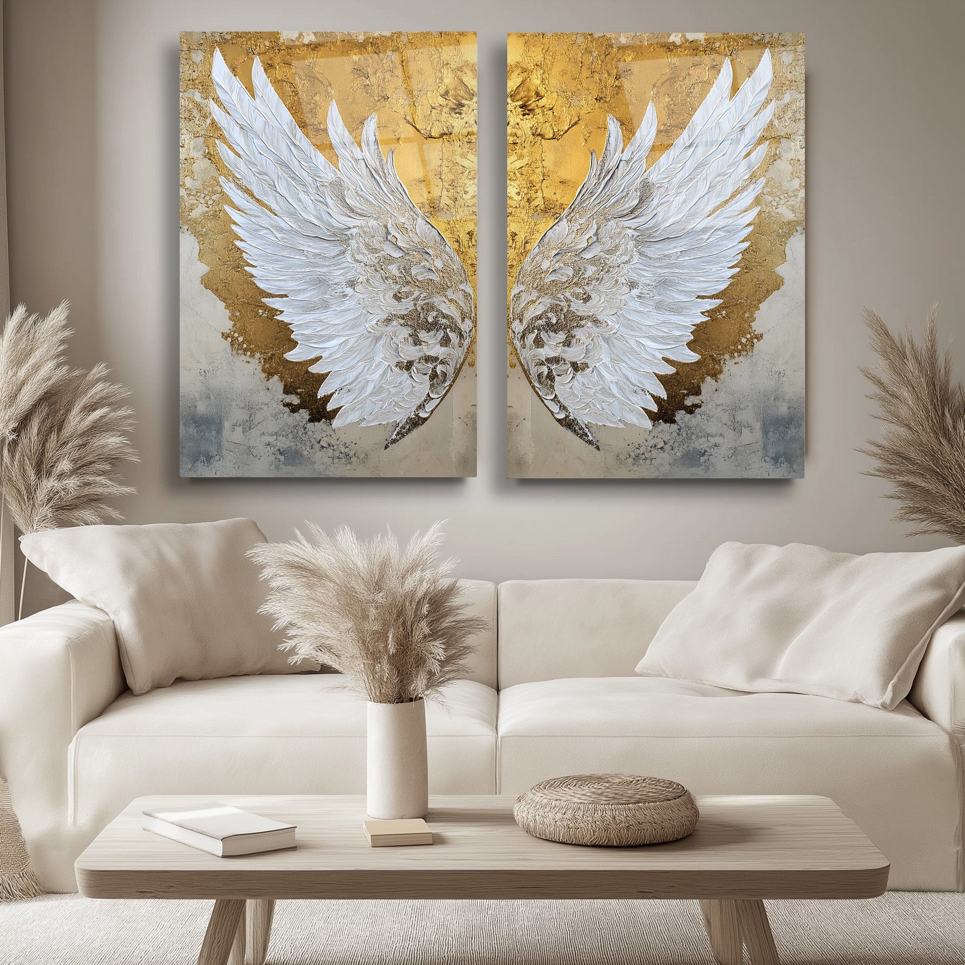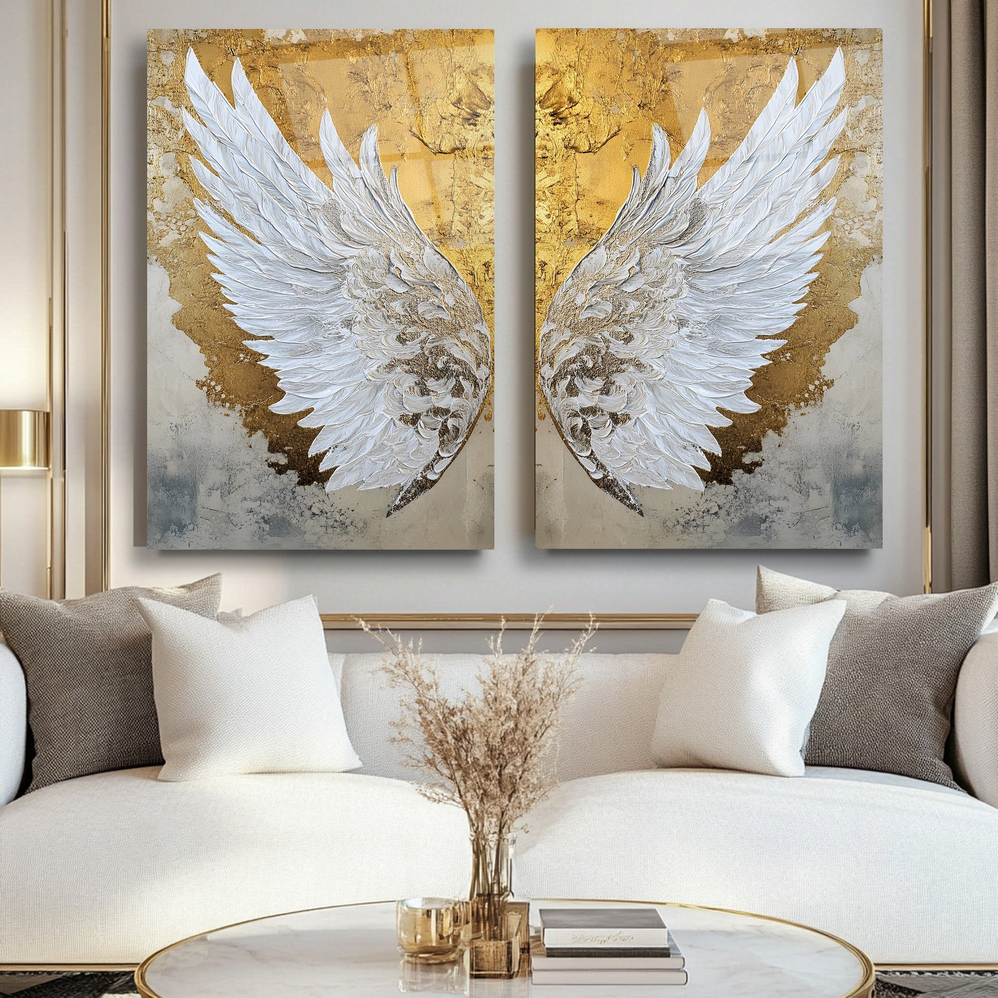 Gold Beyaz Melek Kanatları İkili Set Cam Tablo