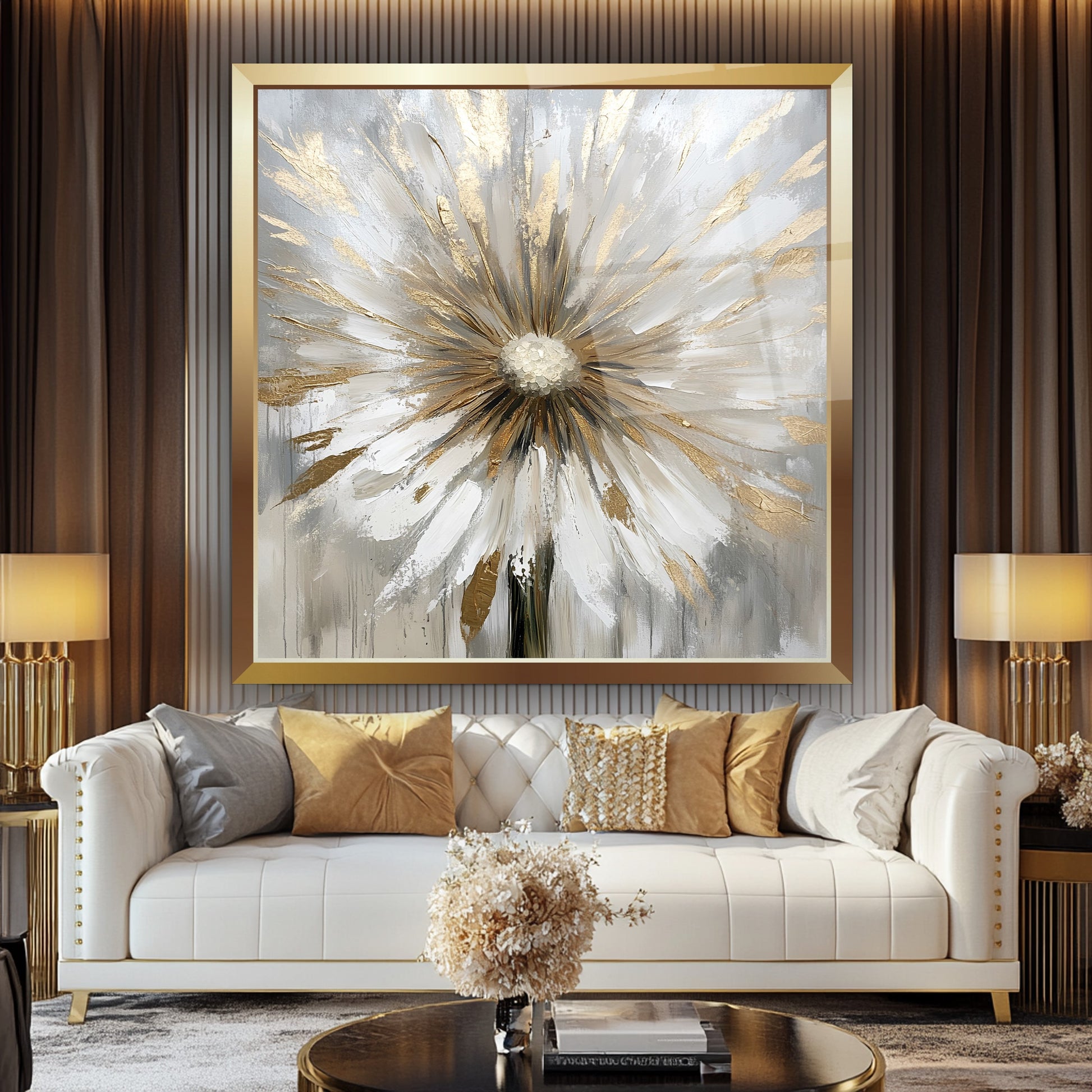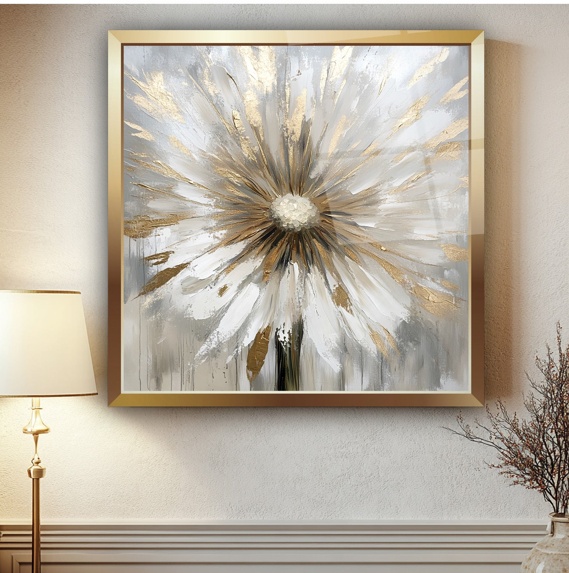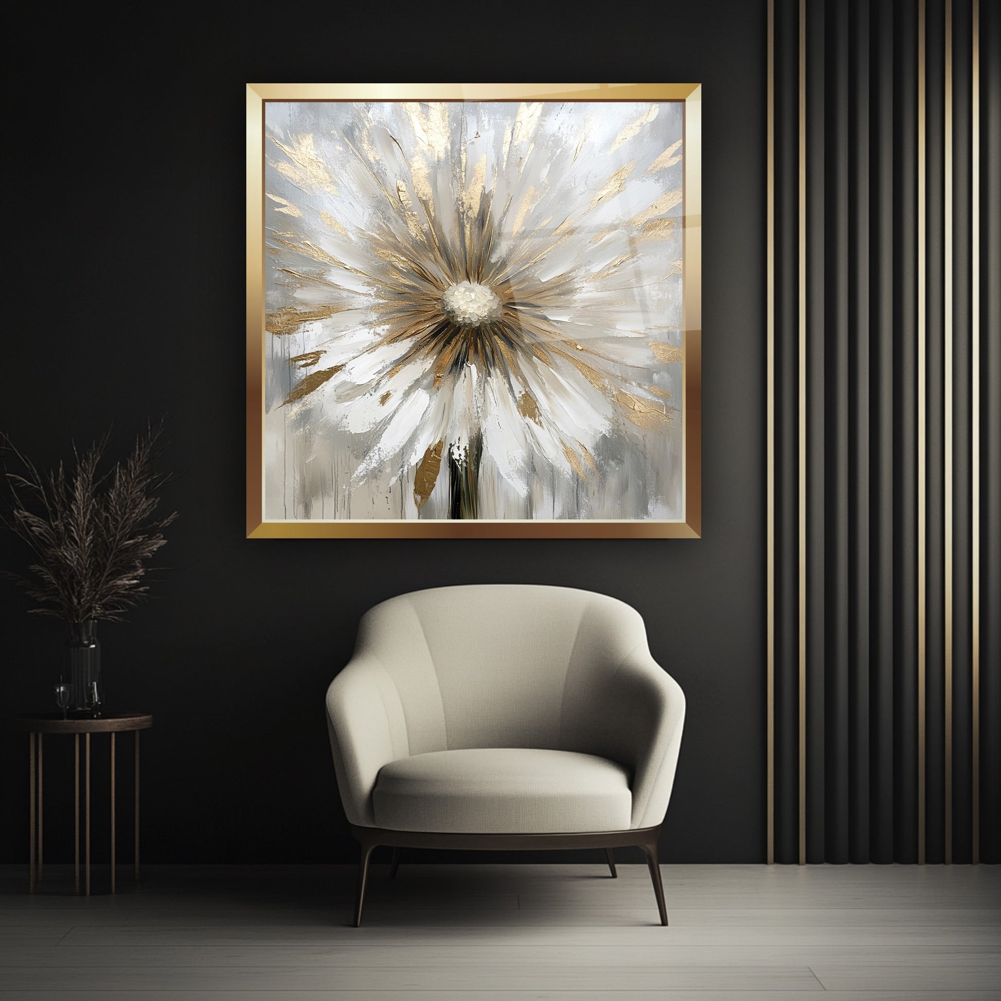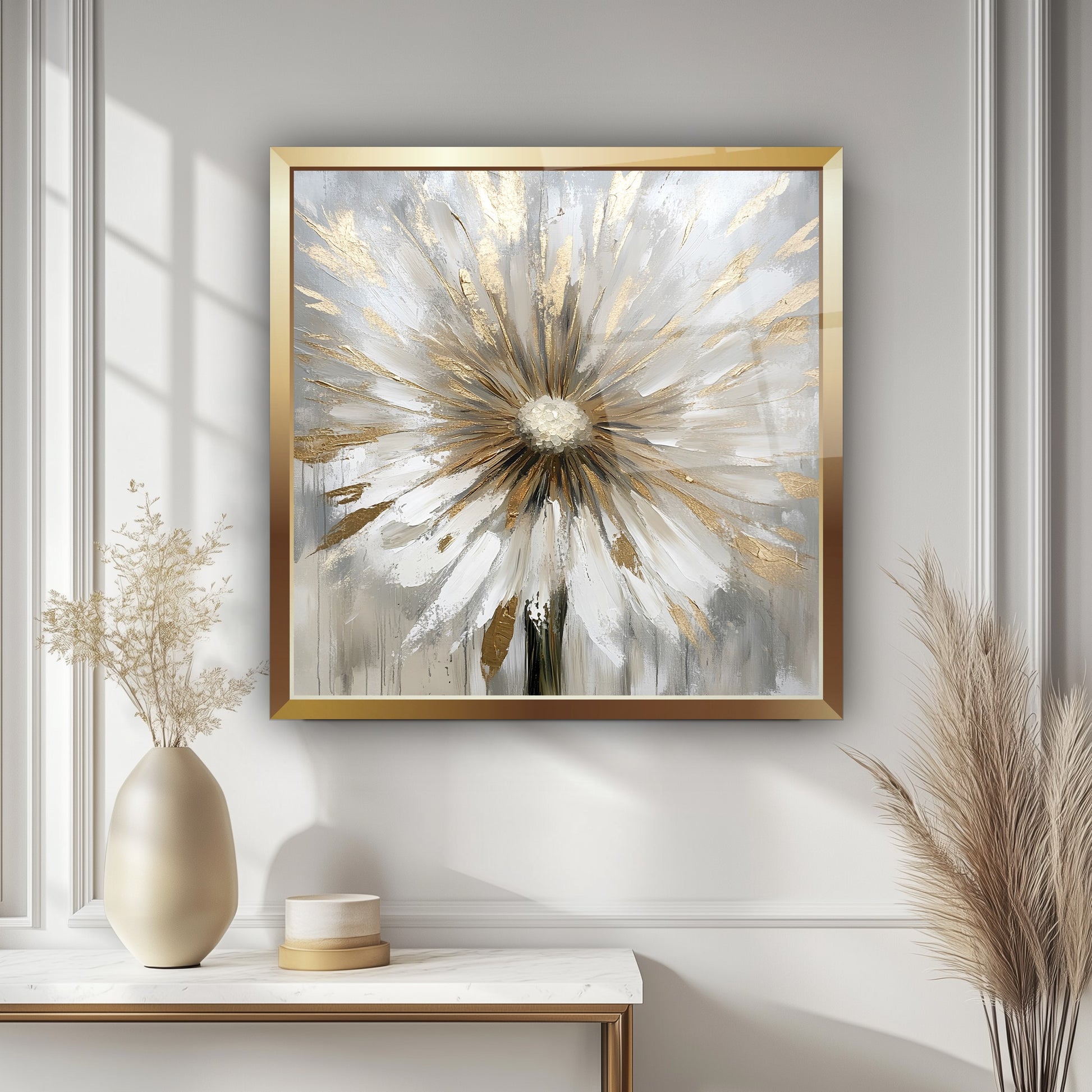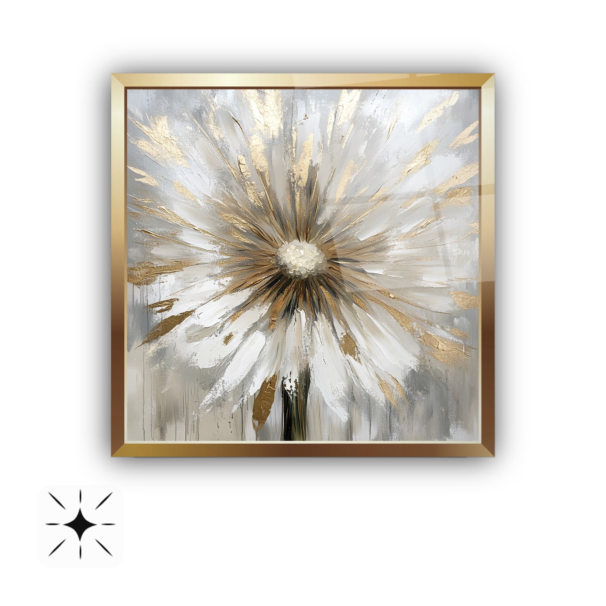 Gold çerçeveyle tamamlanan gri zemin üzerindeki rose ve beyaz detaylı karahindiba figürü, bu gerçek cam tabloya zarif ve modern bir hava kazandırır. Işıltılı tasarımıyla şıklığı öne çıkaran kırılmaz cam tablo, hem estetik hem dayanıklı bir dekorasyon seçeneğidir. Doğal güzellik ve sofistike stil arayanlar için etkileyici bir cam tablo tercihidir.