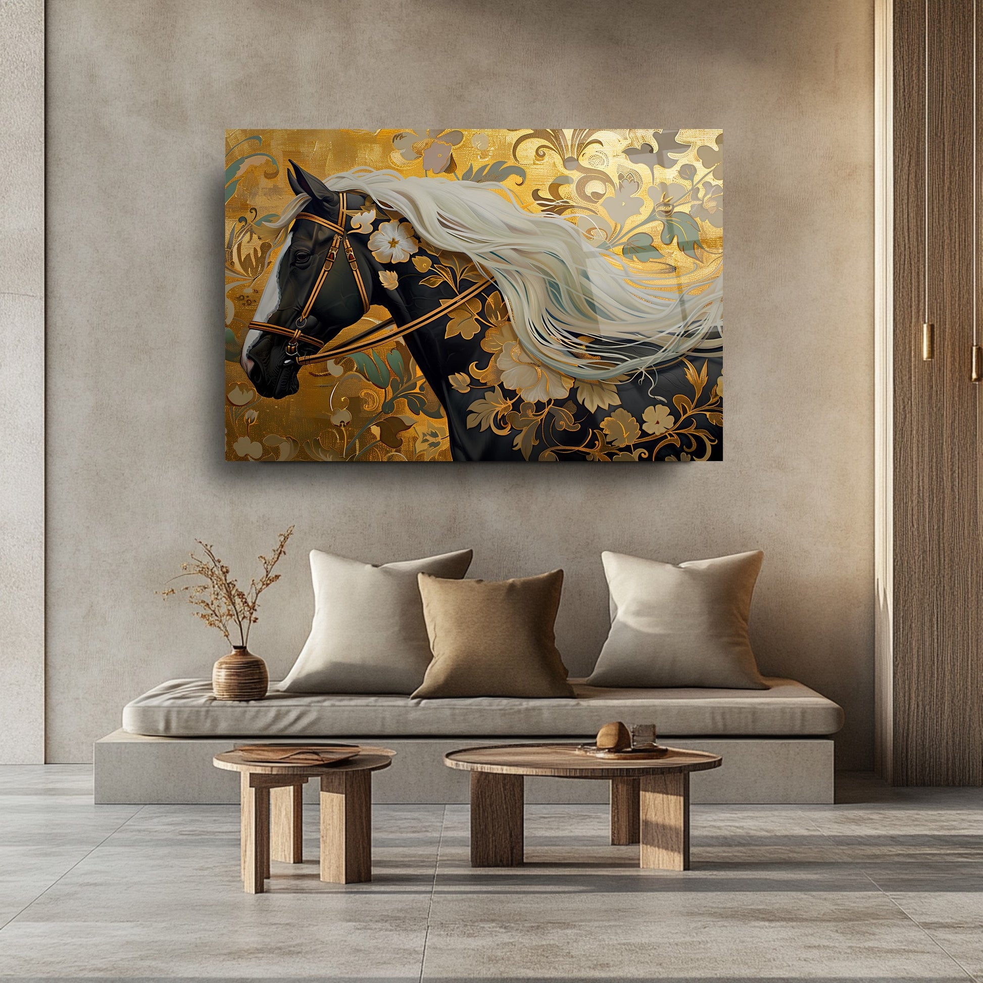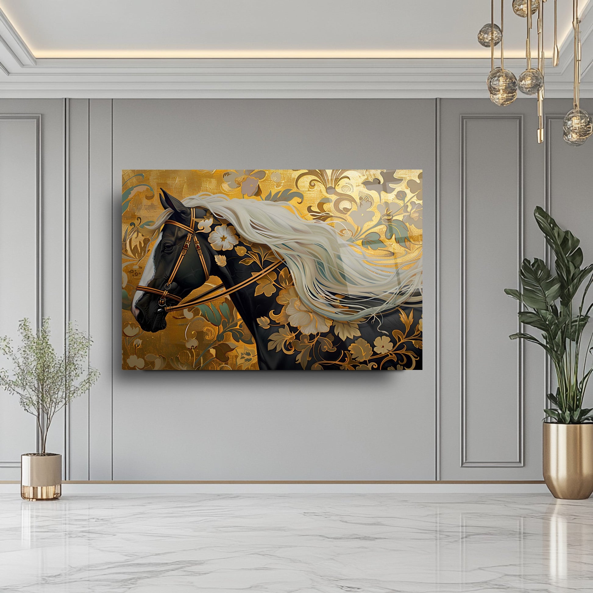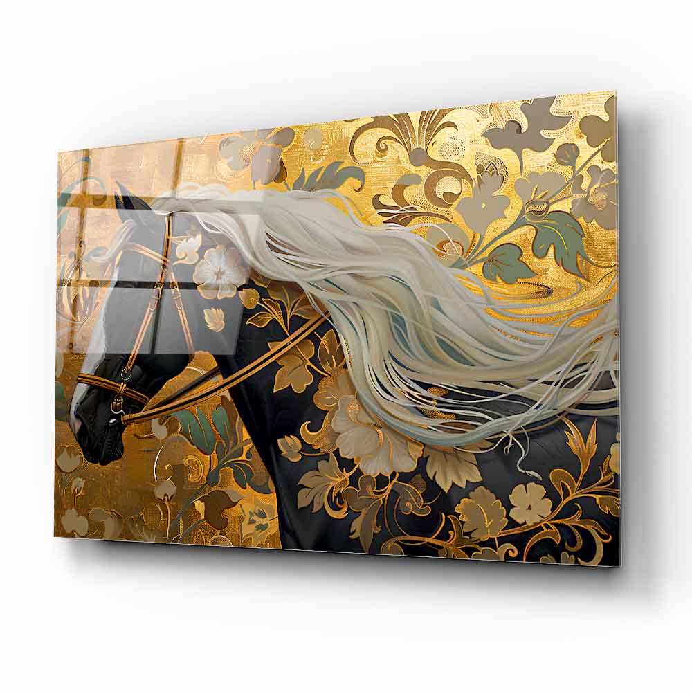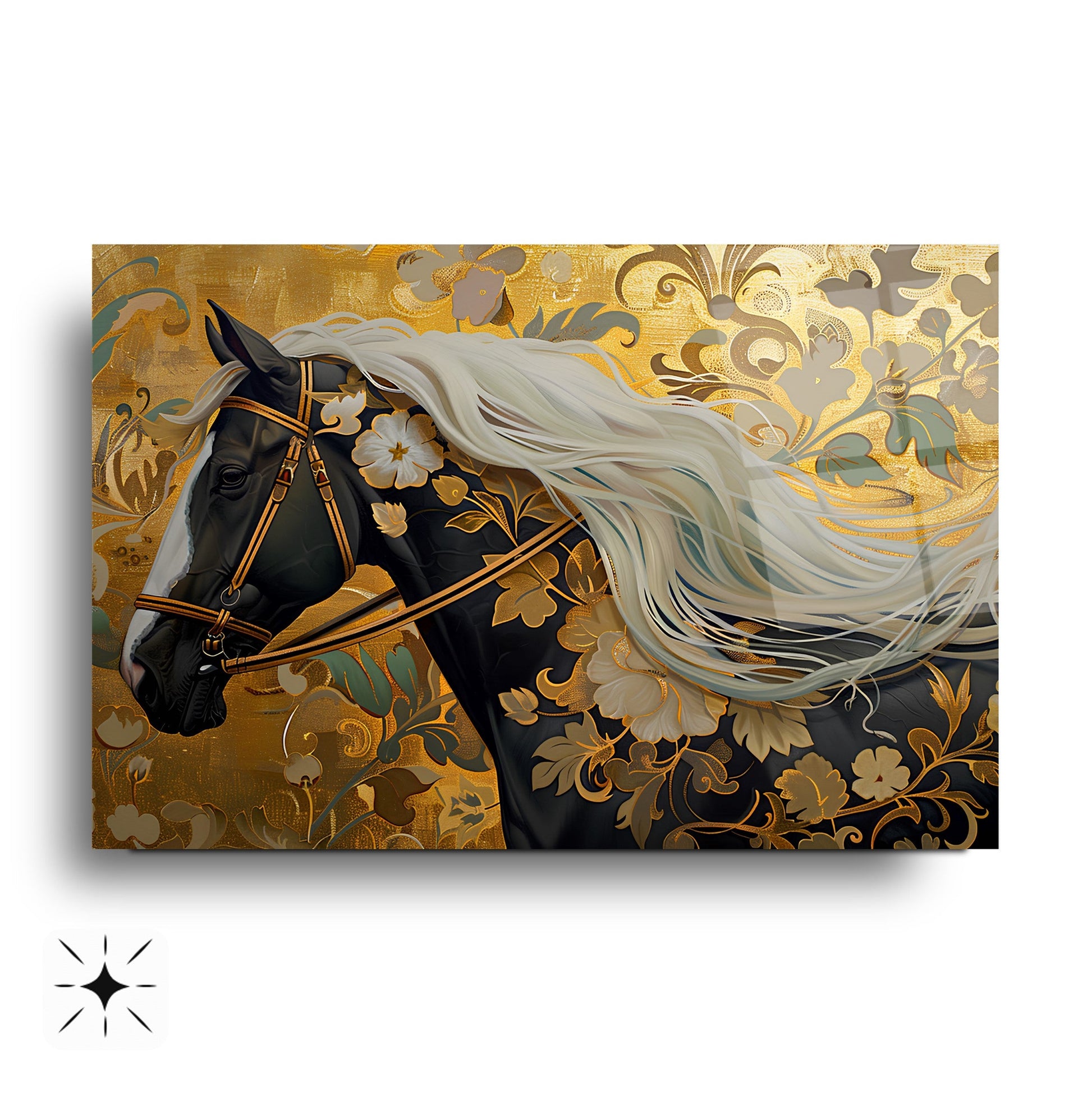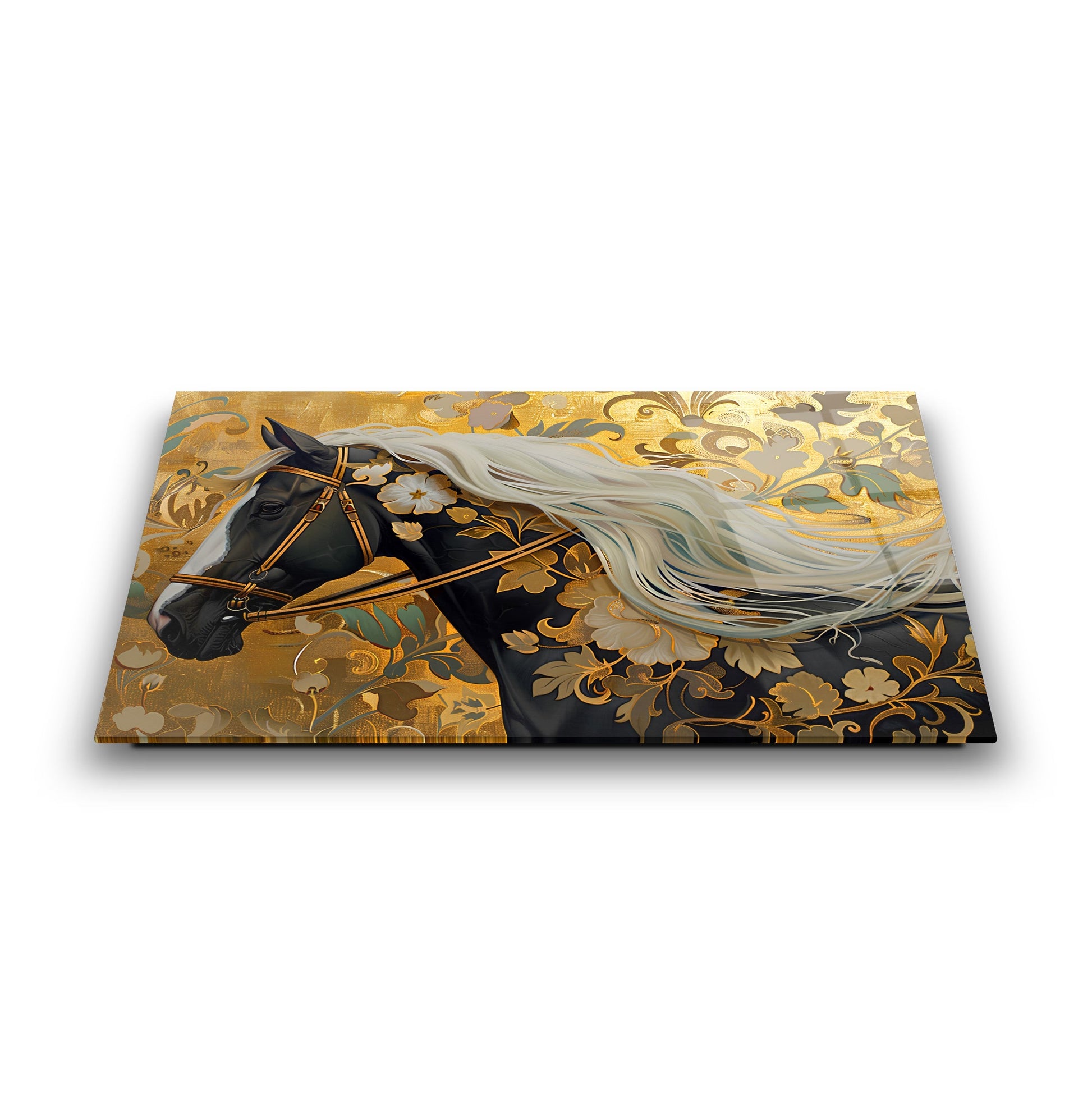 Bu modern cam tablo, siyah zemin üzerinde öne çıkan altın detaylı siyah bir at figürünü barındırıyor. Ardında gold çiçeklerle çevrili olan at, hem zarafet hem de güç temalarını bir arada sunuyor. Kabartmalı 3D dokular, tabloya derinlik katarken güçlü ve sanatsal bir atmosfer yaratıyor. UV baskı sayesinde gold çiçekler ve at silueti uzun süre solmadan canlılığını korur. Temperli cam yüzeyi ile hem dayanıklılık hem güvenlik sağlanır. Çerçevesiz, kolay montajlı minimal yapısıyla salon, ofis veya giriş alanlarında lüks ve dikkat çekici bir duvar dekoru isteyenler için mükemmel bir tercih.