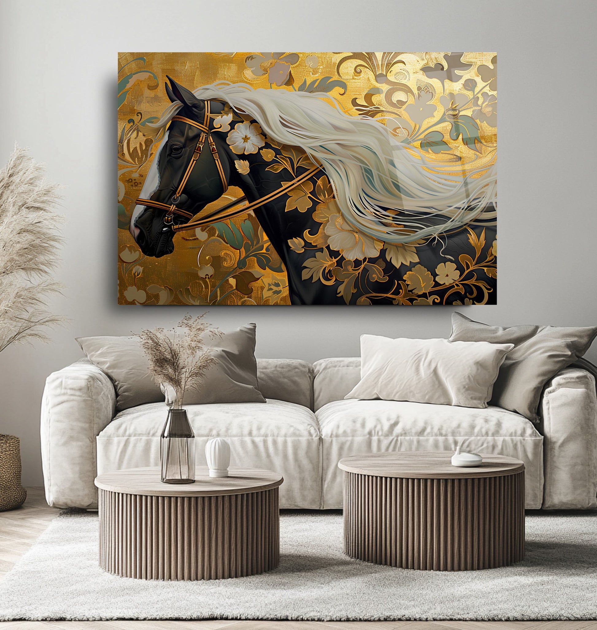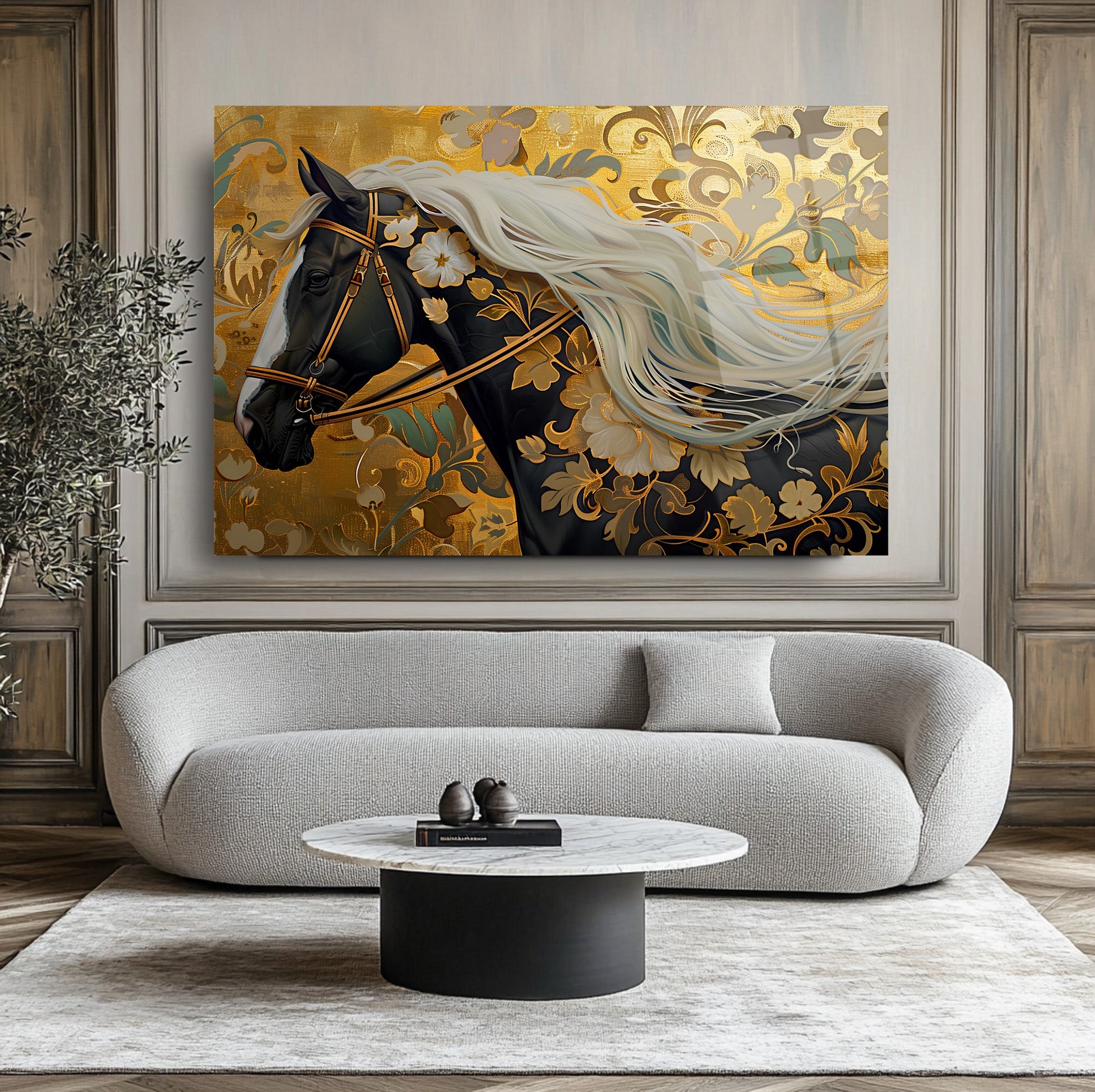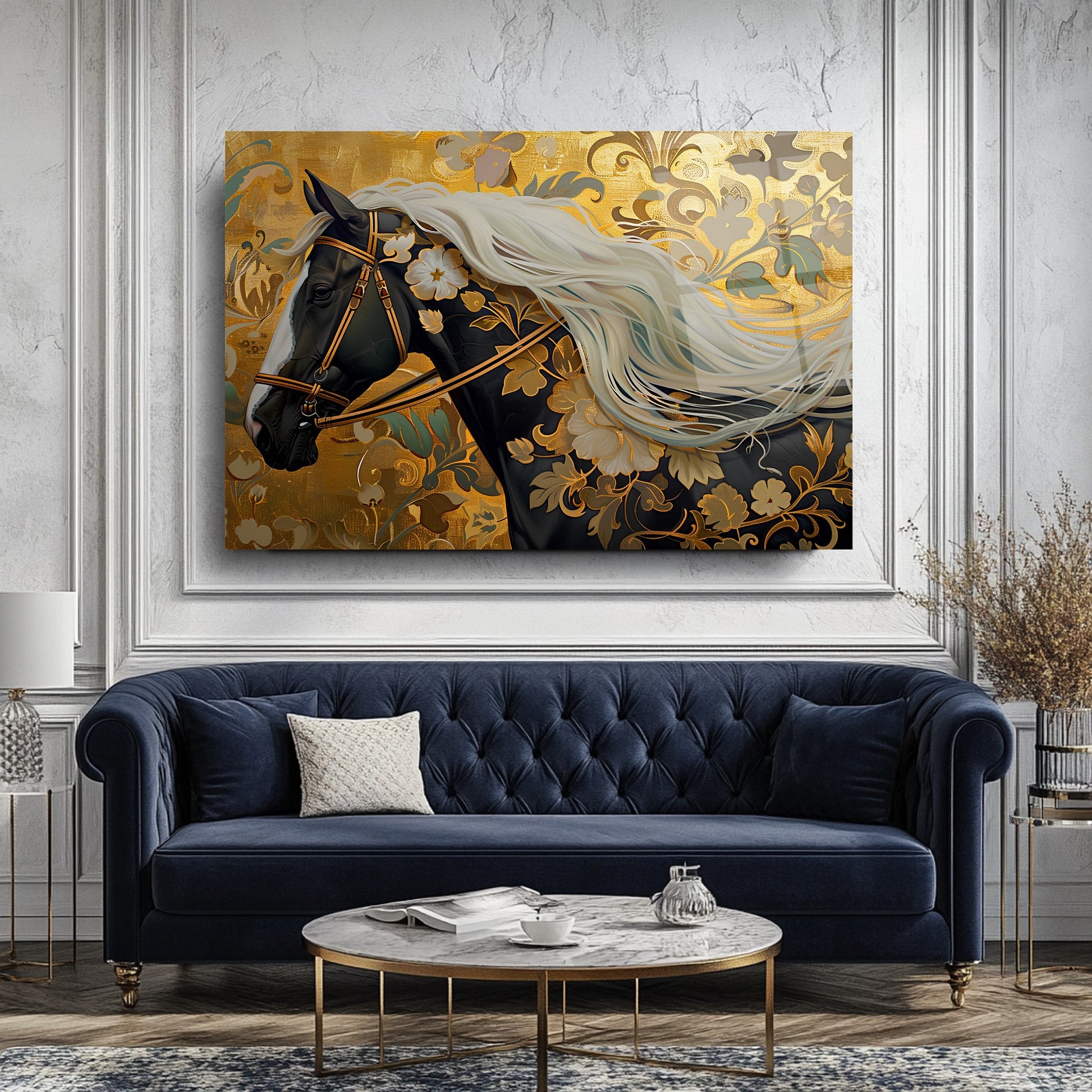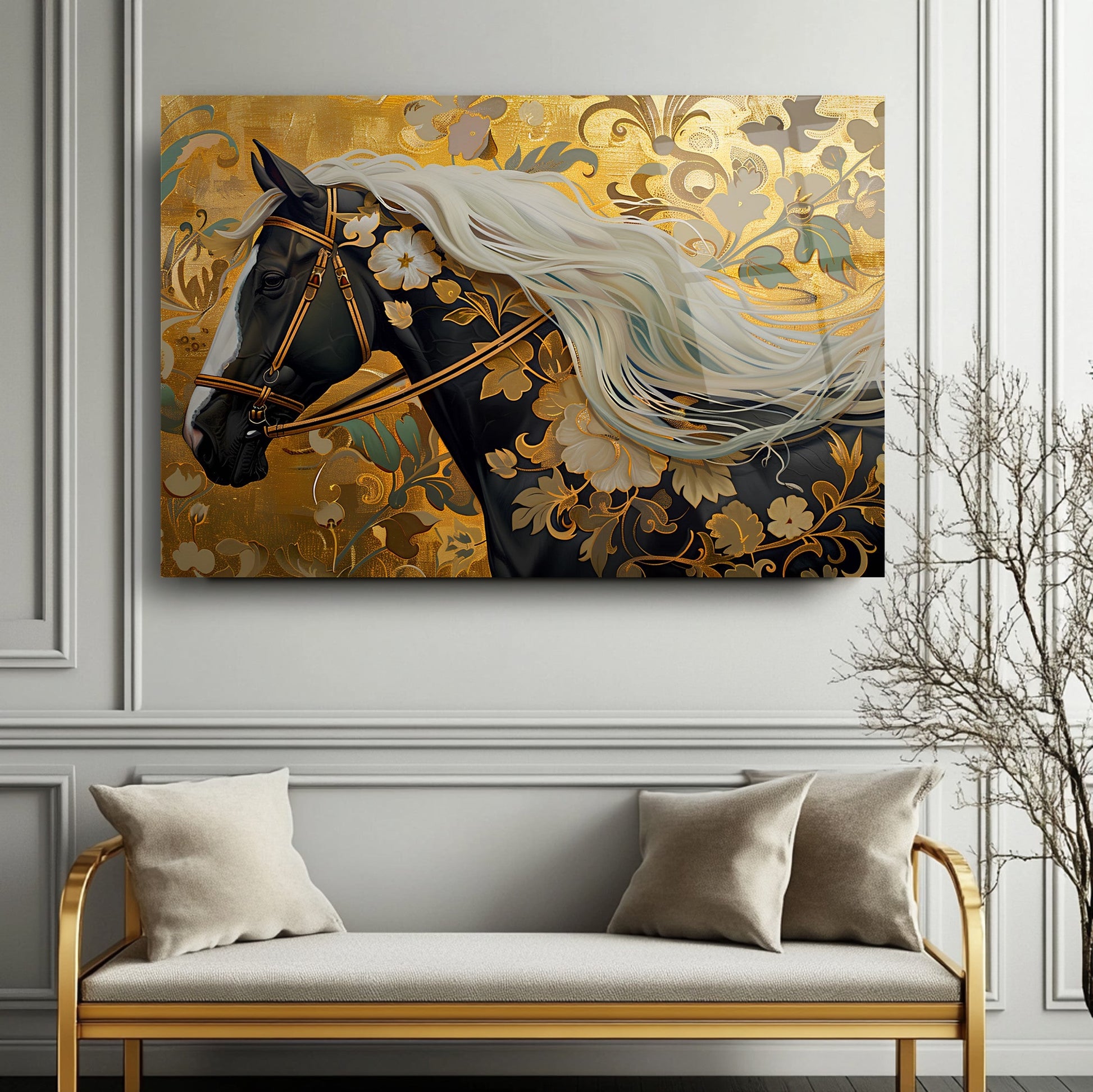 Bu modern cam tablo, siyah zemin üzerinde öne çıkan altın detaylı siyah bir at figürünü barındırıyor. Ardında gold çiçeklerle çevrili olan at, hem zarafet hem de güç temalarını bir arada sunuyor. Kabartmalı 3D dokular, tabloya derinlik katarken güçlü ve sanatsal bir atmosfer yaratıyor. UV baskı sayesinde gold çiçekler ve at silueti uzun süre solmadan canlılığını korur. Temperli cam yüzeyi ile hem dayanıklılık hem güvenlik sağlanır. Çerçevesiz, kolay montajlı minimal yapısıyla salon, ofis veya giriş alanlarında lüks ve dikkat çekici bir duvar dekoru isteyenler için mükemmel bir tercih.