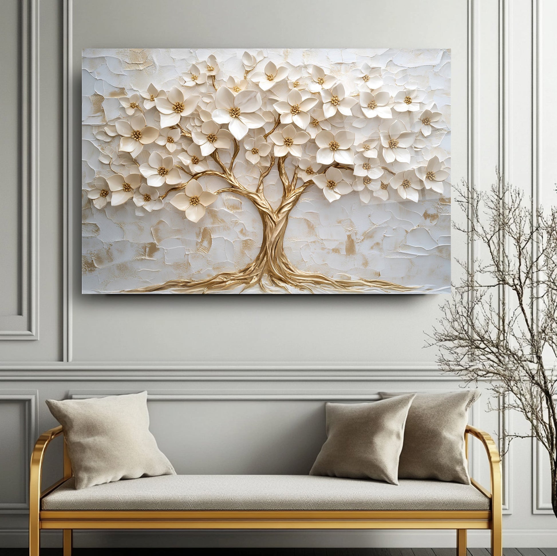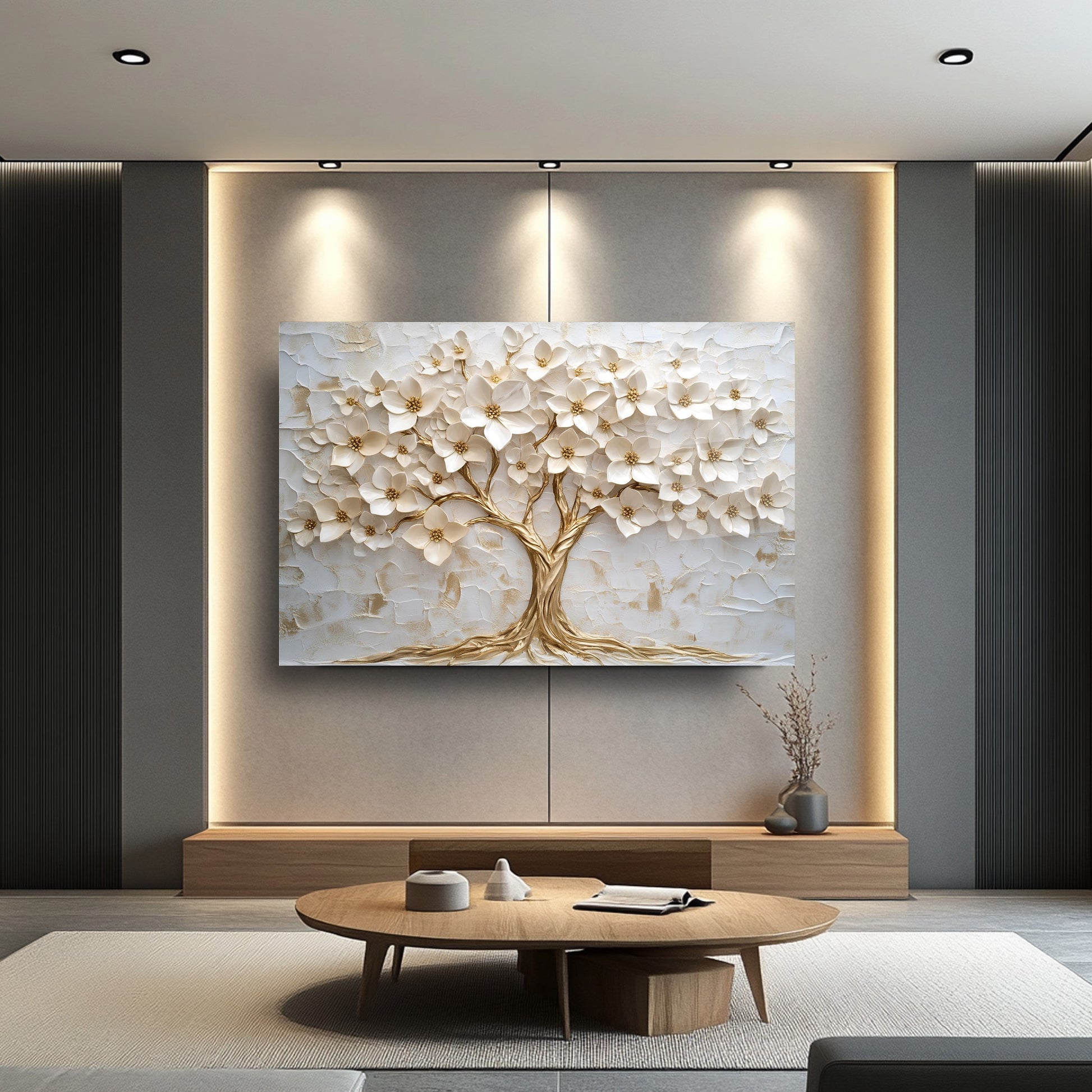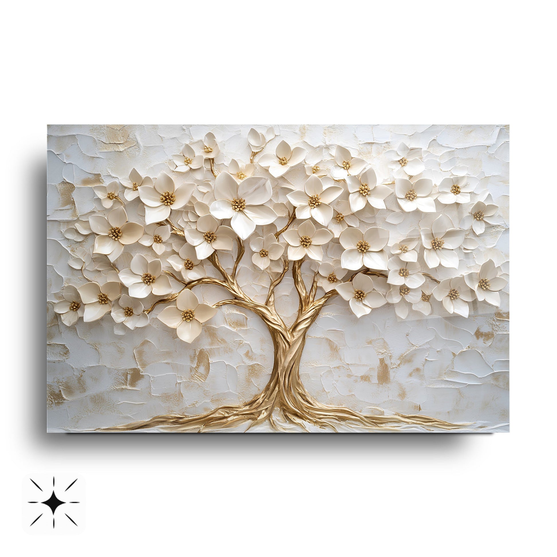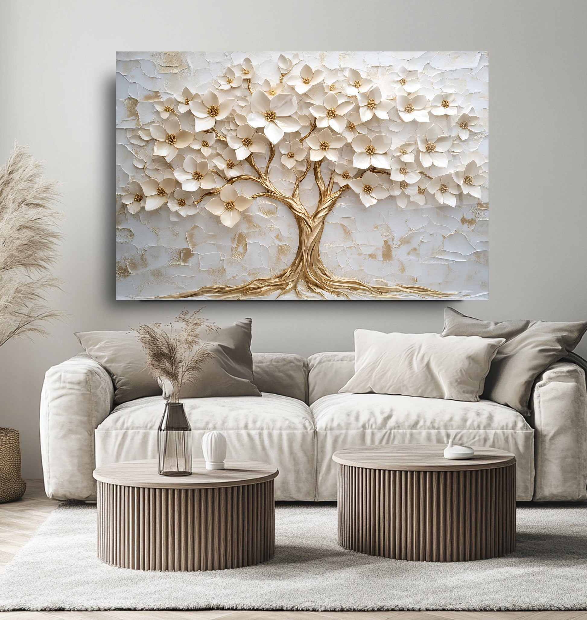 Bu zarif 3D kabartmalı cam tablo, beyaz çiçeklerden oluşan hayat ağacını şık gold dallar ile buluşturuyor. Gold dokunuşlar mekânınıza lüks ve sofistike bir hava katarken, beyaz çiçekler ferah ve huzurlu bir atmosfer yaratıyor. Kabartmalı dokusu, esere derinlik katarak her açıdan dikkat çekici görünmesini sağlar.
