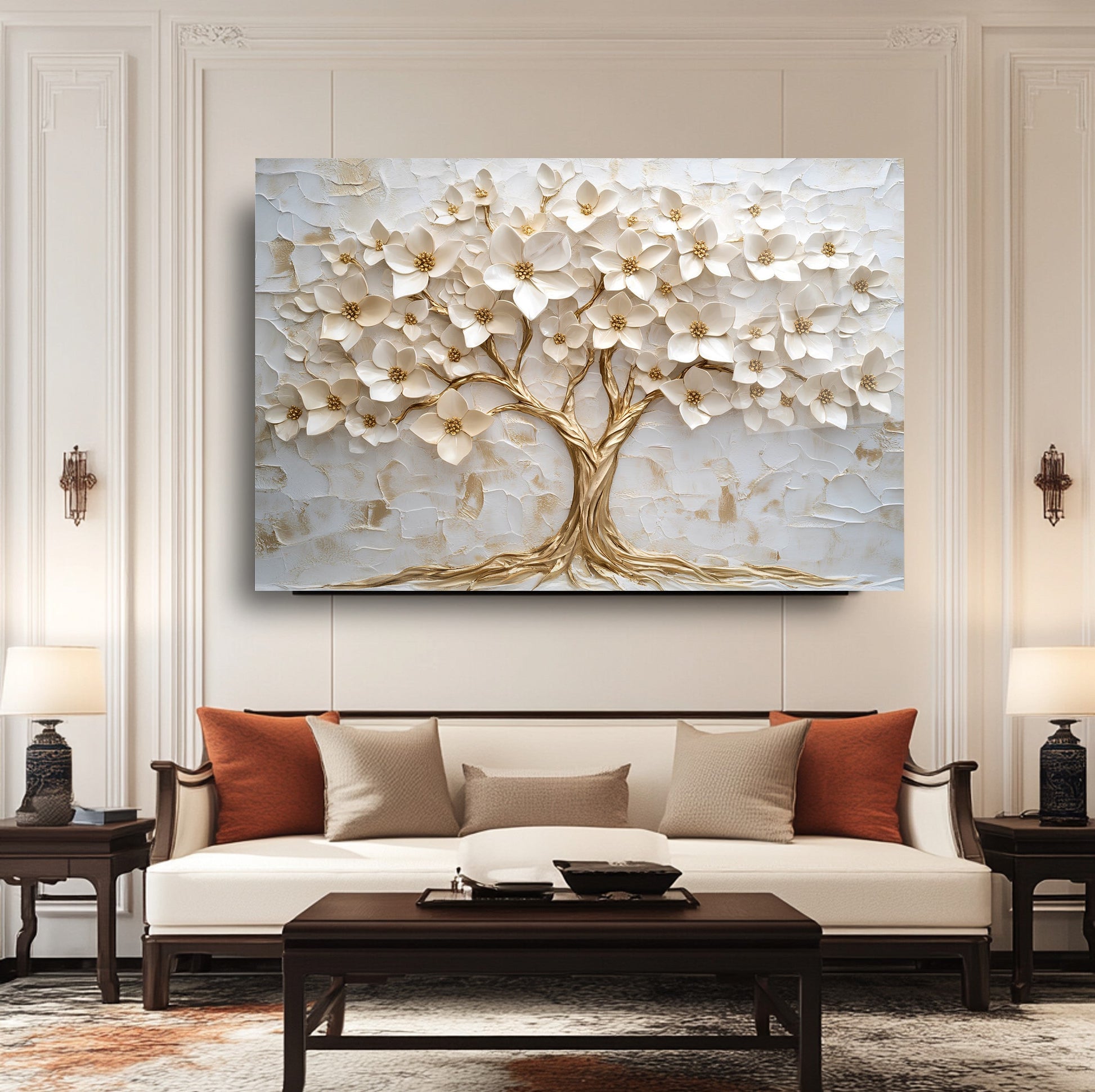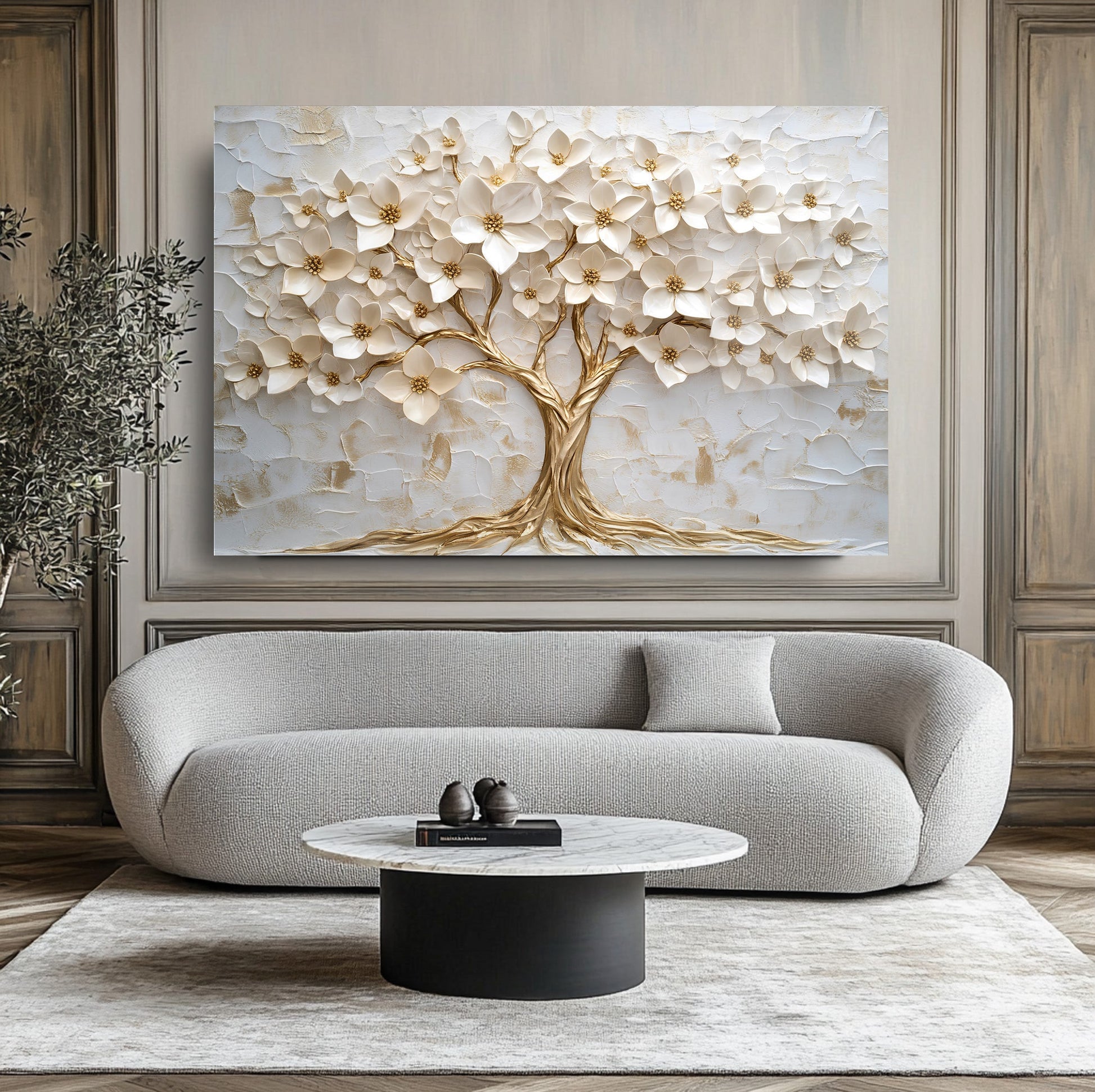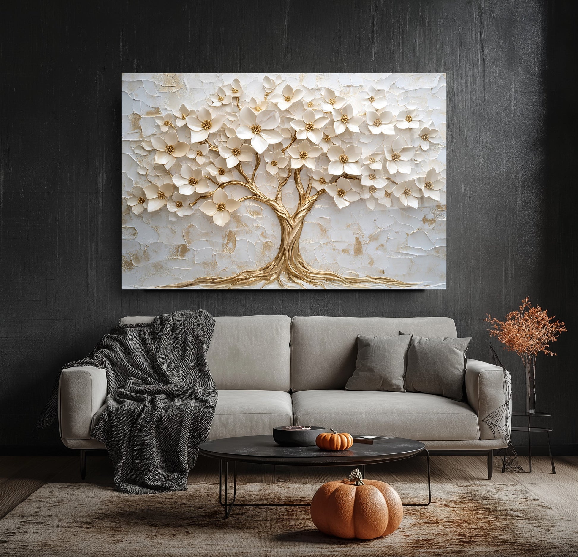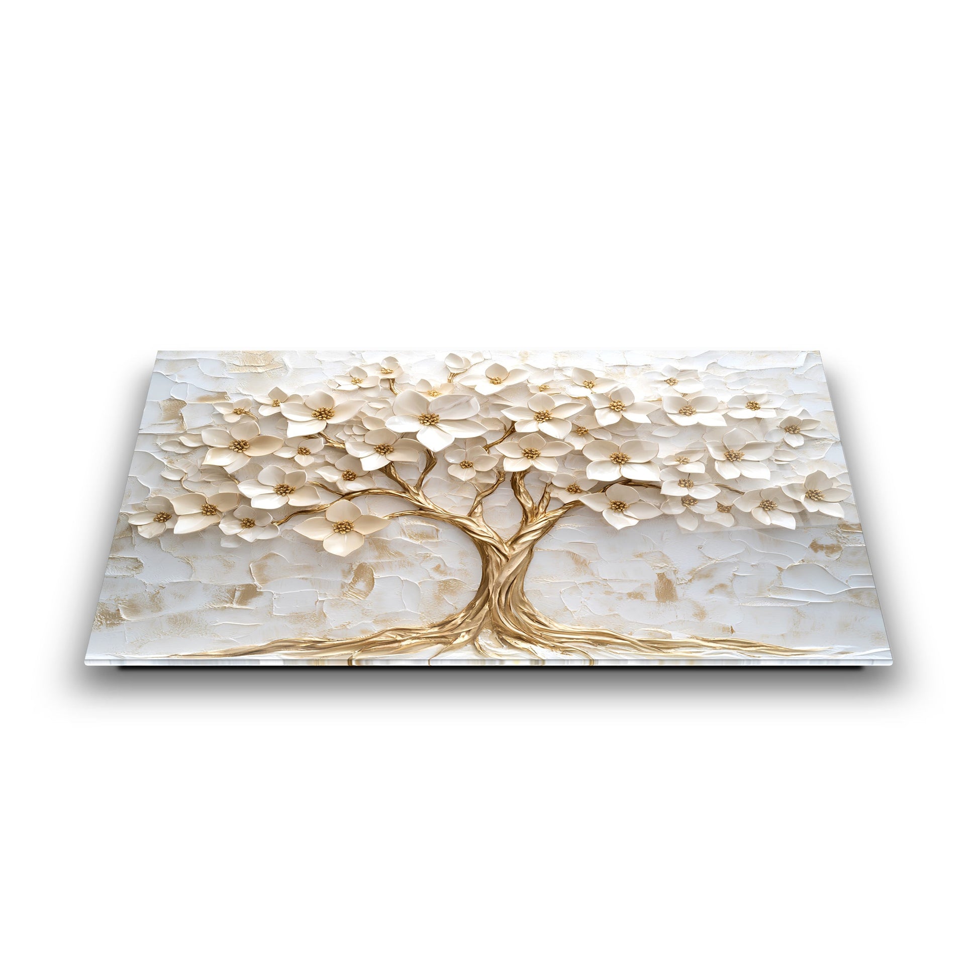 Bu zarif 3D kabartmalı cam tablo, beyaz çiçeklerden oluşan hayat ağacını şık gold dallar ile buluşturuyor. Gold dokunuşlar mekânınıza lüks ve sofistike bir hava katarken, beyaz çiçekler ferah ve huzurlu bir atmosfer yaratıyor. Kabartmalı dokusu, esere derinlik katarak her açıdan dikkat çekici görünmesini sağlar.