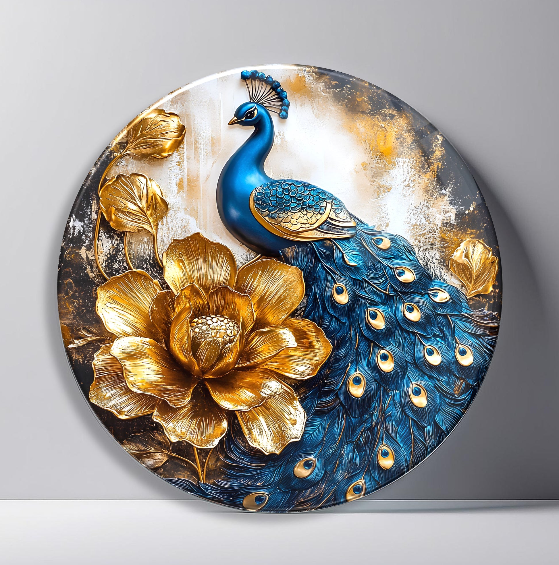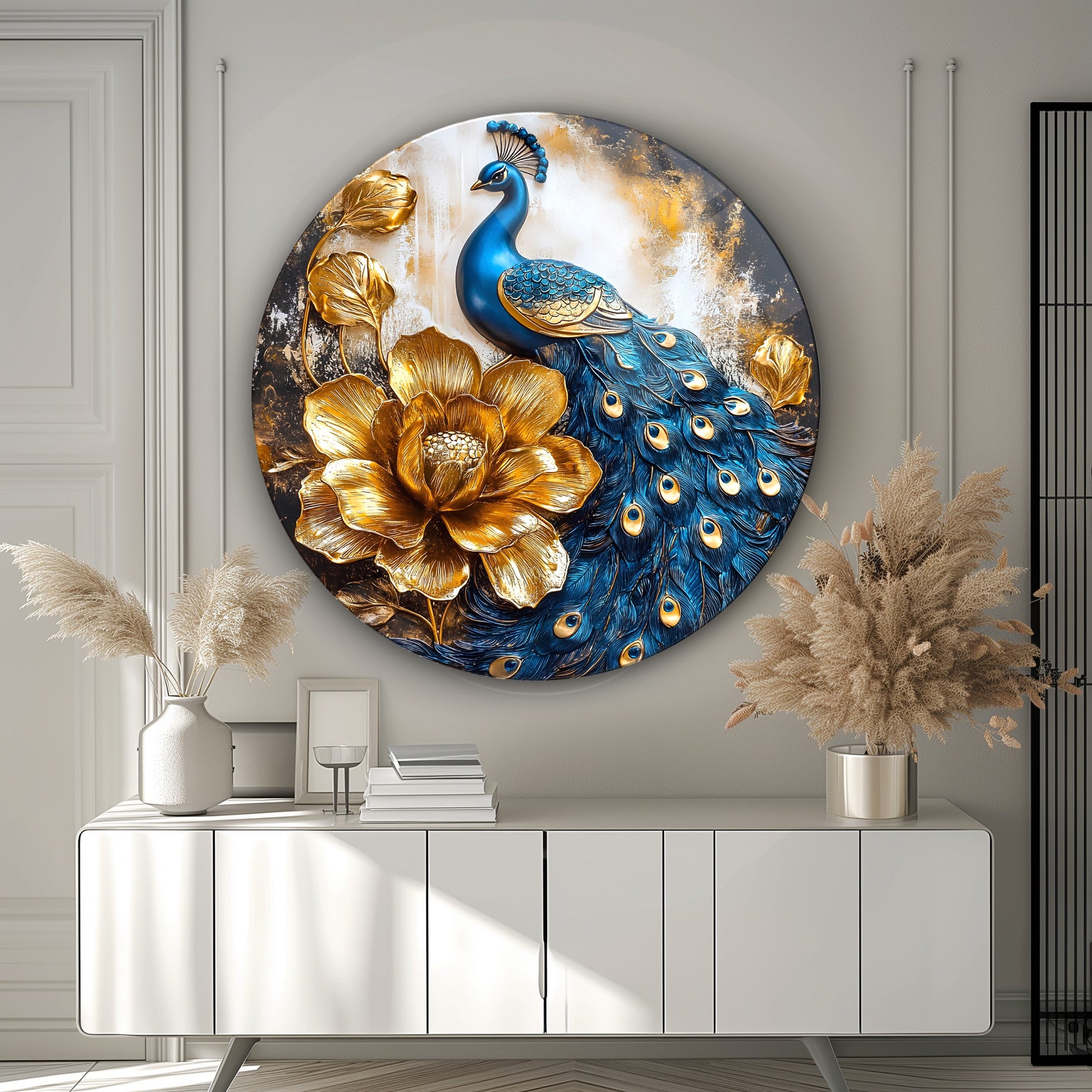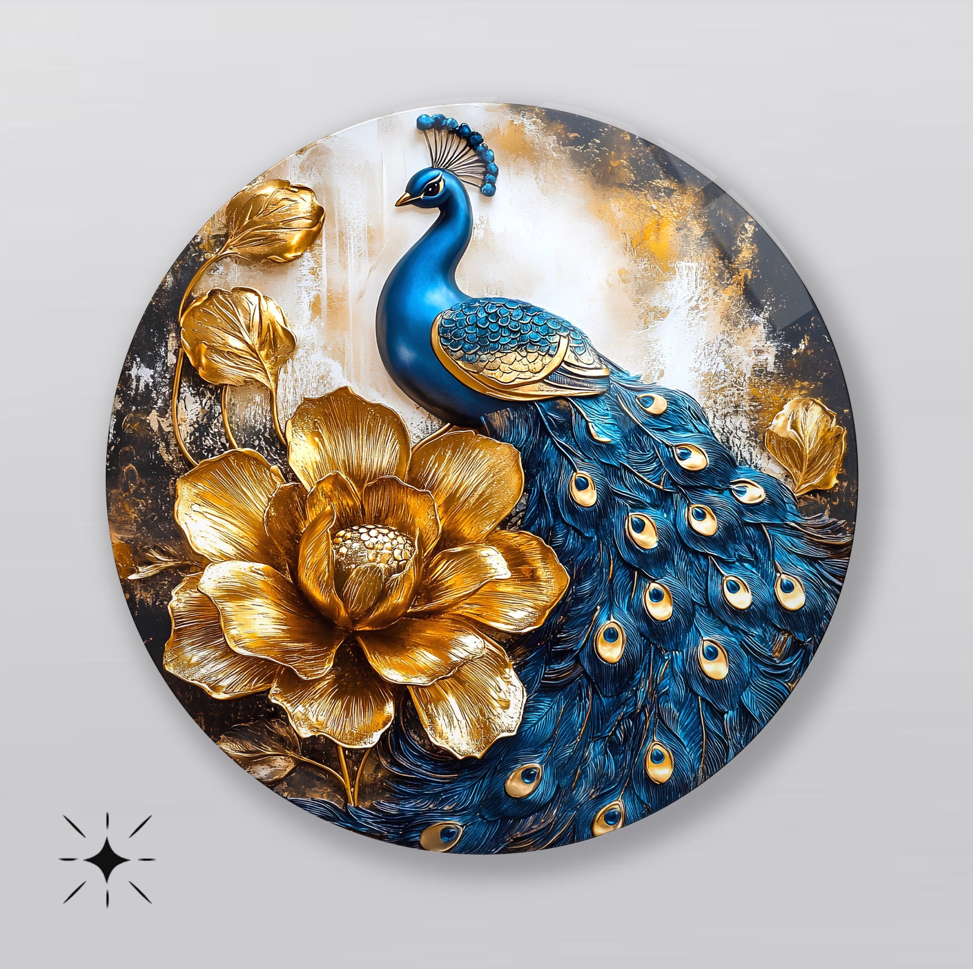 Çiçekli Mavi Tavus Kuşu Yuvarlak Cam Tablo