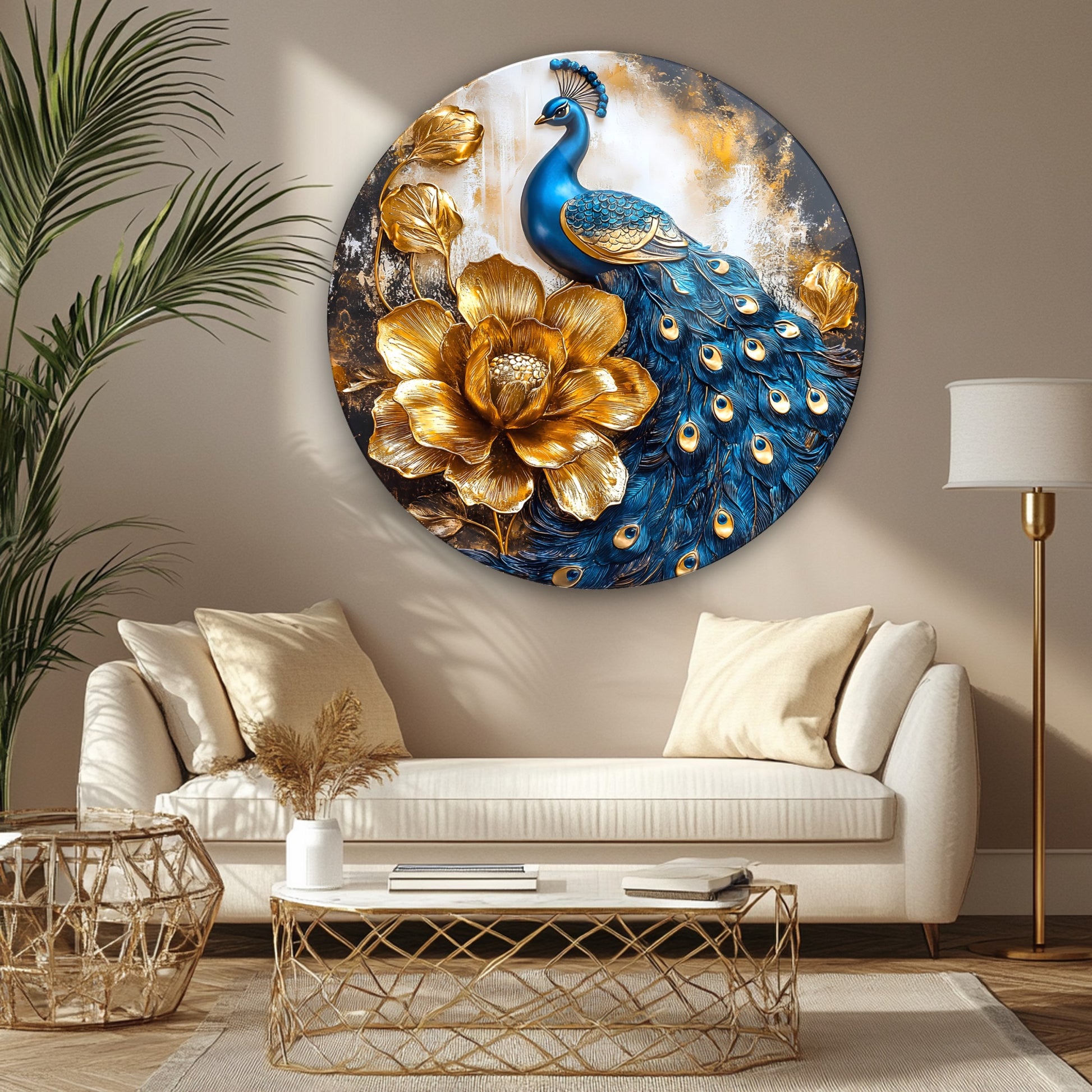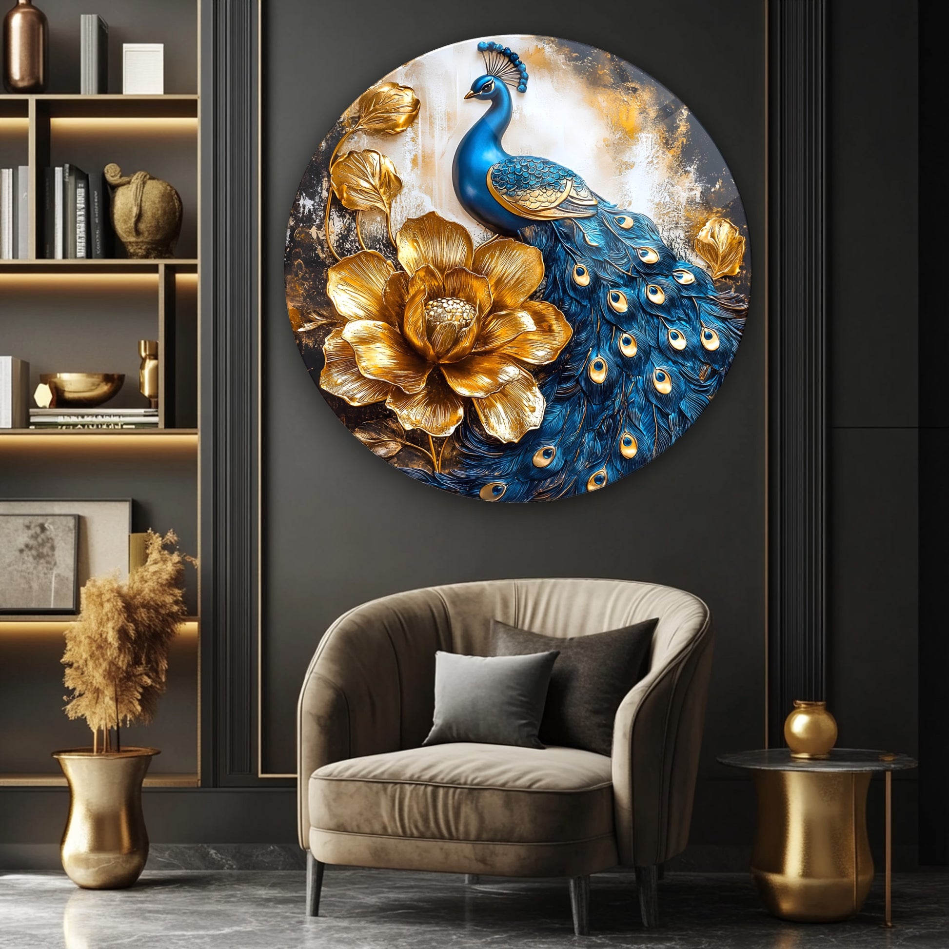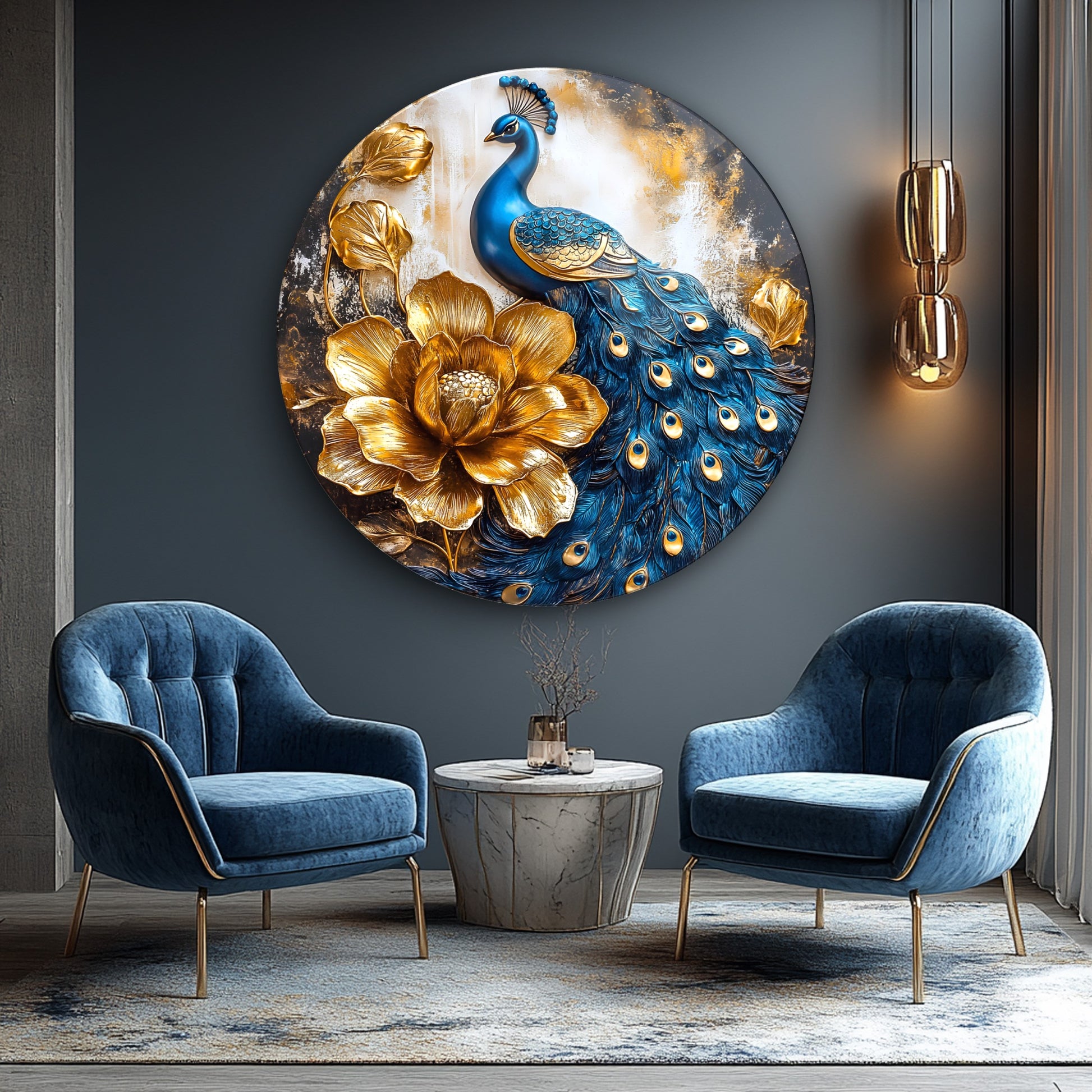 Çiçekli Mavi Tavus Kuşu Yuvarlak Cam Tablo